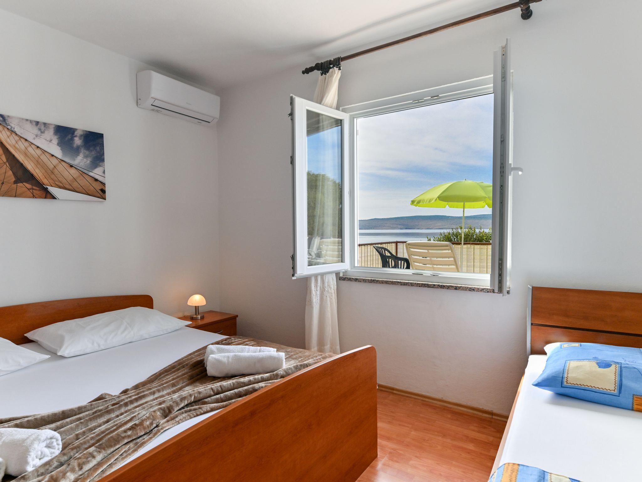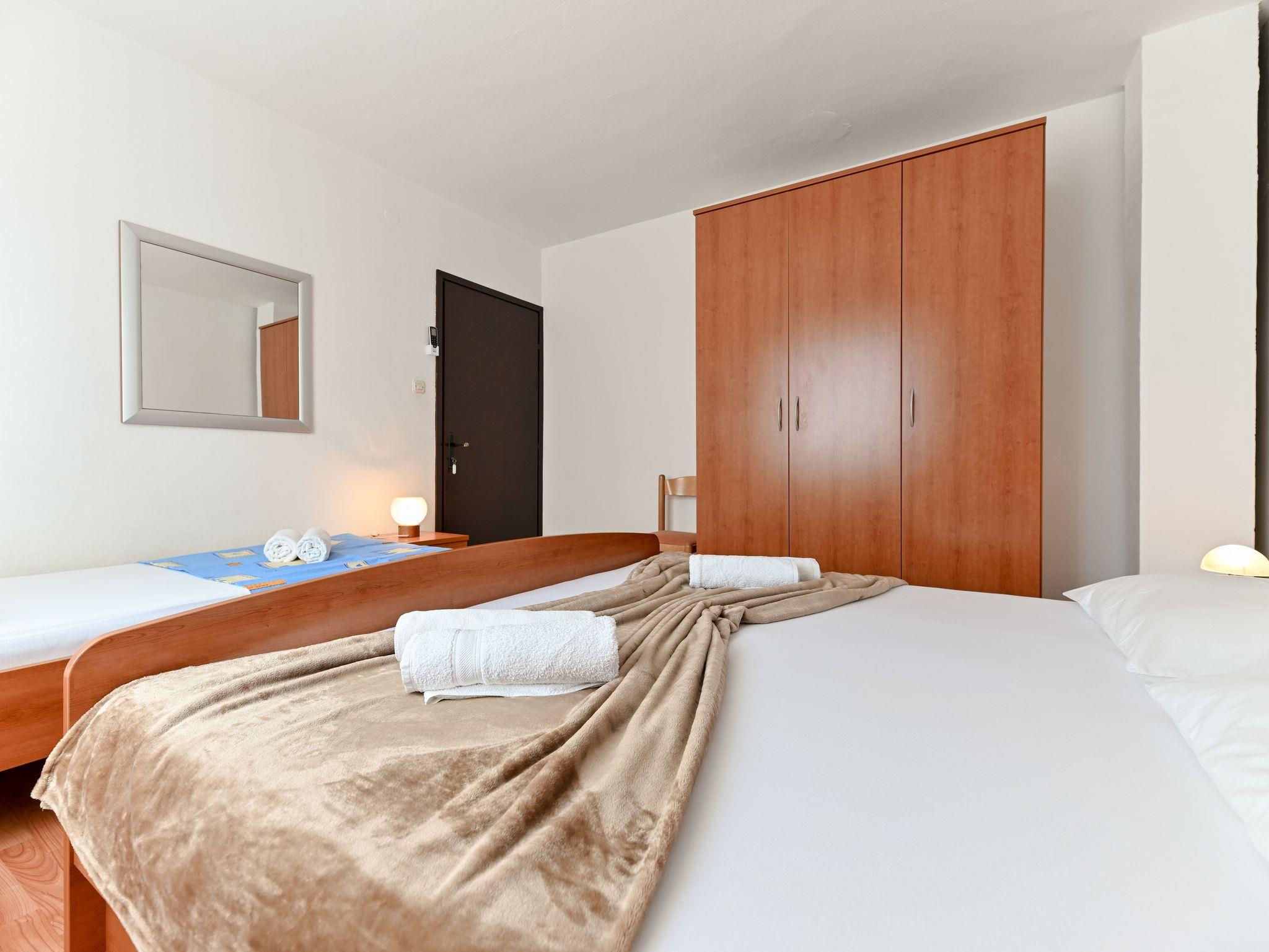 Ferienwohnung bietet Platz für 7 Gäste. Die Betten sind in Schlafzimmern, die es 2 gibt, und in Wohnzimmer, innerhalb einer Gesamtfläche von 69m2, angeordnet. Die Gäste haben eine eigene Terrasse zur Verfügung, auf der sie in warmen Sommernächten genießen können. Das Apartment bietet Meerblick. Für vollen Genuss und Entspannung gibt es einen privaten Grill für Gäste dieser Unterkunft. In der Unterkunftseinheit besteht die Möglichkeit des Mitbringens von Haustieren gegen Aufpreis. IM PREIS INBEGRIFFEN: Kurtaxe, Endreinigung, Klimatisierung, Parkplatz, Internet, Bügeleisen, Bügelbrett, Föhn, Sonnenschirm. VERBINDLICHE ZUSÄTZLICHE KOSTEN: Aufzahlung für Kurzaufenthalte (prozentualer Zuschlag pro Nächtigungsanzahl: 30% - 1, 20% - 2, 10% - 3). UNVERBINDLICHE ZUSÄTZLICHE KOSTEN: Haustiere (8,00 € pro Nacht). Die Verfügbarkeit zusätzlicher Dienstleistungen in Ihrem reservierten Termin und die Preise derselben (falls nicht aufgeführt) müssen im Voraus überprüft werden. Zusätzliche Dienstleistungen die in der Zahlungsaufforderung nicht aufgeführt sind werden direkt beim Vermieter bezahlt, angenommen der Gast nutzt auch diese.