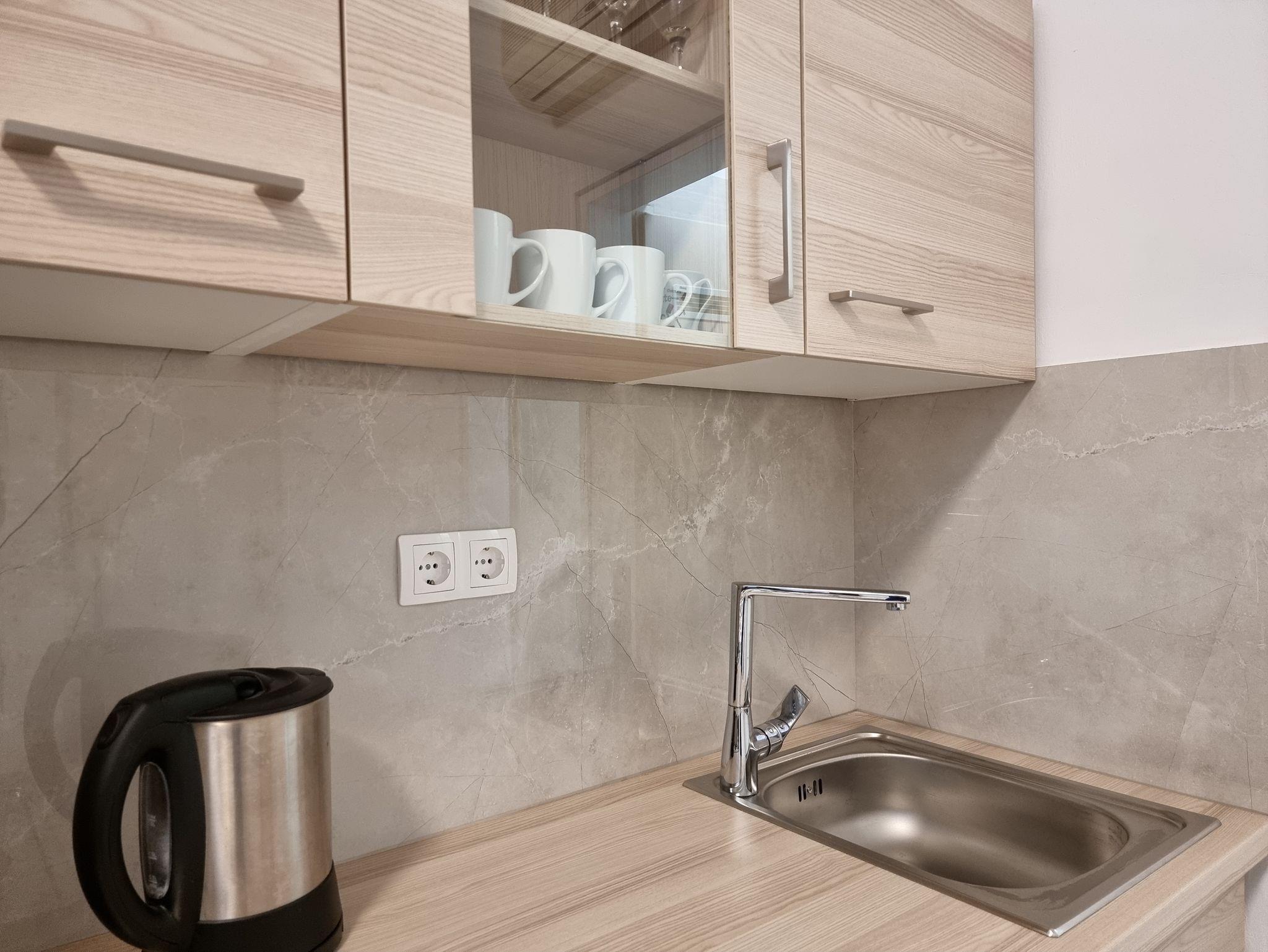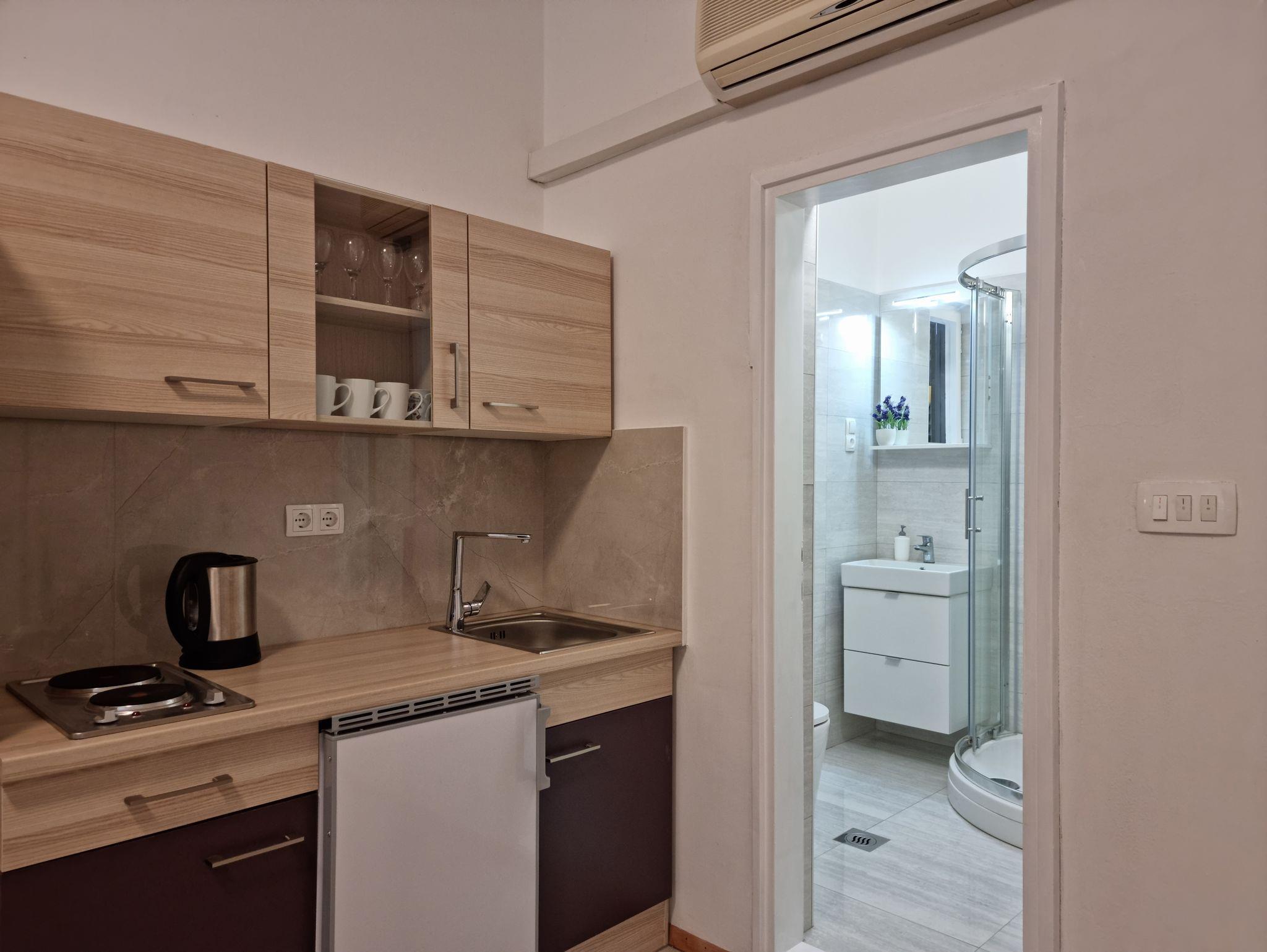 Studio bietet Platz für 2 Gäste. Die Betten sind in Schlafzimmern, die es 1 gibt, innerhalb einer Gesamtfläche von 18m2, angeordnet. Die Gäste haben eine eigene Terrasse zur Verfügung, auf der sie in warmen Sommernächten genießen können. Das Studio-Apartment bietet Meerblick. Es ist erlaubt, Speisen auf dem Gemeinschafts-Grill vorzubereiten. IM PREIS INBEGRIFFEN: Kurtaxe, Endreinigung, Klimatisierung, Parkplatz, Internet, Bügeleisen, Sonnenschirm. VERBINDLICHE ZUSÄTZLICHE KOSTEN: Aufzahlung für Kurzaufenthalte (prozentualer Zuschlag pro Nächtigungsanzahl: 30% - 1, 20% - 2, 10% - 3). UNVERBINDLICHE ZUSÄTZLICHE KOSTEN: Wäschewaschen (5,00 € Waschen), Zusatzbett (5,00 € pro Nacht). Die Verfügbarkeit zusätzlicher Dienstleistungen in Ihrem reservierten Termin und die Preise derselben (falls nicht aufgeführt) müssen im Voraus überprüft werden. Zusätzliche Dienstleistungen die in der Zahlungsaufforderung nicht aufgeführt sind werden direkt beim Vermieter bezahlt, angenommen der Gast nutzt auch diese. Ermäßigung auf den Grundpreis: Gratistag 21=19 (bei einem Aufenthalt von 21 Tagen oder mehr erhalten Sie 2 Gratistage für den Aufenthalt bis 31.12.26).