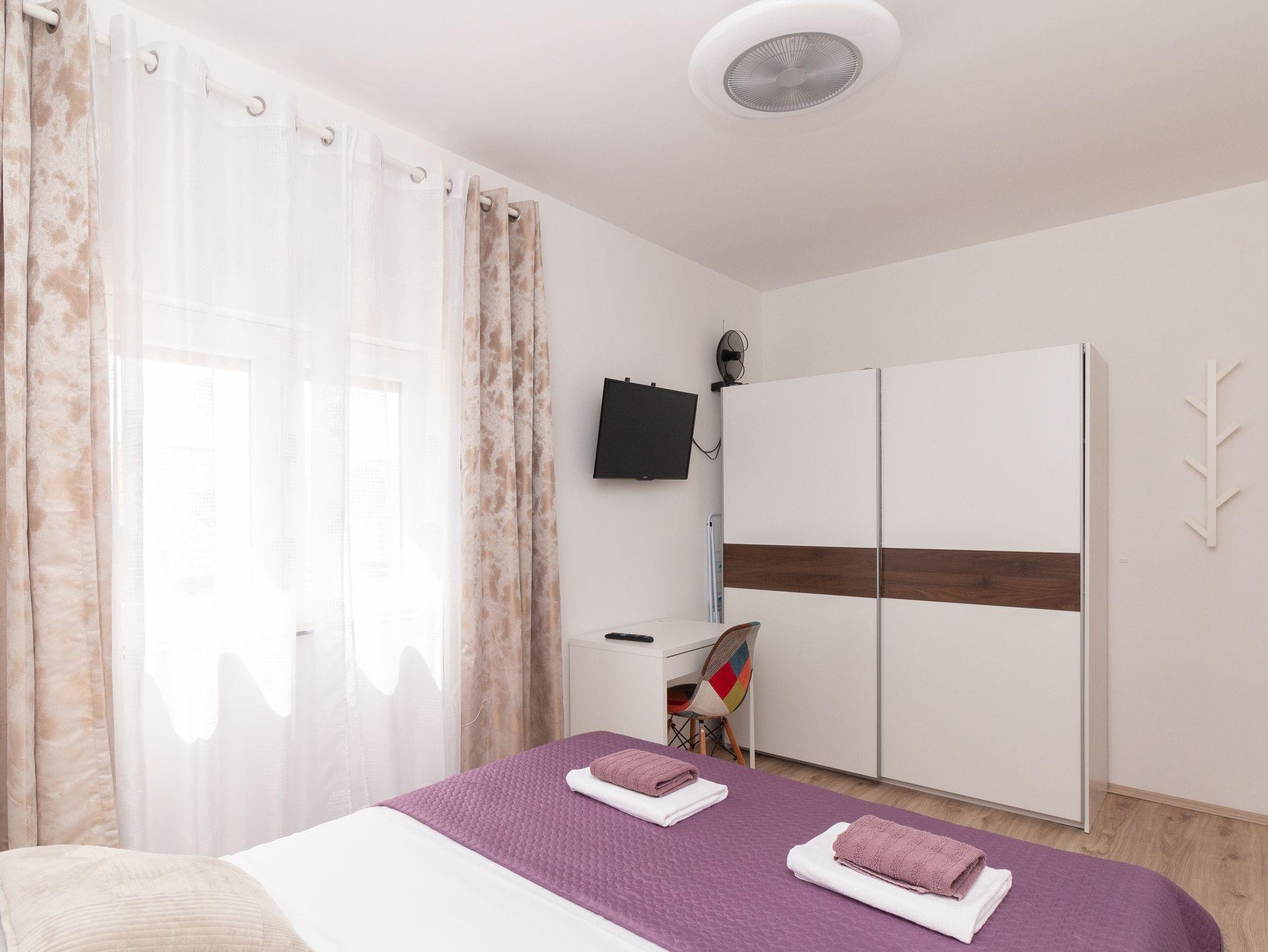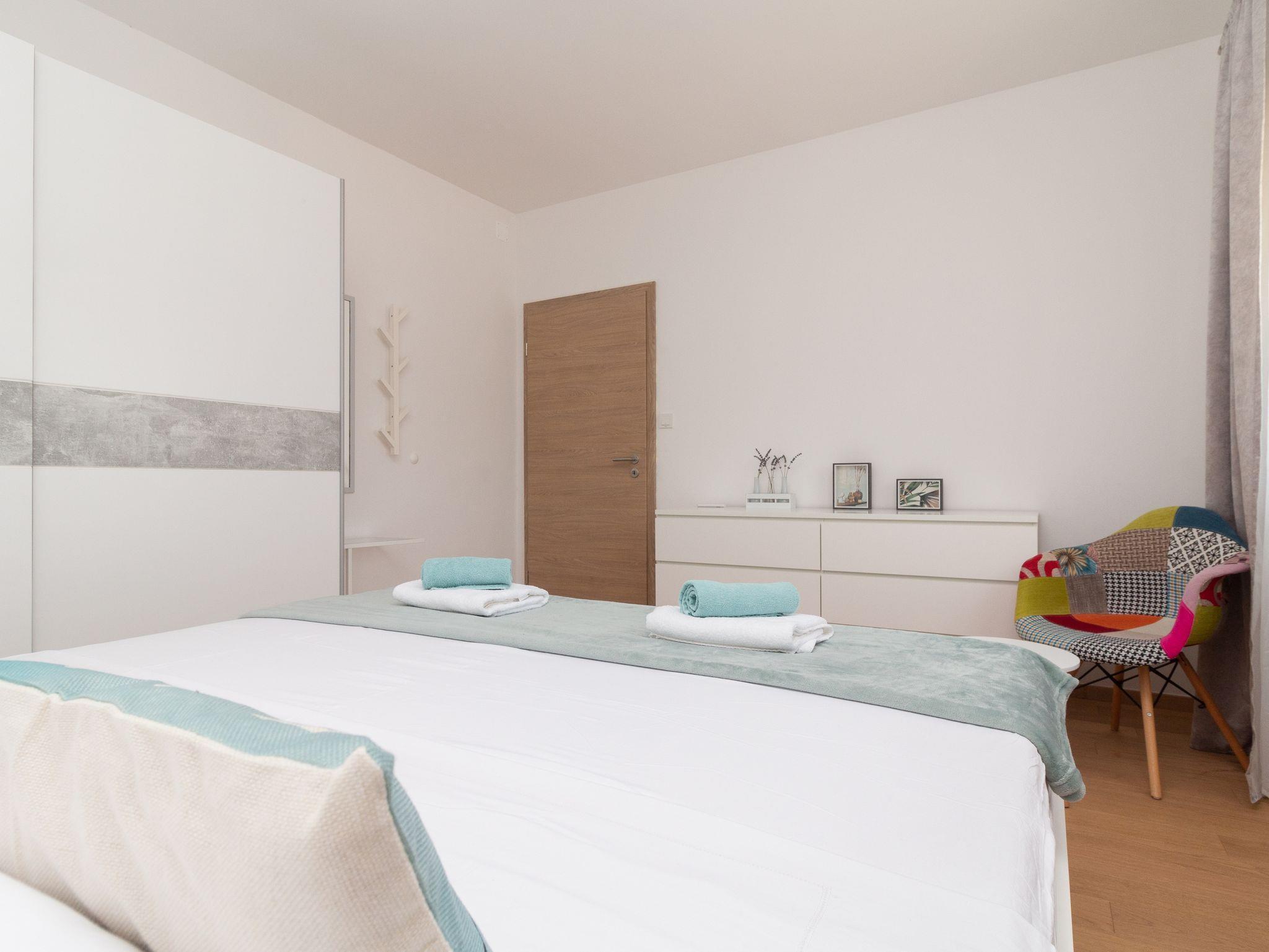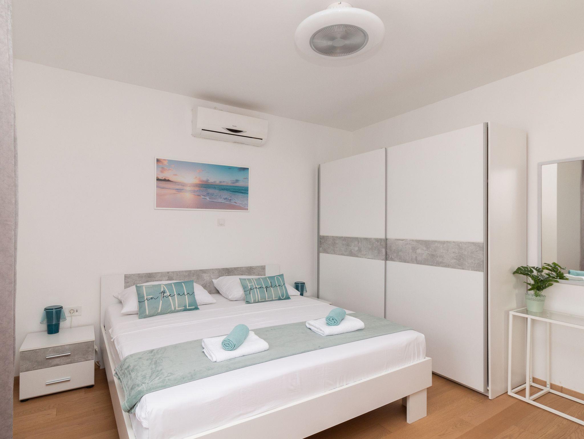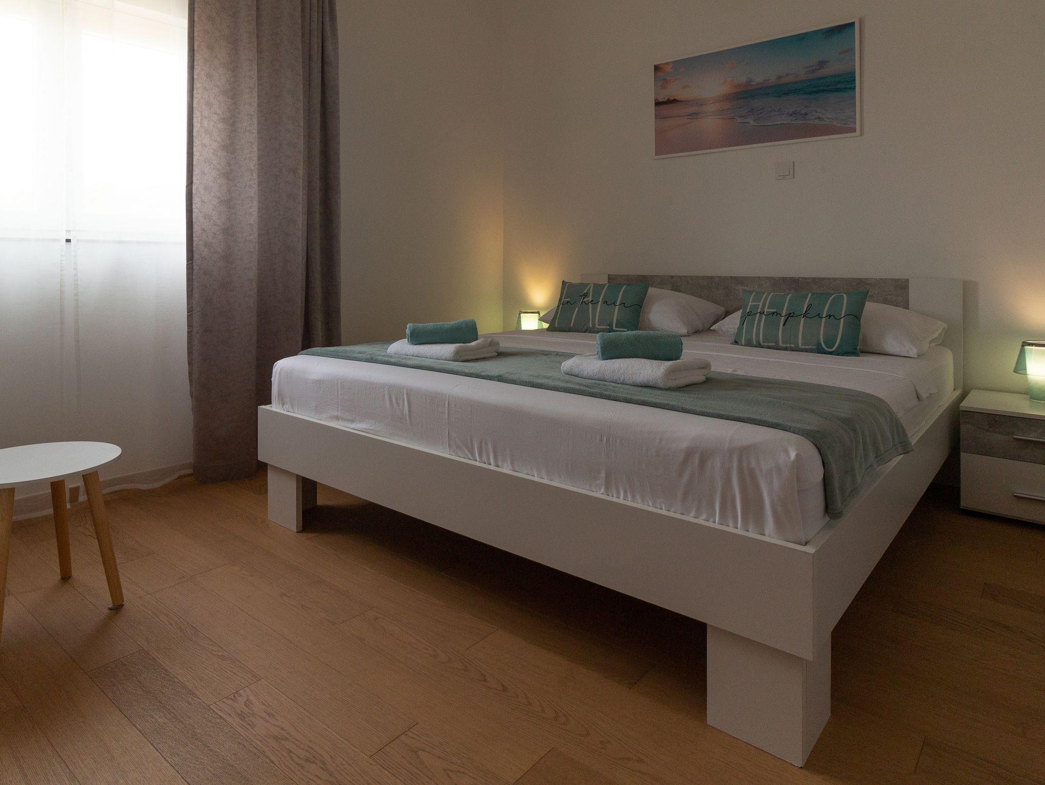 Ferienwohnung bietet Platz für 4 Gäste. Die Betten sind in Schlafzimmern, die es 2 gibt, innerhalb einer Gesamtfläche von 66m2, angeordnet. Die Gäste haben eine eigene Terrasse zur Verfügung, auf der sie in warmen Sommernächten genießen können. Das Apartment bietet Meerblick. Für vollen Genuss und Entspannung gibt es einen privaten Grill für Gäste dieser Unterkunft. IM PREIS INBEGRIFFEN: Kurtaxe, Endreinigung, Klimatisierung, Parkplatz, Internet, Kinderbett, Bügeleisen, Bügelbrett, Föhn. Die Verfügbarkeit zusätzlicher Dienstleistungen in Ihrem reservierten Termin und die Preise derselben (falls nicht aufgeführt) müssen im Voraus überprüft werden. Zusätzliche Dienstleistungen die in der Zahlungsaufforderung nicht aufgeführt sind werden direkt beim Vermieter bezahlt, angenommen der Gast nutzt auch diese. Ermäßigung auf den Grundpreis: Gratistag 14=13 (bei einem Aufenthalt von 14 Tagen oder mehr erhalten Sie einen Gratistag für den Aufenthalt bis 31.12.26).
