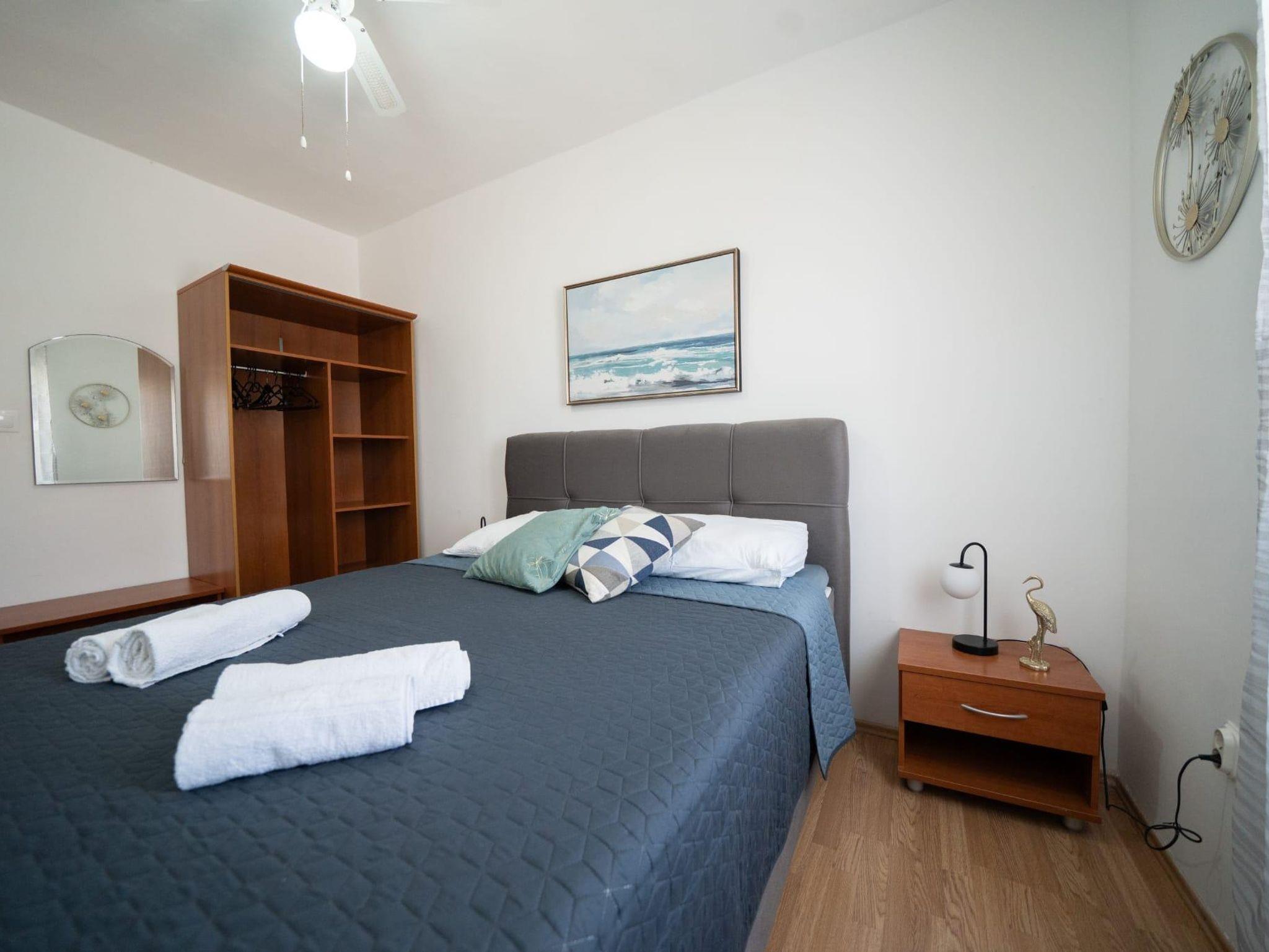 Ferienwohnung bietet Platz für 8 Gäste. Die Betten sind in Schlafzimmern, die es 4 gibt, innerhalb einer Gesamtfläche von 103m2, angeordnet. Die Gäste haben eine eigene Terrasse zur Verfügung, auf der sie in warmen Sommernächten genießen können. Es ist erlaubt, Speisen auf dem Gemeinschafts-Grill vorzubereiten. IM PREIS INBEGRIFFEN: Kurtaxe, Endreinigung, Klimatisierung, Parkplatz, Internet, Bügeleisen, Bügelbrett, Föhn, tragbarer Grill, Sonnenschirm, 2 Kinderbettchen (im Preis enthalten). VERBINDLICHE ZUSÄTZLICHE KOSTEN: Aufzahlung für Kurzaufenthalte (prozentualer Zuschlag pro Nächtigungsanzahl: 30% - 1, 20% - 2, 10% - 3). Die Verfügbarkeit zusätzlicher Dienstleistungen in Ihrem reservierten Termin und die Preise derselben (falls nicht aufgeführt) müssen im Voraus überprüft werden. Zusätzliche Dienstleistungen die in der Zahlungsaufforderung nicht aufgeführt sind werden direkt beim Vermieter bezahlt, angenommen der Gast nutzt auch diese.
