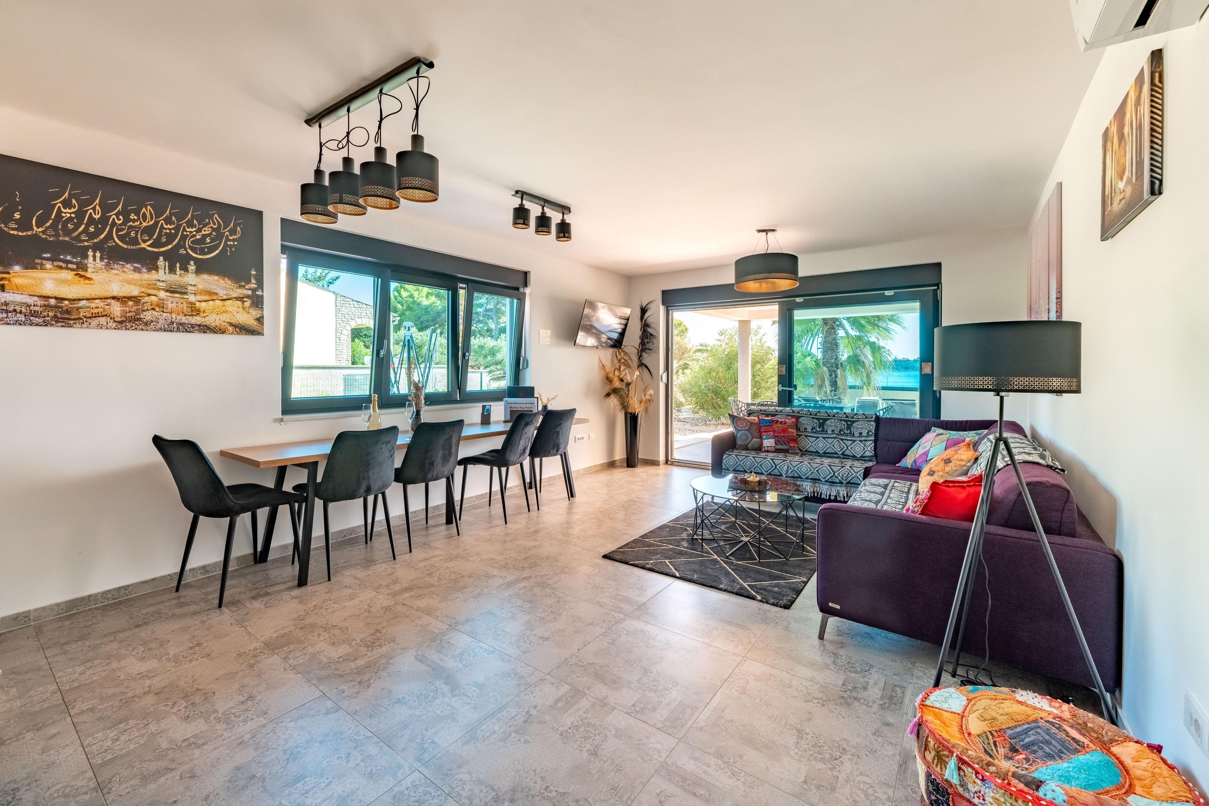 Designer Apartment mit Designerausstattung von Natuzzi, mit eigenem Garten direkt am Meer mit feinkörnigem Strand, welcher flach abfallend ist.