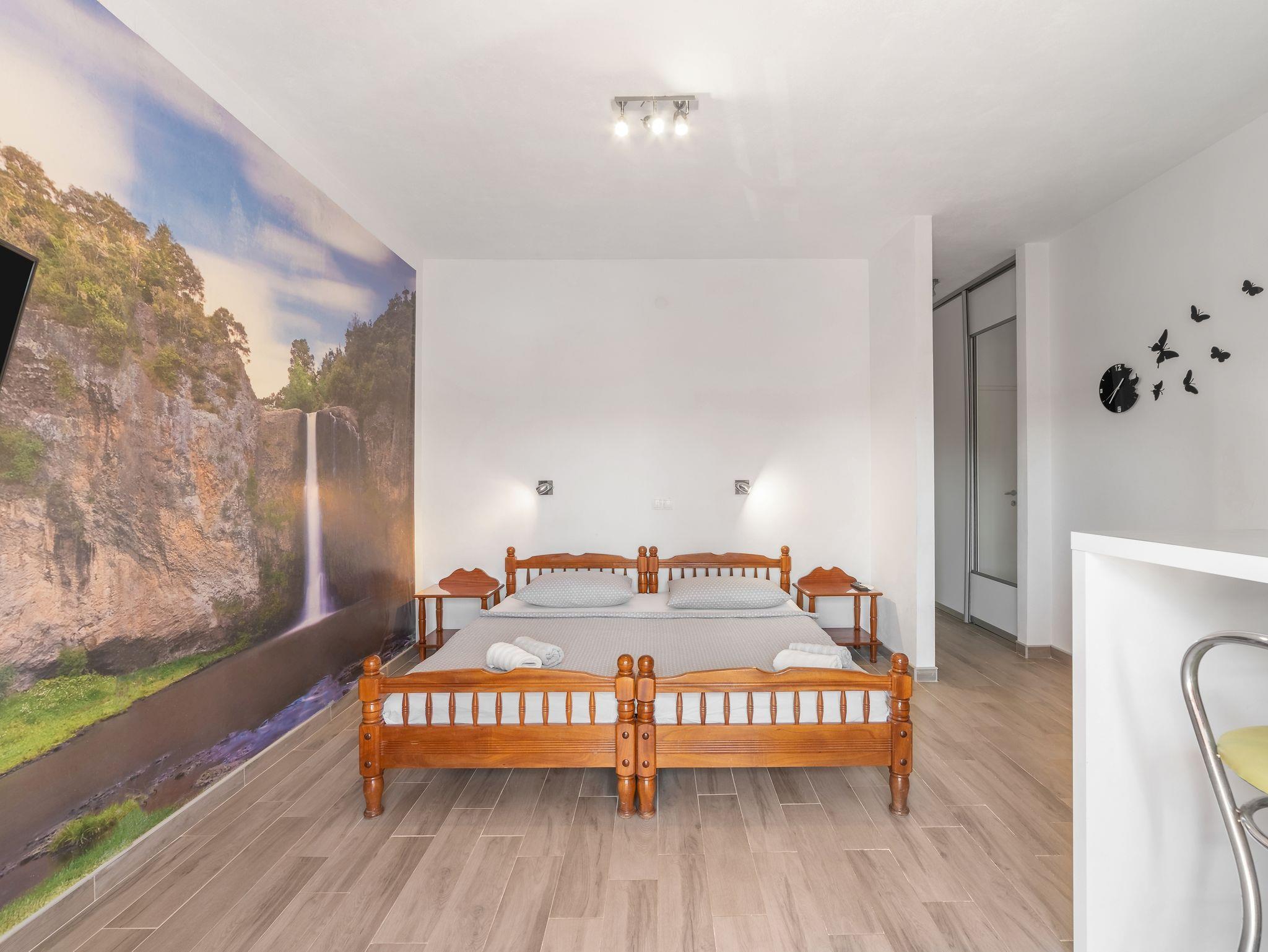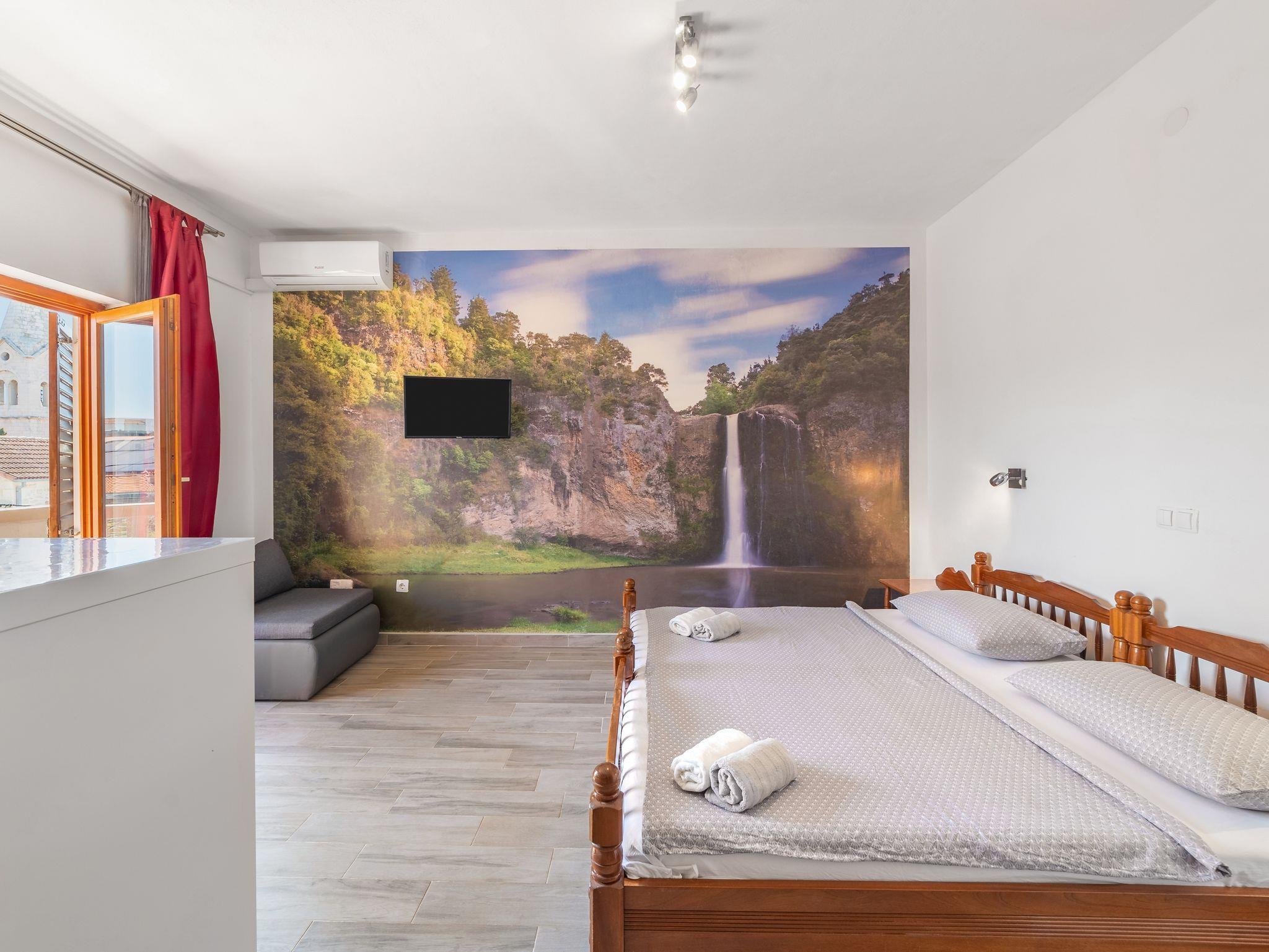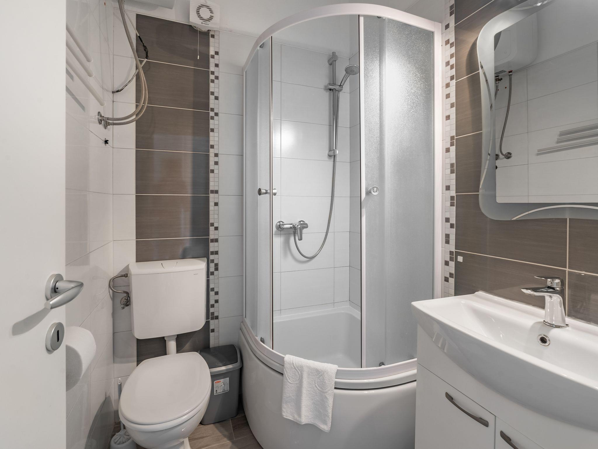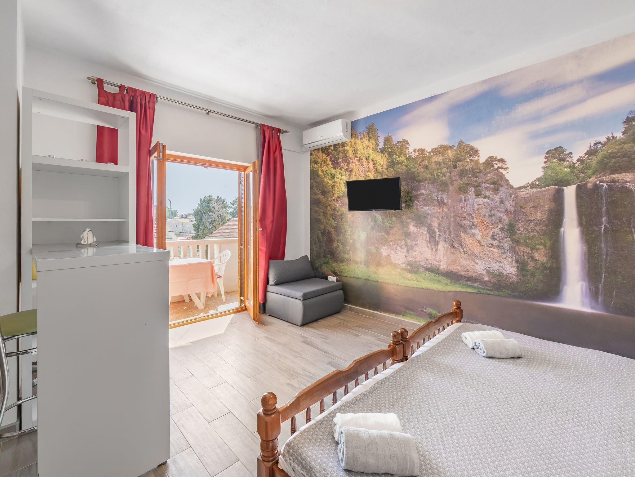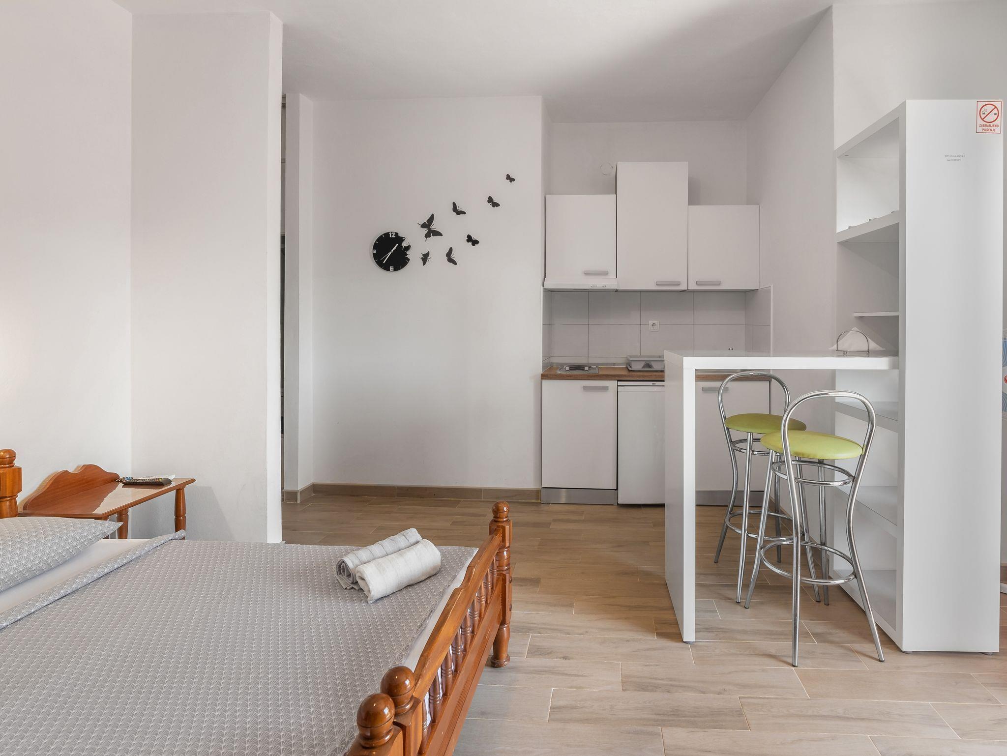 Studio bietet Platz für 3 Gäste. Die Betten sind in Schlafzimmern, die es 1 gibt, innerhalb einer Gesamtfläche von 23m2, angeordnet. Die Gäste haben einen eigenen Balkon zur Verfügung, auf der sie in warmen Sommernächten genießen können. Das Studio-Apartment bietet Meerblick. In der Unterkunftseinheit besteht die Möglichkeit des Mitbringens von Haustieren gegen Aufpreis. IM PREIS INBEGRIFFEN: Kurtaxe, Endreinigung, Klimatisierung, Parkplatz, Internet, Kinderbett, Bügeleisen, Bügelbrett, Föhn. VERBINDLICHE ZUSÄTZLICHE KOSTEN: Aufzahlung für Kurzaufenthalte (prozentualer Zuschlag pro Nächtigungsanzahl: 30% - 1, 20% - 2, 10% - 3). UNVERBINDLICHE ZUSÄTZLICHE KOSTEN: Haustiere (5,00 € pro Nacht). Die Verfügbarkeit zusätzlicher Dienstleistungen in Ihrem reservierten Termin und die Preise derselben (falls nicht aufgeführt) müssen im Voraus überprüft werden. Zusätzliche Dienstleistungen die in der Zahlungsaufforderung nicht aufgeführt sind werden direkt beim Vermieter bezahlt, angenommen der Gast nutzt auch diese. Ermäßigung auf den Grundpreis: Gratistag 14=13 (bei einem Aufenthalt von 14 Tagen oder mehr erhalten Sie einen Gratistag für den Aufenthalt bis 31.12.26).
