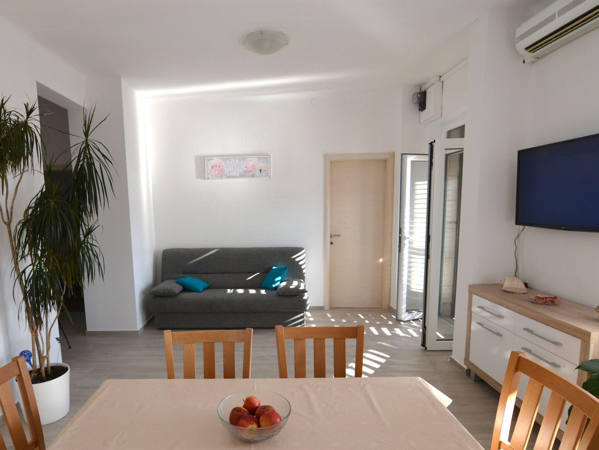 Ferienwohnung bietet Platz für 6 Gäste. Die Betten sind in Schlafzimmern, die es 3 gibt, innerhalb einer Gesamtfläche von 73m2, angeordnet. Die Gäste haben eine eigene Terrasse zur Verfügung, auf der sie in warmen Sommernächten genießen können. Das Apartment bietet Meerblick. Es ist erlaubt, Speisen auf dem Gemeinschafts-Grill vorzubereiten. IM PREIS INBEGRIFFEN: Kurtaxe, Endreinigung, Klimatisierung, Parkplatz, Internet, Kinderbett, Zusatzbett, Bügeleisen, Bügelbrett, Föhn. VERBINDLICHE ZUSÄTZLICHE KOSTEN: Aufzahlung für Kurzaufenthalte (prozentualer Zuschlag pro Nächtigungsanzahl: 30% - 1, 20% - 2, 10% - 3). Die Verfügbarkeit zusätzlicher Dienstleistungen in Ihrem reservierten Termin und die Preise derselben (falls nicht aufgeführt) müssen im Voraus überprüft werden. Zusätzliche Dienstleistungen die in der Zahlungsaufforderung nicht aufgeführt sind werden direkt beim Vermieter bezahlt, angenommen der Gast nutzt auch diese.