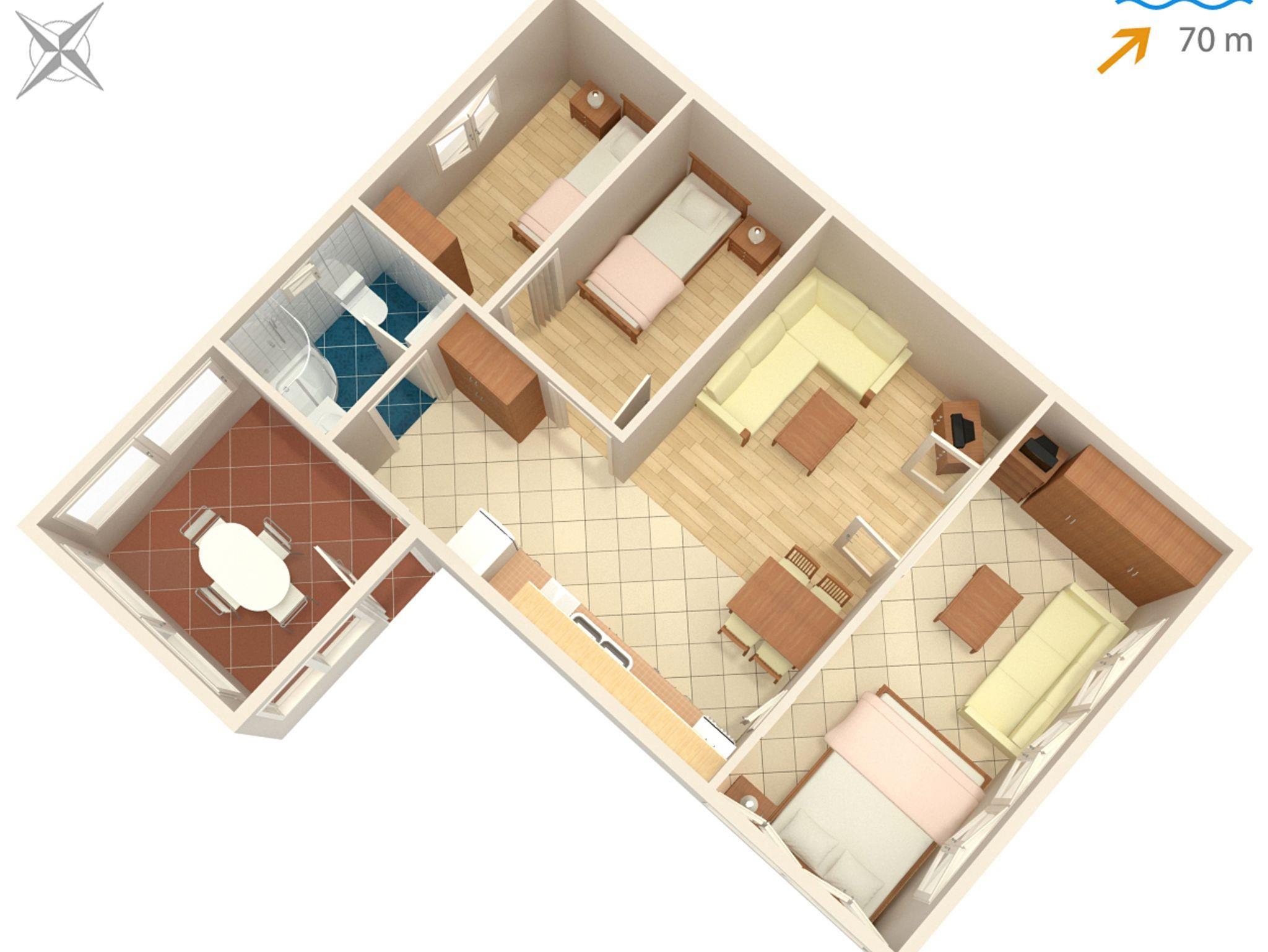 Ferienwohnung bietet Platz für 6 Gäste. Die Betten sind in Schlafzimmern, die es 3 gibt, und in Wohnzimmer, innerhalb einer Gesamtfläche von 48m2, angeordnet. Die Gäste haben eine eigene Terrasse zur Verfügung, auf der sie in warmen Sommernächten genießen können. Für vollen Genuss und Entspannung gibt es einen privaten Grill für Gäste dieser Unterkunft. In der Unterkunftseinheit besteht die Möglichkeit des Mitbringens von Haustieren gegen Aufpreis. Durch das Schlafzimmer der gebuchten Unterkunftseinheit geht man in die andere Räume der Einheit. IM PREIS INBEGRIFFEN: Kurtaxe, Endreinigung, Klimatisierung, Parkplatz, Internet, Bügeleisen, Bügelbrett, Föhn. UNVERBINDLICHE ZUSÄTZLICHE KOSTEN: Haustiere (8,00 € pro Nacht). Die Verfügbarkeit zusätzlicher Dienstleistungen in Ihrem reservierten Termin und die Preise derselben (falls nicht aufgeführt) müssen im Voraus überprüft werden. Zusätzliche Dienstleistungen die in der Zahlungsaufforderung nicht aufgeführt sind werden direkt beim Vermieter bezahlt, angenommen der Gast nutzt auch diese.