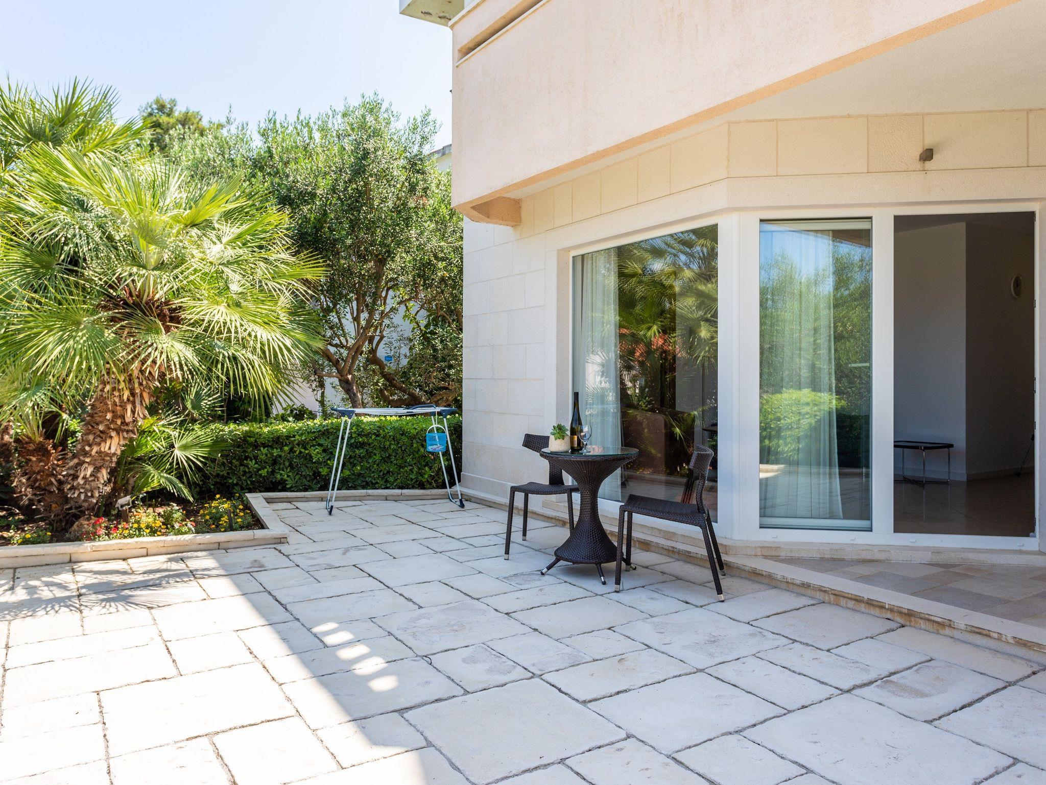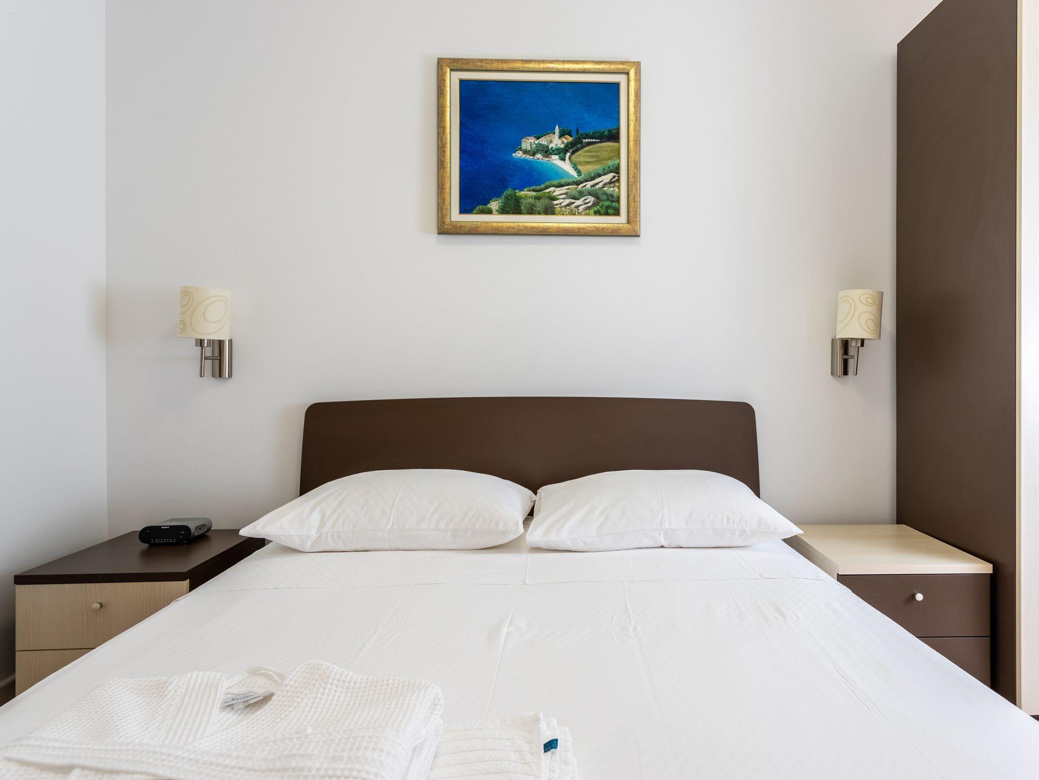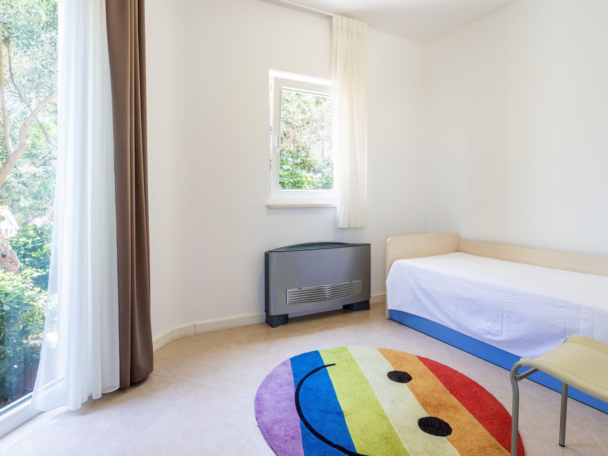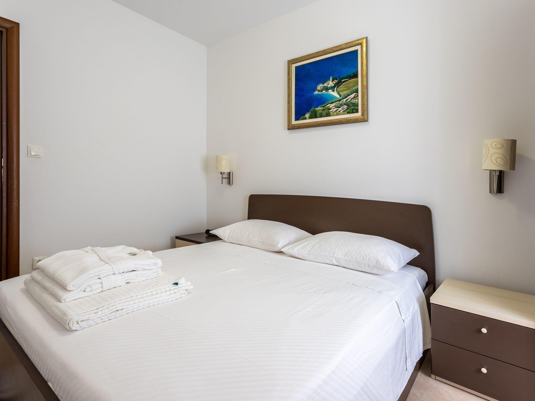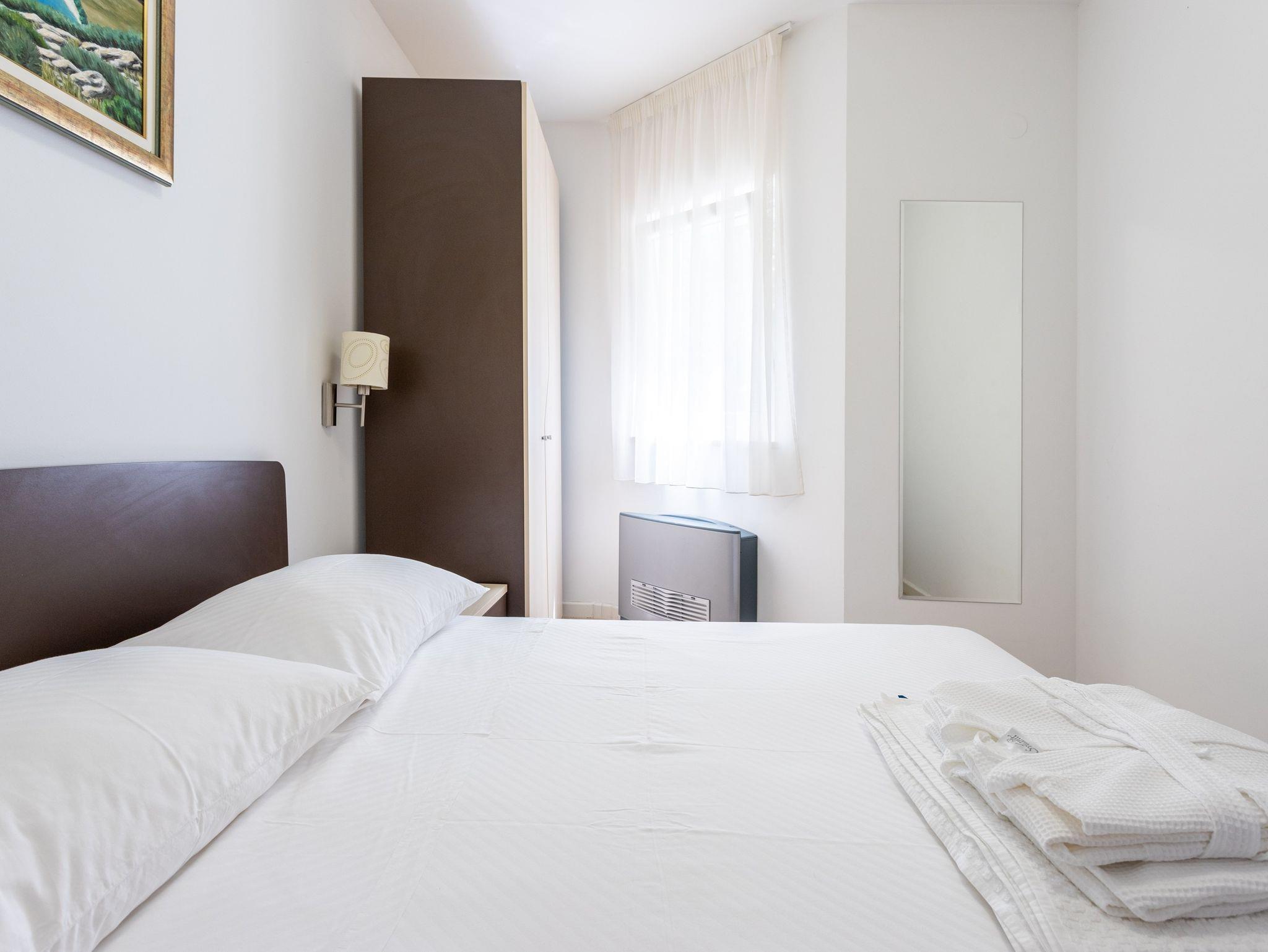 Ferienwohnung bietet Platz für 2 Gäste. Die Betten sind in Schlafzimmern, die es 2 gibt, innerhalb einer Gesamtfläche von 51m2, angeordnet. Die Gäste haben eine eigene Terrasse zur Verfügung, auf der sie in warmen Sommernächten genießen können. Das Apartment bietet Meerblick. Es ist erlaubt, Speisen auf dem Gemeinschafts-Grill vorzubereiten. Während ihres Aufenthalts können Gäste das gemeinsam zur Nutzung stehende Schwimmbad benutzen. IM PREIS INBEGRIFFEN: Kurtaxe, Endreinigung, Klimatisierung, Zentralheizung, Pool, Parkplatz, Internet, Kinderbett, Bügeleisen, Bügelbrett, Föhn, 2 Kinderbettchen (im Preis enthalten). VERBINDLICHE ZUSÄTZLICHE KOSTEN: Aufzahlung für Kurzaufenthalte (prozentualer Zuschlag pro Nächtigungsanzahl: 30% - 1, 20% - 2, 10% - 3). Die Verfügbarkeit zusätzlicher Dienstleistungen in Ihrem reservierten Termin und die Preise derselben (falls nicht aufgeführt) müssen im Voraus überprüft werden. Zusätzliche Dienstleistungen die in der Zahlungsaufforderung nicht aufgeführt sind werden direkt beim Vermieter bezahlt, angenommen der Gast nutzt auch diese.