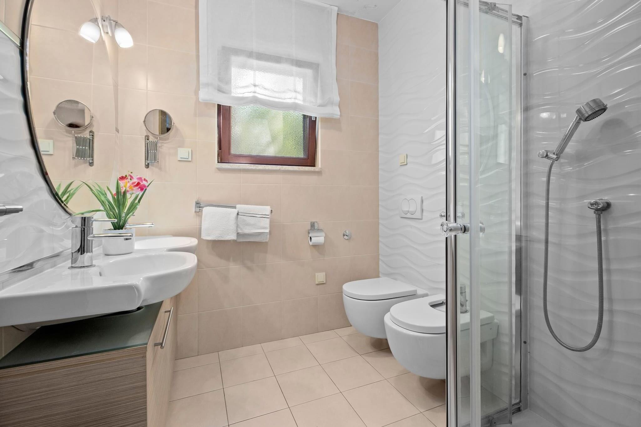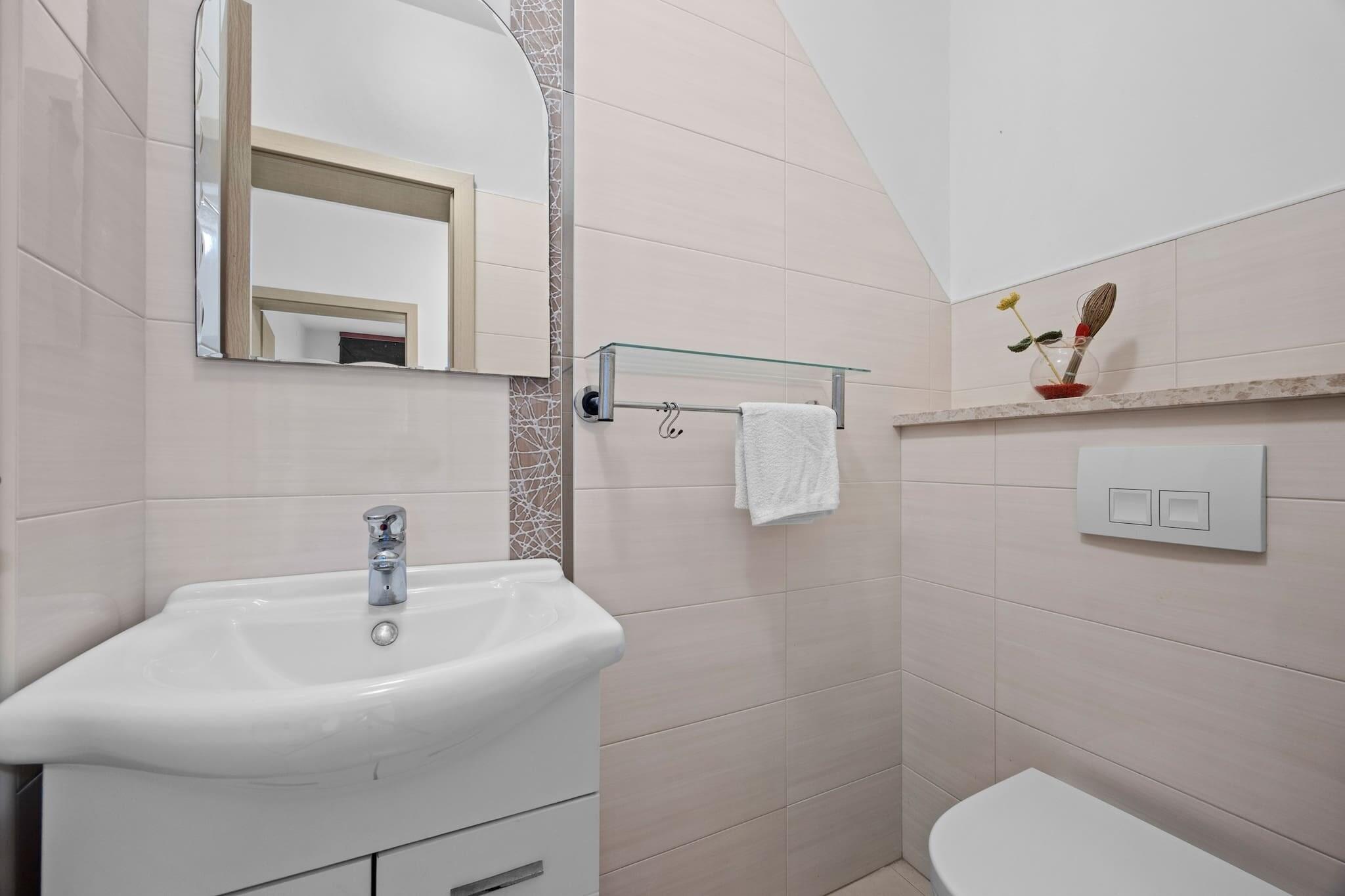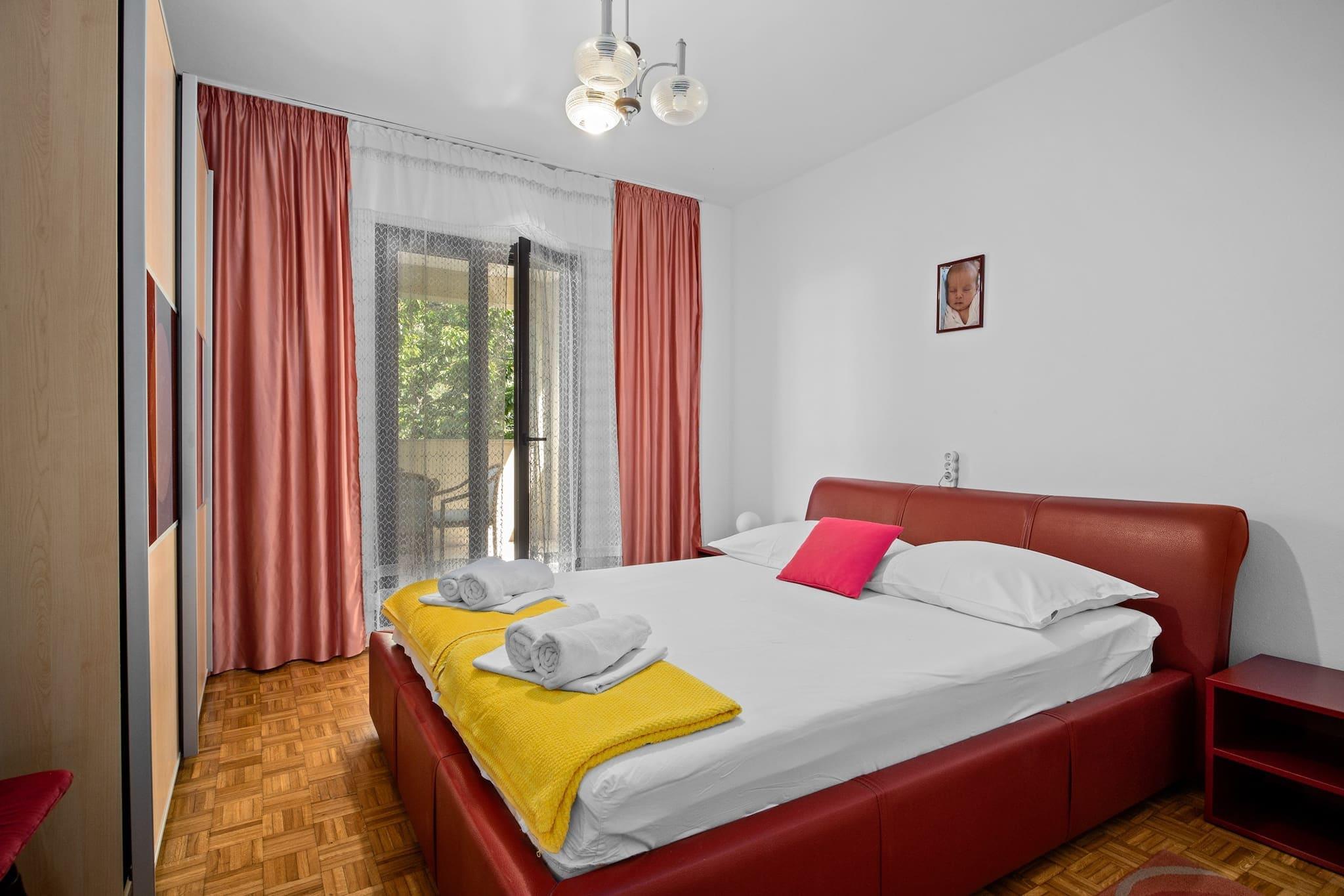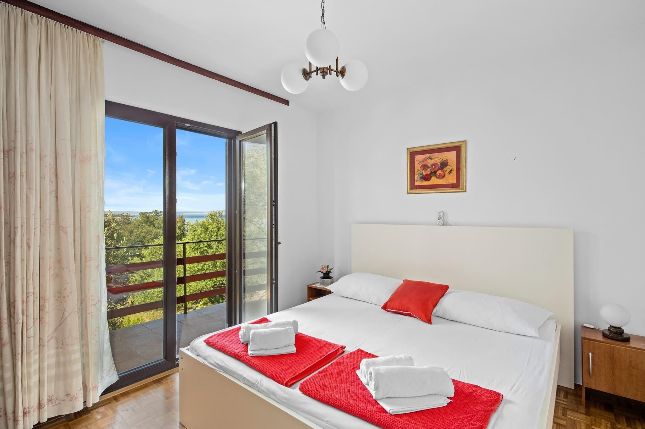 Denne store 3-værelses lejlighed, beliggende på første sal, er det perfekte valg til en familieferie. Det kan komfortabelt rumme op til seks personer, med tre soveværelser med dobbeltsenge, et fuldt udstyret køkken, en rummelig stue, et badeværelse og et separat toilet. Lejligheden har både egen balkon og overdækket terrasse, hvor du kan nyde en fantastisk havudsigt. Gæsterne har også adgang til en udendørs bruser og en fælles grill i haven. Der er gratis privat parkering på stedet, og selvom der ikke er nogen vaskemaskine, kan der arrangeres tøjvask med ejerne efter anmodning. Beliggende i Supetarska Draga, er denne lejlighed omgivet af ubeboede øer med naturlige strande, ideel for dem, der ønsker at slappe af i fredelige omgivelser. Området er kendt for nautisk turisme, og den nærmeste sandstrand ligger kun 400 meter væk. Øen kan også prale af historiske vartegn såsom benediktinerklosteret og ruinerne af den gamle græske militærfæstning på bakken St. Damian. Den gamle bydel Rab er også inden for rækkevidde, hvor besøgende kan udforske smalle gader og traditionel arkitektur. Yderligere faciliteter omfatter aircondition, gratis internetadgang og satellit-tv. Lejlighedens køkken er fuldt udstyret med alle nødvendige apparater, herunder køleskab, mikroovn og ovn, hvilket giver alle hjemmets bekvemmeligheder. Gæster bedes respektere stille tider fra kl. 23.00 til 07.00, og rygning er kun tilladt udenfor.
