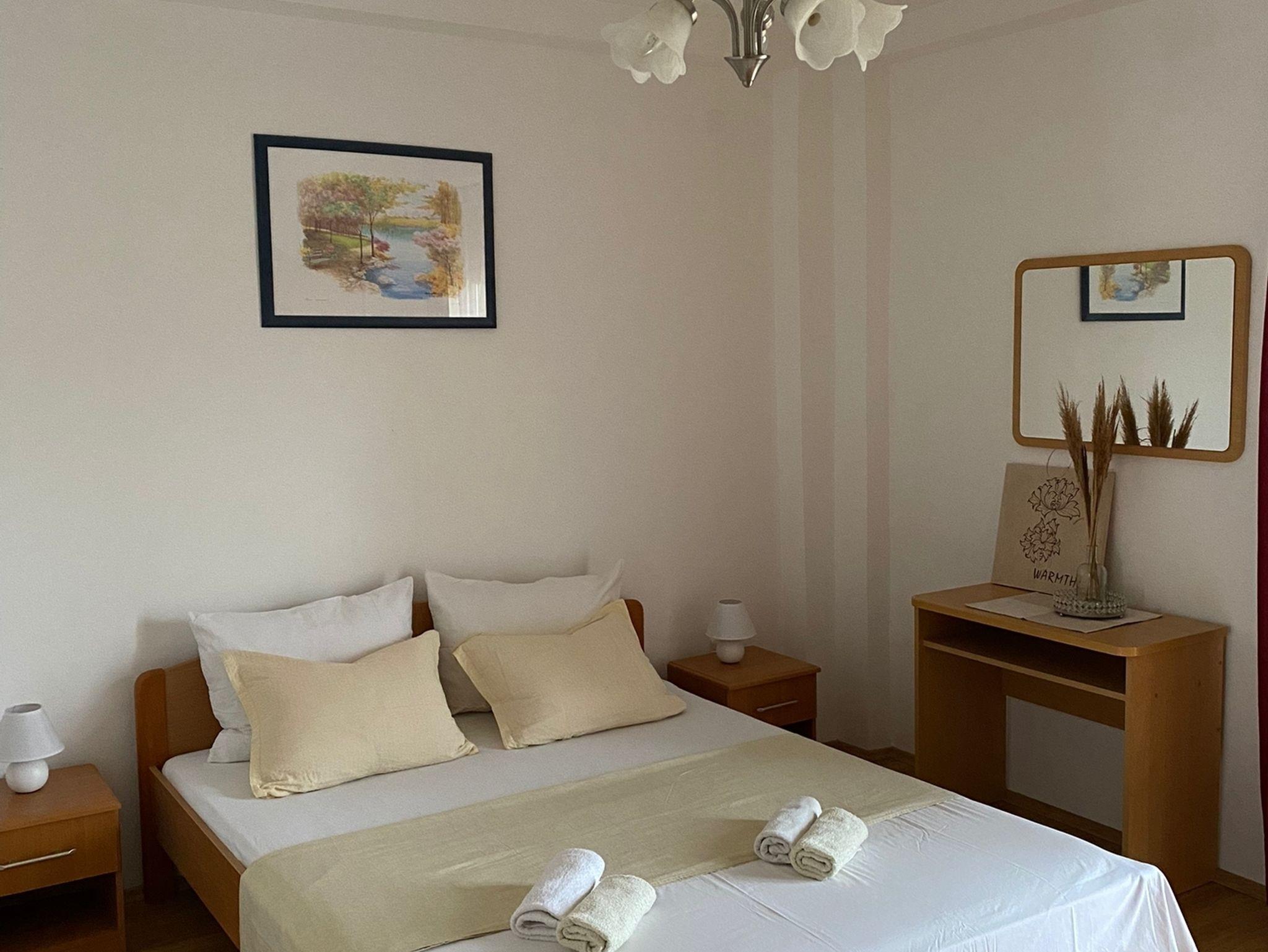 Ferienwohnung bietet Platz für 5 Gäste. Die Betten sind in Schlafzimmern, die es 2 gibt, und in Esszimmer, innerhalb einer Gesamtfläche von 63m2, angeordnet. Die Gäste haben eine eigene Terrasse zur Verfügung, auf der sie in warmen Sommernächten genießen können. Das Apartment bietet Meerblick. Es ist erlaubt, Speisen auf dem Gemeinschafts-Grill vorzubereiten. In der Unterkunftseinheit besteht die Möglichkeit des Mitbringens von Haustieren, und die Dienstleistung ist im Preis der Unterkunft enthalten. IM PREIS INBEGRIFFEN: Kurtaxe, Endreinigung, Klimatisierung, Parkplatz, Garage, Internet, Haustiere, Bügeleisen, Bügelbrett, Föhn. VERBINDLICHE ZUSÄTZLICHE KOSTEN: Aufzahlung für Kurzaufenthalte (prozentualer Zuschlag pro Nächtigungsanzahl: 30% - 1, 20% - 2, 10% - 3). Die Verfügbarkeit zusätzlicher Dienstleistungen in Ihrem reservierten Termin und die Preise derselben (falls nicht aufgeführt) müssen im Voraus überprüft werden. Zusätzliche Dienstleistungen die in der Zahlungsaufforderung nicht aufgeführt sind werden direkt beim Vermieter bezahlt, angenommen der Gast nutzt auch diese.