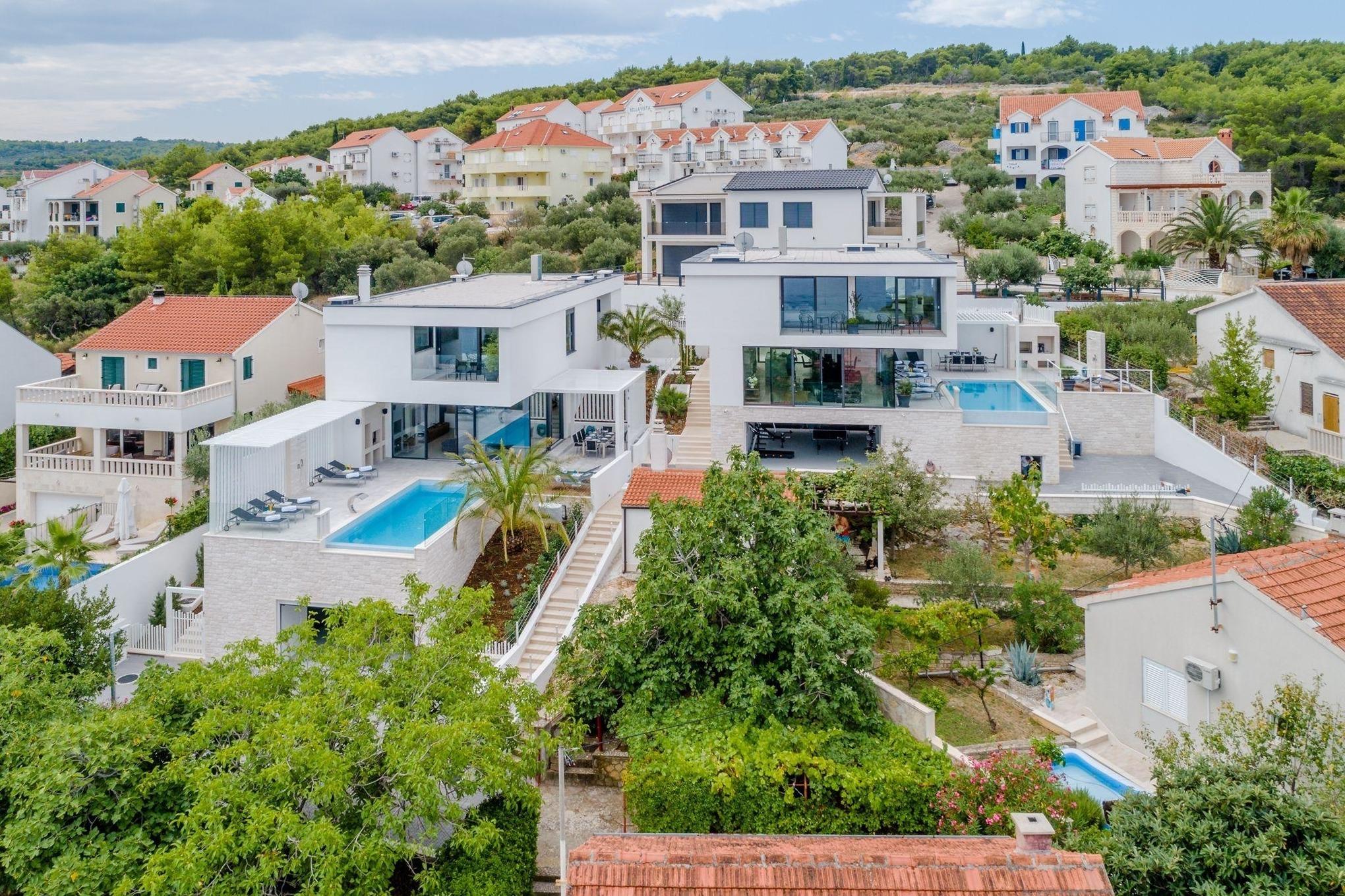 Das Anwesen mit direktem Blick auf die Adriaküste wurde 2018 nach den neusten Standards errichtet und vereinigt modernste Architektur mit mondänem Luxus.