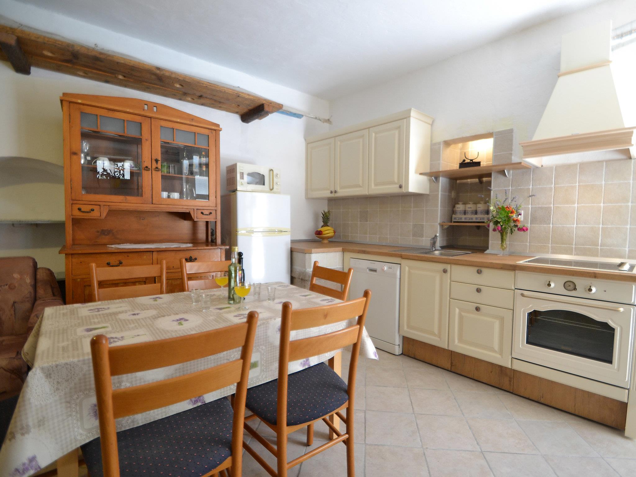 3-room terraced house 100 m2 on 4 levels, south facing position. Living room with satellite TV and DVD. Dining room. Open kitchen (4 hot plates, oven, dishwasher, electric coffee machine). Sep. WC. Upper floor: 1 room with 1 french bed (160 cm, length 190 cm). Shower/WC. 2nd upper floor: 1 room with 1 bed (90 cm, length 200 cm), 1 french bed (160 cm, length 200 cm), air conditioning. Shower/WC. No heating option. Top floor: dining room, with sloping ceilings, ceiling height 140 - 210 cm with rooflight with kitchen corner. Exit to the terrace. Terrace 15 m2. Terrace furniture. Partial view of the sea and the resort. Facilities: safe. Internet (WiFi, free). Parking (fenced) at 500 m.