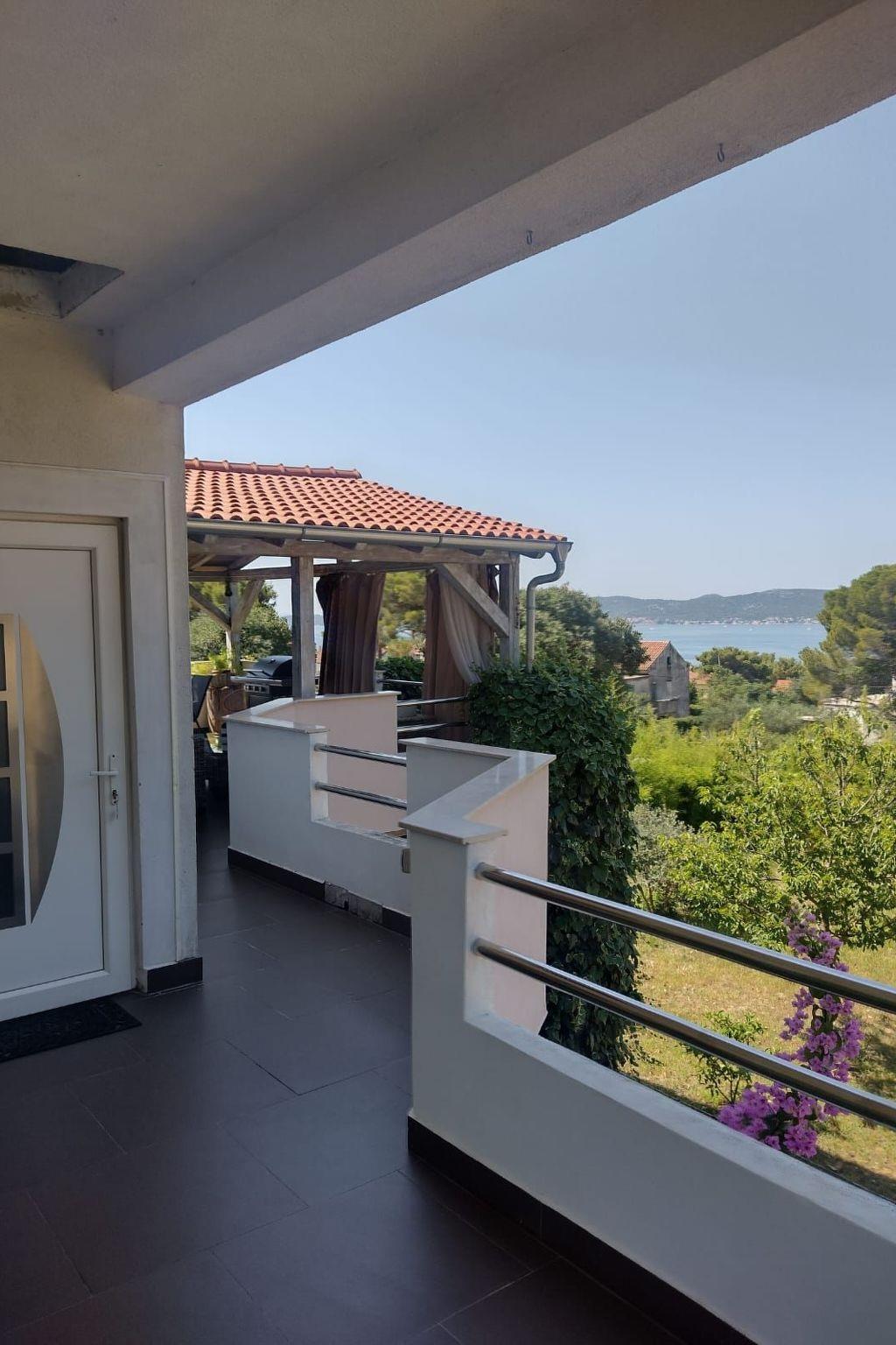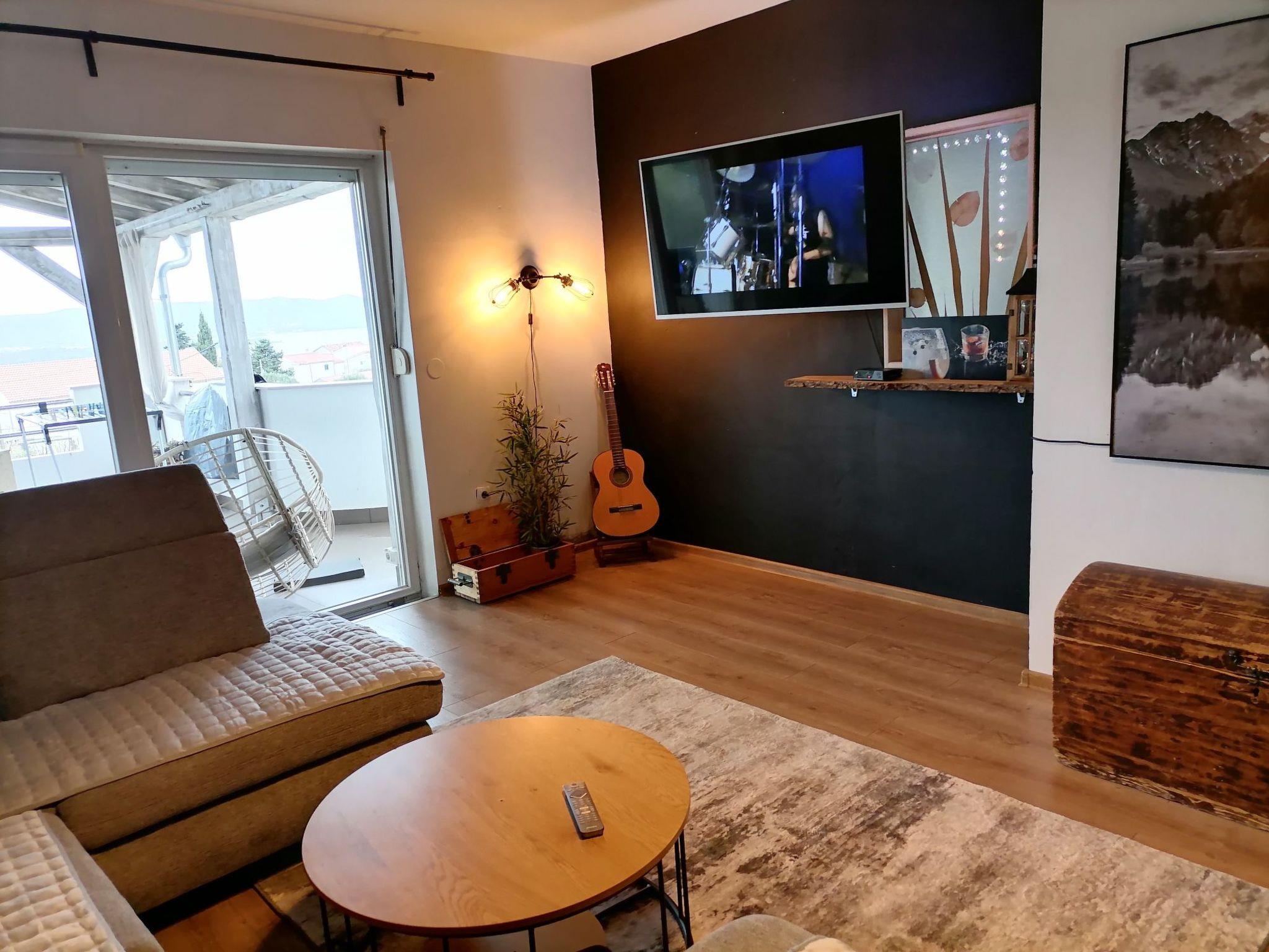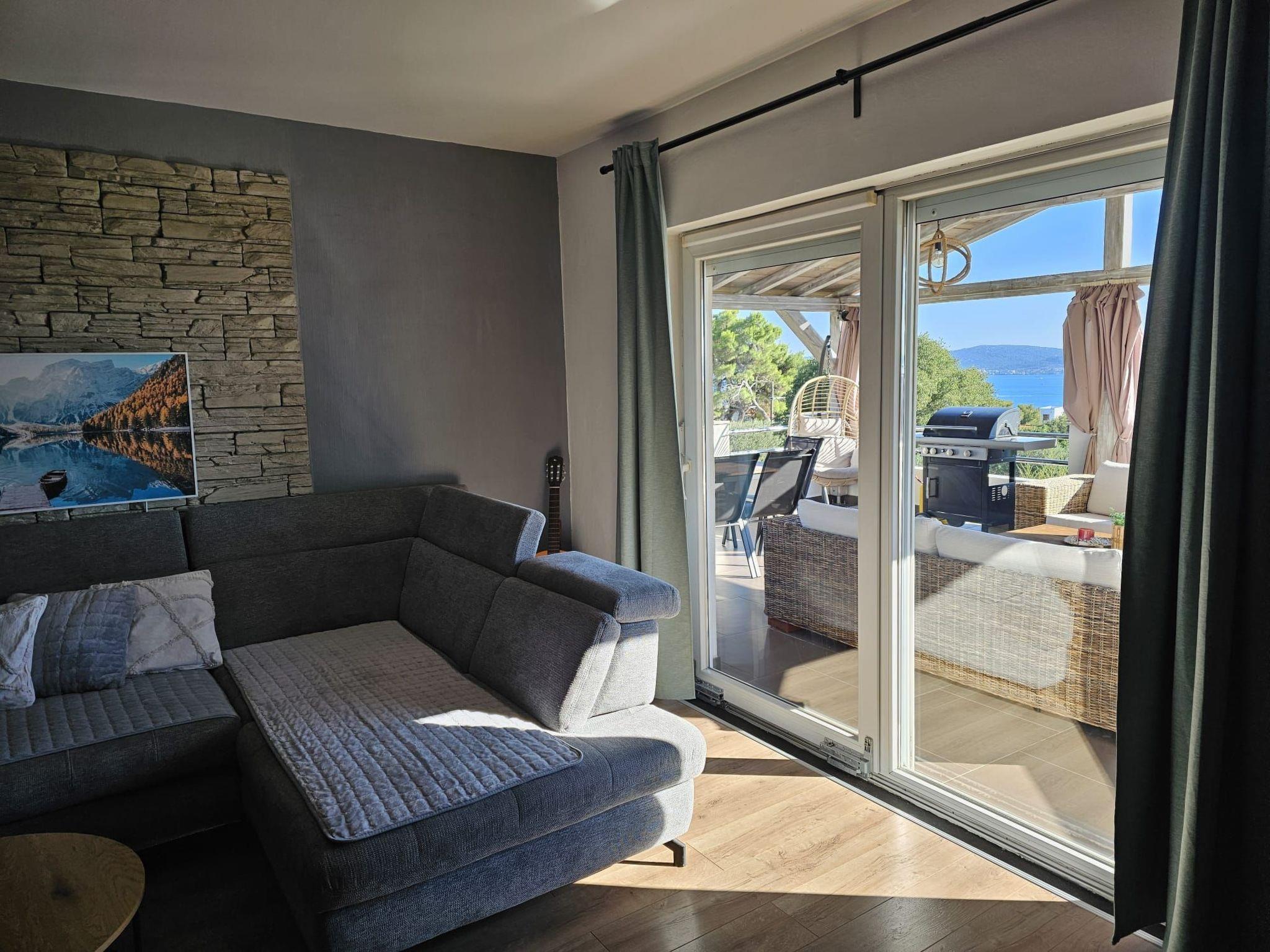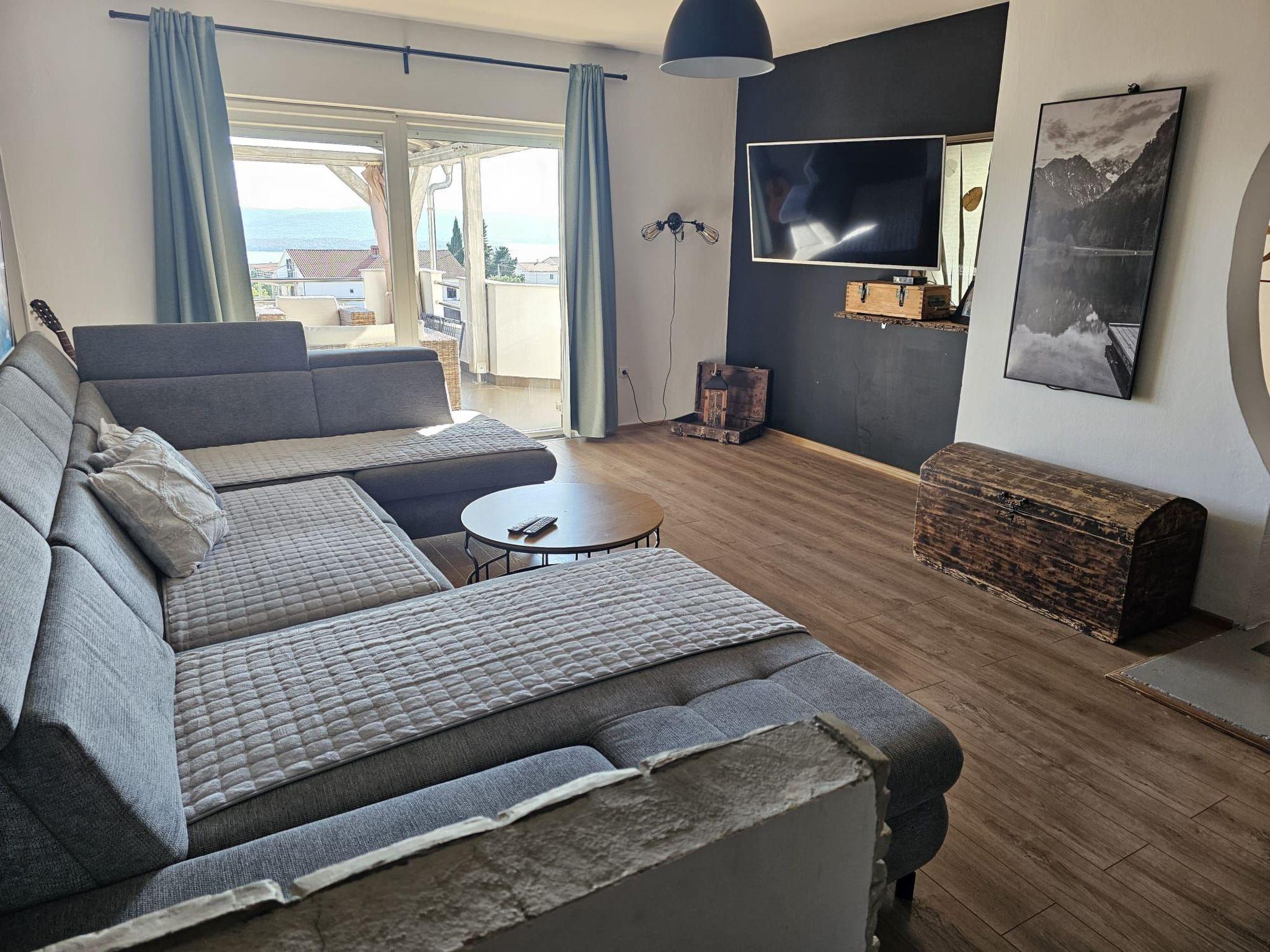 From the terrace of the house you can enjoy a wonderful all-round view of the sea with its small islands, the village and the surrounding area. 3 bedrooms, a bathroom with bath/shower and WC, 1 guest WC and a large central lounge with fitted kitchen including fridge, electric gas cooker, sink and microwave. From this lounge, a balcony door leads onto our approx. 50 square metre balcony. further facilities include:The flat is fully equipped with 120 square metres. German/Croatian/English TV programmes, WLAN, air conditioning.