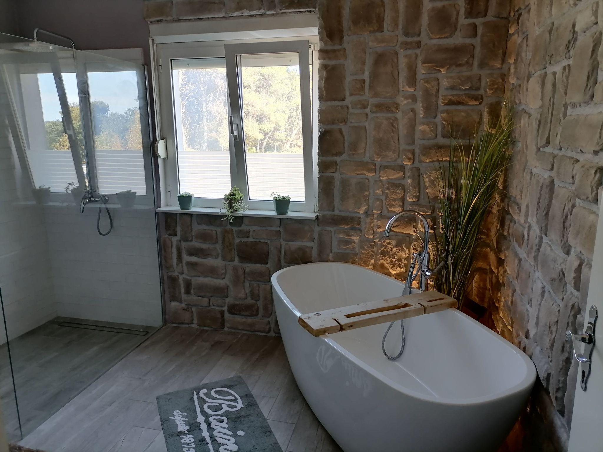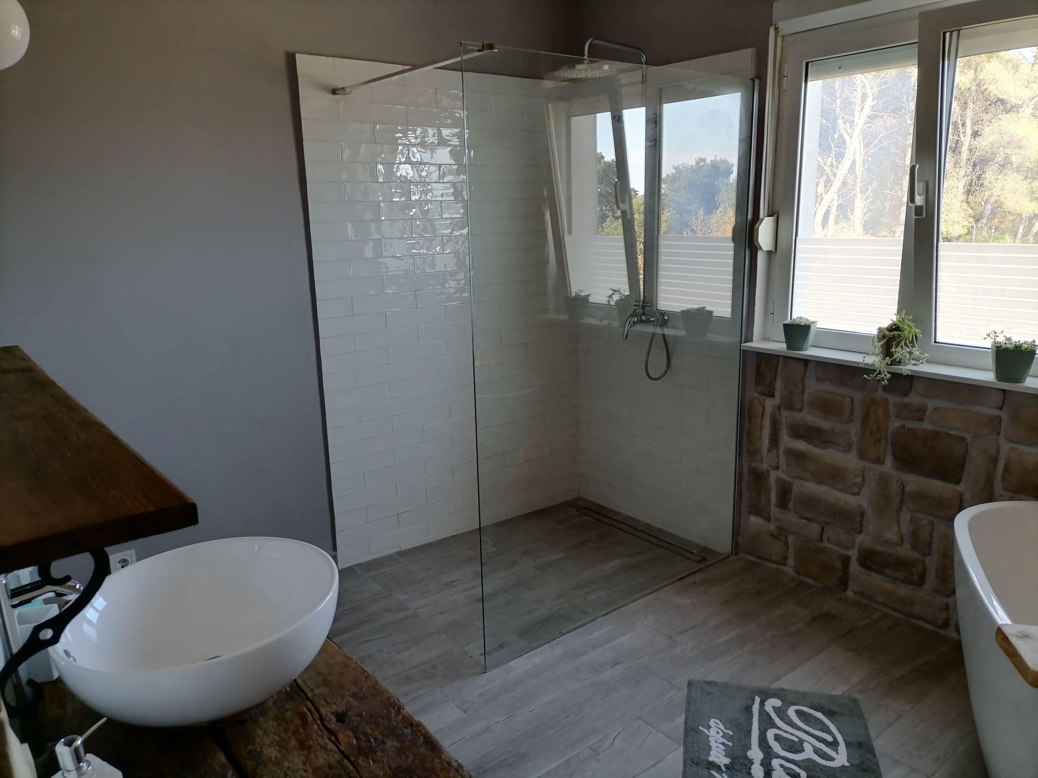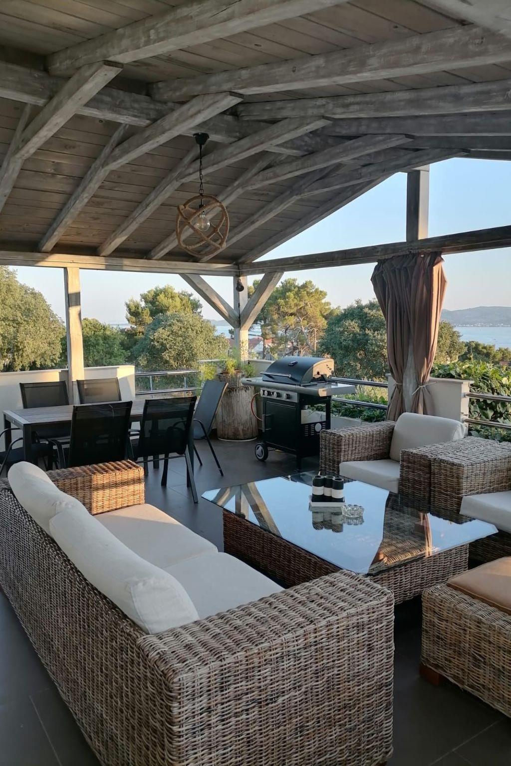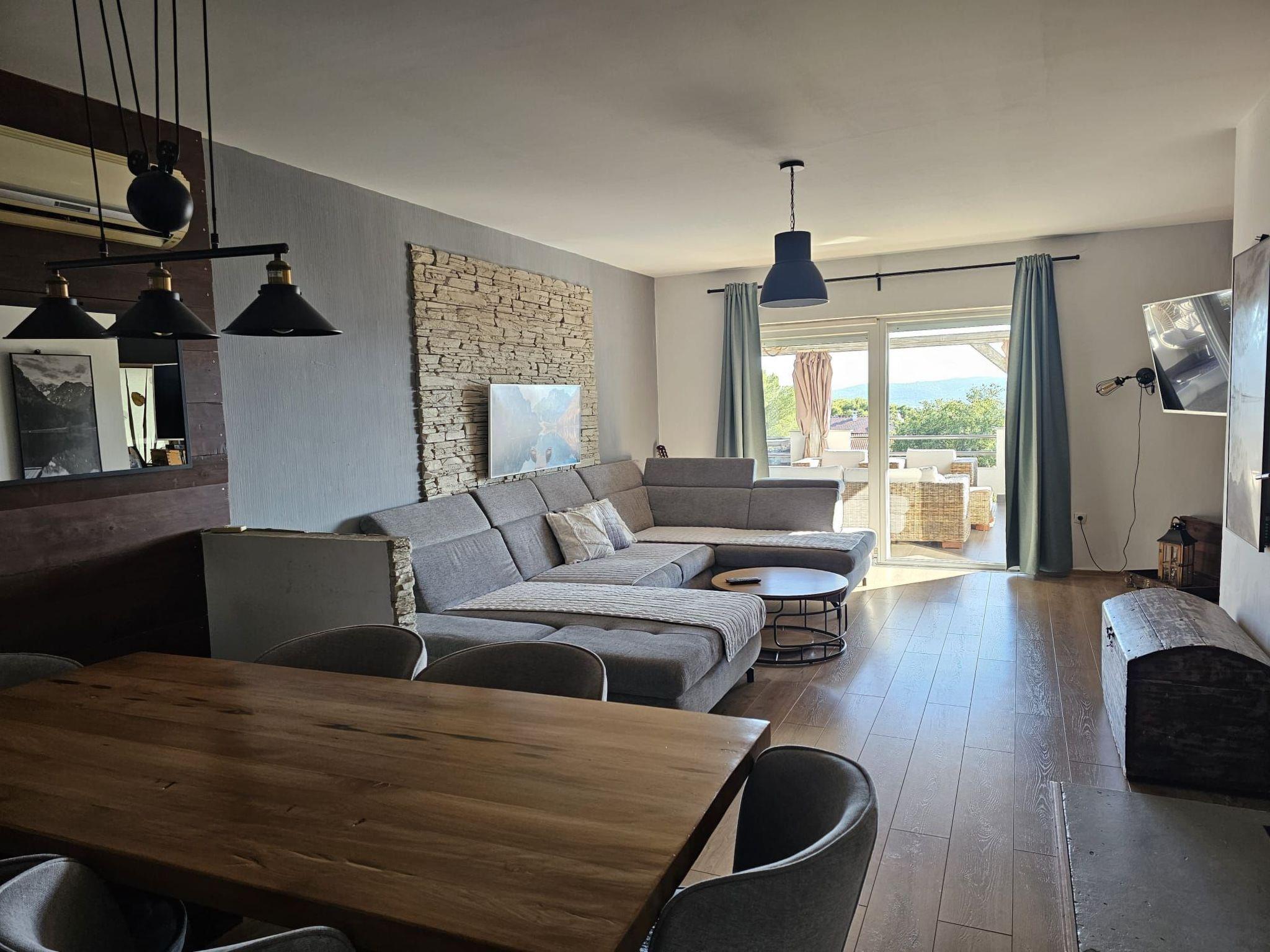 From the terrace of the house you can enjoy a wonderful all-round view of the sea with its small islands, the village and the surrounding area. 3 bedrooms, a bathroom with bath/shower and WC, 1 guest WC and a large central lounge with fitted kitchen including fridge, electric gas cooker, sink and microwave. From this lounge, a balcony door leads onto our approx. 50 square metre balcony. further facilities include:The flat is fully equipped with 120 square metres. German/Croatian/English TV programmes, WLAN, air conditioning.