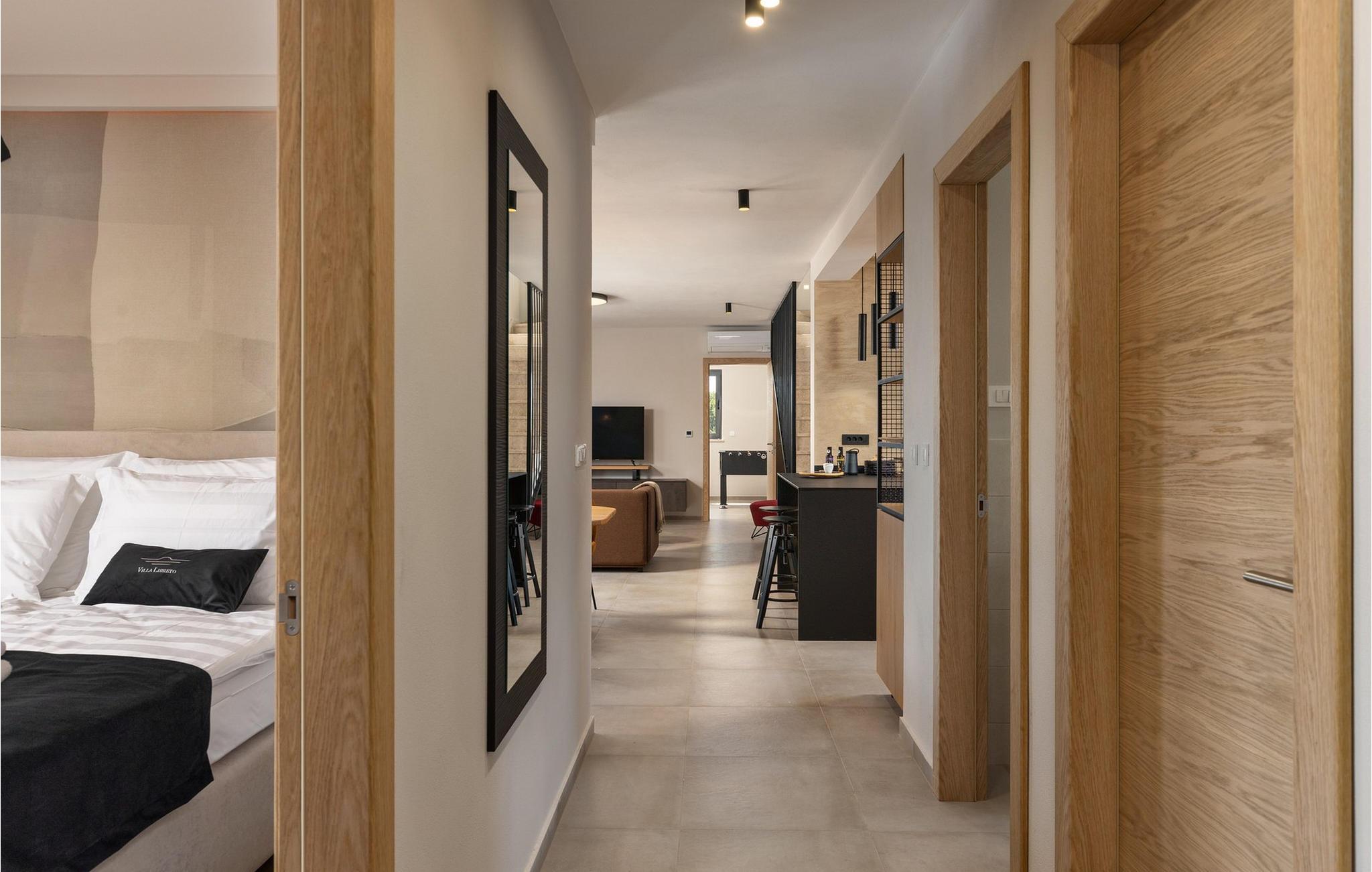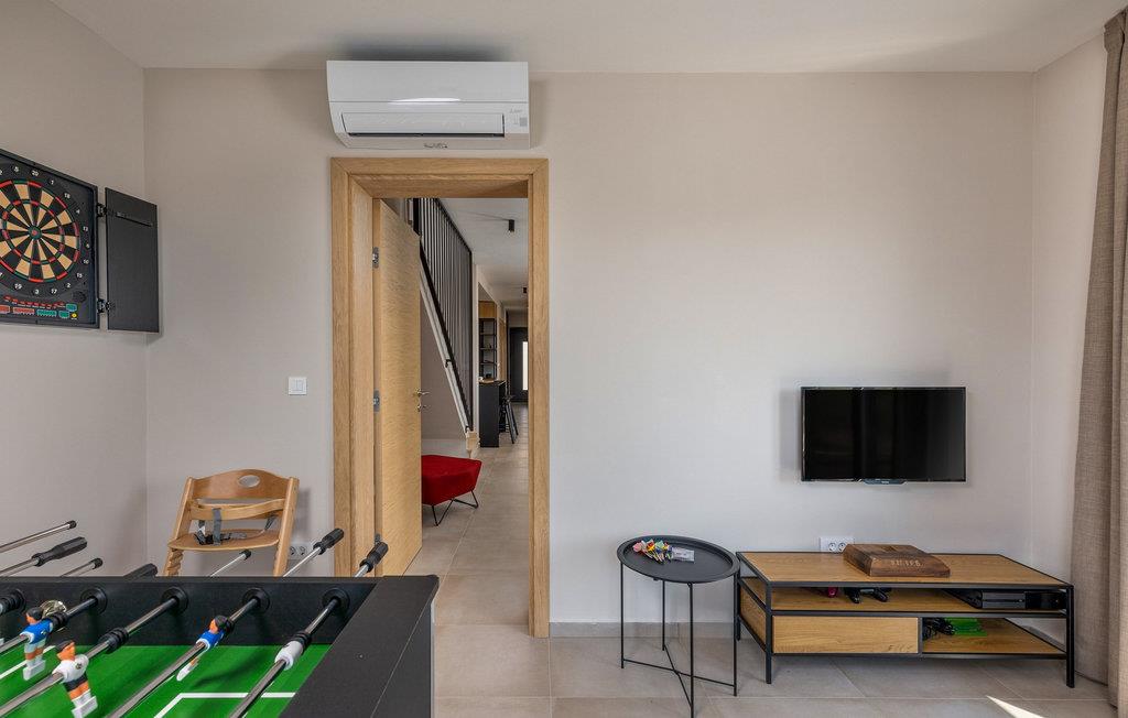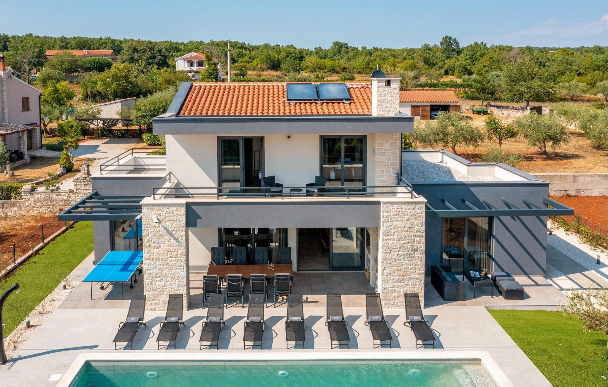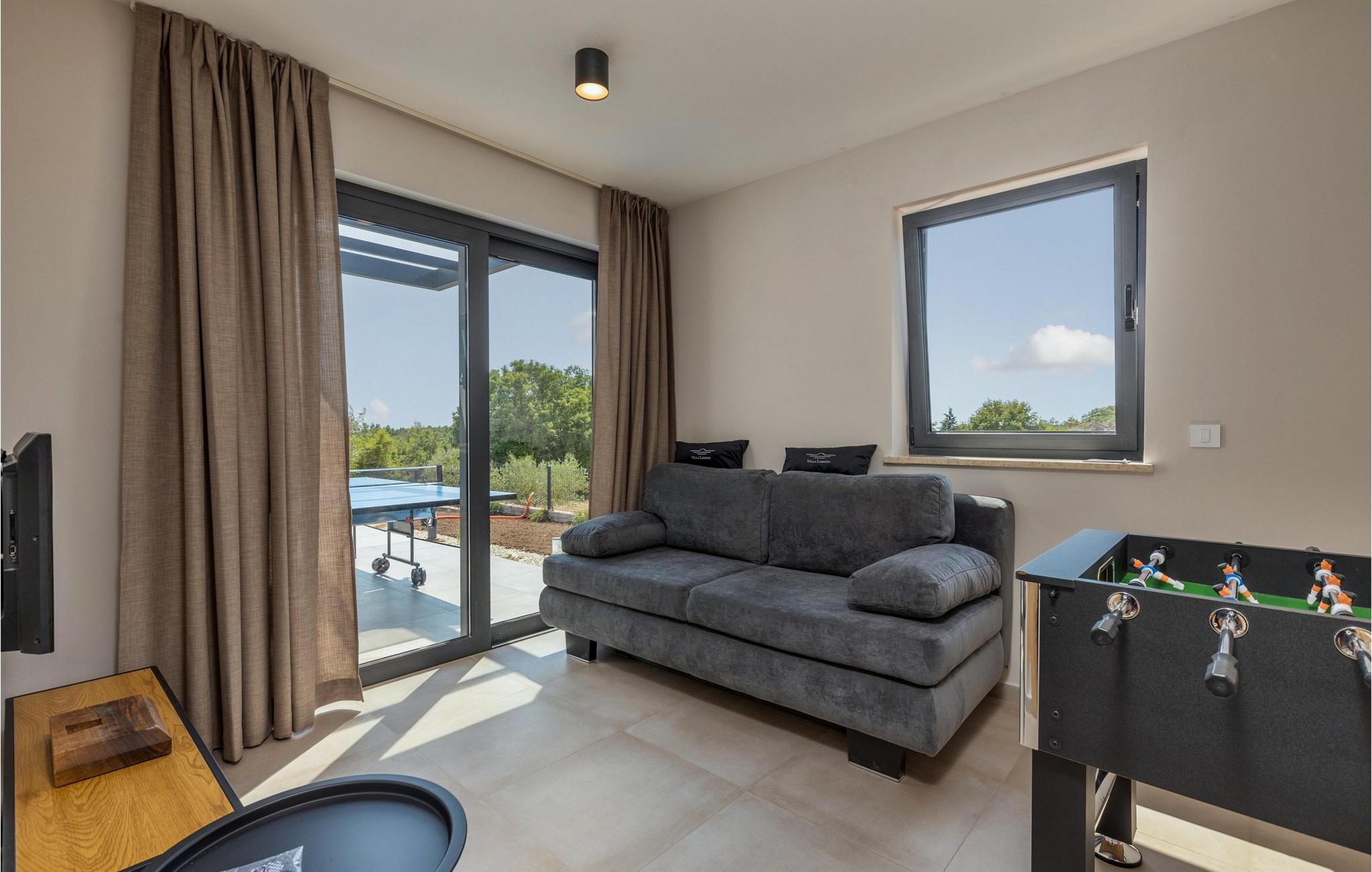 Villa Libreto ligger i Istrien, i Sveti Lovrec Pazenaticki, hvor alt er tæt på og let tilgængeligt. Denne moderne skønhed vil give jer den luksuriøse ferie, I længe har drømt om, og I vil føle jer som en kongelig under jeres ophold! Med sit moderne interiør og sans for detaljer fortjener den at blive vist i sektionen "Designer Spaces" i det berømte kroatiske tv-program "InDizajn" i foråret 2023. Og nu nogle grundlæggende og nyttige oplysninger: Ejendommens samlede areal er 992 m². Villaens gård er indhegnet med en minimumshøjde på 70-80 cm. Der er også et udendørs legeområde for børn med to gynger og en rutsjebane. I kan også spille bordtennis eller blot slappe af på havemøblerne i skyggen, mens I lytter til fuglesang eller jeres yndlingsmusik. Villaen blev bygget i 2021 og tilbyder sine gæster 190 m² boligareal. Villaen har plads til maksimalt 8 personer, selvom det optimale antal er 6. Gæsterne indkvarteres i tre soveværelser med dobbeltsenge og har også adgang til tre badeværelser med bruser. Stuen har en hjørnesofa, to små borde, en sofa og et tv. Ved siden af ??hjørnesofaen er der en spisestue med et spisebord til 8 personer og et moderne og fuldt udstyret køkken med to barstole til at tilberede lækre måltider. Vi har omhyggeligt designet køkkenet med alle detaljer, inklusive service, apparater og udstyr, for at få jer til at føle jer så hjemme som muligt. For bogelskere har vi skabt et læsehjørne med et bibliotek med nogle aktuelle hits og nogle andre klassikere. Der er også et separat toilet og en sovesofa (150x200) til to ekstra personer i spillerummet. Spillerummet har bordfodbold, dart og en Xbox-spillekonsol med tv. Andre faciliteter, der vil være nyttige under jeres ophold, inkluderer en vaskemaskine, tørretumbler, strygejern, maddispenser og en babyseng. På den udendørs terrasse er der en 31 m² stor pool med en dybde på 1,5 meter. Yderligere faciliteter inkluderer trapper og to spabade. Den kan opvarmes mod et gebyr. I kan solbade på 8 liggestole, mens I læser en god bog. Terrassen har også en udendørs kul-/brændefyret grill og et udendørs spisebord. Villaen tilbyder 2-3 parkeringspladser. Nærliggende attraktioner og lokale aktiviteter inkluderer vinture, vandsport, et vandland, der især vil glæde de små, Porec-skiliften, cykling og meget mere! St. Lovrec er en skjult perle og en af ??de bedst bevarede middelalderlige befæstede byer i Istrien. Overgiv jer til Istriens charme, smag lækre gastronomiske retter og vine, og føl jer som en kongelig på Villa Libreto! Velkommen! Kæledyr er tilladt på denne ejendom efter ejerens skøn eller mod et gebyr. Bemærk venligst, at denne ejendom ikke accepterer ungdomsgrupper eller polterabender. En ungdomsgruppe på denne ejendom består af personer under 30 år. Book venligst ikke denne ejendom, hvis I er en ungdomsgruppe eller en polterabend, da jeres booking vil blive afvist efter booking, hvilket også kan ske ved ankomst til ejendommen eller under jeres ophold, og I vil ikke blive refunderet.
