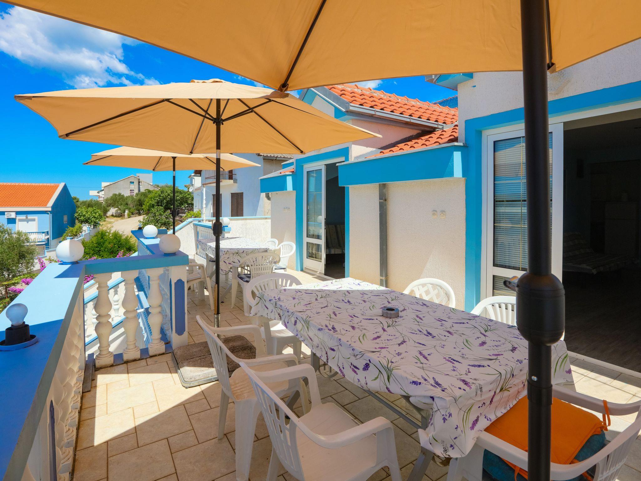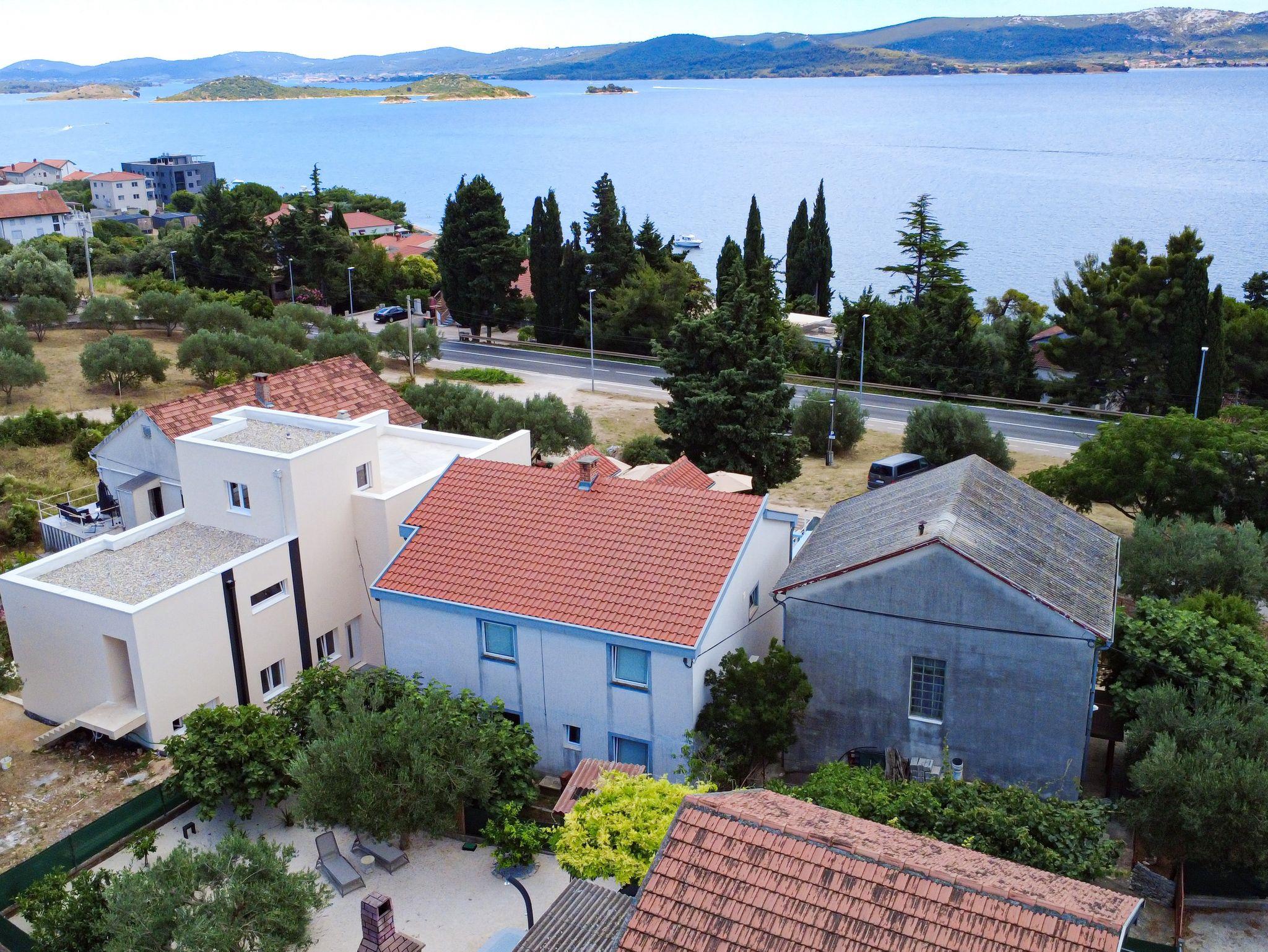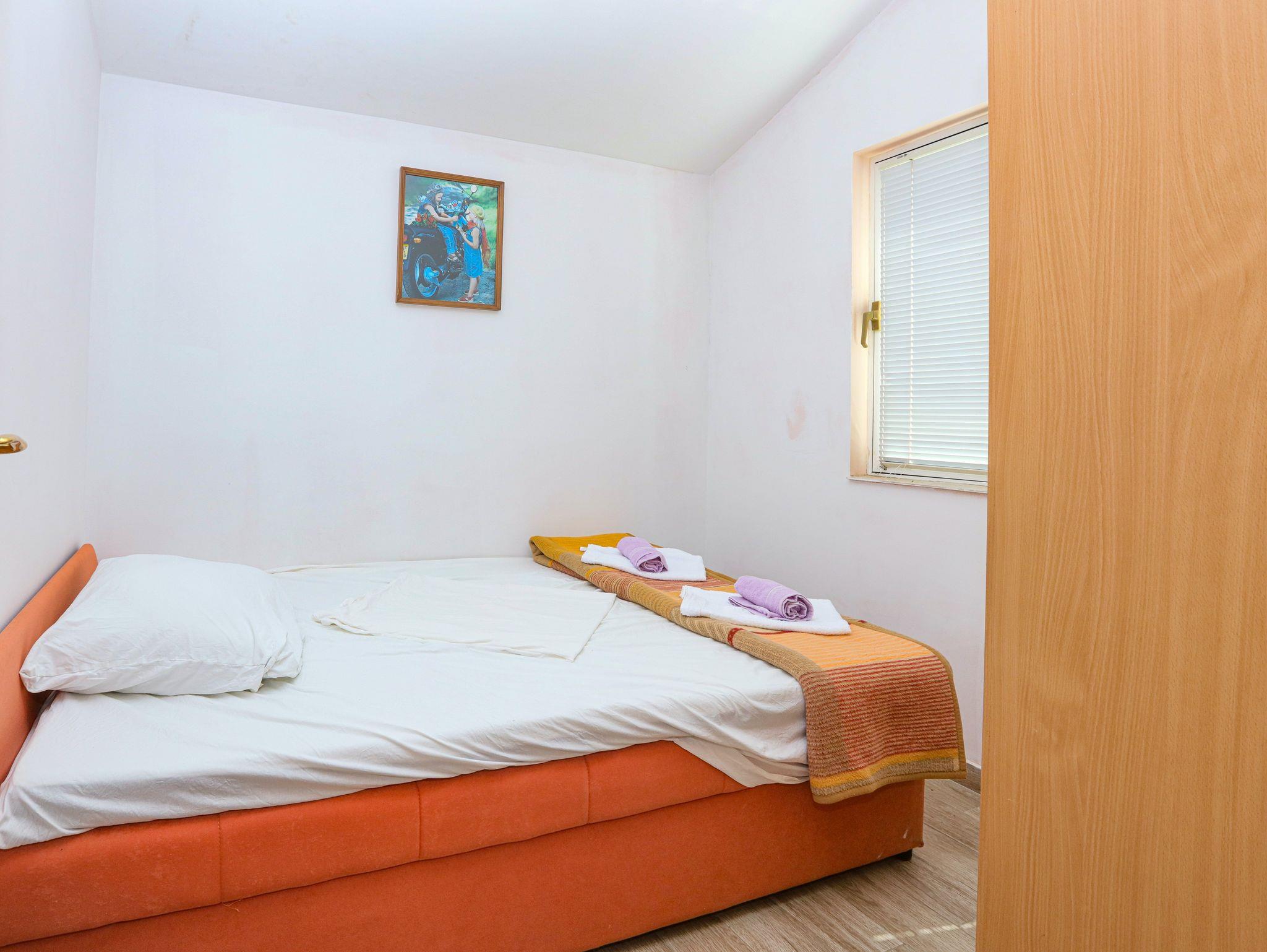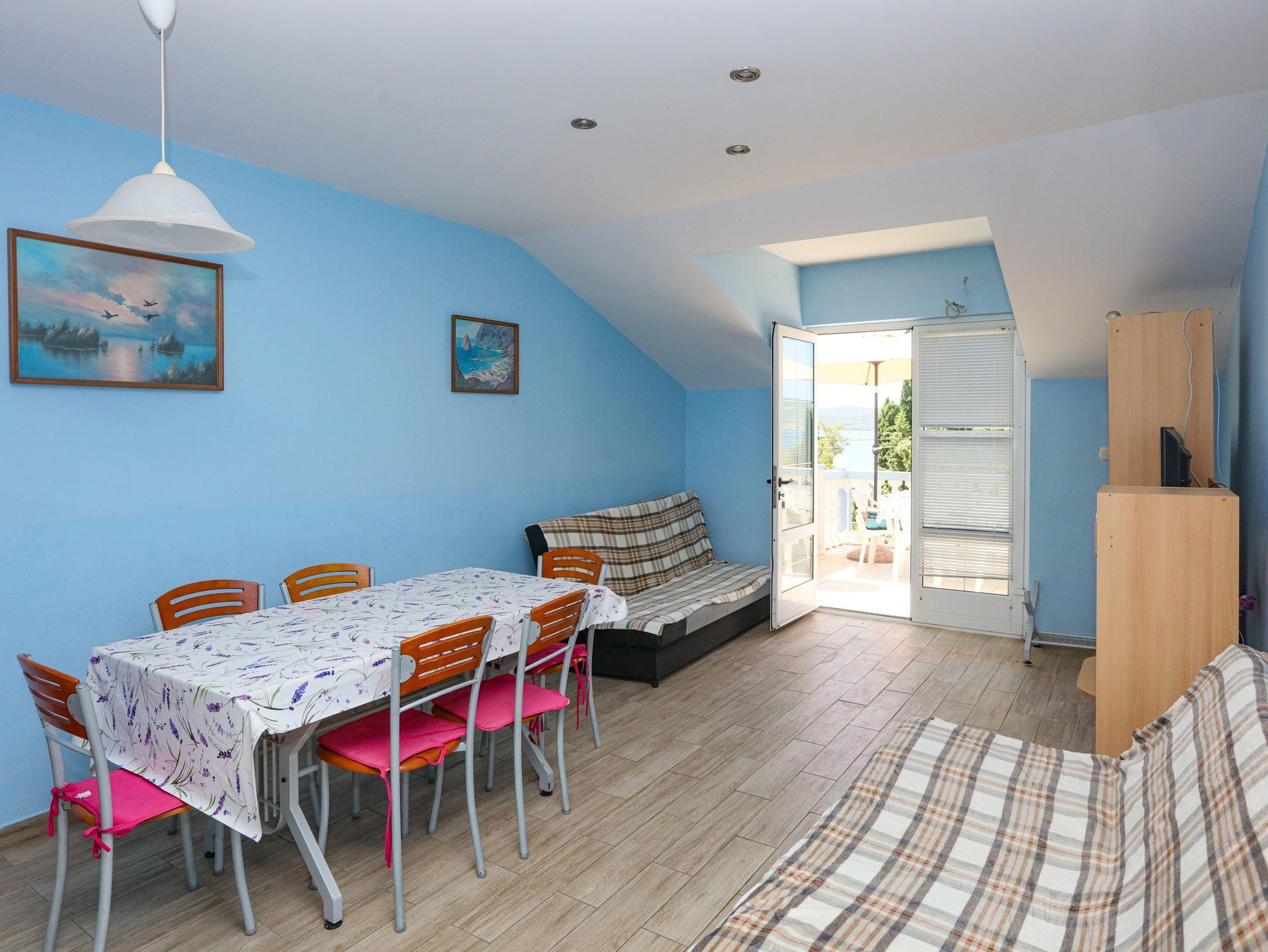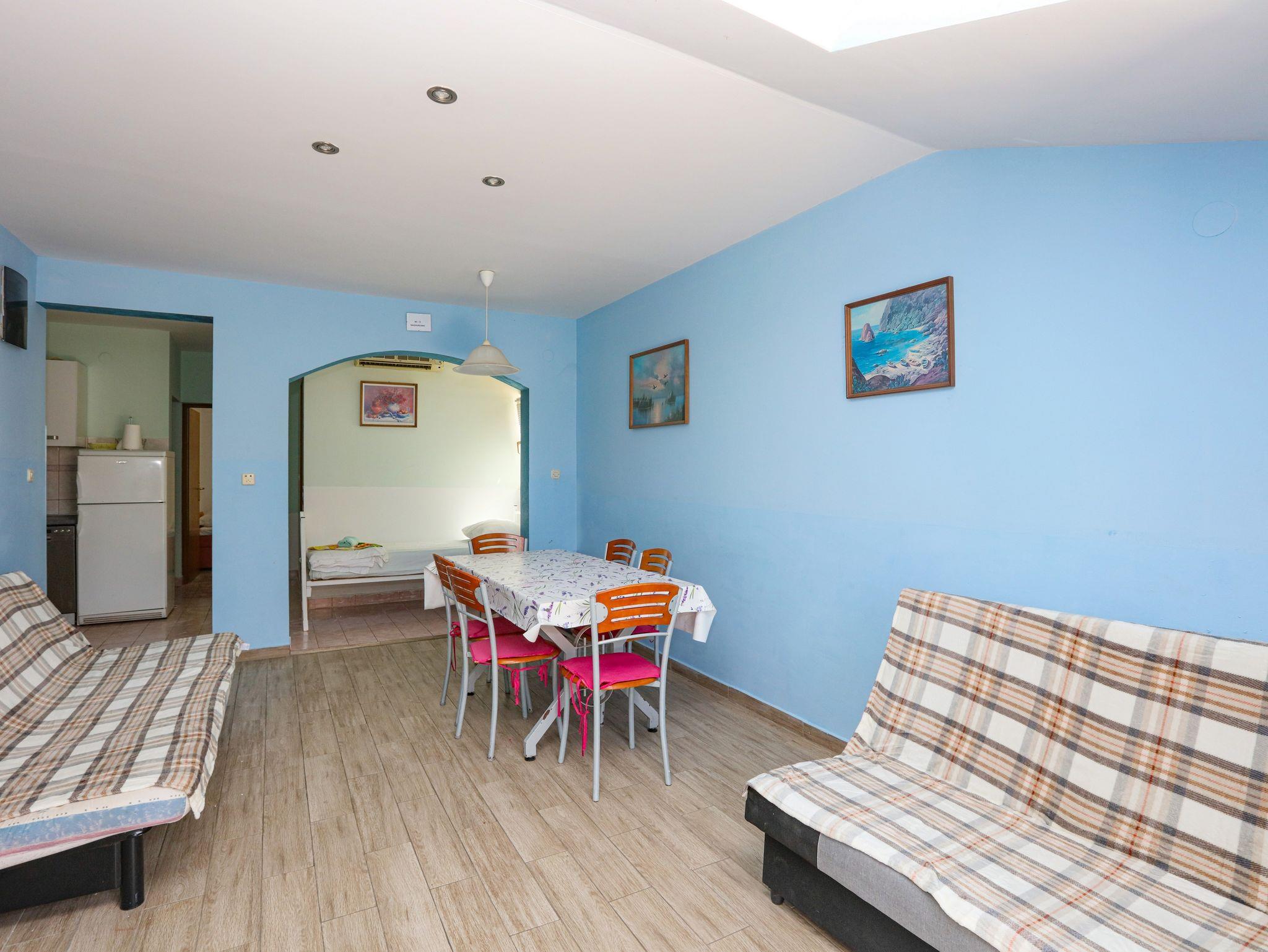 Ferienwohnung bietet Platz für 8 Gäste. Die Betten sind in Schlafzimmern, die es 2 gibt, und in Wohnzimmer, innerhalb einer Gesamtfläche von 65m2, angeordnet. Die Gäste haben eine eigene Terrasse zur Verfügung, auf der sie in warmen Sommernächten genießen können. Das Apartment bietet Meerblick. Es ist erlaubt, Speisen auf dem Gemeinschafts-Grill vorzubereiten. In der Unterkunftseinheit besteht die Möglichkeit des Mitbringens von Haustieren gegen Aufpreis. IM PREIS INBEGRIFFEN: Kurtaxe, Endreinigung, Klimatisierung, Parkplatz, Internet, Wäschewaschen, Bügeleisen, Bügelbrett, Föhn. VERBINDLICHE ZUSÄTZLICHE KOSTEN: Aufzahlung für Kurzaufenthalte (prozentualer Zuschlag pro Nächtigungsanzahl: 30% - 1, 20% - 2, 10% - 3). UNVERBINDLICHE ZUSÄTZLICHE KOSTEN: Bootsanlegeplatz (7,00 € pro Nacht), Haustiere (7,00 € pro Nacht). Die Verfügbarkeit zusätzlicher Dienstleistungen in Ihrem reservierten Termin und die Preise derselben (falls nicht aufgeführt) müssen im Voraus überprüft werden. Zusätzliche Dienstleistungen die in der Zahlungsaufforderung nicht aufgeführt sind werden direkt beim Vermieter bezahlt, angenommen der Gast nutzt auch diese. Ermäßigung auf den Grundpreis: Gratistag 14=13 (bei einem Aufenthalt von 14 Tagen oder mehr erhalten Sie einen Gratistag für den Aufenthalt bis 31.12.26).