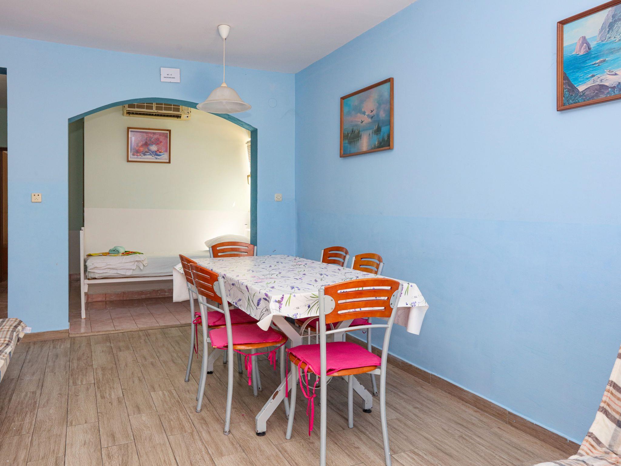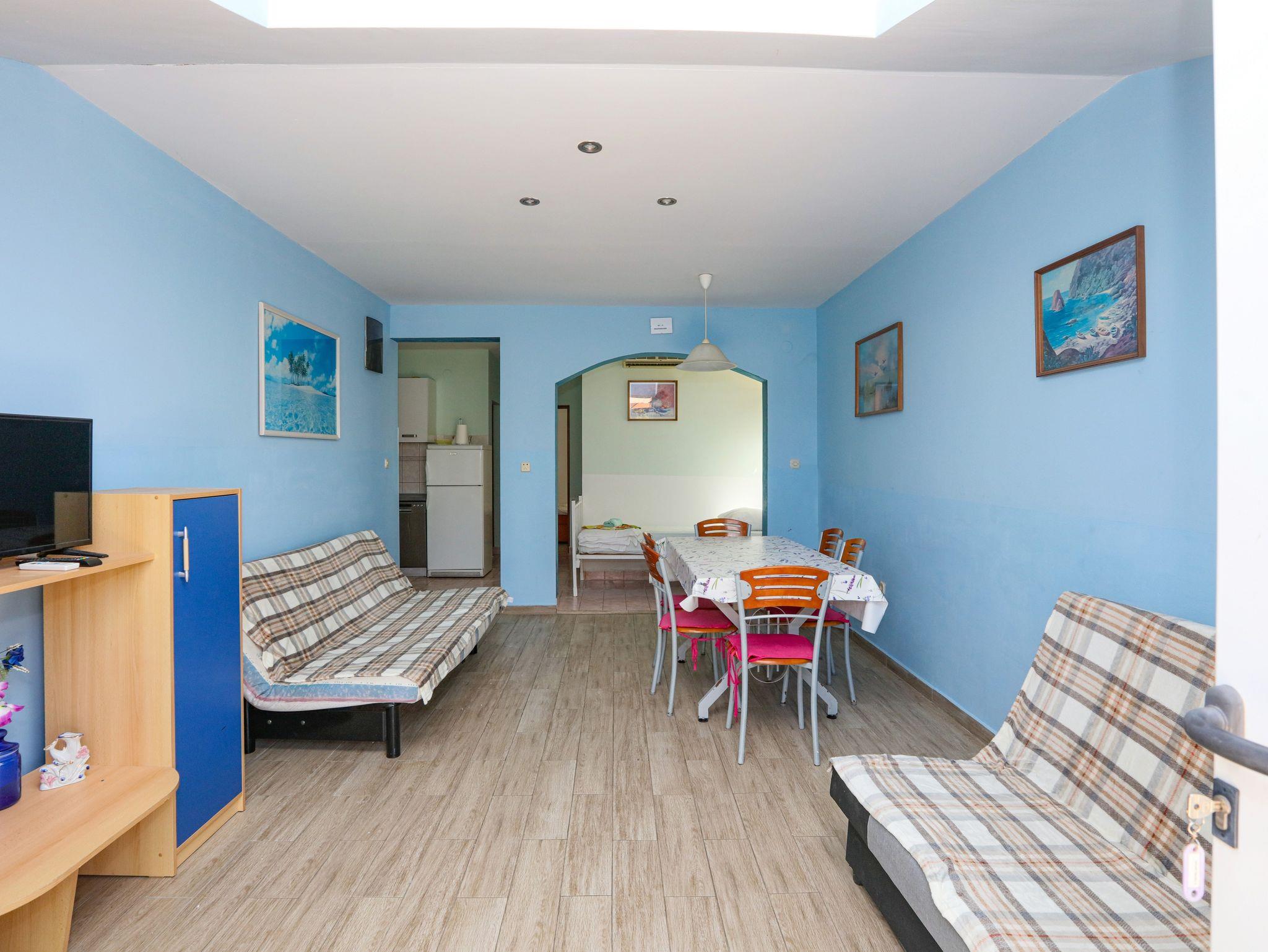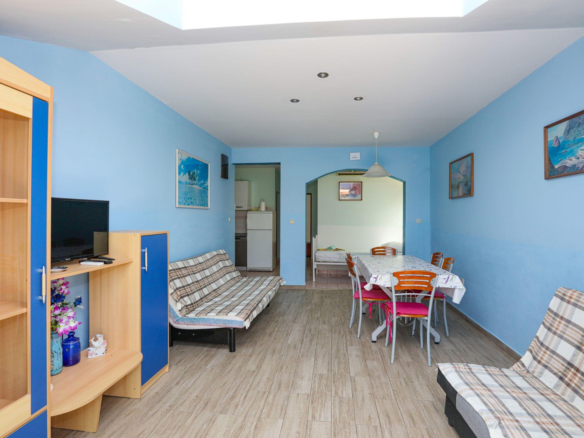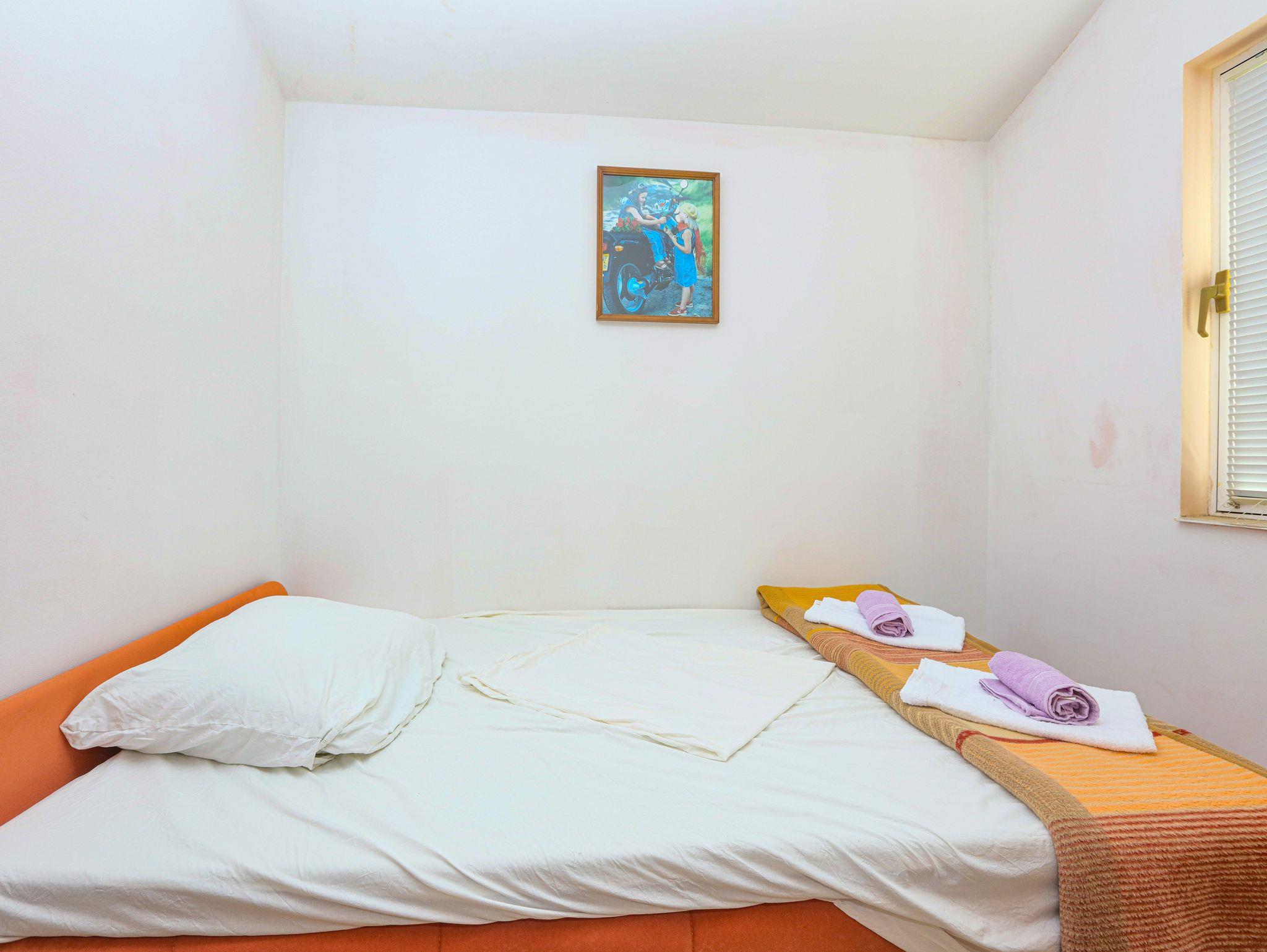 Ferienwohnung bietet Platz für 8 Gäste. Die Betten sind in Schlafzimmern, die es 2 gibt, und in Wohnzimmer, innerhalb einer Gesamtfläche von 65m2, angeordnet. Die Gäste haben eine eigene Terrasse zur Verfügung, auf der sie in warmen Sommernächten genießen können. Das Apartment bietet Meerblick. Es ist erlaubt, Speisen auf dem Gemeinschafts-Grill vorzubereiten. In der Unterkunftseinheit besteht die Möglichkeit des Mitbringens von Haustieren gegen Aufpreis. IM PREIS INBEGRIFFEN: Kurtaxe, Endreinigung, Klimatisierung, Parkplatz, Internet, Wäschewaschen, Bügeleisen, Bügelbrett, Föhn. VERBINDLICHE ZUSÄTZLICHE KOSTEN: Aufzahlung für Kurzaufenthalte (prozentualer Zuschlag pro Nächtigungsanzahl: 30% - 1, 20% - 2, 10% - 3). UNVERBINDLICHE ZUSÄTZLICHE KOSTEN: Bootsanlegeplatz (7,00 € pro Nacht), Haustiere (7,00 € pro Nacht). Die Verfügbarkeit zusätzlicher Dienstleistungen in Ihrem reservierten Termin und die Preise derselben (falls nicht aufgeführt) müssen im Voraus überprüft werden. Zusätzliche Dienstleistungen die in der Zahlungsaufforderung nicht aufgeführt sind werden direkt beim Vermieter bezahlt, angenommen der Gast nutzt auch diese. Ermäßigung auf den Grundpreis: Gratistag 14=13 (bei einem Aufenthalt von 14 Tagen oder mehr erhalten Sie einen Gratistag für den Aufenthalt bis 31.12.26).