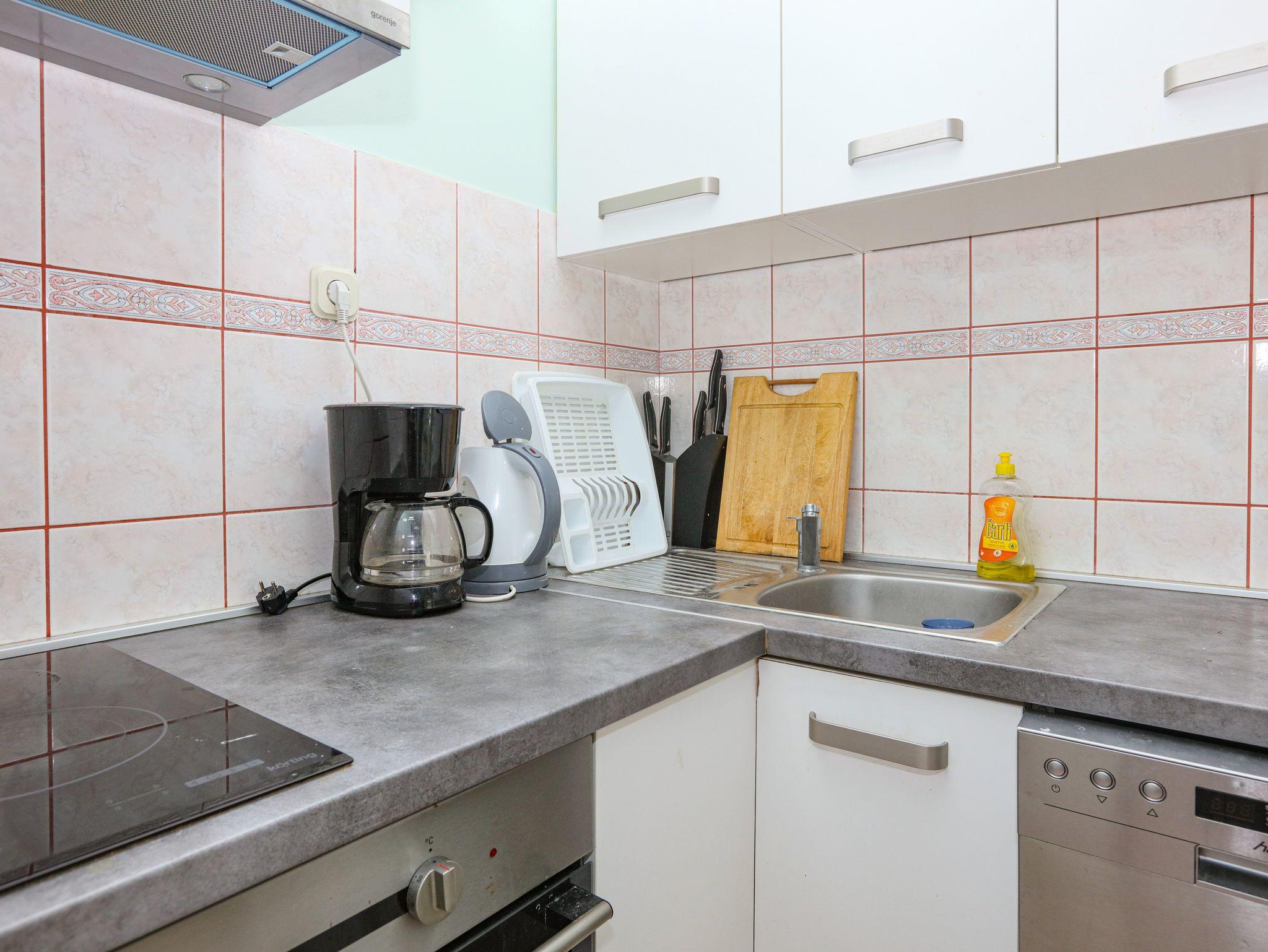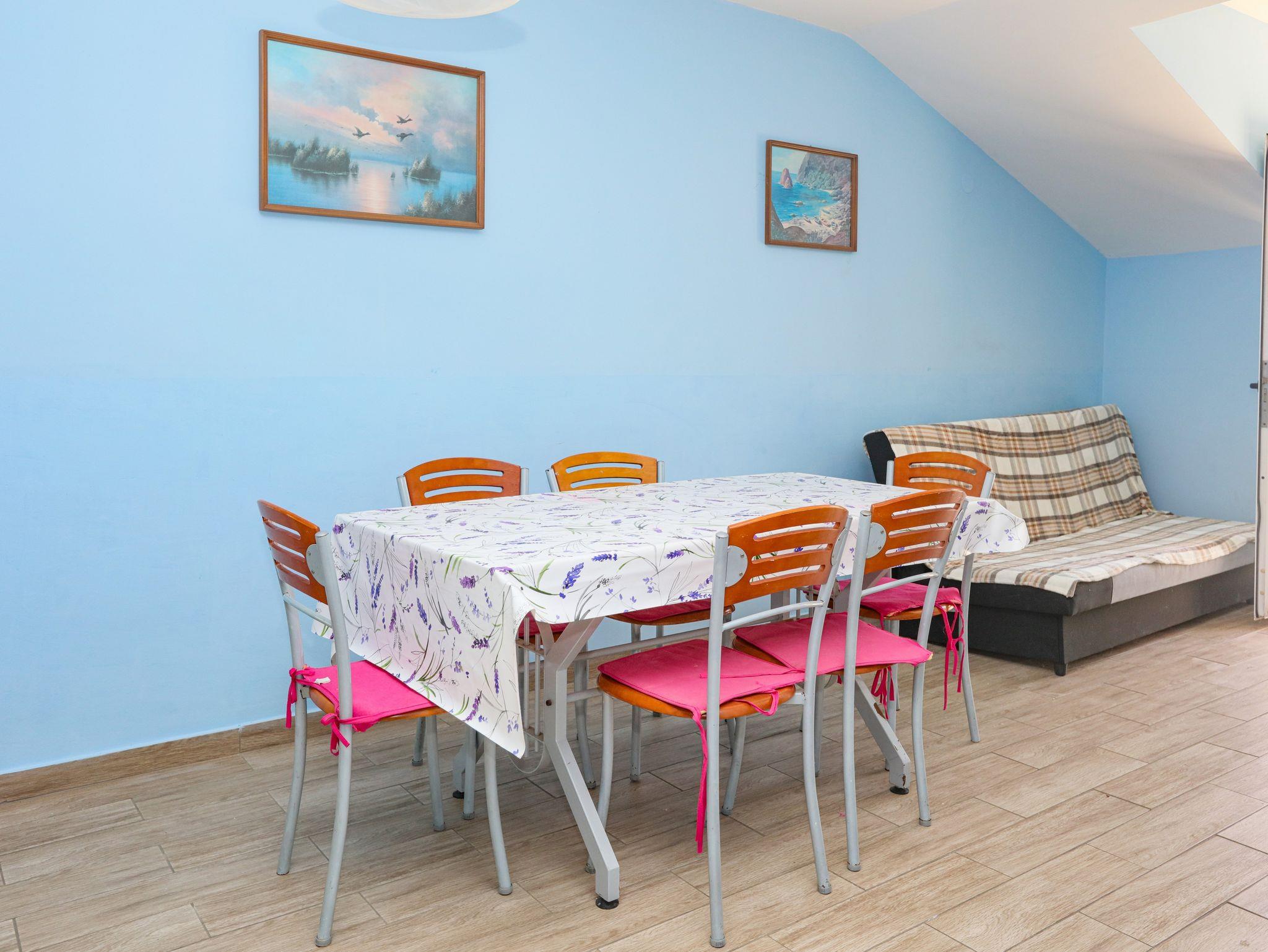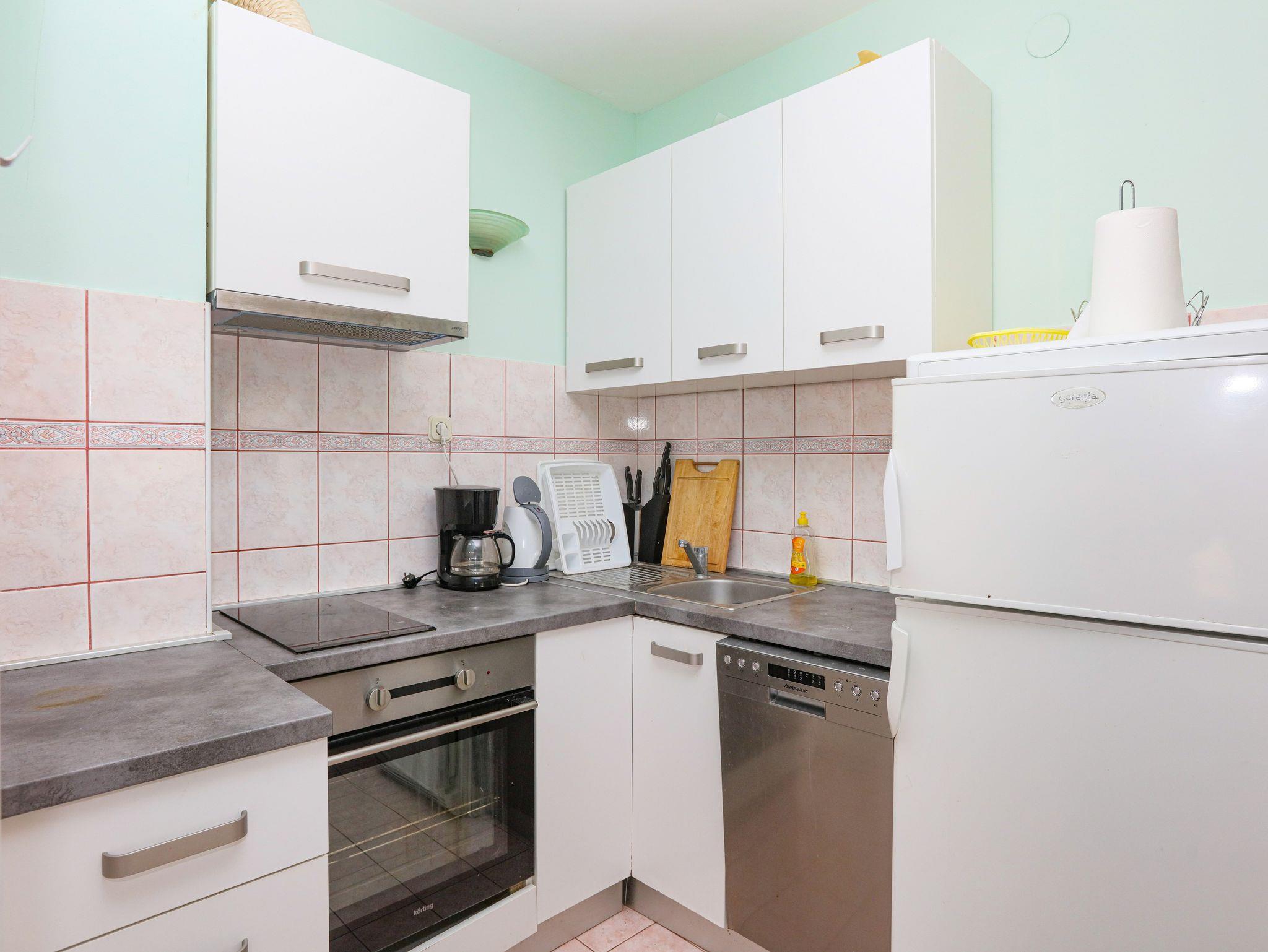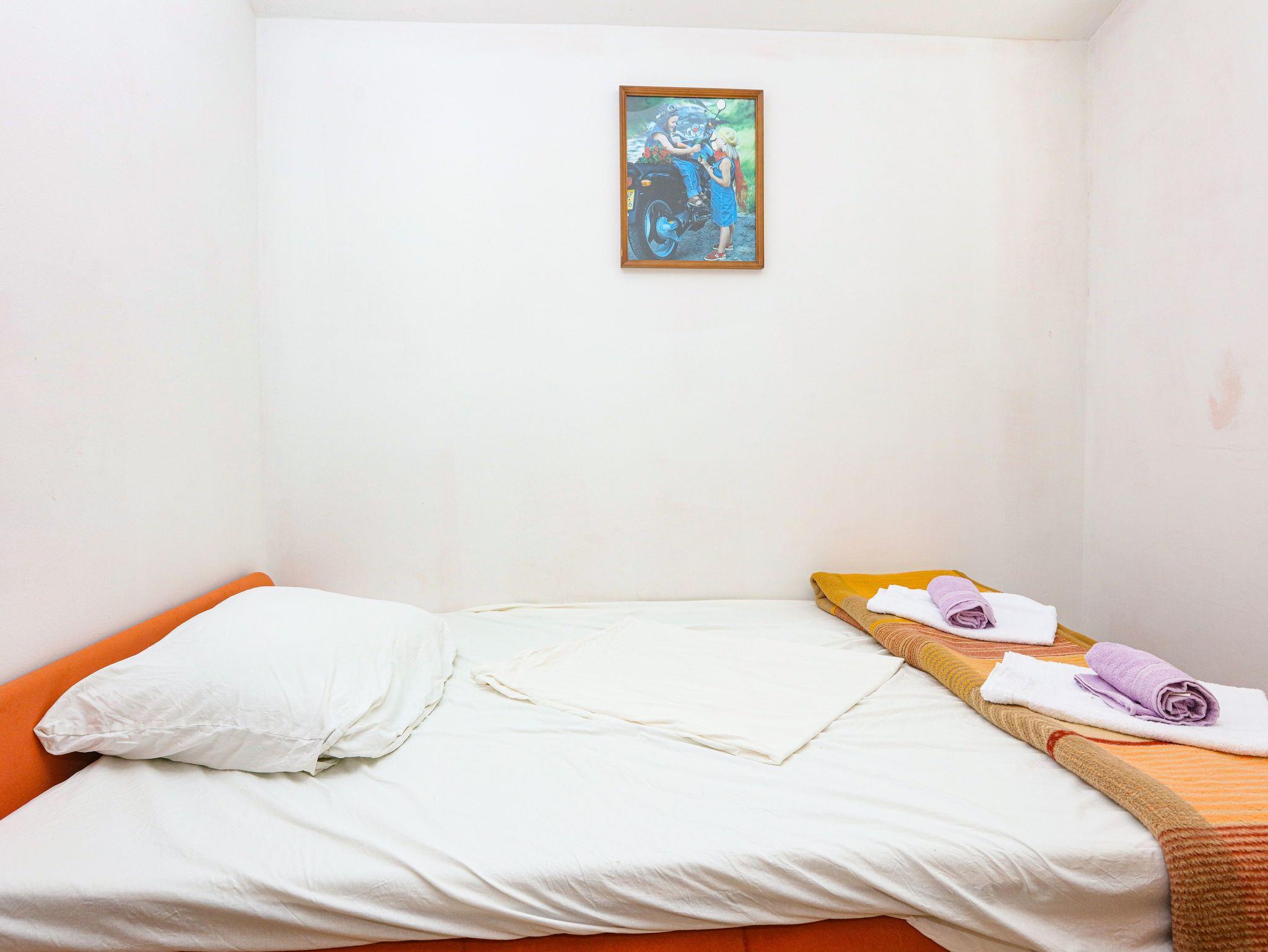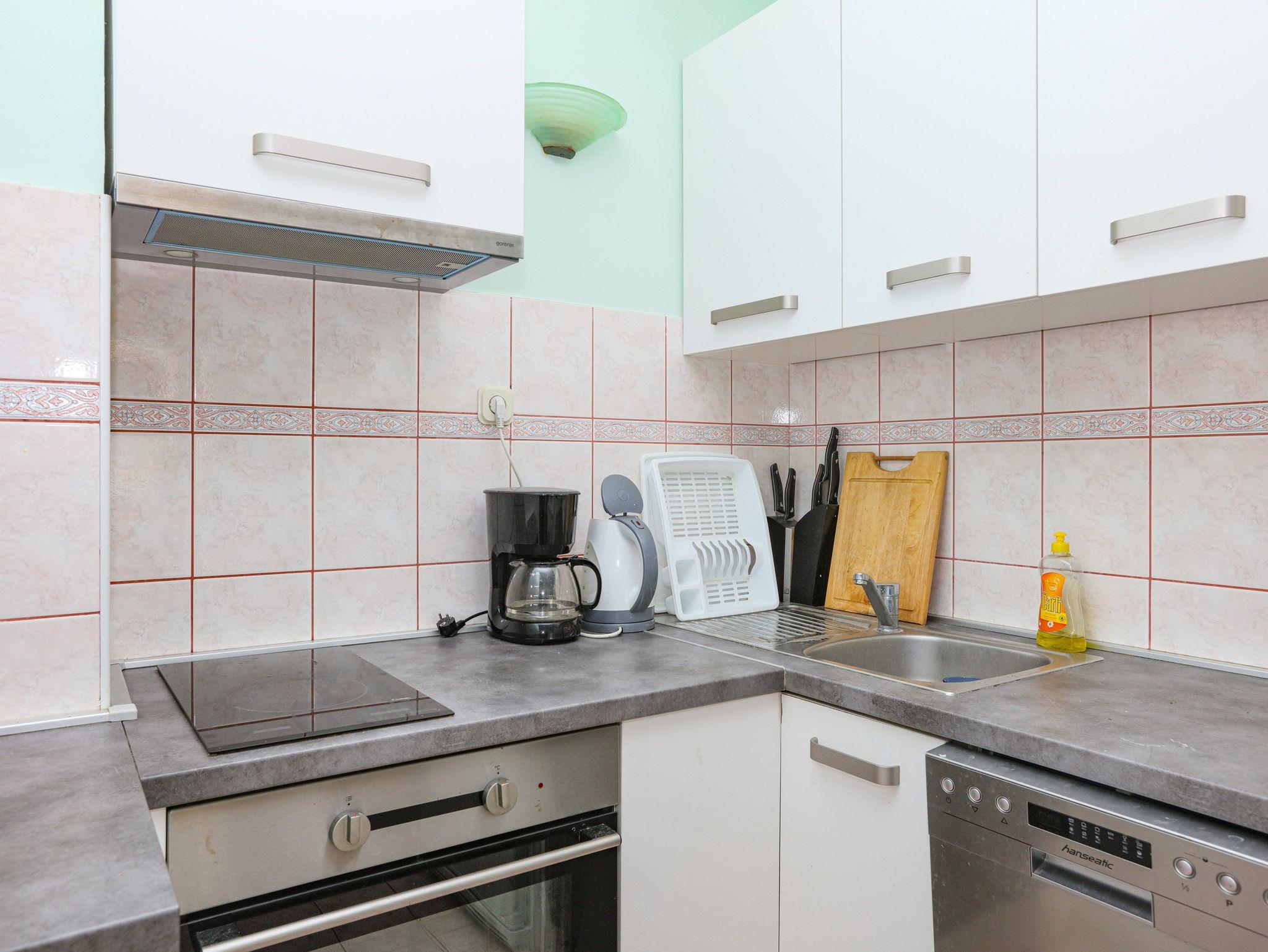 Ferienwohnung bietet Platz für 8 Gäste. Die Betten sind in Schlafzimmern, die es 2 gibt, und in Wohnzimmer, innerhalb einer Gesamtfläche von 65m2, angeordnet. Die Gäste haben eine eigene Terrasse zur Verfügung, auf der sie in warmen Sommernächten genießen können. Das Apartment bietet Meerblick. Es ist erlaubt, Speisen auf dem Gemeinschafts-Grill vorzubereiten. In der Unterkunftseinheit besteht die Möglichkeit des Mitbringens von Haustieren gegen Aufpreis. IM PREIS INBEGRIFFEN: Kurtaxe, Endreinigung, Klimatisierung, Parkplatz, Internet, Wäschewaschen, Bügeleisen, Bügelbrett, Föhn. VERBINDLICHE ZUSÄTZLICHE KOSTEN: Aufzahlung für Kurzaufenthalte (prozentualer Zuschlag pro Nächtigungsanzahl: 30% - 1, 20% - 2, 10% - 3). UNVERBINDLICHE ZUSÄTZLICHE KOSTEN: Bootsanlegeplatz (7,00 € pro Nacht), Haustiere (7,00 € pro Nacht). Die Verfügbarkeit zusätzlicher Dienstleistungen in Ihrem reservierten Termin und die Preise derselben (falls nicht aufgeführt) müssen im Voraus überprüft werden. Zusätzliche Dienstleistungen die in der Zahlungsaufforderung nicht aufgeführt sind werden direkt beim Vermieter bezahlt, angenommen der Gast nutzt auch diese. Ermäßigung auf den Grundpreis: Gratistag 14=13 (bei einem Aufenthalt von 14 Tagen oder mehr erhalten Sie einen Gratistag für den Aufenthalt bis 31.12.26).