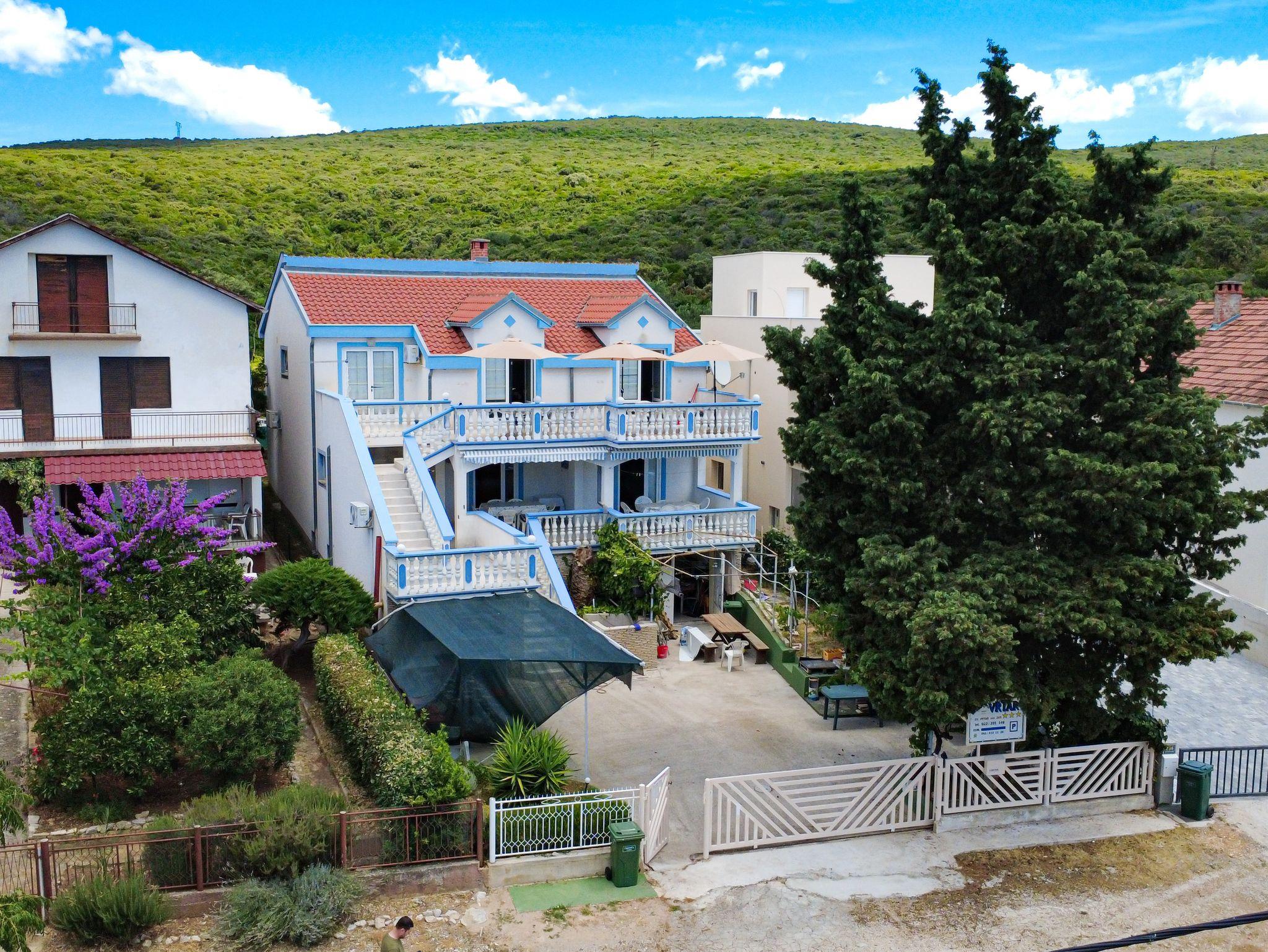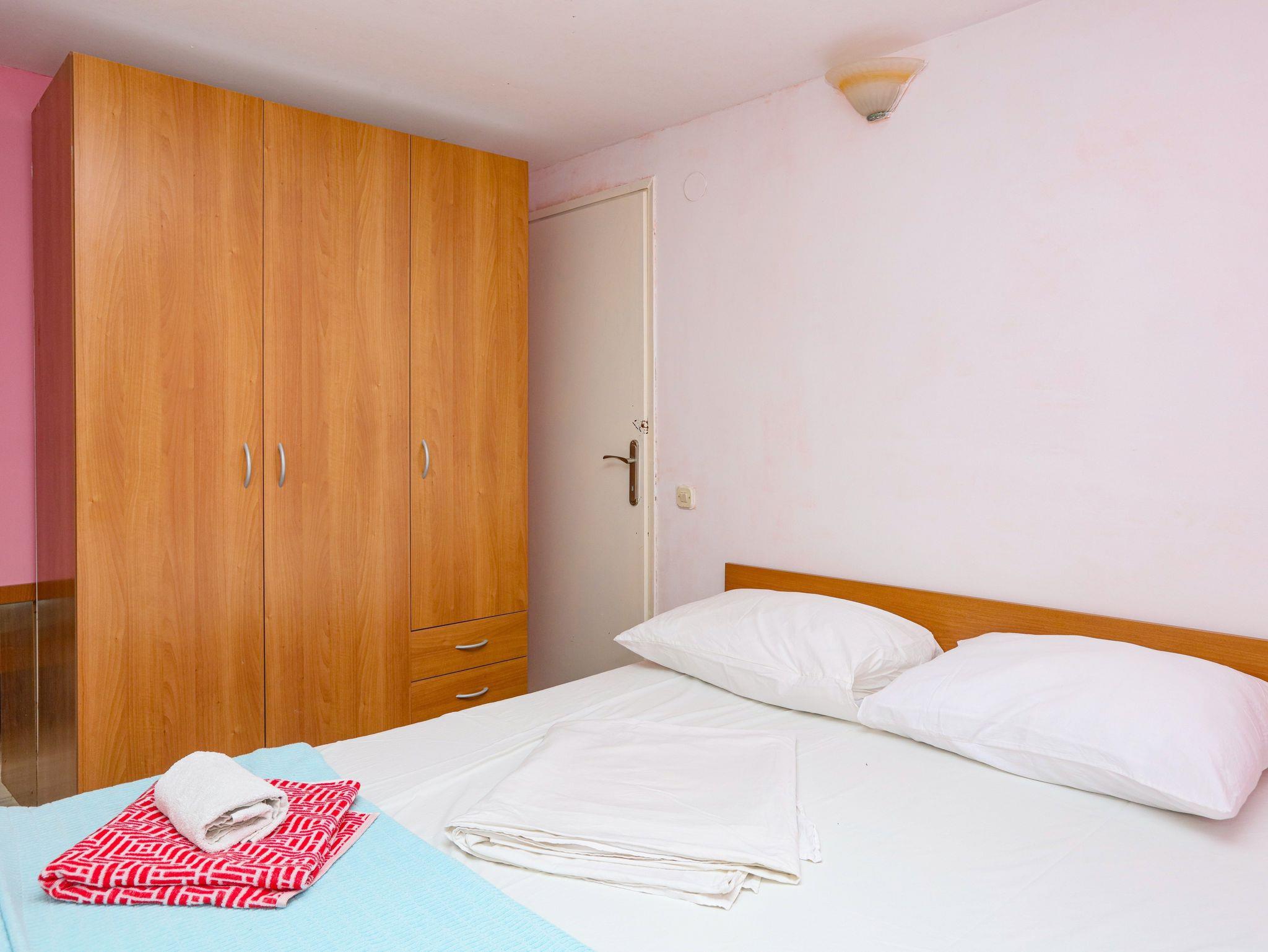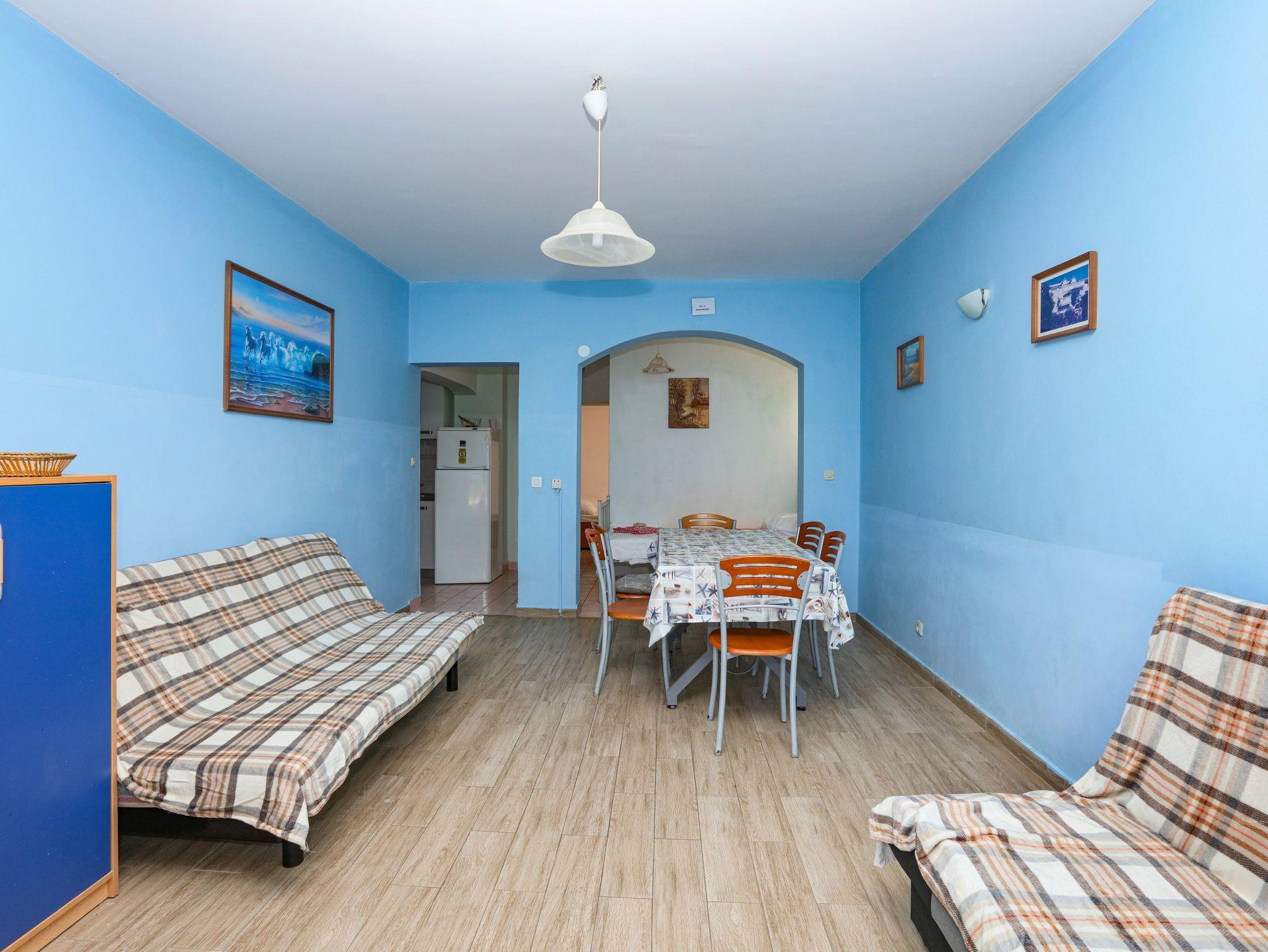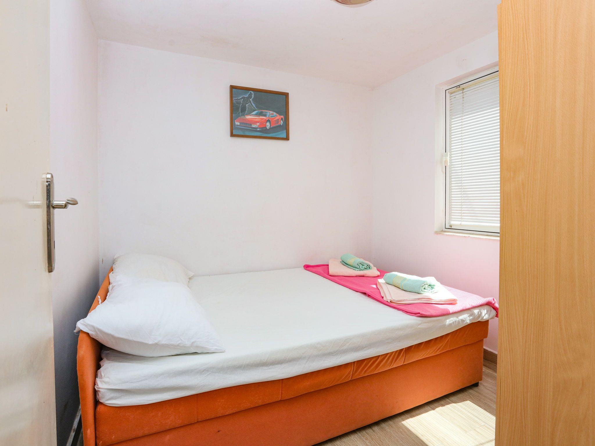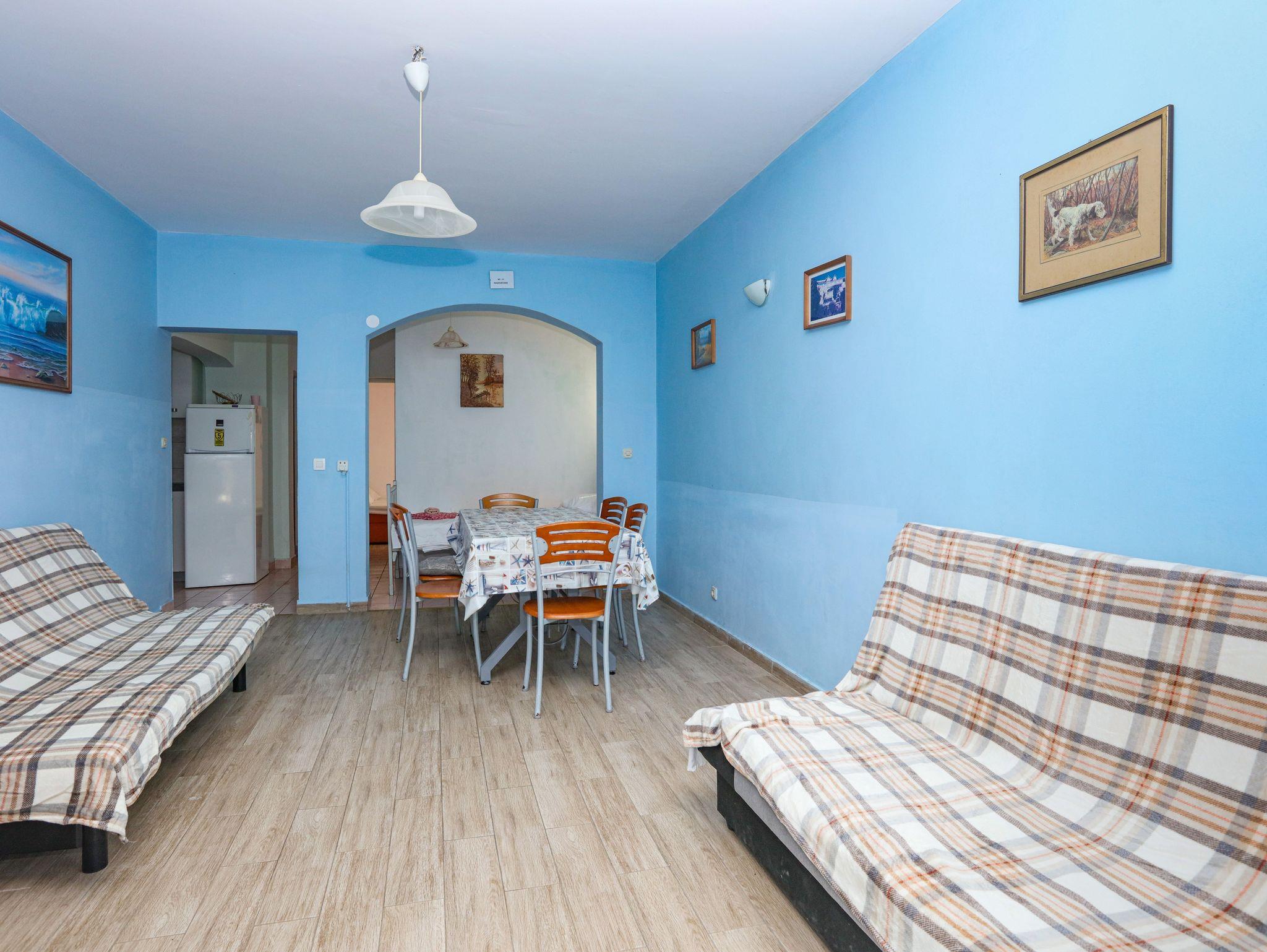 Ferienwohnung bietet Platz für 8 Gäste. Die Betten sind in Schlafzimmern, die es 2 gibt, und in Wohnzimmer, innerhalb einer Gesamtfläche von 63m2, angeordnet. Die Gäste haben eine eigene Terrasse zur Verfügung, auf der sie in warmen Sommernächten genießen können. Das Apartment bietet Meerblick. Es ist erlaubt, Speisen auf dem Gemeinschafts-Grill vorzubereiten. In der Unterkunftseinheit besteht die Möglichkeit des Mitbringens von Haustieren gegen Aufpreis. IM PREIS INBEGRIFFEN: Kurtaxe, Endreinigung, Klimatisierung, Parkplatz, Internet, Wäschewaschen, Zusatzbett, Bügeleisen, Bügelbrett, Föhn. VERBINDLICHE ZUSÄTZLICHE KOSTEN: Aufzahlung für Kurzaufenthalte (prozentualer Zuschlag pro Nächtigungsanzahl: 30% - 1, 20% - 2, 10% - 3). UNVERBINDLICHE ZUSÄTZLICHE KOSTEN: Bootsanlegeplatz (7,00 € pro Nacht), Haustiere (7,00 € pro Nacht). Die Verfügbarkeit zusätzlicher Dienstleistungen in Ihrem reservierten Termin und die Preise derselben (falls nicht aufgeführt) müssen im Voraus überprüft werden. Zusätzliche Dienstleistungen die in der Zahlungsaufforderung nicht aufgeführt sind werden direkt beim Vermieter bezahlt, angenommen der Gast nutzt auch diese. Ermäßigung auf den Grundpreis: Gratistag 14=13 (bei einem Aufenthalt von 14 Tagen oder mehr erhalten Sie einen Gratistag für den Aufenthalt bis 31.12.26).