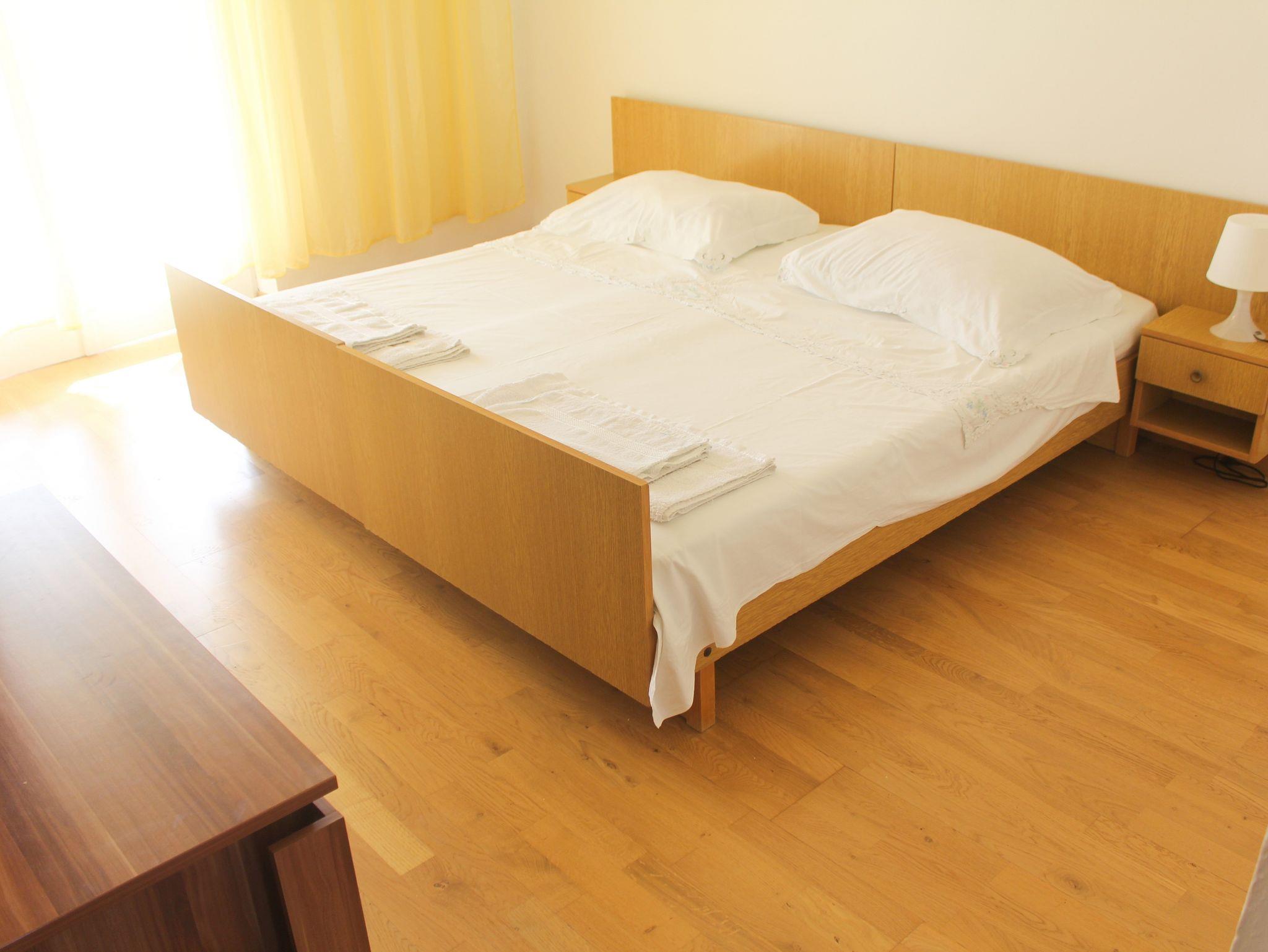 Ferienwohnung bietet Platz für 8 Gäste. Die Betten sind in Schlafzimmern, die es 3 gibt, und in Wohnzimmer, innerhalb einer Gesamtfläche von 72m2, angeordnet. Die Gäste haben eine eigene Terrasse zur Verfügung, auf der sie in warmen Sommernächten genießen können. Es ist erlaubt, Speisen auf dem Gemeinschafts-Grill vorzubereiten. IM PREIS INBEGRIFFEN: Kurtaxe, Endreinigung, Klimatisierung, Parkplatz, Internet, Kinderbett. VERBINDLICHE ZUSÄTZLICHE KOSTEN: Aufzahlung für Kurzaufenthalte (prozentualer Zuschlag pro Nächtigungsanzahl: 30% - 1, 20% - 2, 10% - 3). Die Verfügbarkeit zusätzlicher Dienstleistungen in Ihrem reservierten Termin und die Preise derselben (falls nicht aufgeführt) müssen im Voraus überprüft werden. Zusätzliche Dienstleistungen die in der Zahlungsaufforderung nicht aufgeführt sind werden direkt beim Vermieter bezahlt, angenommen der Gast nutzt auch diese.