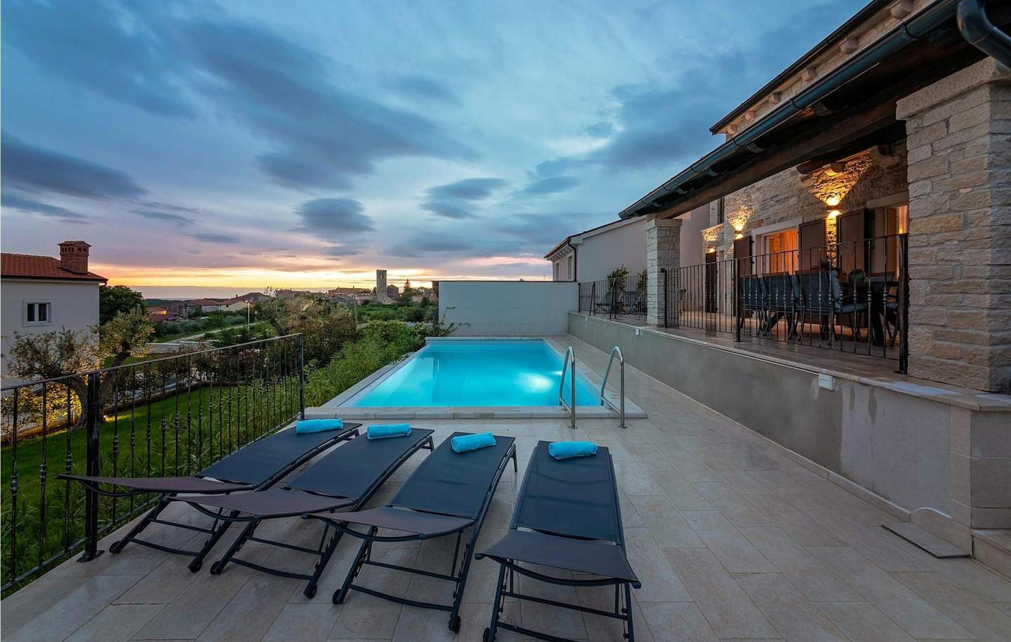 Villa Bellevue er en nybygget villa beliggende i en høj position med vidunderlig panoramaudsigt over Istriens vestkyst og havet. Villaen ligger i udkanten af den maleriske landsby Sveti Lovrec, 15 km fra Porec og 20 km fra Rovinj. På sin egen lukkede grund på 500 kvm med velholdt græsplæne byder den gæsterne på en infinity swimmingpool på 32 kvm, rummelig overdækket terrasse med opholdsområde, grill, liggestole, udendørs bruser og to parkeringspladser. Villa Bellevue til 8 personer på 200 kvm fordelt på to etager har aircondition. I stueetagen er der stue med sofa, satellit-tv, spisestue med spisebord, fuldt udstyret køkken, her er også soveværelse med dobbeltseng og bad/toilet. På første sal er tre soveværelser, alle med private badeværelser, to af dem med udgang til fælles balkon med opholdsområde. Kælderen er et rummeligt lokale på 150 kvm til hygge og afslapning, poolbord, bordtennis, fodboldbord og fitnessudstyr. Bemærk venligst, at denne ejendom ikke accepterer ungdomsgrupper eller polterabends. En ungdomsgruppe på denne ejendom er en gruppe bestående af personer på 26 år eller derunder. Book ikke denne ejendom, hvis du er en ungdomsgruppe eller et polterabend, da din reservation vil blive afvist efter booking, hvilket kan omfatte ved ankomst til ejendommen eller under dit ophold, og du vil ikke blive refunderet.