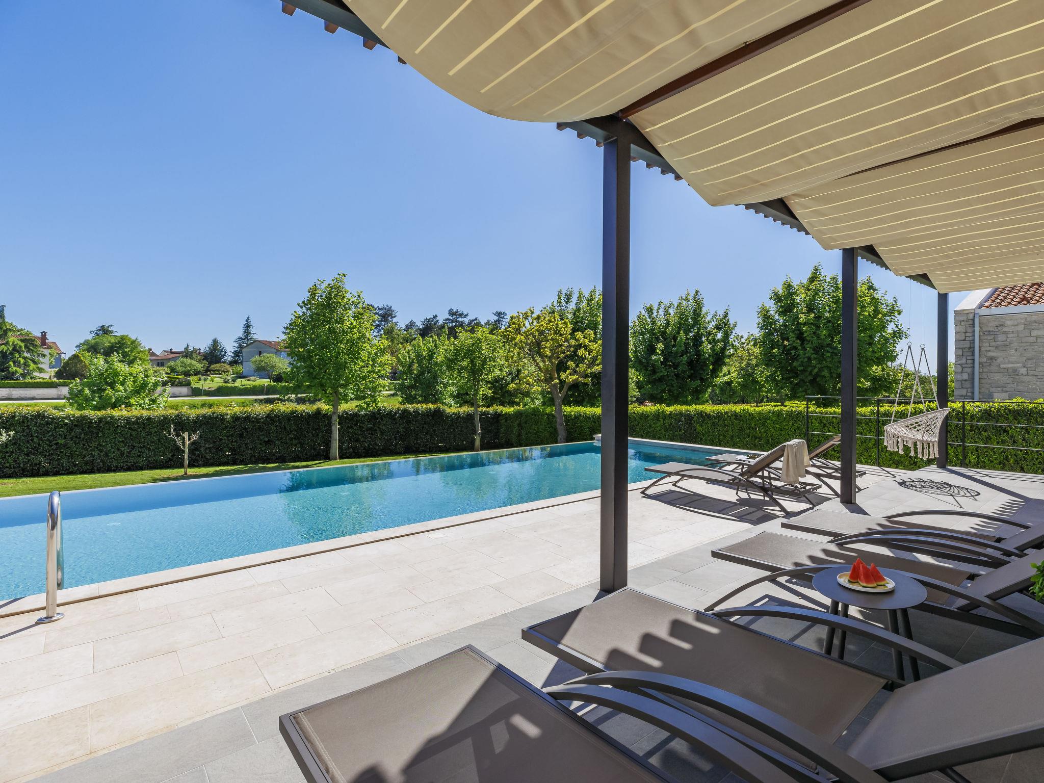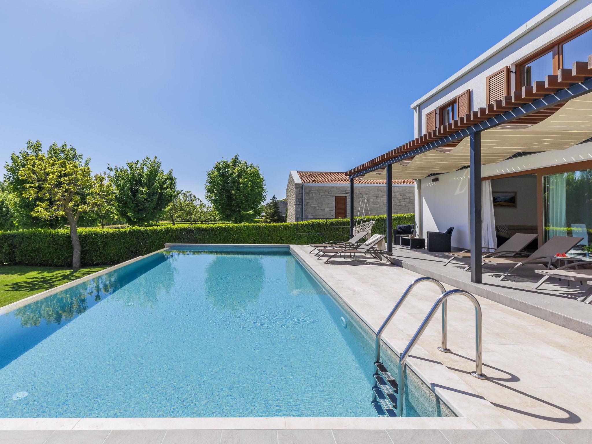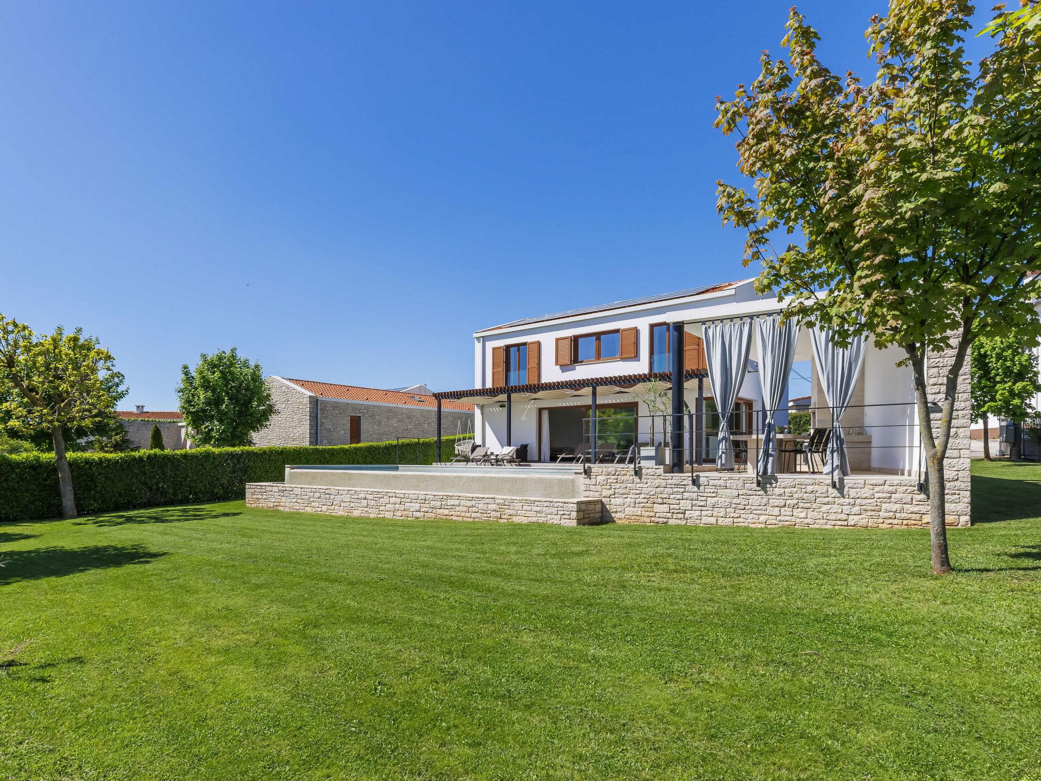 Modern villa "Terra Gialla", 2 storeys. 4 km from the centre of Žminj, 13 km from the centre of Pazin, in a quiet, sunny position, 27 km from the sea. Private: property 1'465 m2, beautiful, well-kept garden with lawn, swimming pool angular (10 x 4 m, depth 140 cm, seasonal availability: 01.Jan. - 31.Dec.) with internal staircase. Outdoor shower, terrace (18 m2), garden furniture, barbecue. In the house: internet access, washing machine, tumble dryer. Roofed, parking (for 2 cars) at the house on the premises. Shop 100 m, supermarket 6 km, restaurant 1 km, café 500 m, bus stop 6.9 km, railway station 500 m, pebble beach 27 km. Riding stable 2 km, walking paths from the house 1 km, cycle lane 1 km. Groups of teenagers on request only. Massage 500 m.