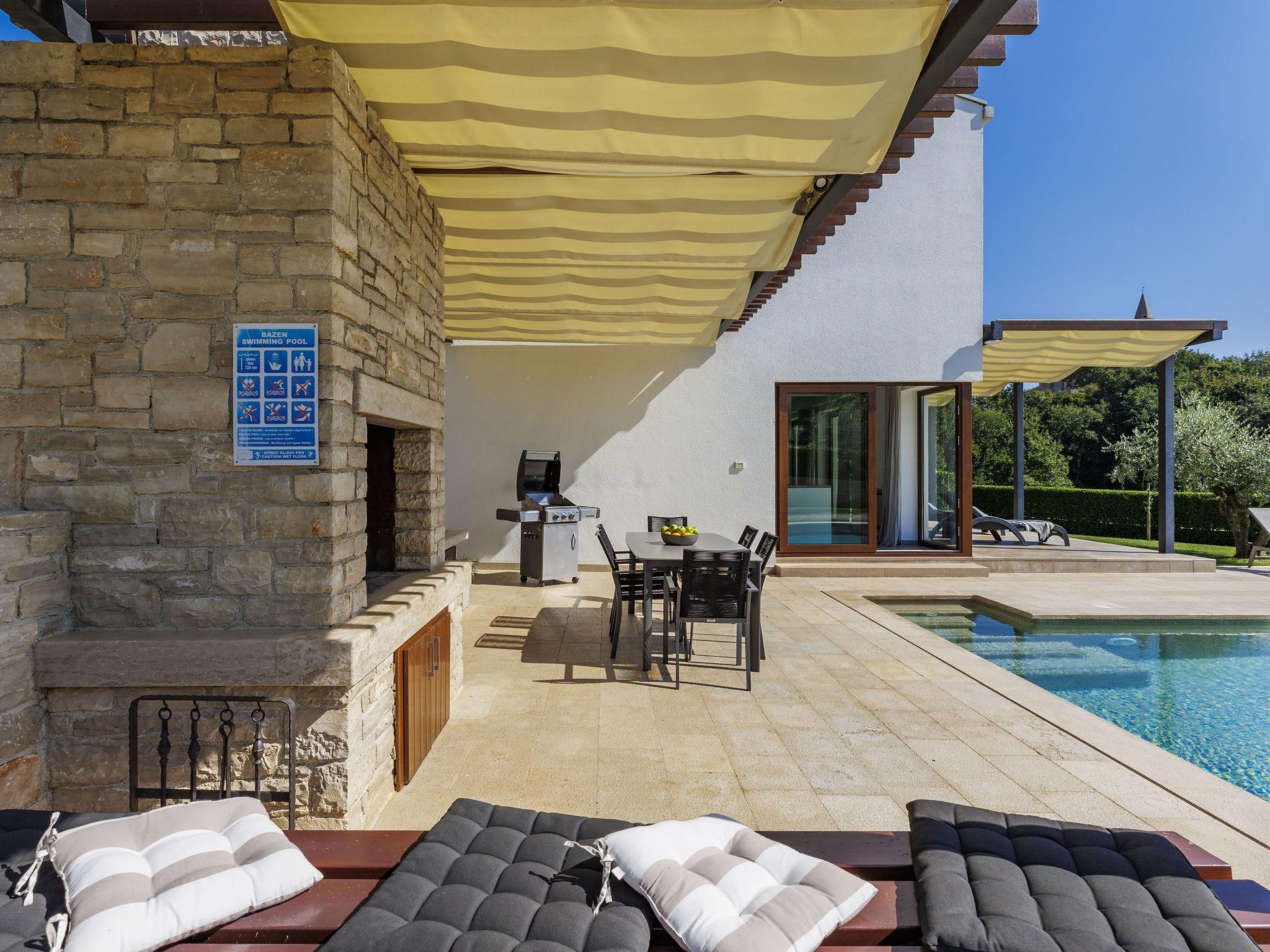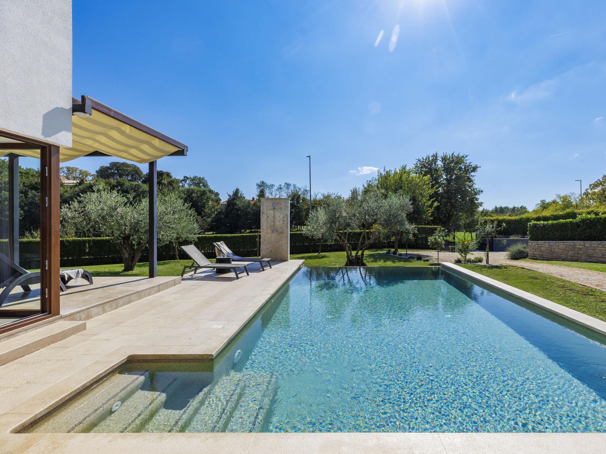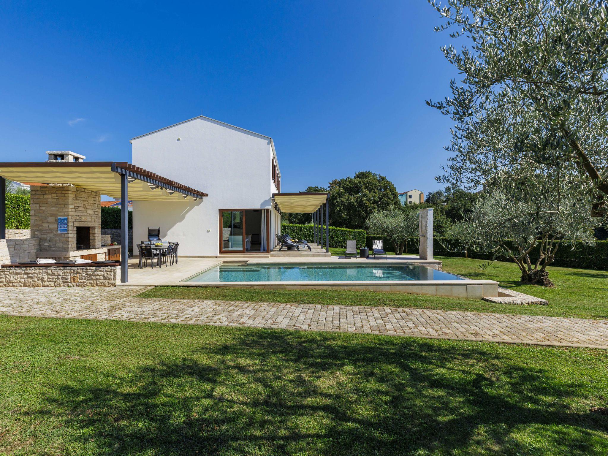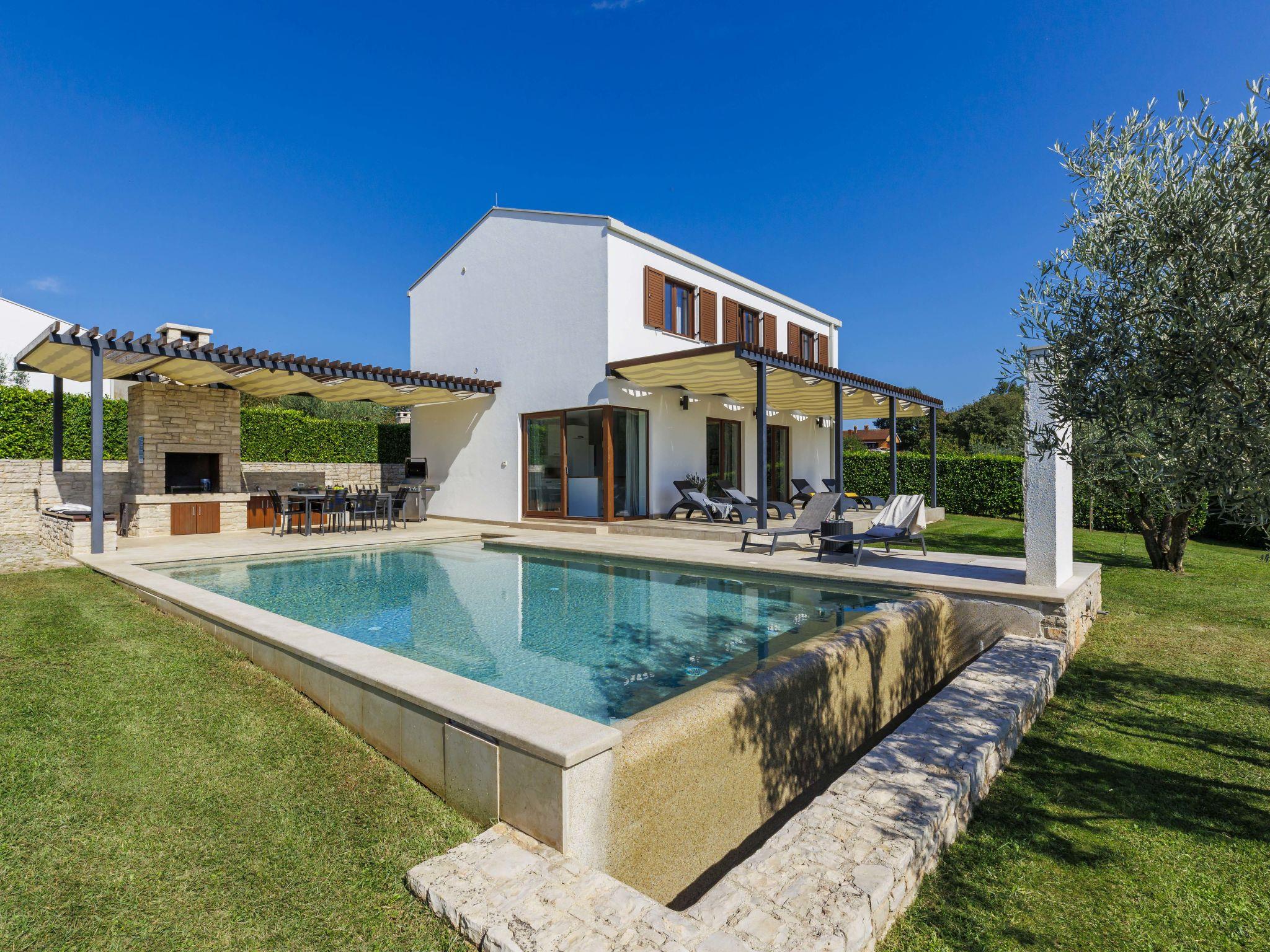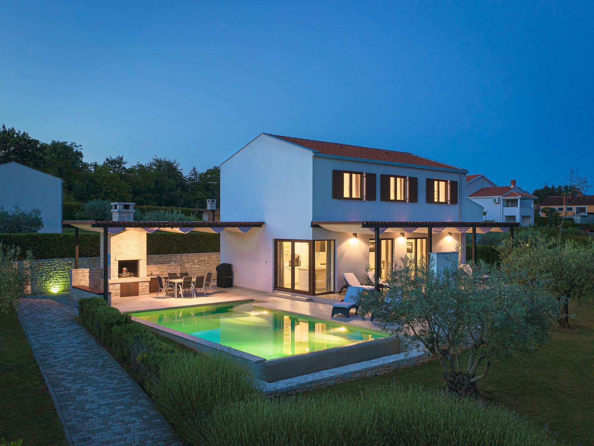 Modern villa "Luna Nera", 2 storeys. 6 km from the centre of Žminj, 13 km from the centre of Pazin, in a quiet, sunny position, 27 km from the sea. Private: property 1'000 m2, beautiful, well-kept garden with lawn and wildlife garden, swimming pool angular (10 x 5 m, depth 140 cm, seasonal availability: 01.Jan. - 31.Dec.) with internal staircase. Outdoor shower, pergola (30 m2), garden furniture, barbecue. In the house: internet access, washing machine, tumble dryer. Parking at the house on the premises. Shop 600 m, supermarket 6 km, restaurant 1 km, café 400 m, bus stop 6.6 km, railway station 500 m, pebble beach 27 km. Riding stable 7 km, walking paths from the house 1 km, cycle lane 1 km. Groups of teenagers on request only.