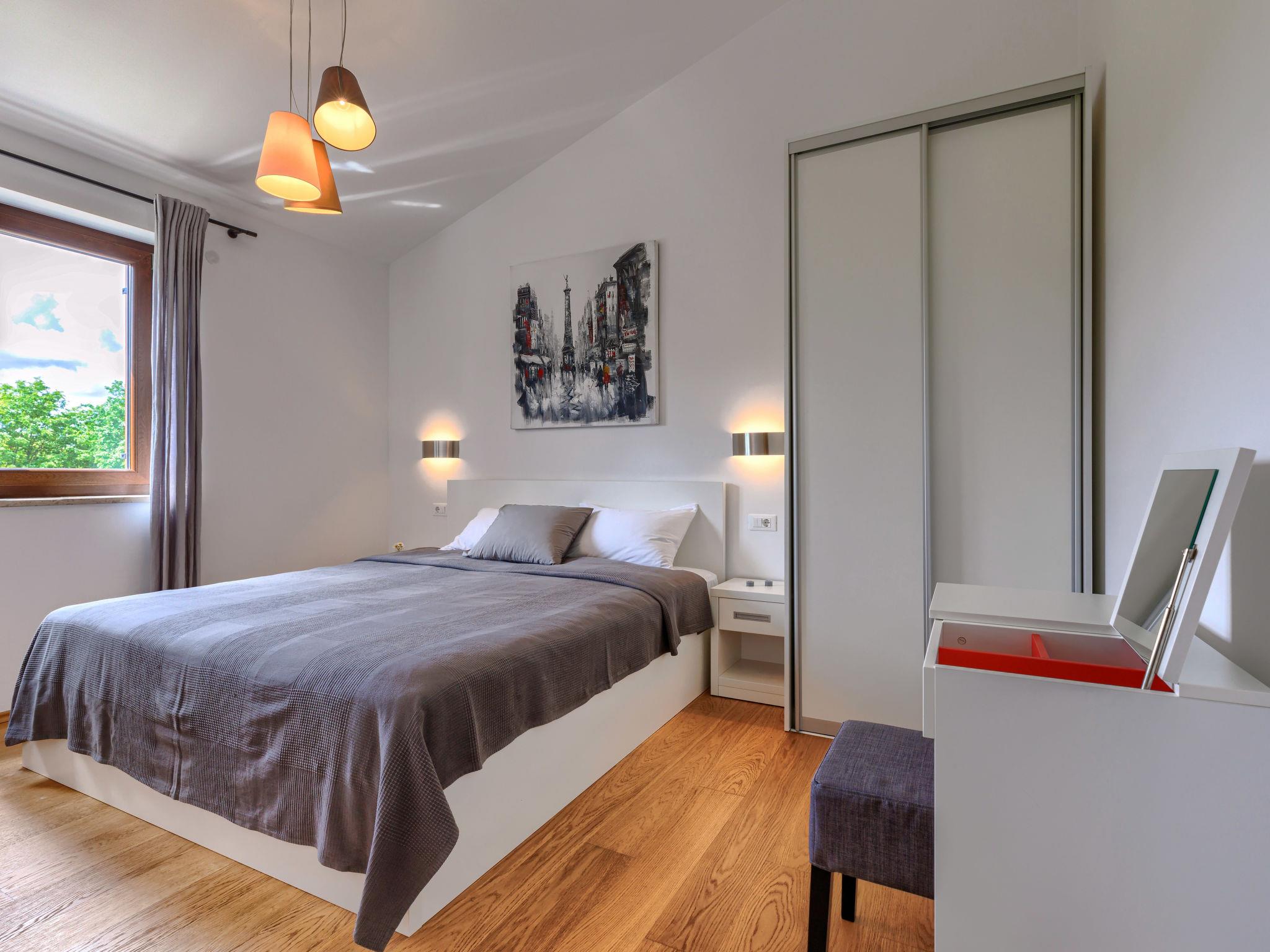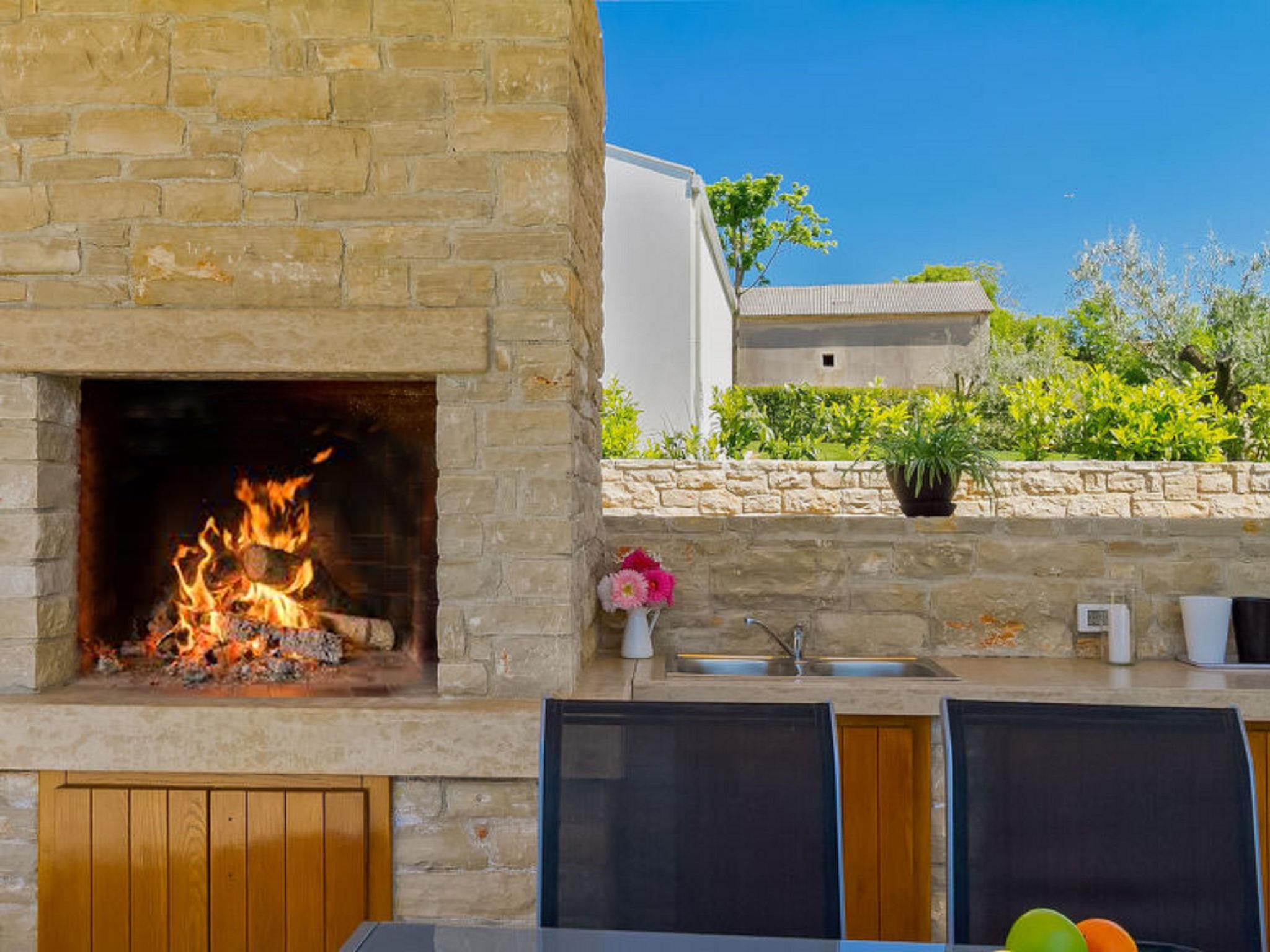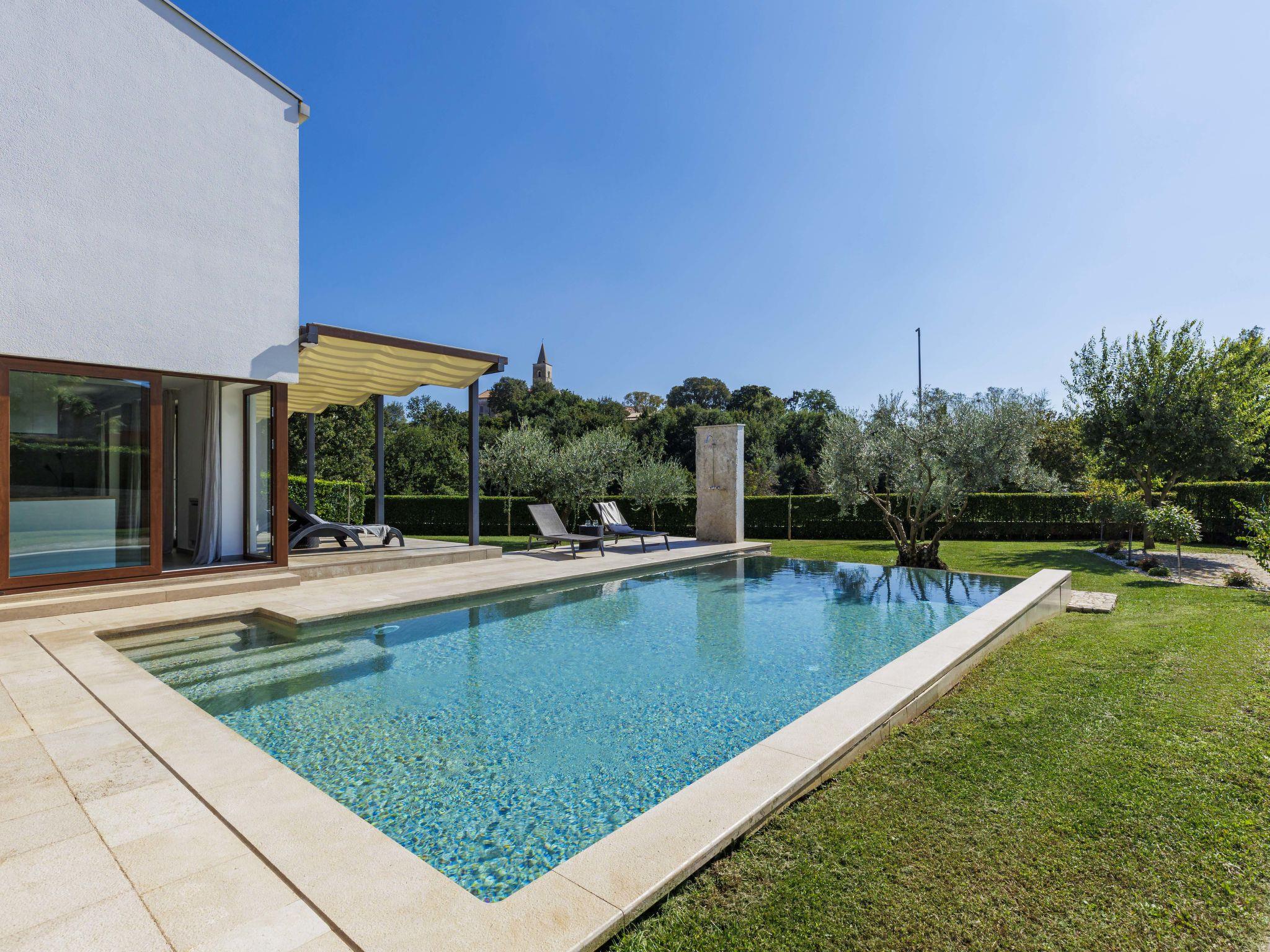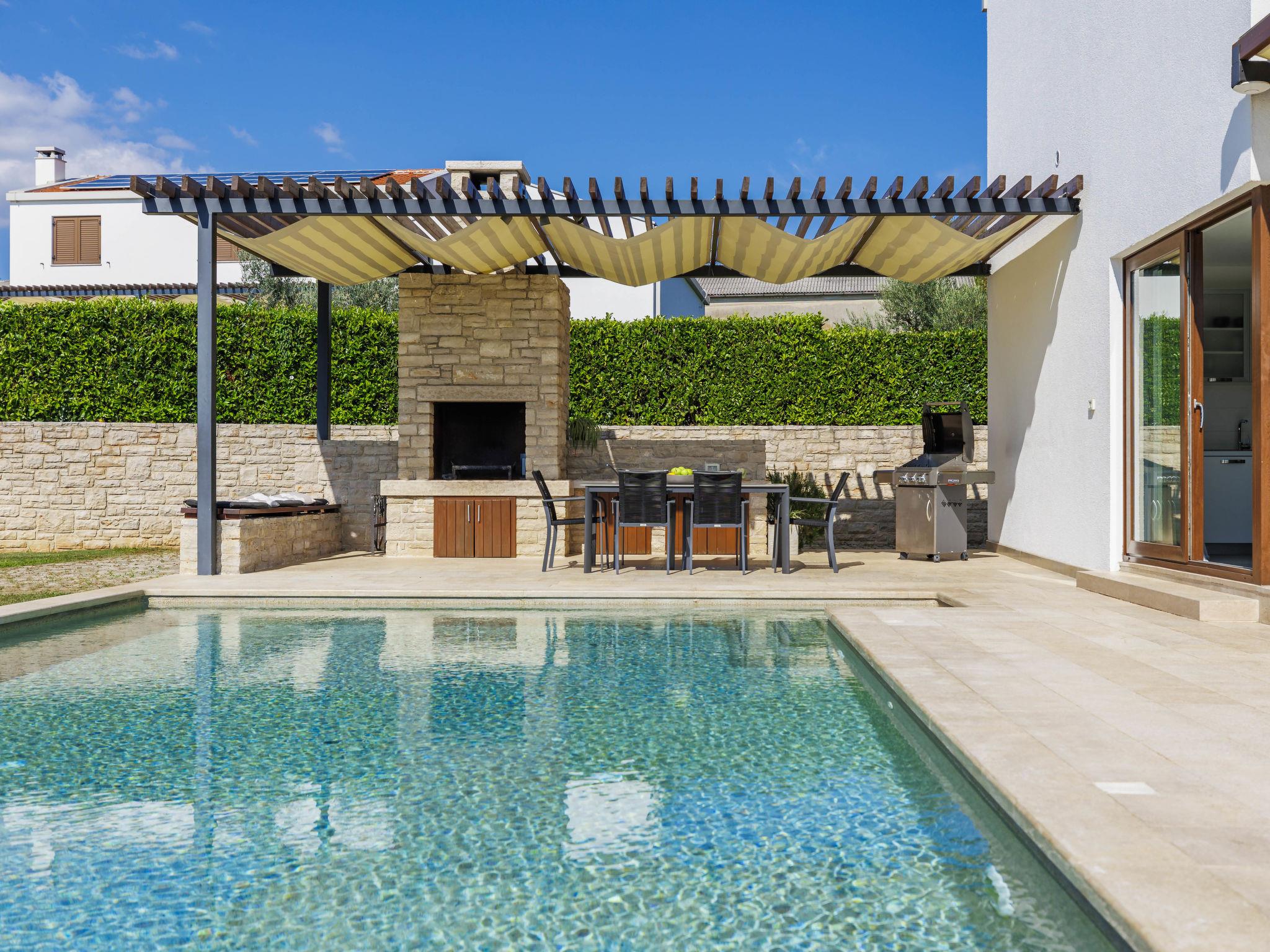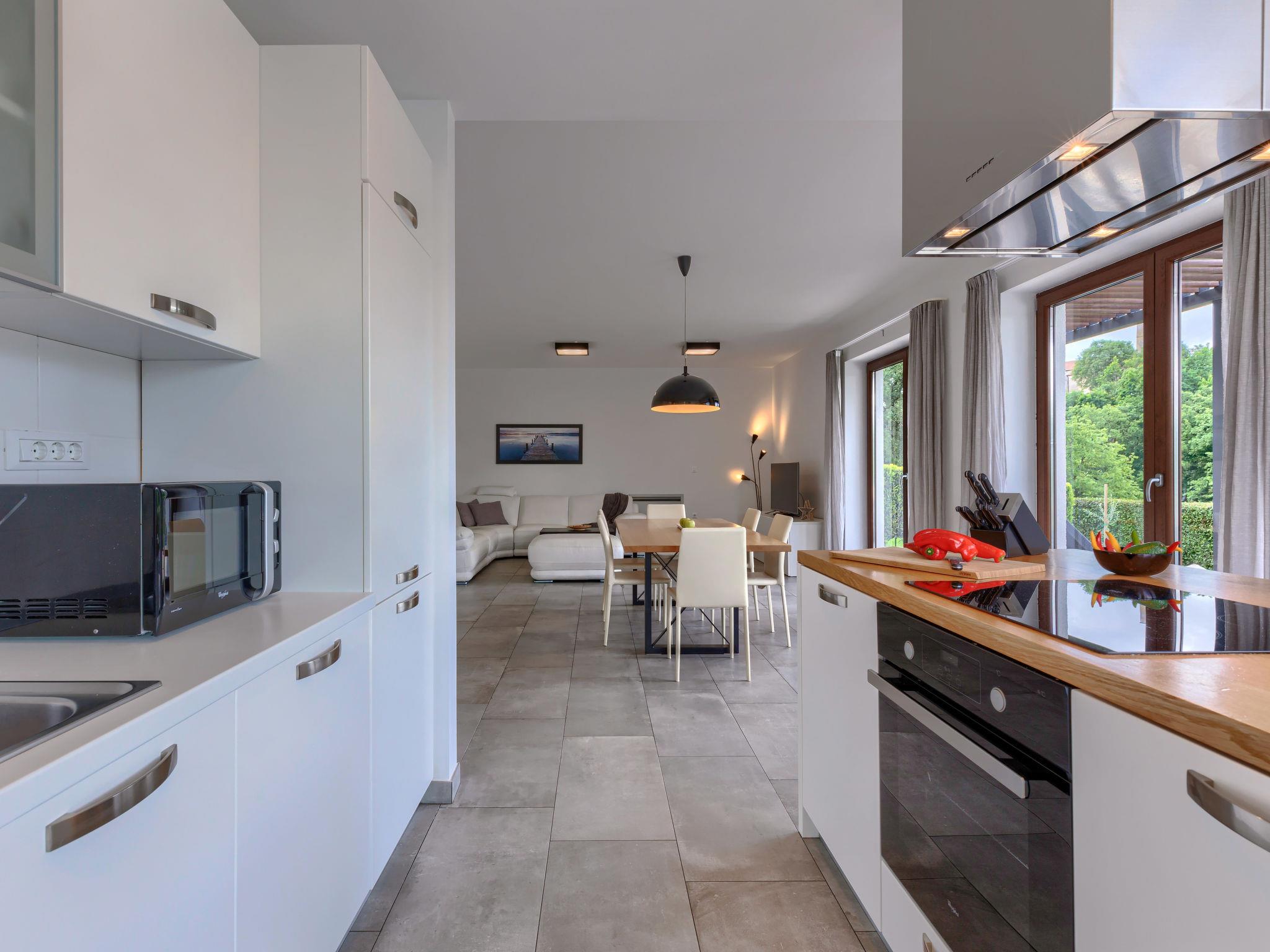 Modern villa "Luna Nera", 2 storeys. 6 km from the centre of Žminj, 13 km from the centre of Pazin, in a quiet, sunny position, 27 km from the sea. Private: property 1'000 m2, beautiful, well-kept garden with lawn and wildlife garden, swimming pool angular (10 x 5 m, depth 140 cm, seasonal availability: 01.Jan. - 31.Dec.) with internal staircase. Outdoor shower, pergola (30 m2), garden furniture, barbecue. In the house: internet access, washing machine, tumble dryer. Parking at the house on the premises. Shop 600 m, supermarket 6 km, restaurant 1 km, café 400 m, bus stop 6.6 km, railway station 500 m, pebble beach 27 km. Riding stable 7 km, walking paths from the house 1 km, cycle lane 1 km. Groups of teenagers on request only.