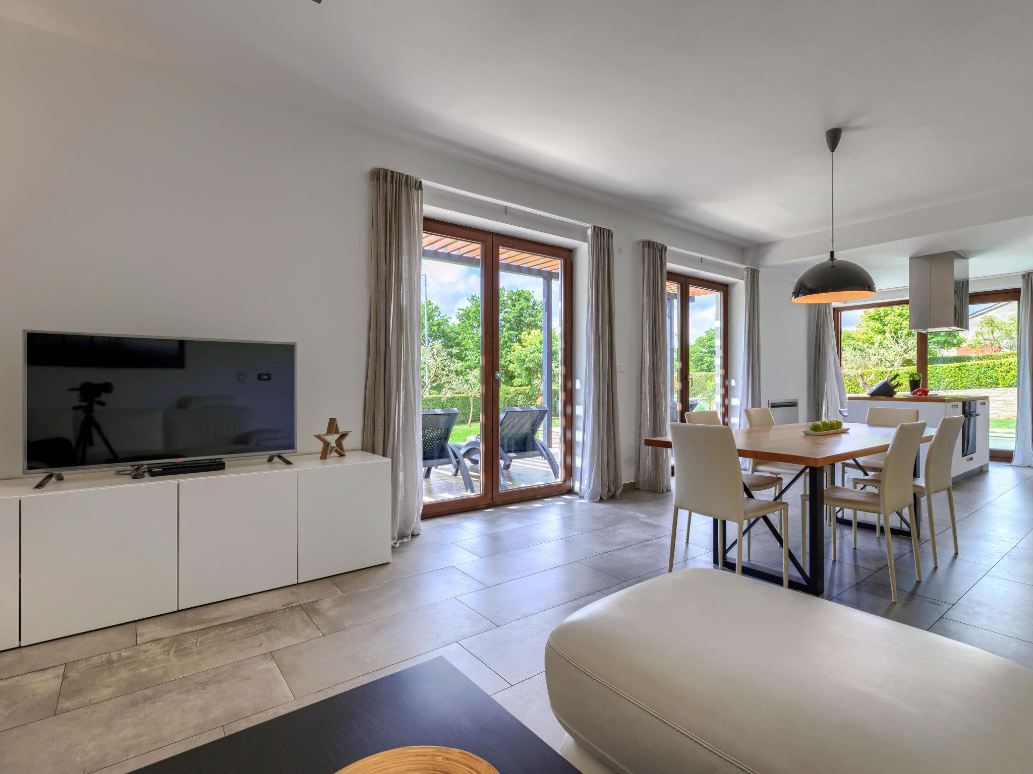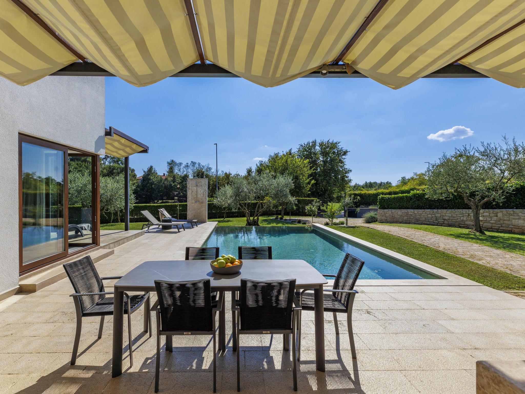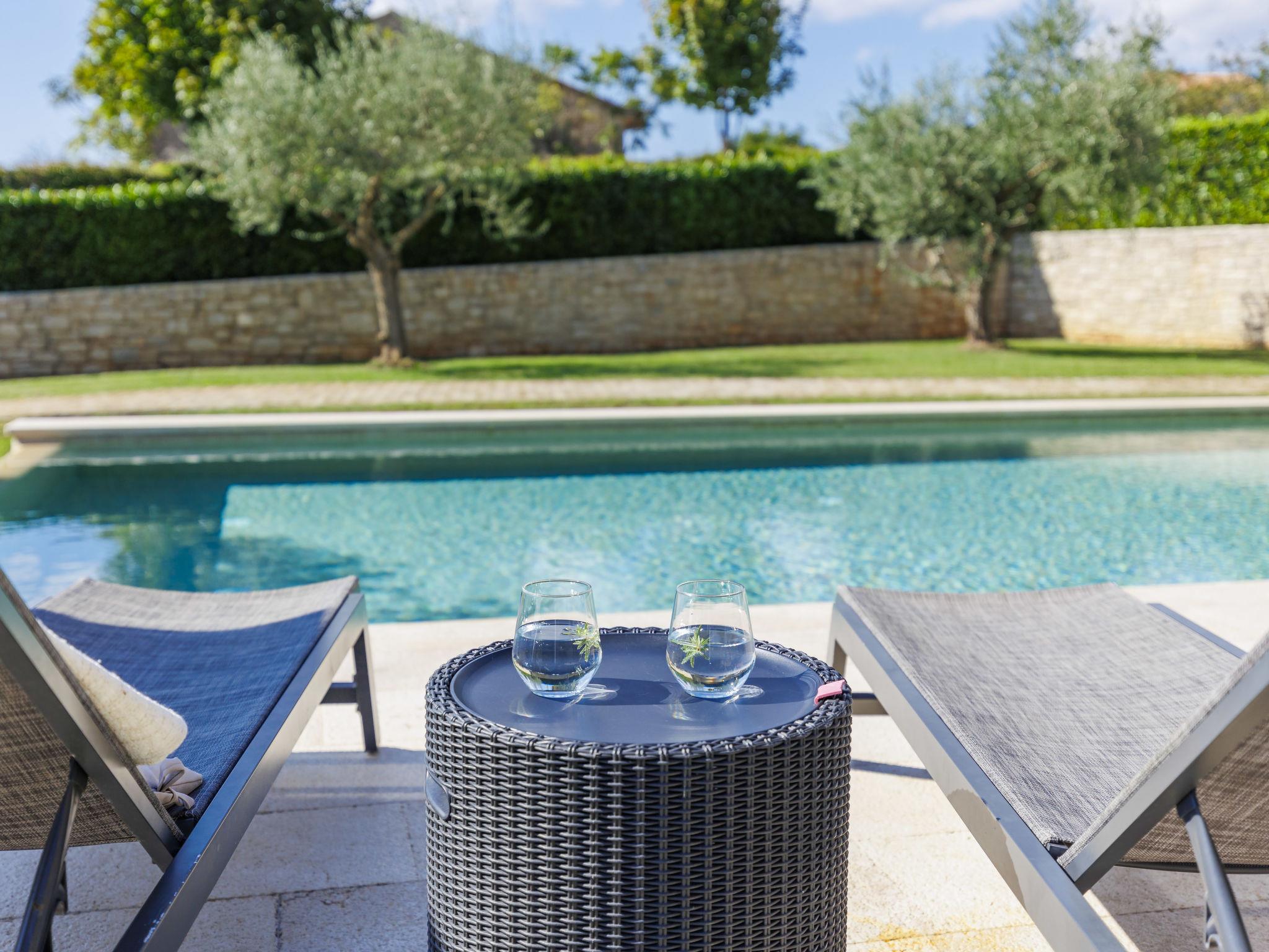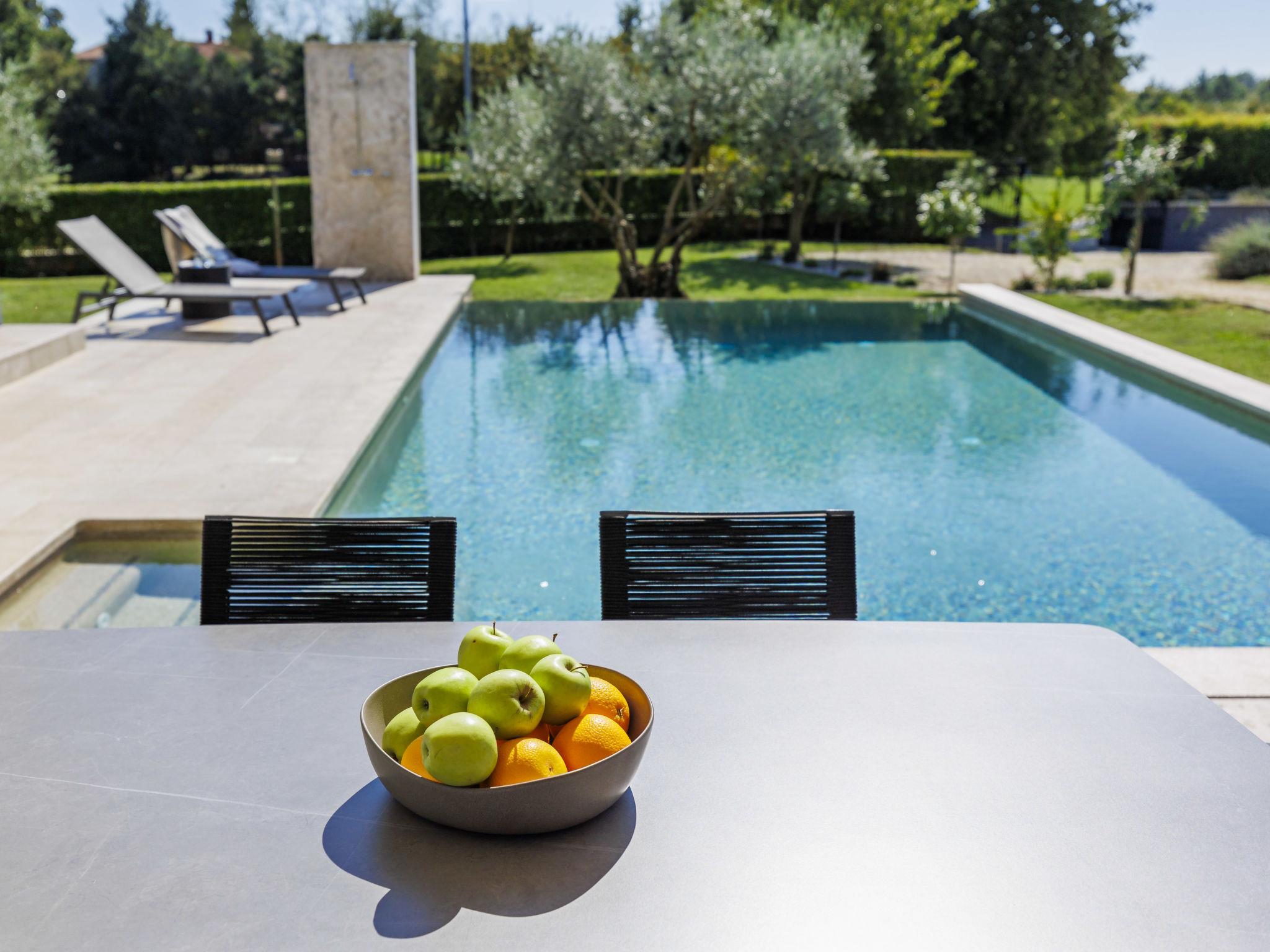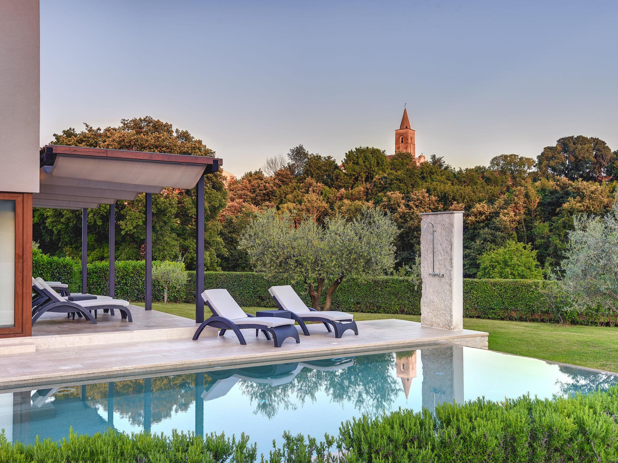 Modern villa "Luna Nera", 2 storeys. 6 km from the centre of Žminj, 13 km from the centre of Pazin, in a quiet, sunny position, 27 km from the sea. Private: property 1'000 m2, beautiful, well-kept garden with lawn and wildlife garden, swimming pool angular (10 x 5 m, depth 140 cm, seasonal availability: 01.Jan. - 31.Dec.) with internal staircase. Outdoor shower, pergola (30 m2), garden furniture, barbecue. In the house: internet access, washing machine, tumble dryer. Parking at the house on the premises. Shop 600 m, supermarket 6 km, restaurant 1 km, café 400 m, bus stop 6.6 km, railway station 500 m, pebble beach 27 km. Riding stable 7 km, walking paths from the house 1 km, cycle lane 1 km. Groups of teenagers on request only.