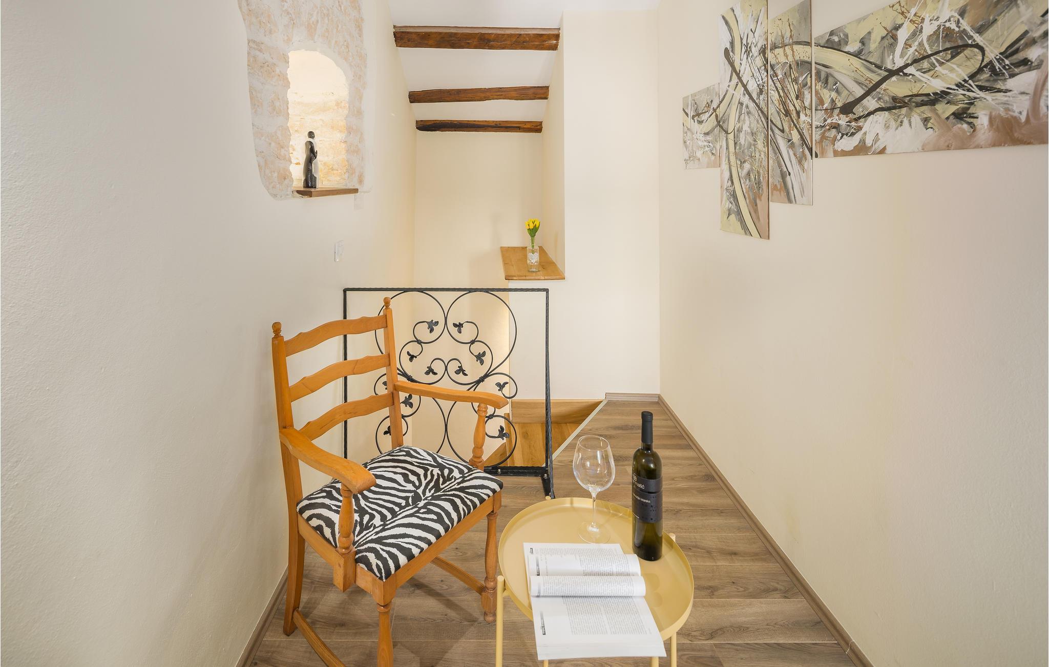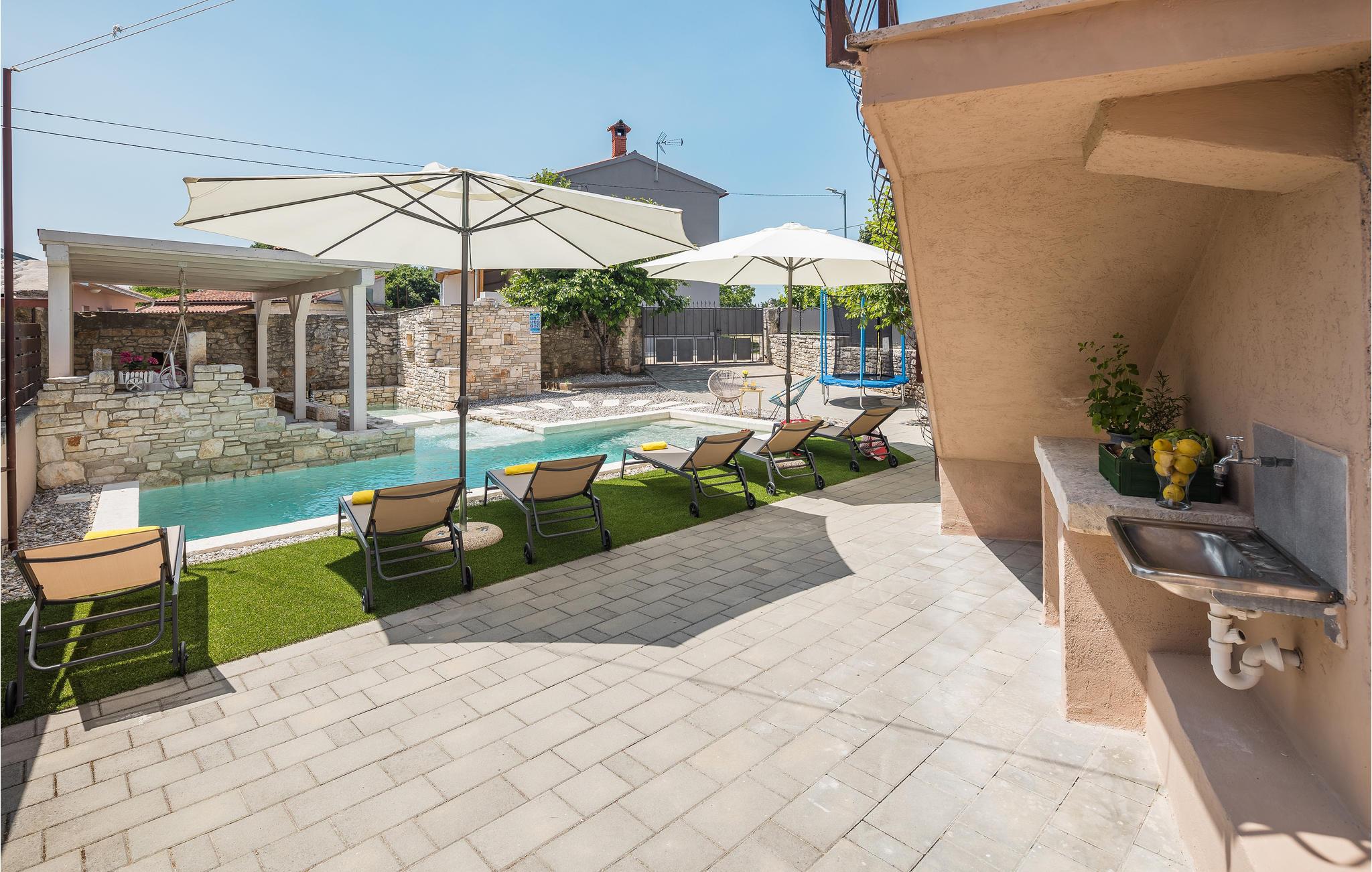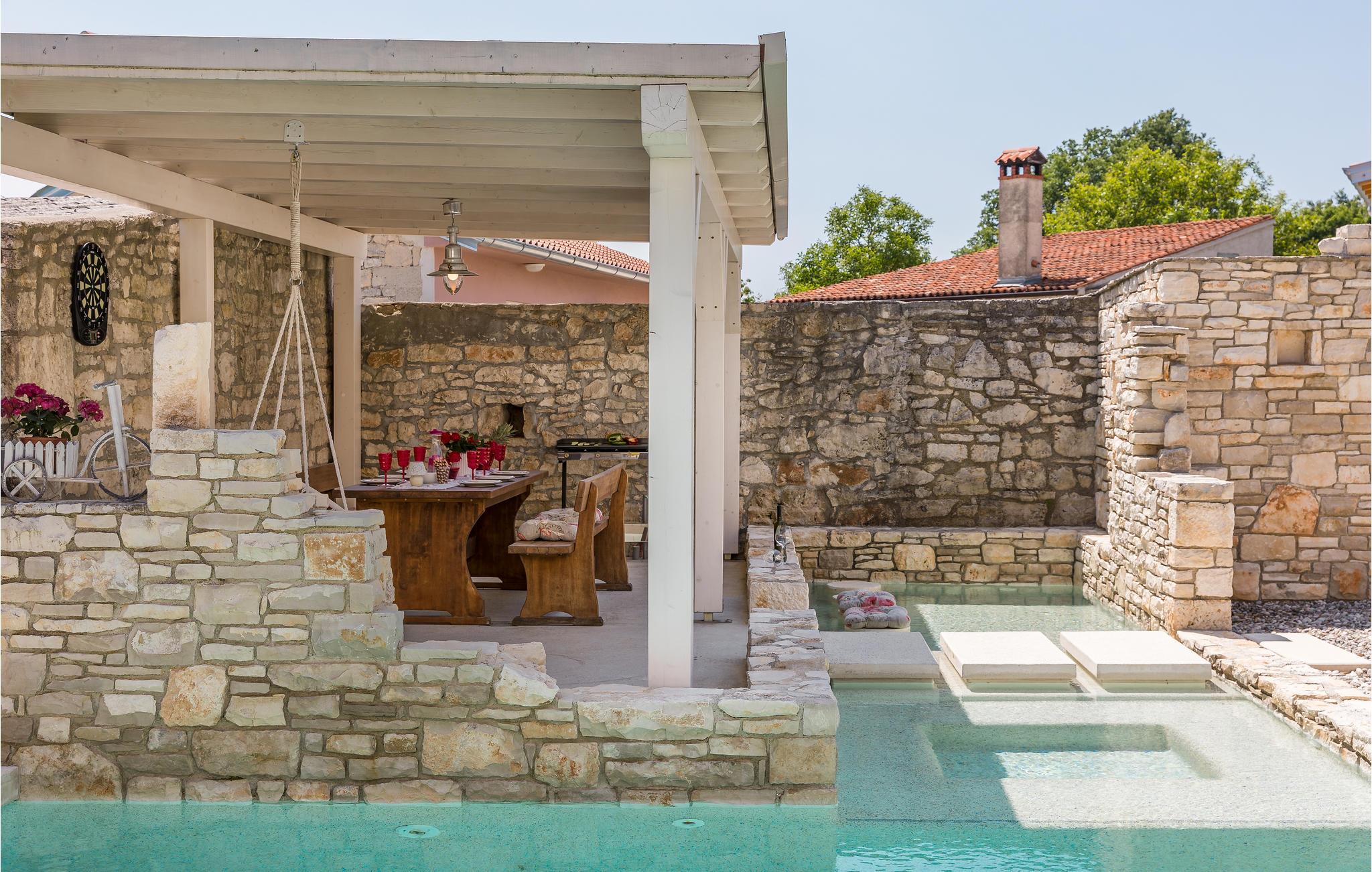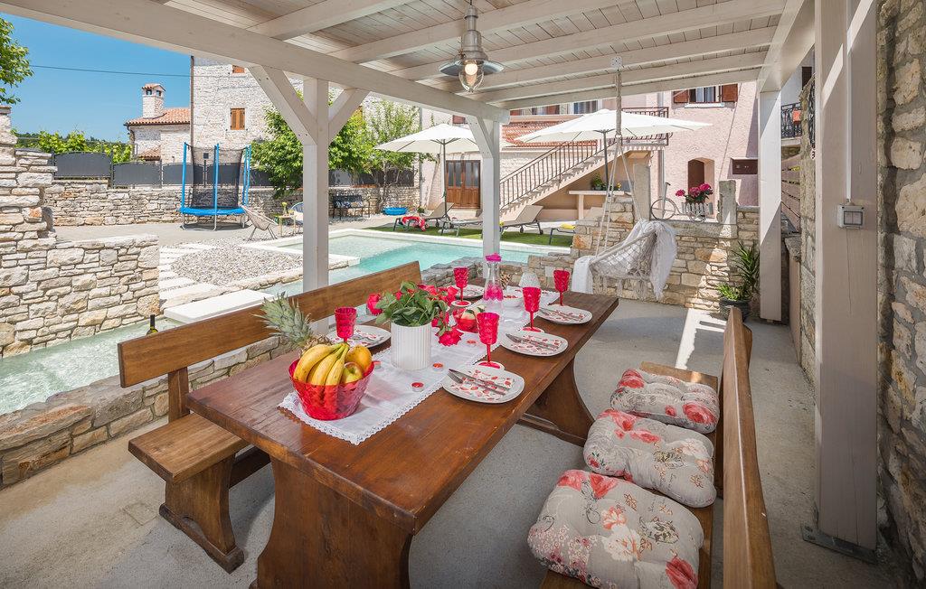 Dette skønne rækkehus ligger centralt i en lille landsby. Dets indre er præget af den traditionelle byggestil, men er kombineret med moderne stilelementer. Swimmingpoolen udenfor bliver feriens forfriskende samlingspunkt for familien, og også de mindste vil blive begejstrede for legeredskaberne på grunden. Landskabet er velegnet til en aktiv ferie på cykel eller på vandrestierne. den lille middelalderby Svetvicenat har et fint udbvud af arrangementer og de traditionelle konobaer, hvor lækkerierne fra det lokale køkken kan prøves.