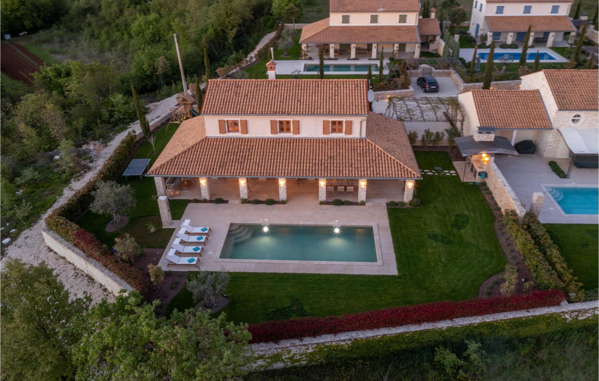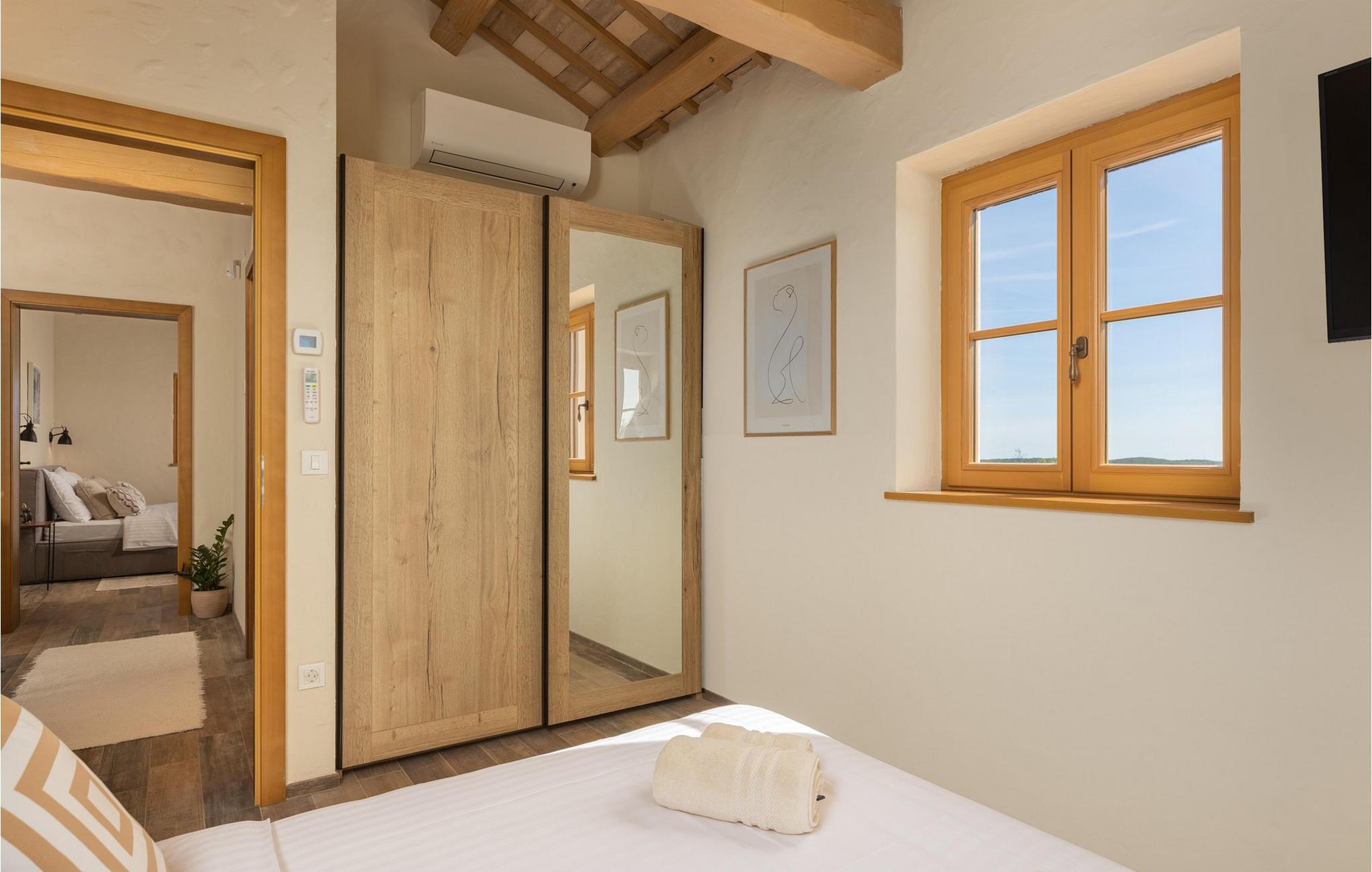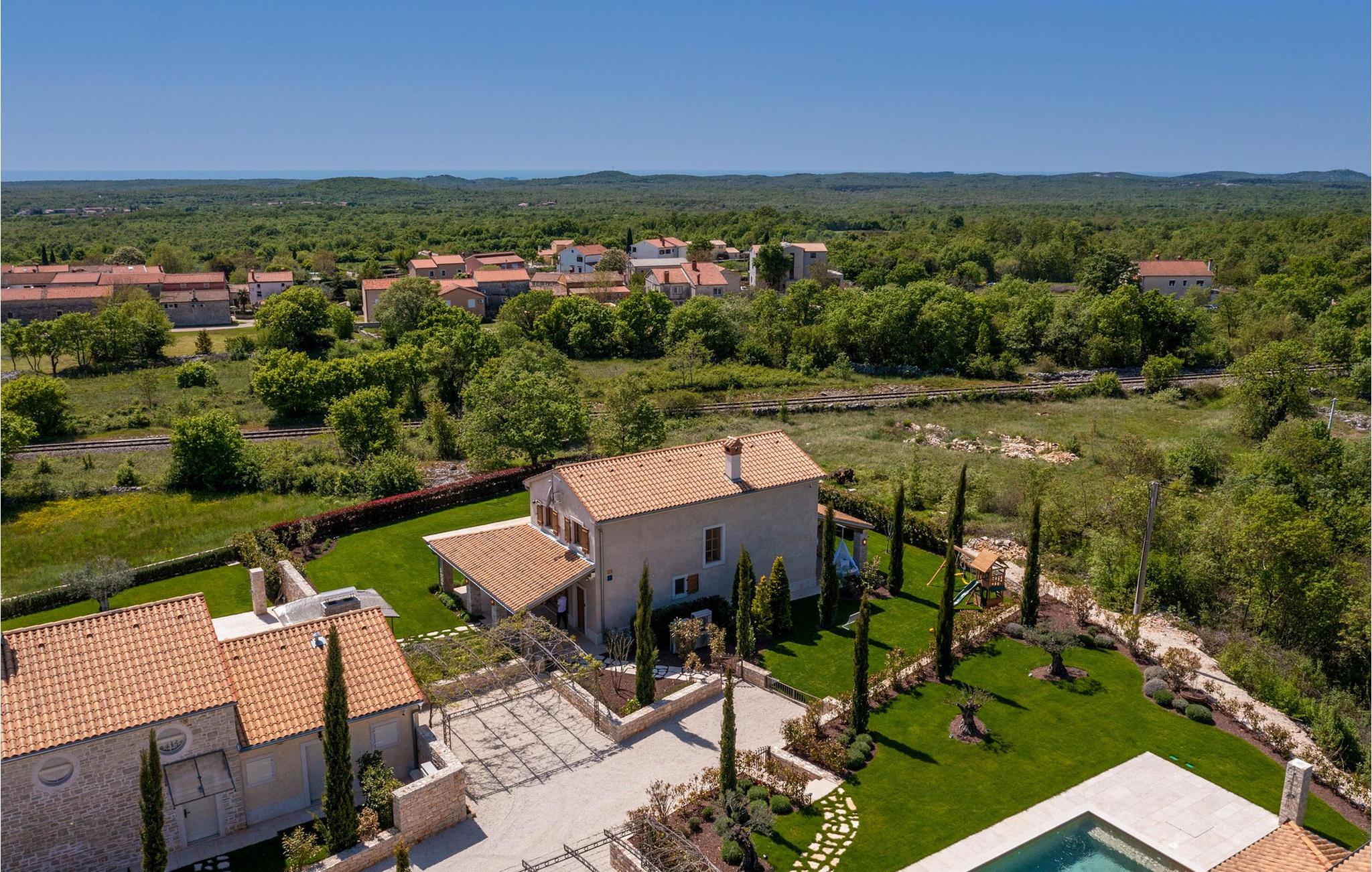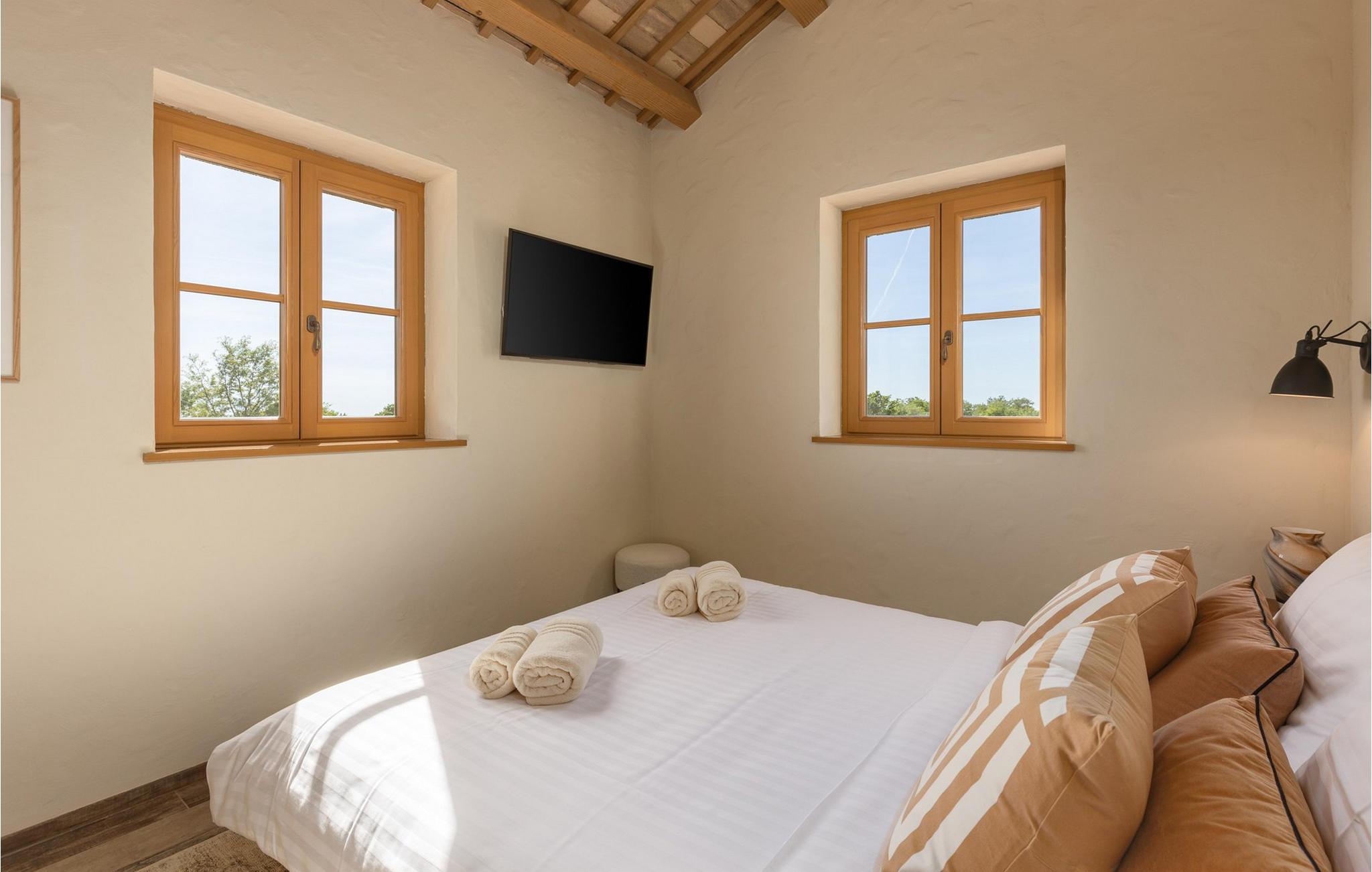 Smukke Villa Andrea ligger i den lille istriske by Smoljanci, i centrum af Istrien. De landlige omgivelser byder på absolut fred og privatliv, og den luksuriøse atmosfære i Villa Andrea tilbyder dig alt, hvad du behøver for en afslappende ferie. Villaen strækker sig over et samlet areal på 220 m2, som også omfatter en overdækket terrasse. Grundens størrelse er 800 m2. Villaen kan rumme i alt 6 personer og har 3 fuldt møblerede og airconditionerede værelser på øverste etage, hvoraf to har havudsigt. Der er to badeværelser ovenpå. Vaskemaskine og tørretumbler er også tilgængelige efter anmodning. Stueetagen af villaen har en rummelig stue, et moderne køkken og et ekstra toilet. På villaens skønne terrasse er der en 4x10 m pool med en dybde på 1,5 m. Omkring poolen er der 4 liggestole, en udendørs grill og et udendørs spisebord. Villaens gård er helt indhegnet og der er 2 parkeringspladser i gården. Området omkring villaen byder på mange interessante muligheder såsom cykling, ridning eller vinture og olivenolieture. Istrien er kendt for sit rige gastronomiske tilbud, og dyrkning og forarbejdning af vinstokke og olivenolie er blandt de mest berømte landbrugsgrene, der har været praktiseret i denne kroatiske region i århundreder. I dag er Istrien foran mange europæiske lande i produktionen af ekstra jomfru olivenolie, hvilket skyldes den enestående kvalitet af jorden i denne region. Sørg for at besøge nogle af de mange vinkældre, der producerer nogle af de fineste røde, hvide eller rosé-varianter såsom Merlot, Malvasia, Teran, Muscat eller Cabernet Sauvignon. Det centrale Istrien er også kendt for en særlig gourmet-delikatesse – trøfler, underjordiske juveler med en særlig bitter smag. Placeringen af denne dyre gastronomiske specialitet er i det centrale Istrien, især omkring Motovun-skoven. Et interessant tilbud i Istrien er trøffeljagt, en oplevelse, hvor du på egen hånd kan opleve, hvordan den traditionelle søgen efter denne delikatesse, der hovedsageligt er gemt i rødderne af eg, poppel, bøg, elmetræer og lignende træer, ser ud. Hvis du stadig nyder at se kulturelle og historiske monumenter, vil du helt sikkert nyde at udforske det indre af Istrien, som udover et eventyrlandskab også gemmer på monumenter fra forskellige epoker af historien. For eksempel er der i byen Motovun interessante middelaldermure, der giver denne by en særlig charme. Ifølge legenden sejlede de mytiske karakterer Jason og Argonauter på Mirna-floden ved foden af Motovun, og de første indbyggere boede her mellem 3.500 og 3.500 år. og 2.200 f.Kr. Chr. Kr. På Istriens kyst finder du mange andre interessante steder, der forbløffer med deres turisttilbud, men også smukke kulturelle og historiske monumenter, såsom Porec, Umag, Rovinj eller Pula. Nyd Istriens smukke landskab, vinruter og gastronomiske tilbud, og slap af i freden og privatlivet i Villa Andrea og den luksus, du fortjener. Poolopvarmning er tilgængelig mod et ekstra gebyr, der skal betales lokalt. Kæledyr er tilladt på denne ejendom efter ejerens skøn eller mod et gebyr.