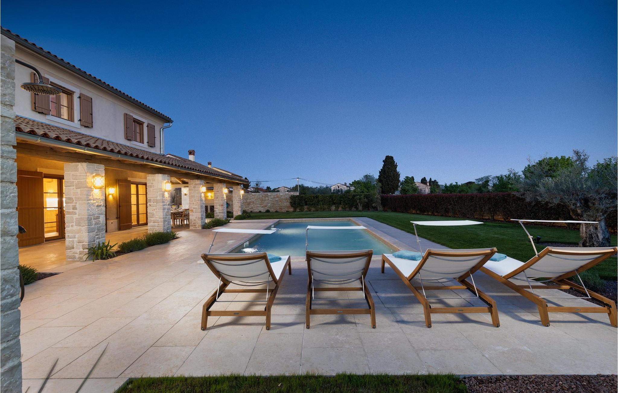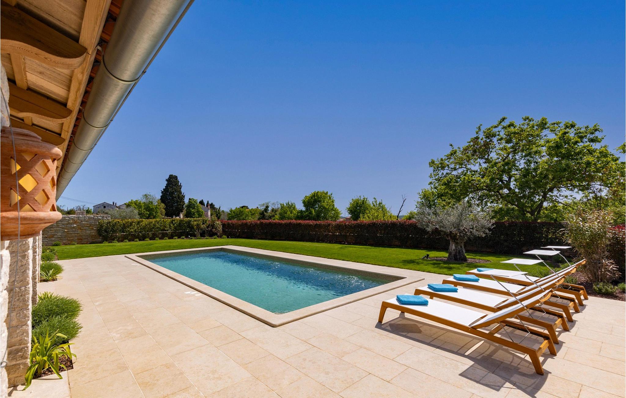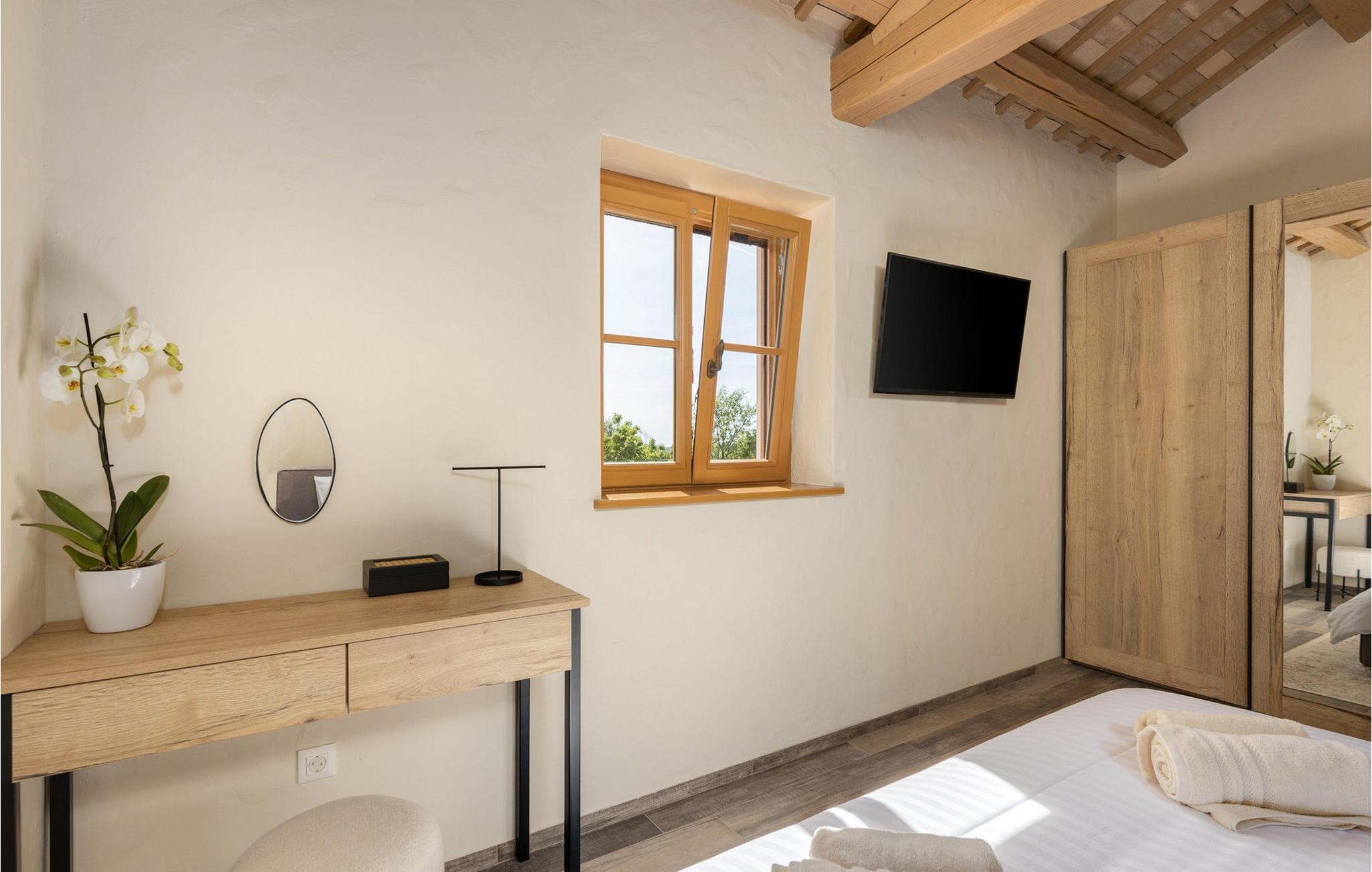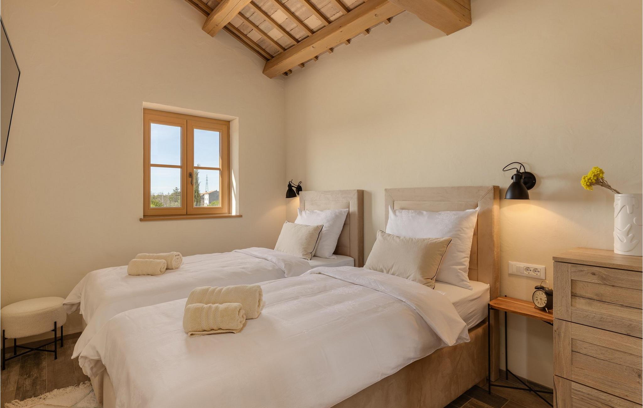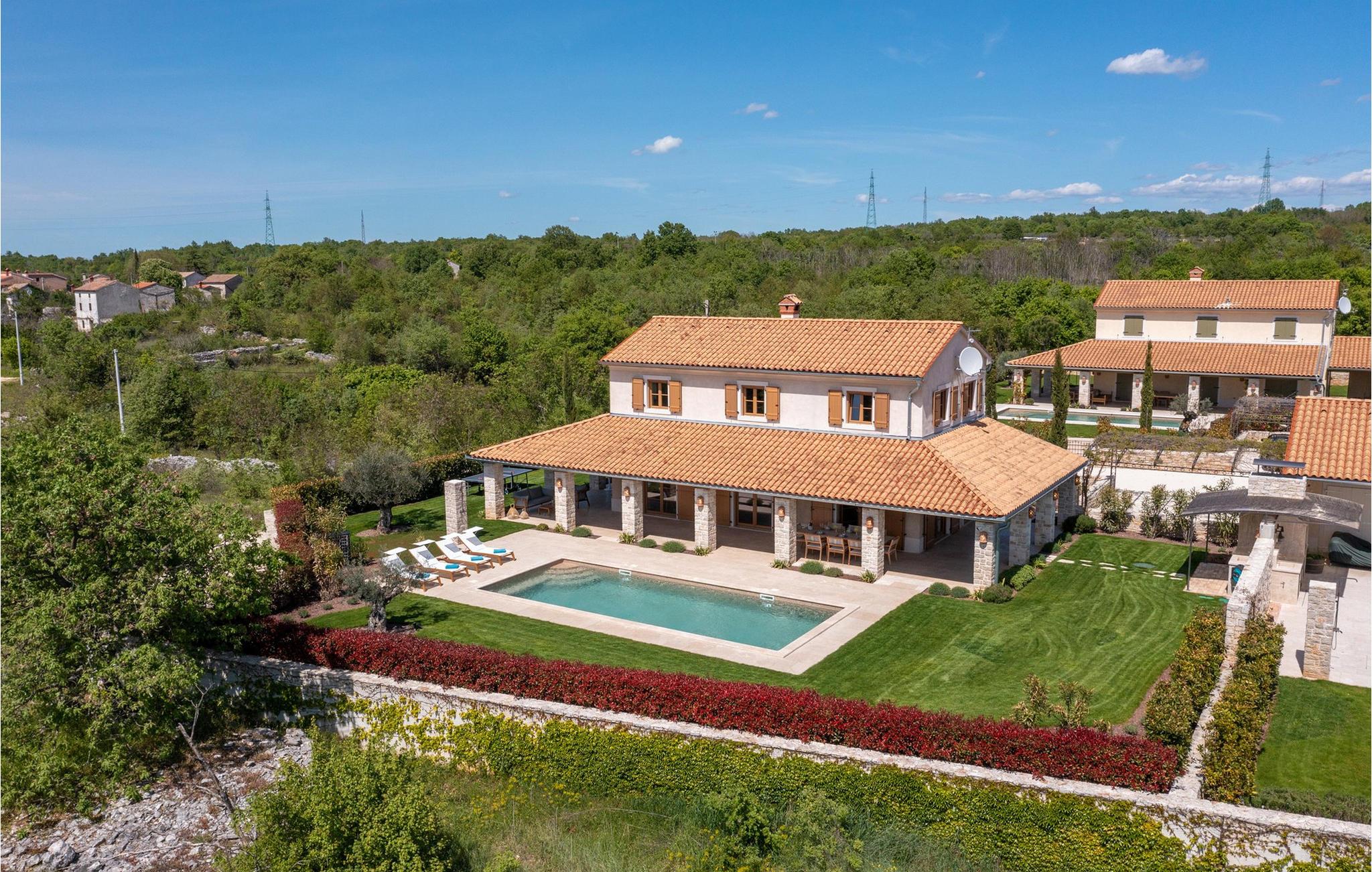 Smukke Villa Andrea ligger i den lille istriske by Smoljanci, i centrum af Istrien. De landlige omgivelser byder på absolut fred og privatliv, og den luksuriøse atmosfære i Villa Andrea tilbyder dig alt, hvad du behøver for en afslappende ferie. Villaen strækker sig over et samlet areal på 220 m2, som også omfatter en overdækket terrasse. Grundens størrelse er 800 m2. Villaen kan rumme i alt 6 personer og har 3 fuldt møblerede og airconditionerede værelser på øverste etage, hvoraf to har havudsigt. Der er to badeværelser ovenpå. Vaskemaskine og tørretumbler er også tilgængelige efter anmodning. Stueetagen af villaen har en rummelig stue, et moderne køkken og et ekstra toilet. På villaens skønne terrasse er der en 4x10 m pool med en dybde på 1,5 m. Omkring poolen er der 4 liggestole, en udendørs grill og et udendørs spisebord. Villaens gård er helt indhegnet og der er 2 parkeringspladser i gården. Området omkring villaen byder på mange interessante muligheder såsom cykling, ridning eller vinture og olivenolieture. Istrien er kendt for sit rige gastronomiske tilbud, og dyrkning og forarbejdning af vinstokke og olivenolie er blandt de mest berømte landbrugsgrene, der har været praktiseret i denne kroatiske region i århundreder. I dag er Istrien foran mange europæiske lande i produktionen af ekstra jomfru olivenolie, hvilket skyldes den enestående kvalitet af jorden i denne region. Sørg for at besøge nogle af de mange vinkældre, der producerer nogle af de fineste røde, hvide eller rosé-varianter såsom Merlot, Malvasia, Teran, Muscat eller Cabernet Sauvignon. Det centrale Istrien er også kendt for en særlig gourmet-delikatesse – trøfler, underjordiske juveler med en særlig bitter smag. Placeringen af denne dyre gastronomiske specialitet er i det centrale Istrien, især omkring Motovun-skoven. Et interessant tilbud i Istrien er trøffeljagt, en oplevelse, hvor du på egen hånd kan opleve, hvordan den traditionelle søgen efter denne delikatesse, der hovedsageligt er gemt i rødderne af eg, poppel, bøg, elmetræer og lignende træer, ser ud. Hvis du stadig nyder at se kulturelle og historiske monumenter, vil du helt sikkert nyde at udforske det indre af Istrien, som udover et eventyrlandskab også gemmer på monumenter fra forskellige epoker af historien. For eksempel er der i byen Motovun interessante middelaldermure, der giver denne by en særlig charme. Ifølge legenden sejlede de mytiske karakterer Jason og Argonauter på Mirna-floden ved foden af Motovun, og de første indbyggere boede her mellem 3.500 og 3.500 år. og 2.200 f.Kr. Chr. Kr. På Istriens kyst finder du mange andre interessante steder, der forbløffer med deres turisttilbud, men også smukke kulturelle og historiske monumenter, såsom Porec, Umag, Rovinj eller Pula. Nyd Istriens smukke landskab, vinruter og gastronomiske tilbud, og slap af i freden og privatlivet i Villa Andrea og den luksus, du fortjener. Poolopvarmning er tilgængelig mod et ekstra gebyr, der skal betales lokalt. Kæledyr er tilladt på denne ejendom efter ejerens skøn eller mod et gebyr.