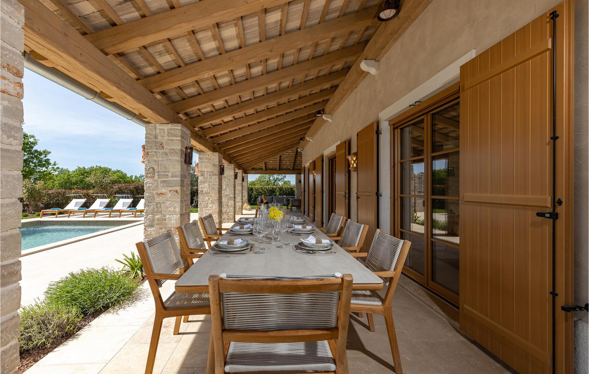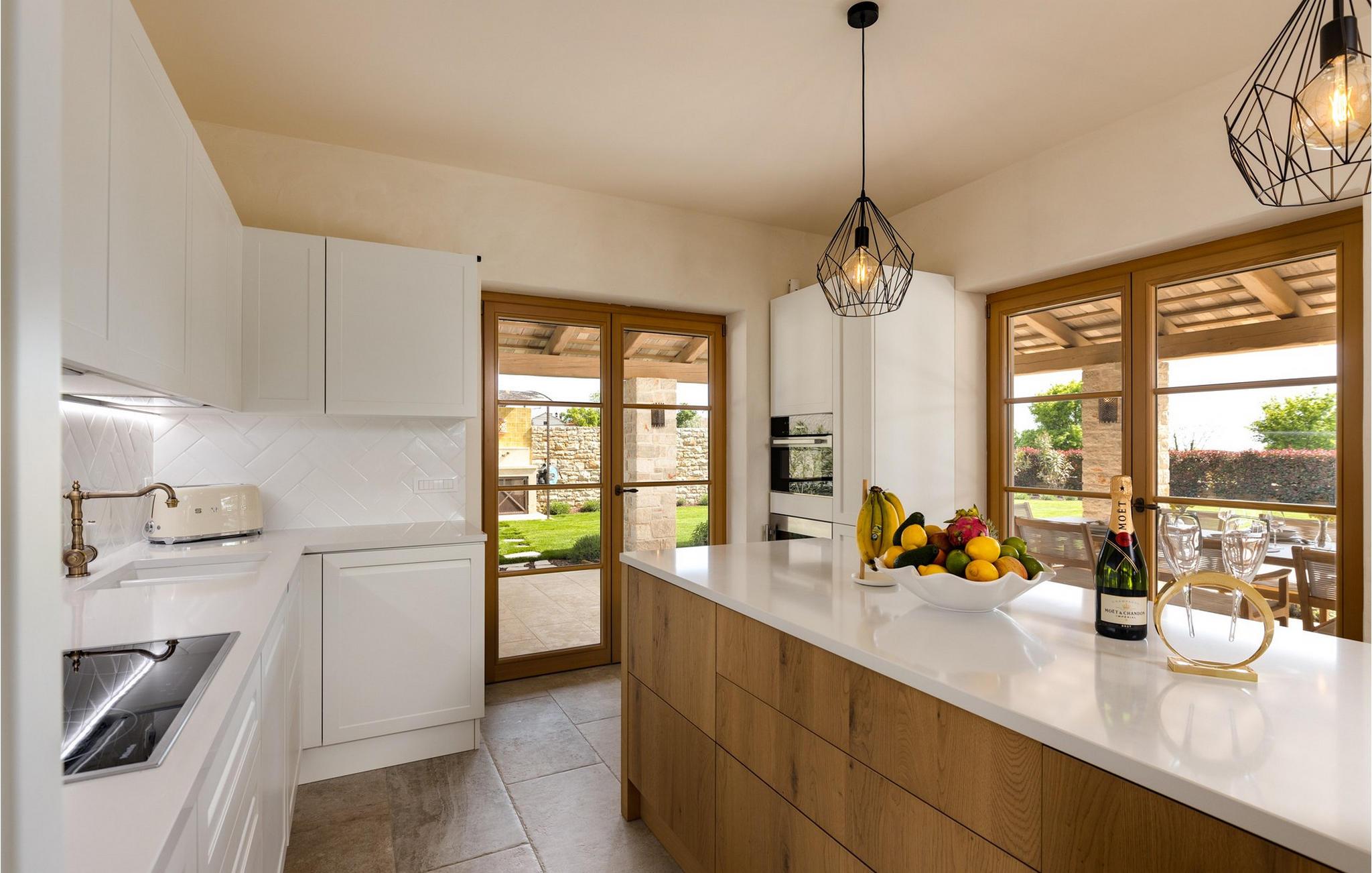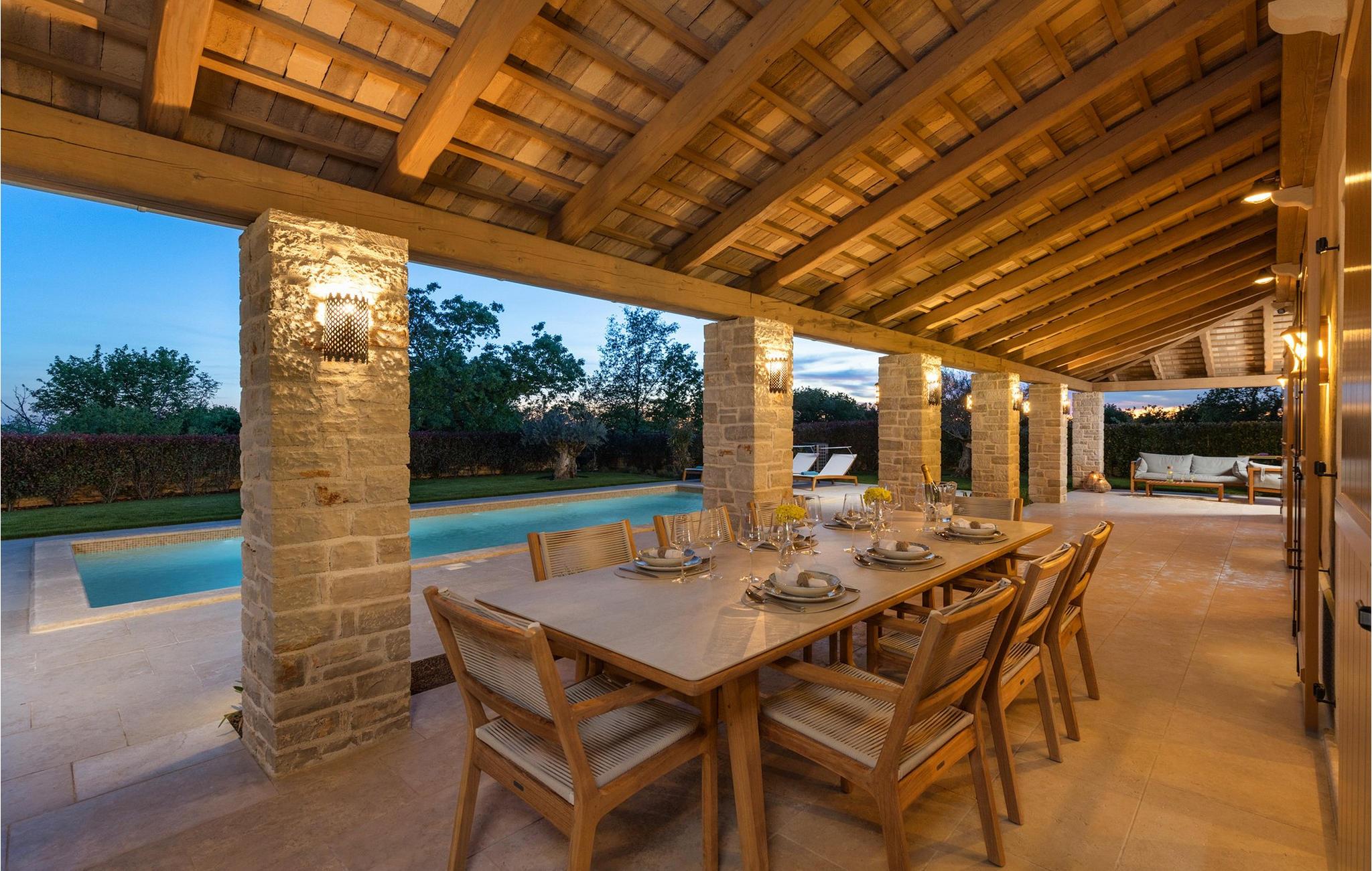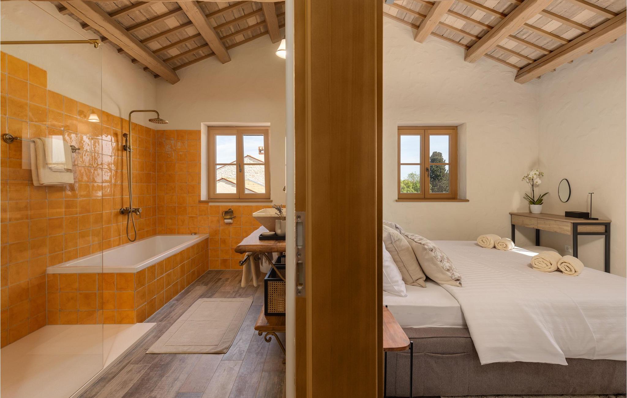 Smukke Villa Andrea ligger i den lille istriske by Smoljanci, i centrum af Istrien. De landlige omgivelser byder på absolut fred og privatliv, og den luksuriøse atmosfære i Villa Andrea tilbyder dig alt, hvad du behøver for en afslappende ferie. Villaen strækker sig over et samlet areal på 220 m2, som også omfatter en overdækket terrasse. Grundens størrelse er 800 m2. Villaen kan rumme i alt 6 personer og har 3 fuldt møblerede og airconditionerede værelser på øverste etage, hvoraf to har havudsigt. Der er to badeværelser ovenpå. Vaskemaskine og tørretumbler er også tilgængelige efter anmodning. Stueetagen af villaen har en rummelig stue, et moderne køkken og et ekstra toilet. På villaens skønne terrasse er der en 4x10 m pool med en dybde på 1,5 m. Omkring poolen er der 4 liggestole, en udendørs grill og et udendørs spisebord. Villaens gård er helt indhegnet og der er 2 parkeringspladser i gården. Området omkring villaen byder på mange interessante muligheder såsom cykling, ridning eller vinture og olivenolieture. Istrien er kendt for sit rige gastronomiske tilbud, og dyrkning og forarbejdning af vinstokke og olivenolie er blandt de mest berømte landbrugsgrene, der har været praktiseret i denne kroatiske region i århundreder. I dag er Istrien foran mange europæiske lande i produktionen af ekstra jomfru olivenolie, hvilket skyldes den enestående kvalitet af jorden i denne region. Sørg for at besøge nogle af de mange vinkældre, der producerer nogle af de fineste røde, hvide eller rosé-varianter såsom Merlot, Malvasia, Teran, Muscat eller Cabernet Sauvignon. Det centrale Istrien er også kendt for en særlig gourmet-delikatesse – trøfler, underjordiske juveler med en særlig bitter smag. Placeringen af denne dyre gastronomiske specialitet er i det centrale Istrien, især omkring Motovun-skoven. Et interessant tilbud i Istrien er trøffeljagt, en oplevelse, hvor du på egen hånd kan opleve, hvordan den traditionelle søgen efter denne delikatesse, der hovedsageligt er gemt i rødderne af eg, poppel, bøg, elmetræer og lignende træer, ser ud. Hvis du stadig nyder at se kulturelle og historiske monumenter, vil du helt sikkert nyde at udforske det indre af Istrien, som udover et eventyrlandskab også gemmer på monumenter fra forskellige epoker af historien. For eksempel er der i byen Motovun interessante middelaldermure, der giver denne by en særlig charme. Ifølge legenden sejlede de mytiske karakterer Jason og Argonauter på Mirna-floden ved foden af Motovun, og de første indbyggere boede her mellem 3.500 og 3.500 år. og 2.200 f.Kr. Chr. Kr. På Istriens kyst finder du mange andre interessante steder, der forbløffer med deres turisttilbud, men også smukke kulturelle og historiske monumenter, såsom Porec, Umag, Rovinj eller Pula. Nyd Istriens smukke landskab, vinruter og gastronomiske tilbud, og slap af i freden og privatlivet i Villa Andrea og den luksus, du fortjener. Poolopvarmning er tilgængelig mod et ekstra gebyr, der skal betales lokalt. Kæledyr er tilladt på denne ejendom efter ejerens skøn eller mod et gebyr.