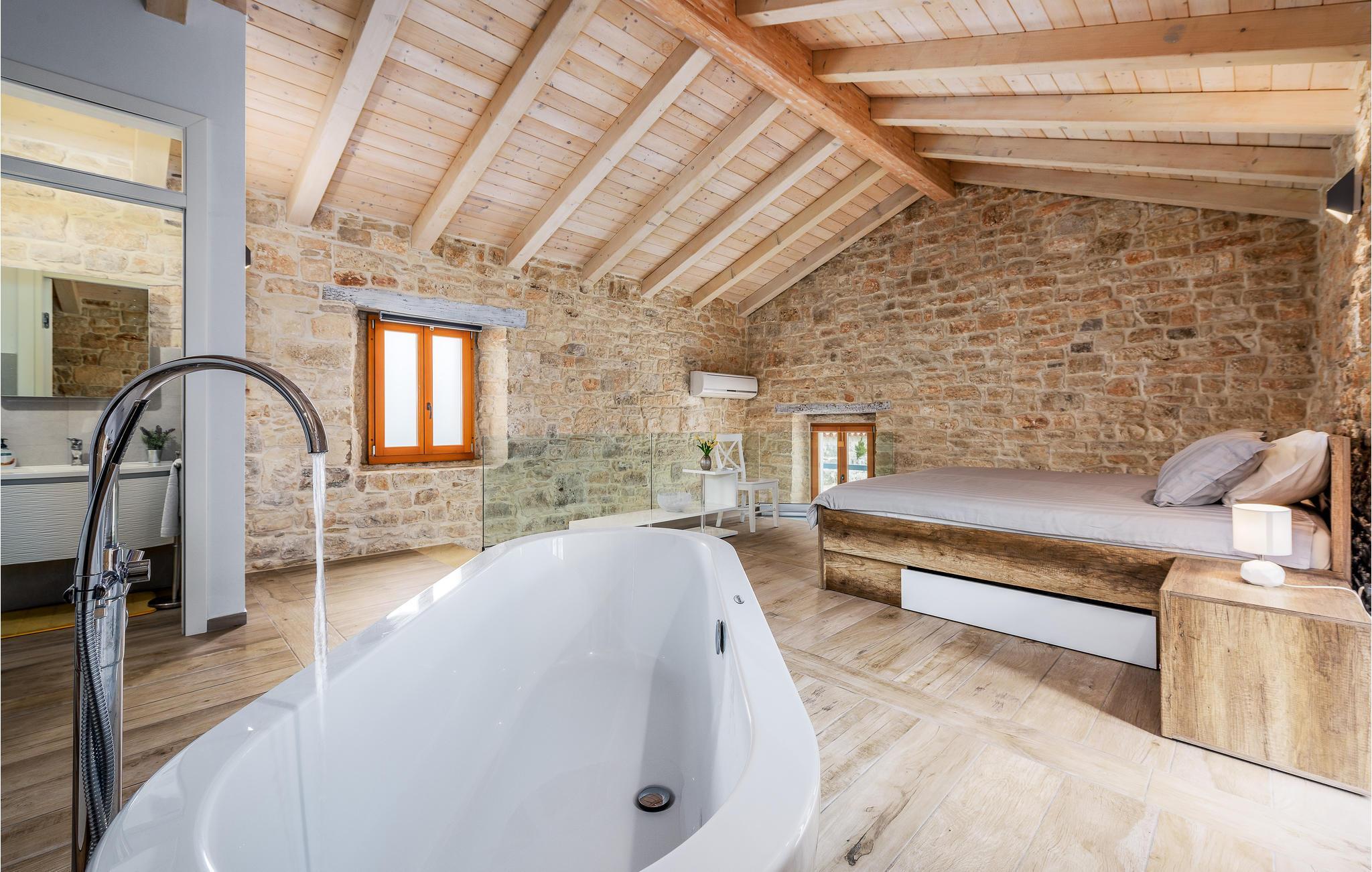 Dette indbydende feriehus er designet i en moderne stil med masser af lys, glas og sten. Møblerne understreger den moderne atmosfære. Et højdepunkt er soveværelset med et fritstående badekar på første sal i huset. Bemærk, at der ikke er nogen dør til rummet her. Tag et afslappende bad her efter en aktiv dag. Der er yderligere to senge i stuen i stueetagen. Her finder du også det åbne køkken med køkkenø, som inviterer dig til at snakke, mens kokken på ferien forbereder måltiderne.
