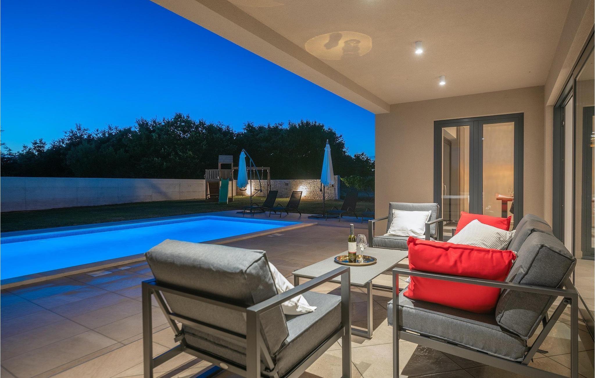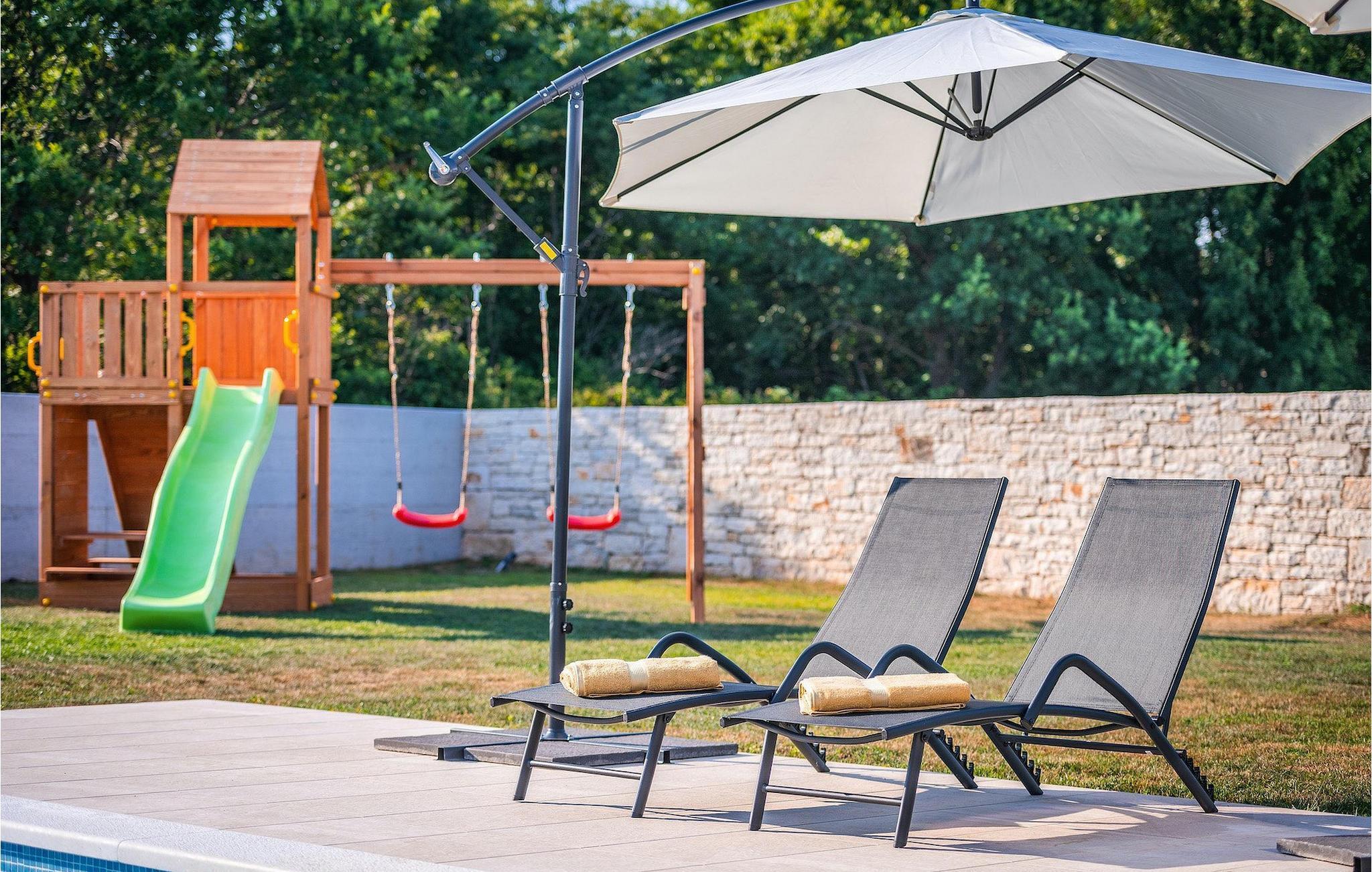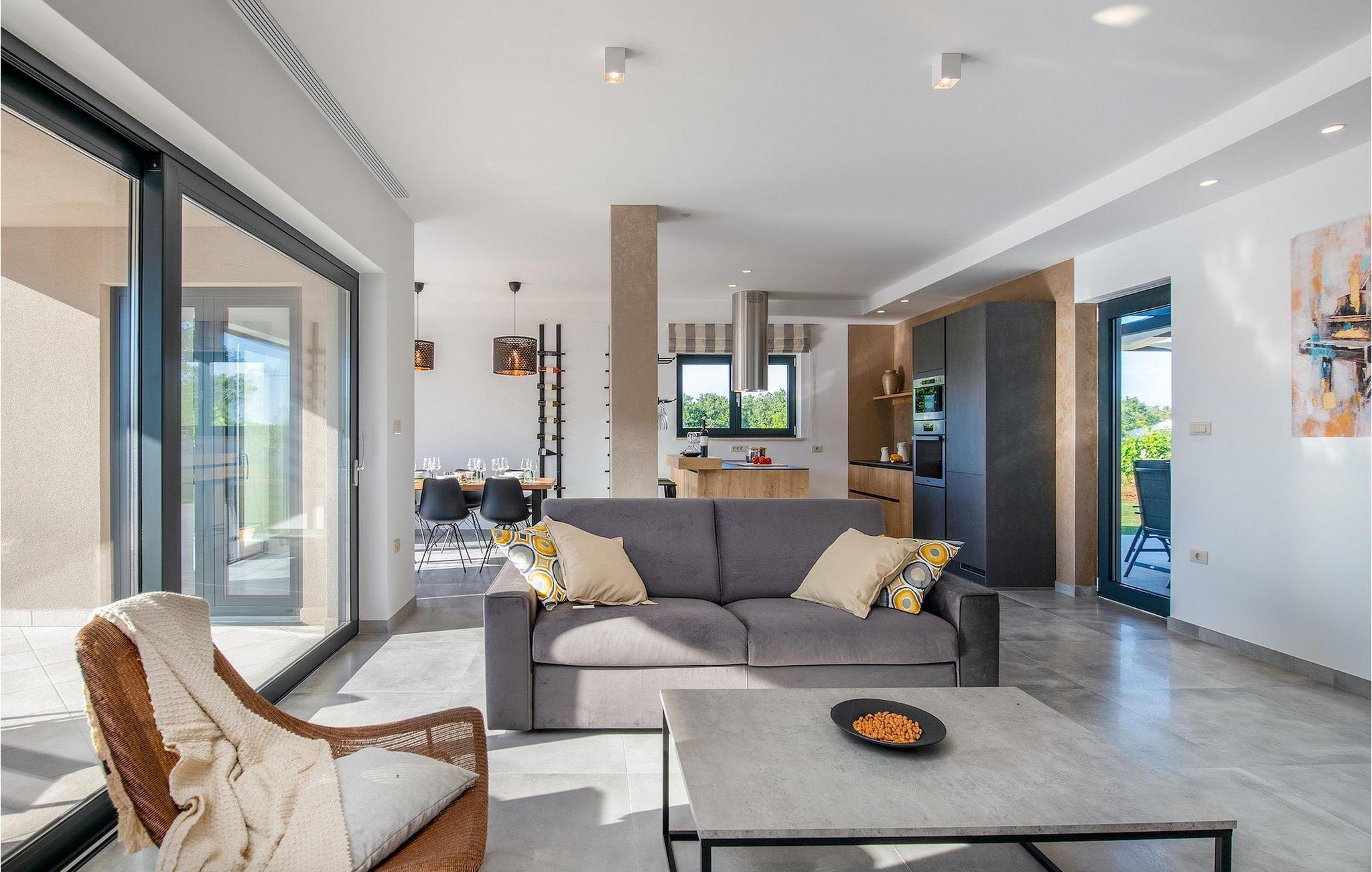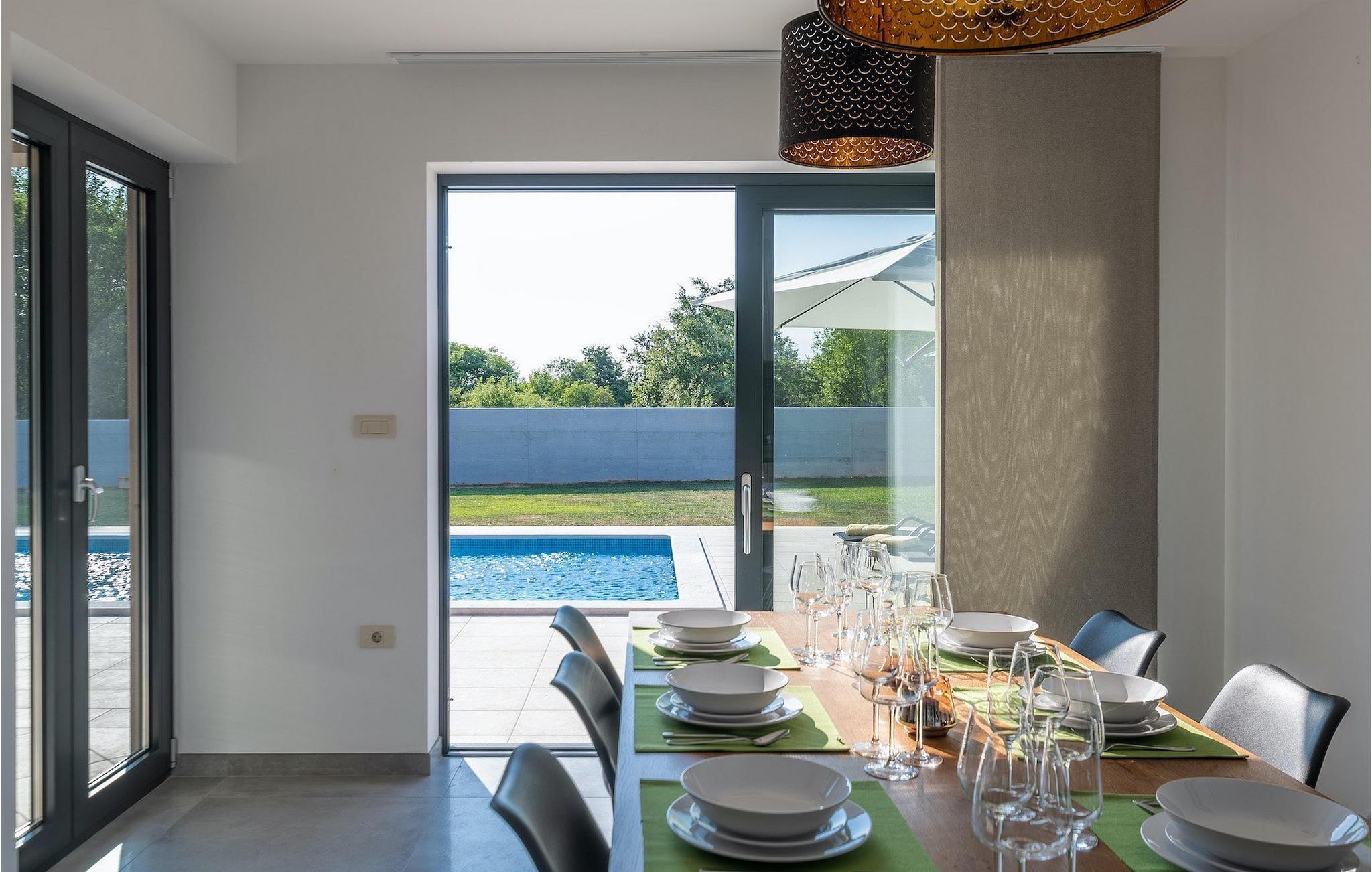 Fra stuen er der direkte adgang til villaens have og poolområde, helt lukket fra alle sider. Mens børnene nyder trampolinen og legepladsen, kan de voksne nyde en kold drink ved poolen eller grillen på terrassen på bagsiden af villaen. Undslippe solen og skjul dig på terrassen og slap af i loungeområdet. Hvis du beslutter dig for at forlade dit private stykke paradis, er placeringen af denne villa en fantastisk startposition for vandreture i naturen, gå til stranden, gastronomiske ture og dagsture til smukke istriske byer som Rovinj, Porec, Pula, Fazana, Vrsar, Rabac...I den syd-centrale del af halvøen Istrien ligger det middelalderlige bymonument St. Vincent. Den gamle arkitektur i byen og de omkringliggende landsbyer er velbevaret, mens vinmarker og oliven dominerer dette område med et varmt middelhavsklima. St. Vincent og det omkringliggende landskab er velkendt, ikke kun for deres historiske og kulturelle arv, men for fremragende vin og ægte istrisk køkken. Istrien er et unikt og fortryllet sted, der har taget imod besøgende og bosættere fra andre dele af verden, så længe vi har nedtegnet historie. Byen Pula med dets romerske amfiteater og Brijuni nationalpark med en 18-hullers golfbane ligger kun en kort køretur væk. Adriaterhavskysten med det krystalklare hav og alle former for vandaktiviteter nær den smukke by Rovinj med dens kunstsamfund er også meget tæt på.