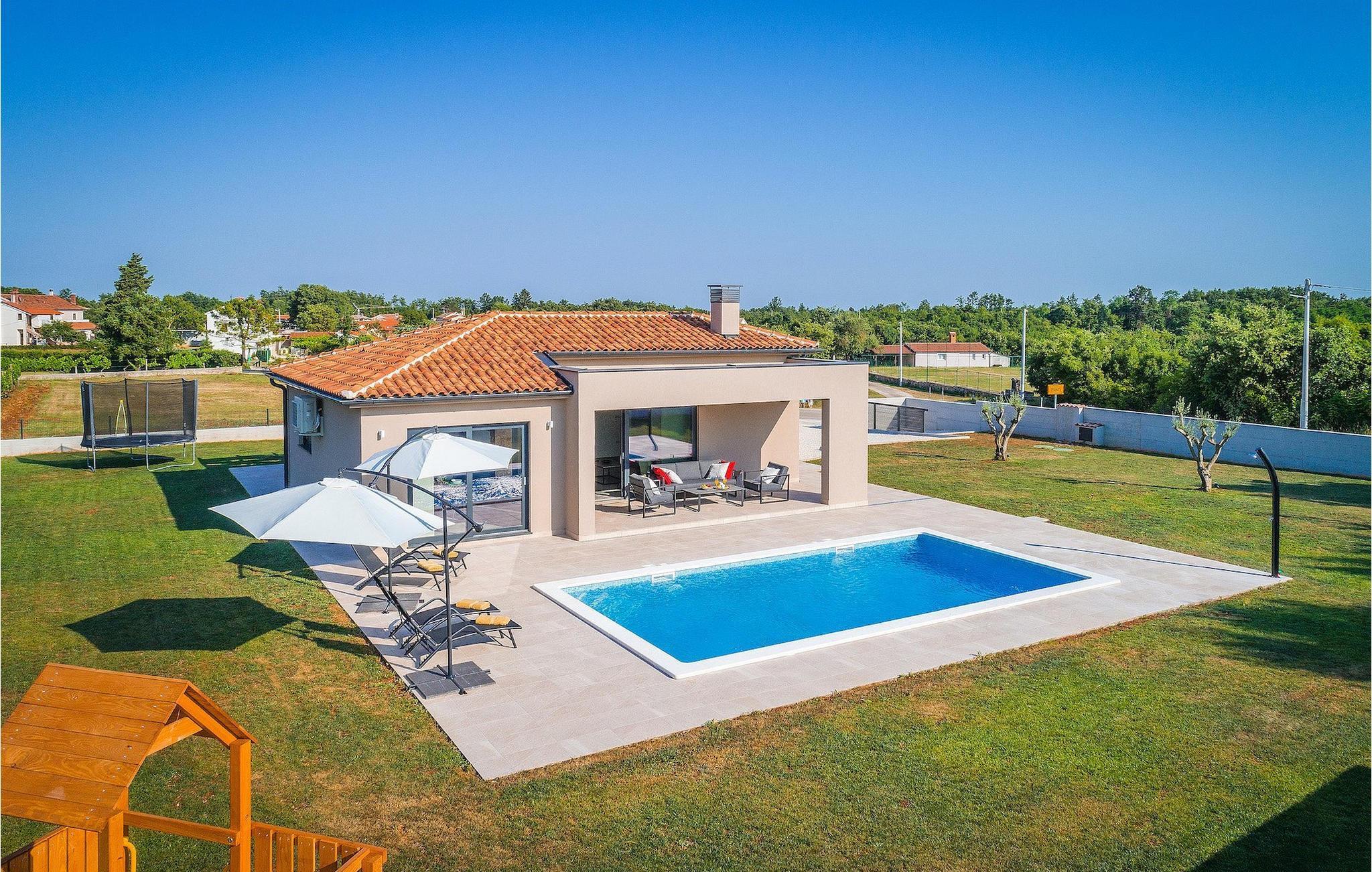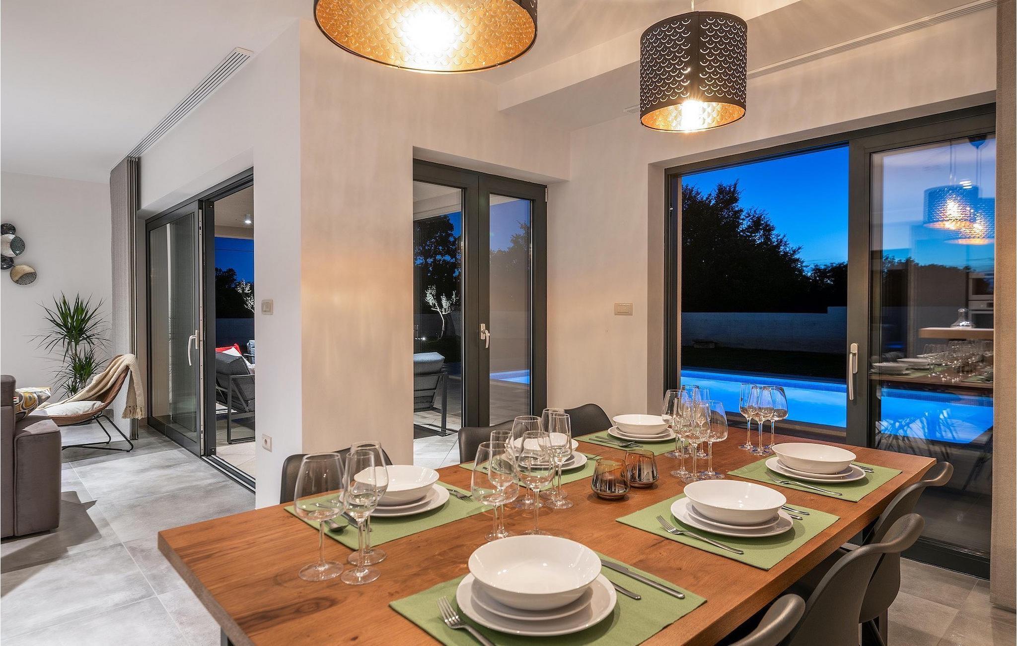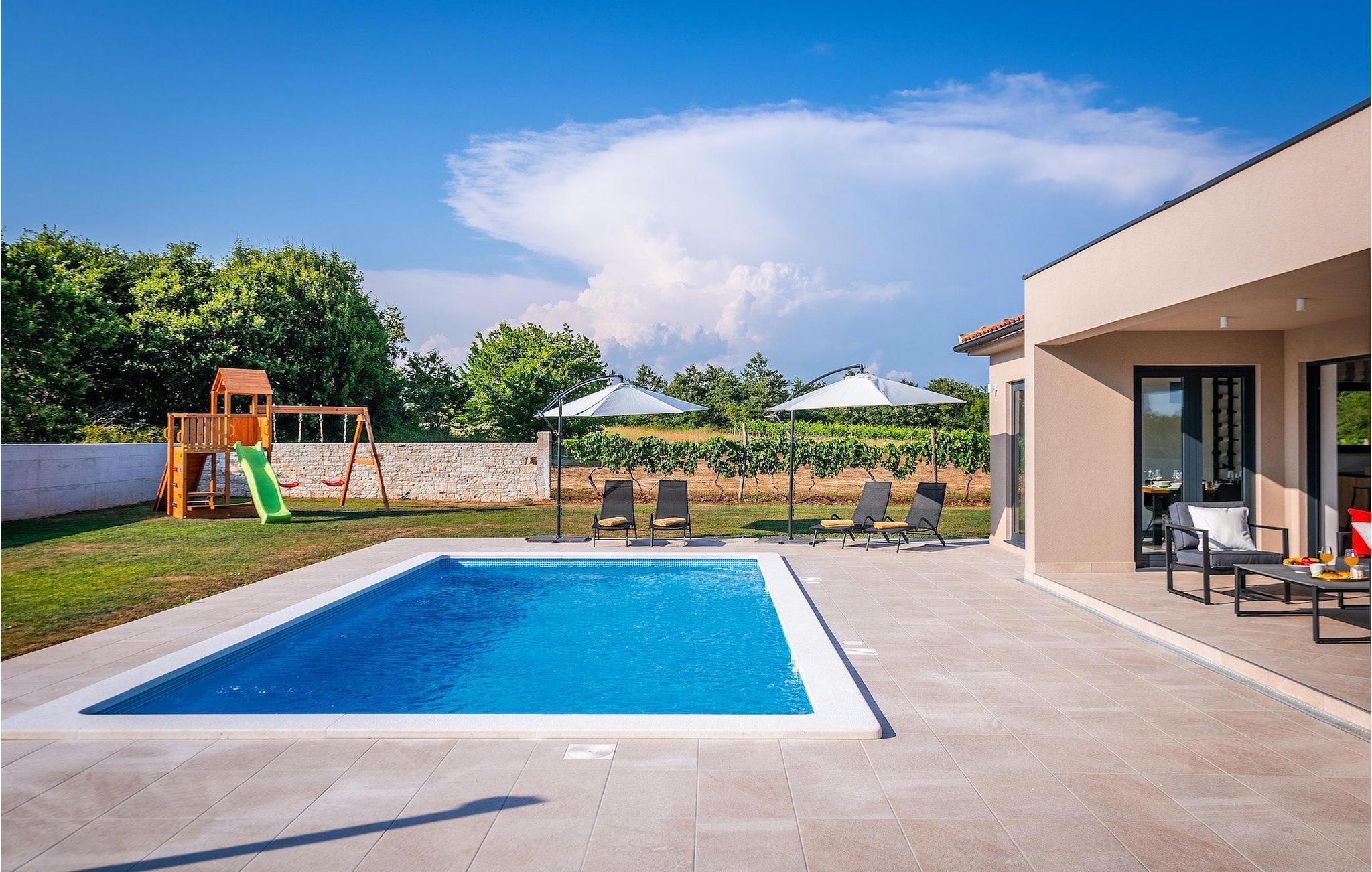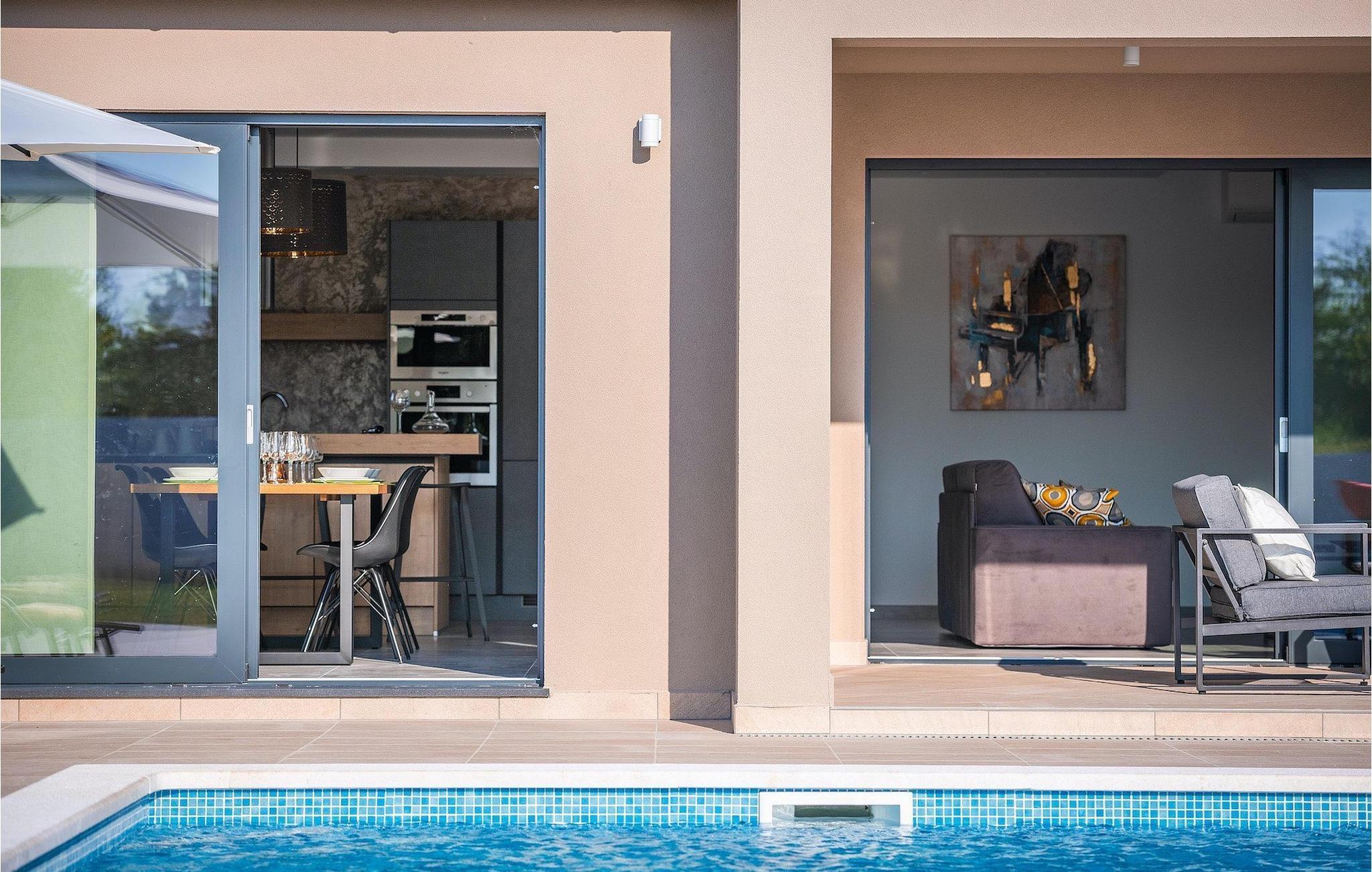 Fra stuen er der direkte adgang til villaens have og poolområde, helt lukket fra alle sider. Mens børnene nyder trampolinen og legepladsen, kan de voksne nyde en kold drink ved poolen eller grillen på terrassen på bagsiden af villaen. Undslippe solen og skjul dig på terrassen og slap af i loungeområdet. Hvis du beslutter dig for at forlade dit private stykke paradis, er placeringen af denne villa en fantastisk startposition for vandreture i naturen, gå til stranden, gastronomiske ture og dagsture til smukke istriske byer som Rovinj, Porec, Pula, Fazana, Vrsar, Rabac...I den syd-centrale del af halvøen Istrien ligger det middelalderlige bymonument St. Vincent. Den gamle arkitektur i byen og de omkringliggende landsbyer er velbevaret, mens vinmarker og oliven dominerer dette område med et varmt middelhavsklima. St. Vincent og det omkringliggende landskab er velkendt, ikke kun for deres historiske og kulturelle arv, men for fremragende vin og ægte istrisk køkken. Istrien er et unikt og fortryllet sted, der har taget imod besøgende og bosættere fra andre dele af verden, så længe vi har nedtegnet historie. Byen Pula med dets romerske amfiteater og Brijuni nationalpark med en 18-hullers golfbane ligger kun en kort køretur væk. Adriaterhavskysten med det krystalklare hav og alle former for vandaktiviteter nær den smukke by Rovinj med dens kunstsamfund er også meget tæt på.