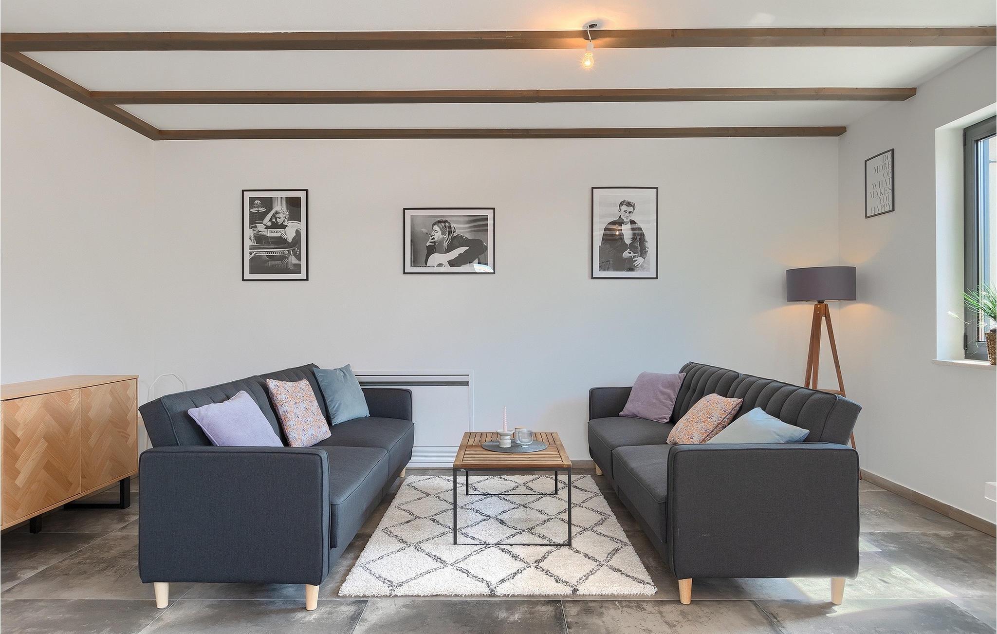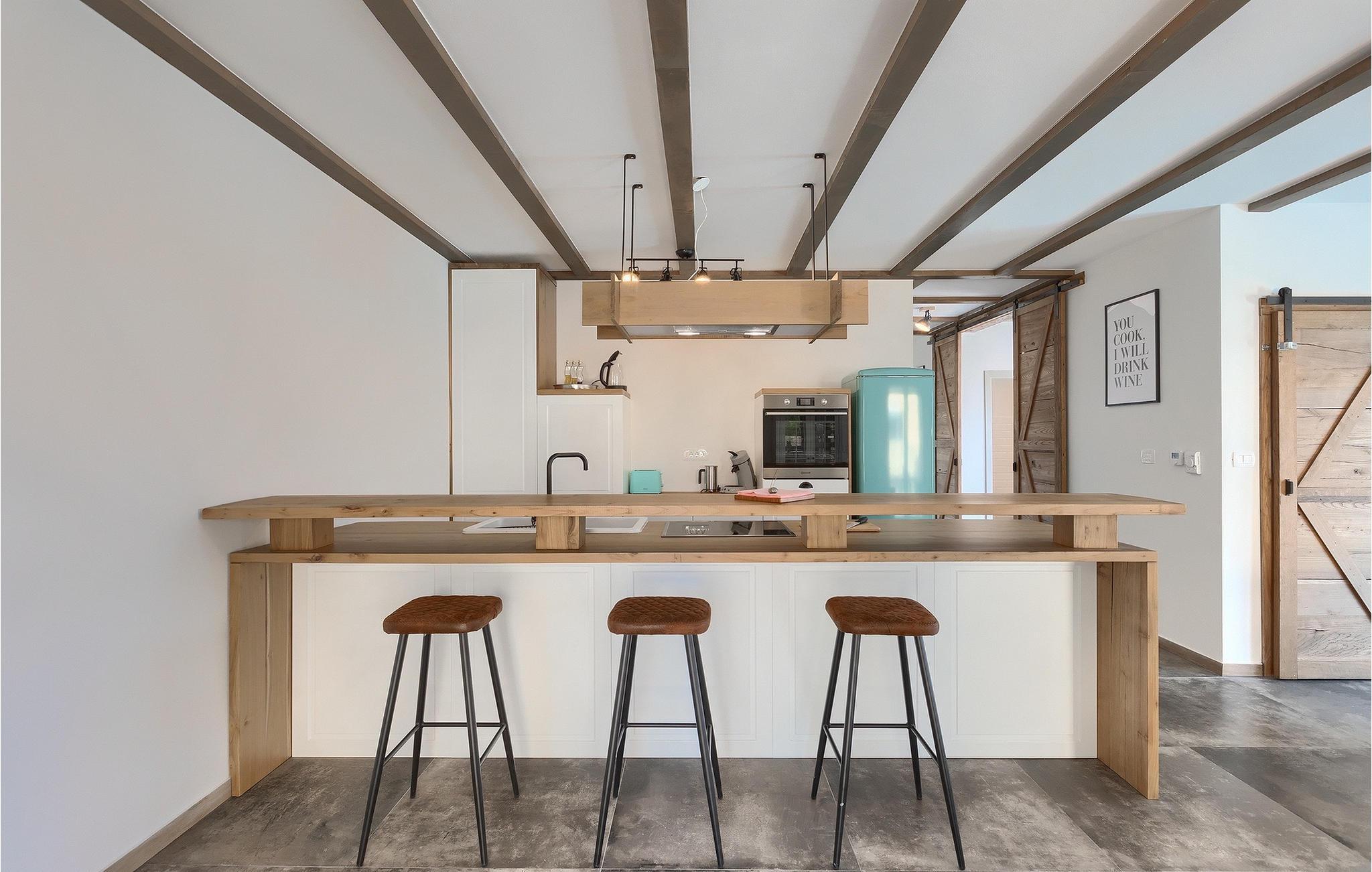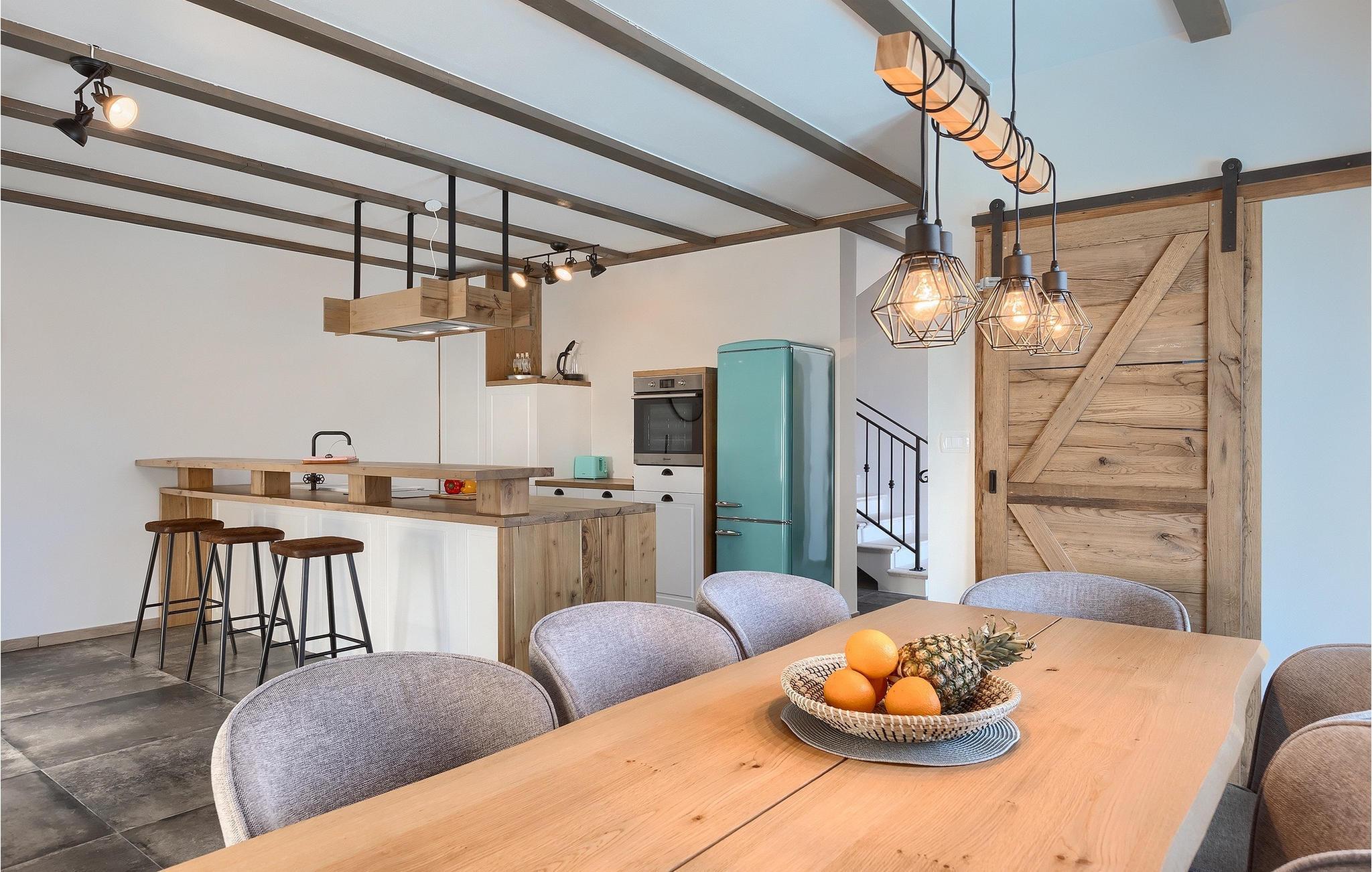 Villaens indretning emmer af et moderne design i en harmonisk kombination med naturlige materialer. I stueetagen er der en rummelig smukt møbleret stue, fuldt udstyret køkken og spisestue med udgang til terrassen.