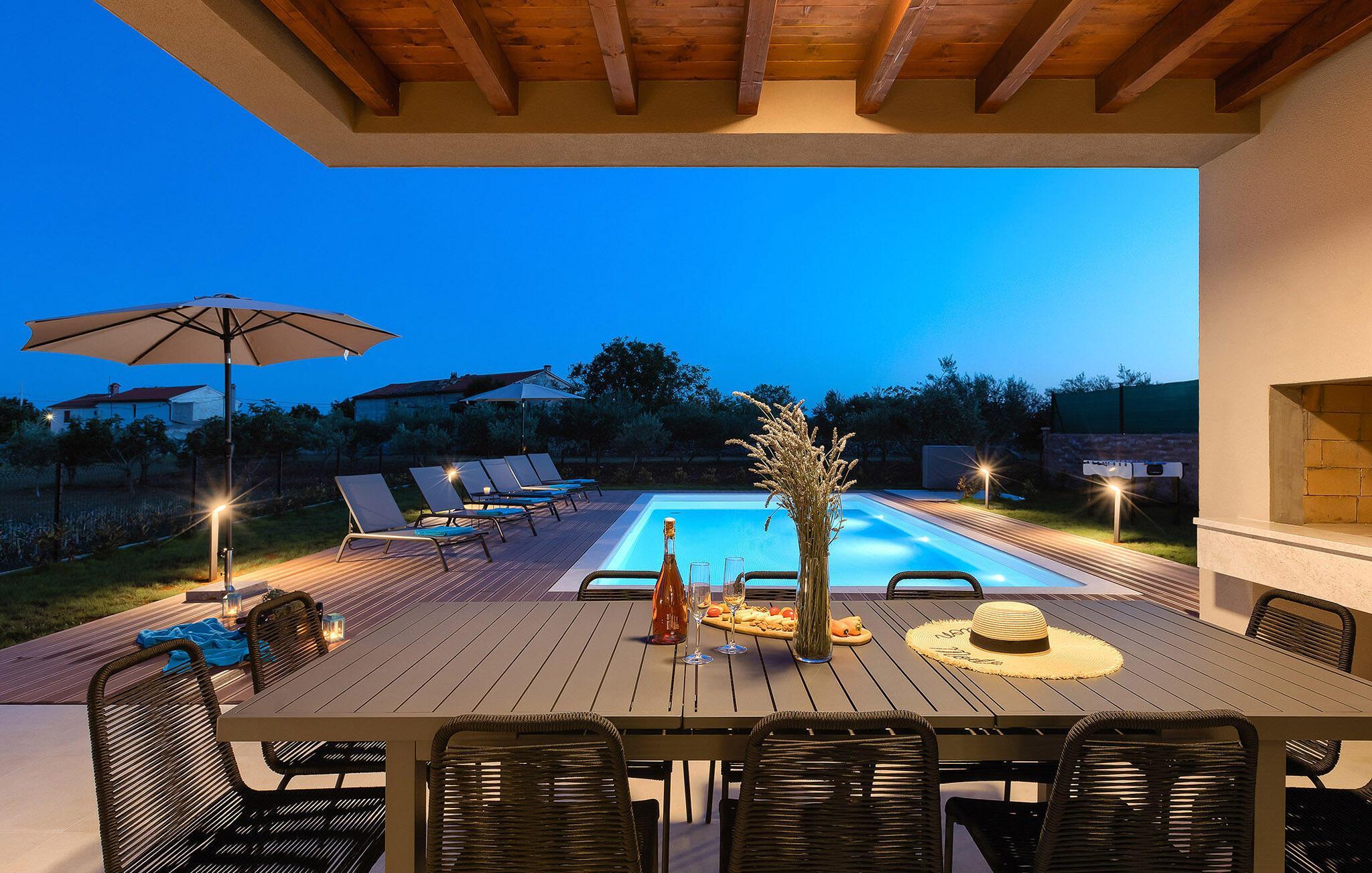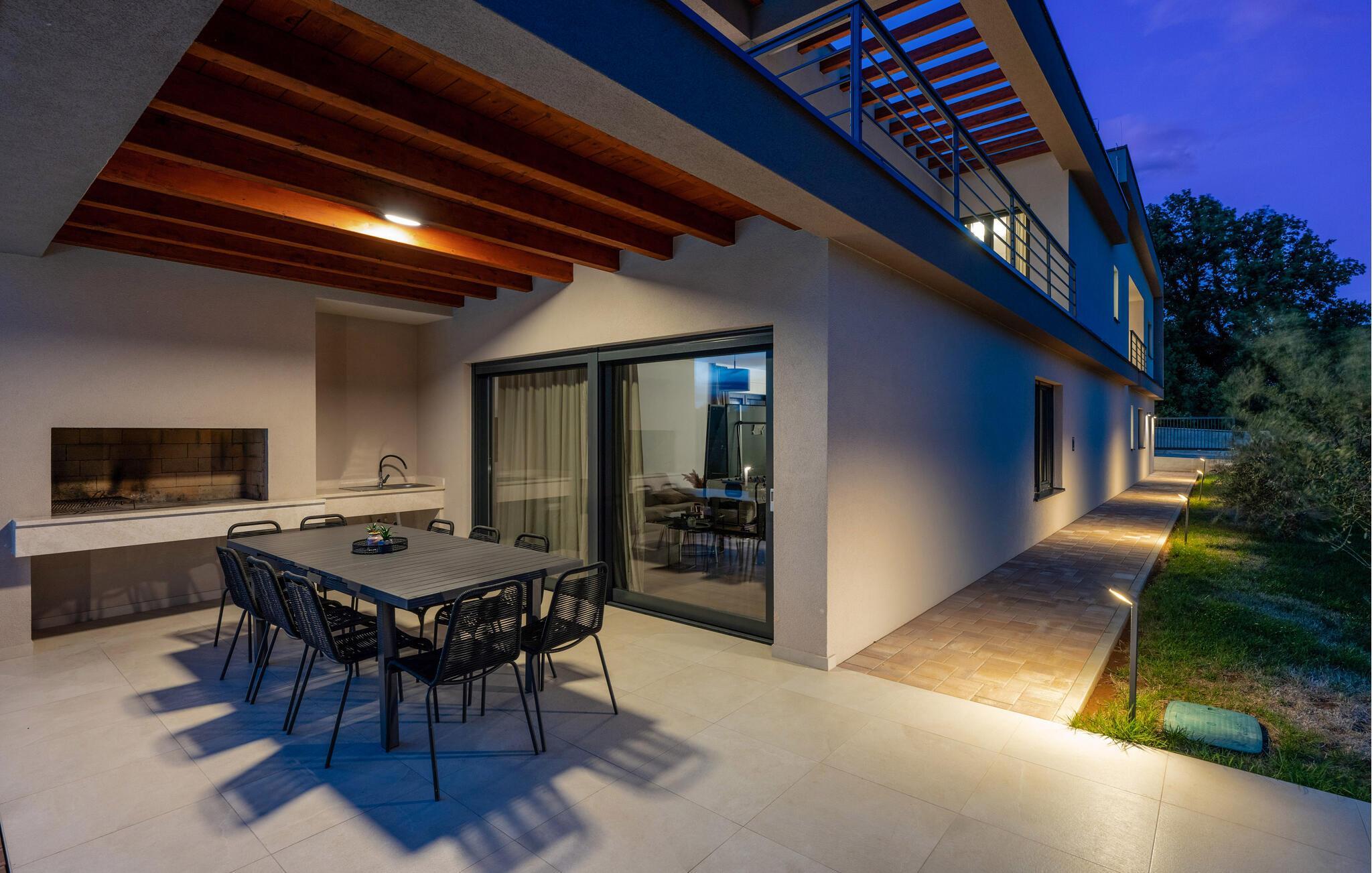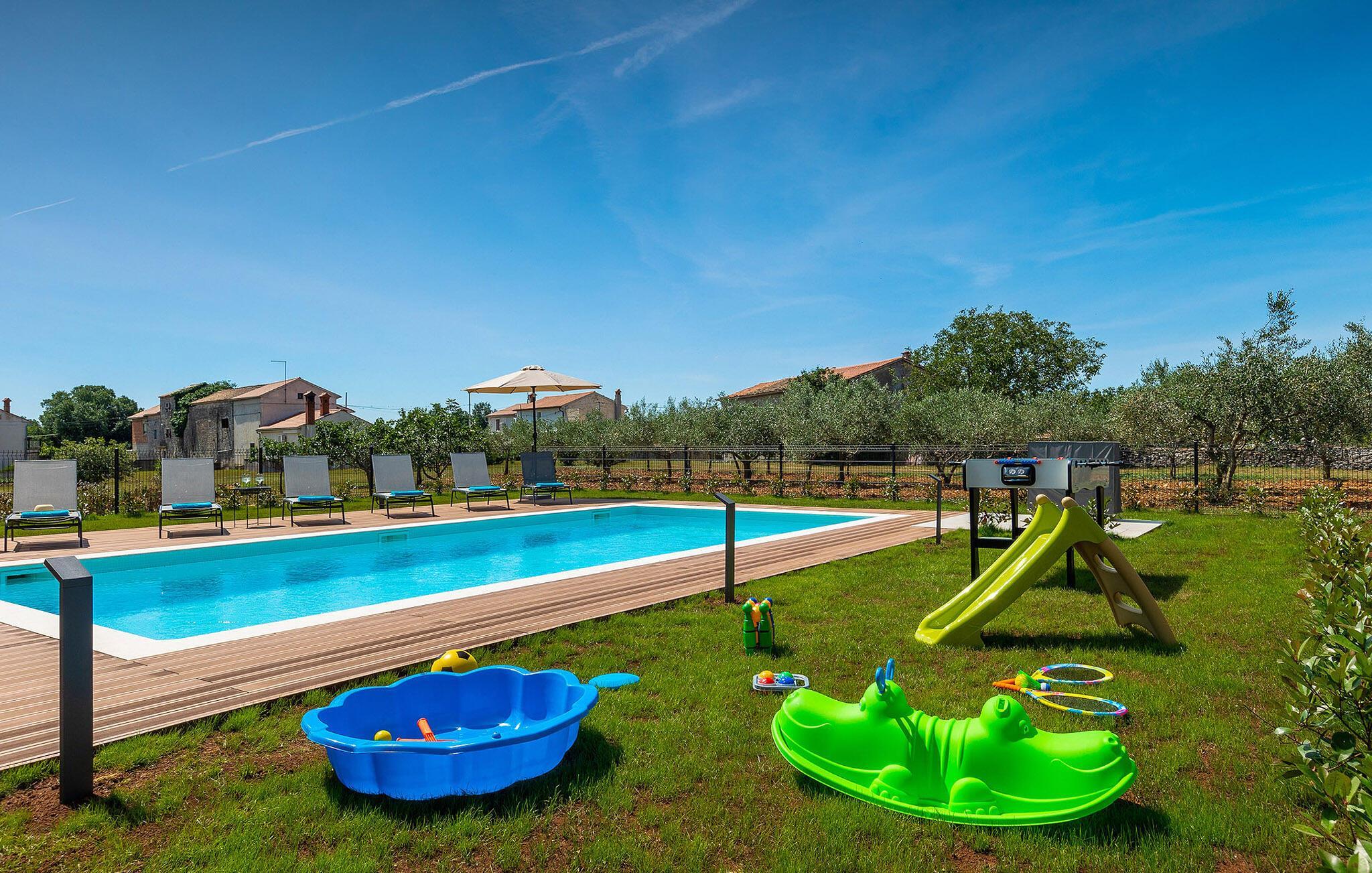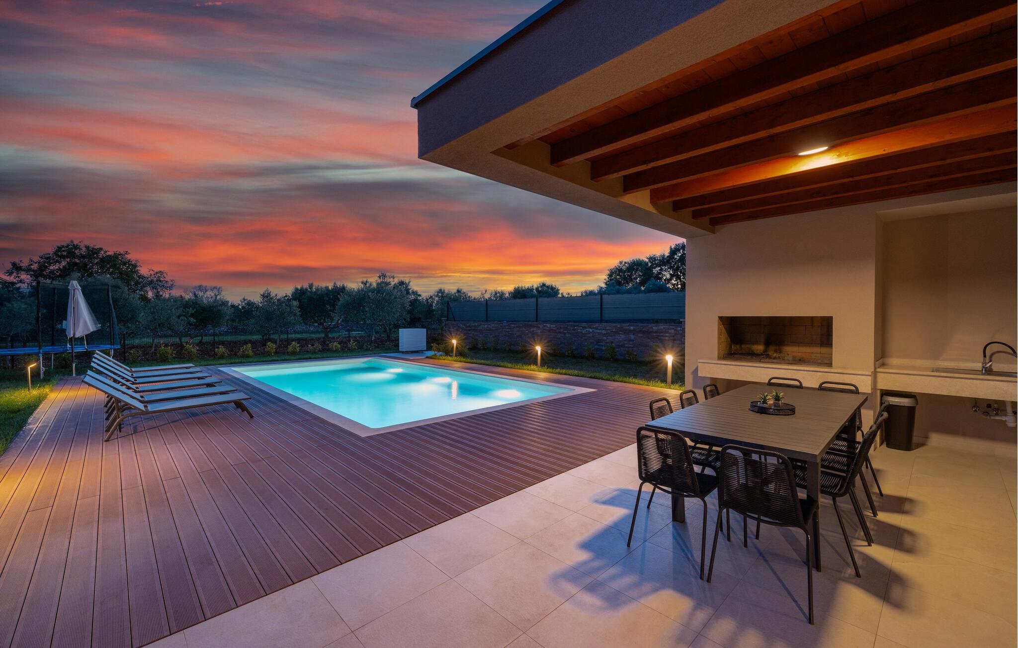 Den smukke familie Villa Artsi ligger i middelalderbyen Svetvincenat. Den fuldt indhegnede villa tilbyder dig en intim ferie med familie, venner og kæledyr. Foran villaen er der en imponerende opvarmet pool på 50 m2. Nyd solbadning på liggestolene eller tilbring uforglemmelige sammenkomster ved poolen i det overdækkede område ved et bord med ti siddepladser. Tilbered traditionelle istriske retter på grillen til hele familien. Hav det sjovt udendørs med dine kære med bordfodbold og bordtennis. De yngste gæster vil være glade for at tilbringe tid på legepladsen, der er udstyret med en rutsjebane. Det indre af villaen er moderne i indretning. I villaens stueetage er der et åbent område med en rummelig stue, et fuldt udstyret køkken, hvor hele familien kan deltage i tilberedningen af måltider, og en spisestue med ti siddepladser, hvor I kan tilbringe tid sammen. Et separat toilet og det første soveværelse med dobbeltsenge og eget badeværelse er placeret i stueetagen af villaen. De resterende fire soveværelser med dobbeltsenge og private badeværelser er placeret på første sal. Alle værelser har tv og klimaanlæg, ideelt til en fredelig søvn og ønsket hvile. Soveværelserne har udgang til villaens terrasse, hvor du kan nyde morgenkaffe eller en forfriskende drink, mens du beundrer den smukke udsigt over den uberørte natur. Vælg denne smukke villa, ideel til en familieferie med venner og kæledyr i landlige omgivelser omgivet af grønne områder og den istriske atmosfære. Overgiv dig til charmen fra de lokale beboere i landsbyen Štokovci og nyd en unik ferie i det indre af Istrien. Villa Artsi ligger nær middelalderbyen Svetvincenat i landsbyen Štokovci i den sydlige del af det centrale Istrien. Svetvincenat vil glæde dig med renæssancepladsen "Placa" med Morosini-Grimani-slottet, symbolet på selve stedet. En vigtig del af Svetvincenats kulturarv er de bevarede rester af murfresker i kirken St. Vincent nær byens kirkegård og i kirken St. Catherine. Denne særlige by tiltrækker besøgende med interessante og varierede lokale begivenheder; den mest fremragende er Middelalderfestivalen, hvor du kan prøve dig i middelalderlege. Du vil blive imponeret over den lokale befolknings gæstfrihed, det rige traditionelle istriske køkken og den ekstra jomfru olivenolie. Udforsk skønheden i denne region på adskillige cykel- og vandrestier. Besøg de vigtigste turistcentre i Istrien: Rovinj, Porec, Labin, Pula. I Rovinj kan du se den barokke kirke St. Euphemia, mens du i Porec kan besøge den byzantinske Euphrasian Basilica, der er optaget på UNESCOs verdenskulturarvsliste. Gå ikke glip af at besøge den største by i Istrien, Pula, hvor du kan se Pula Arena, Augustus-templet, Den Gyldne Port og mange andre kulturelle og historiske monumenter. Udforsk endelig Brijuni-øgruppen med den berømte Brijuni Nationalpark. Temperaturen i den opvarmede swimmingpool er afhængig af eksterne faktorer, herunder vejrforhold, og som sådan kan temperaturen på vandet ikke garanteres.