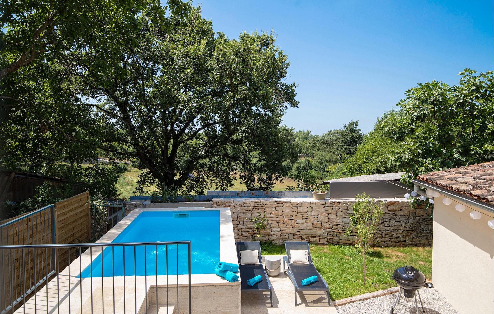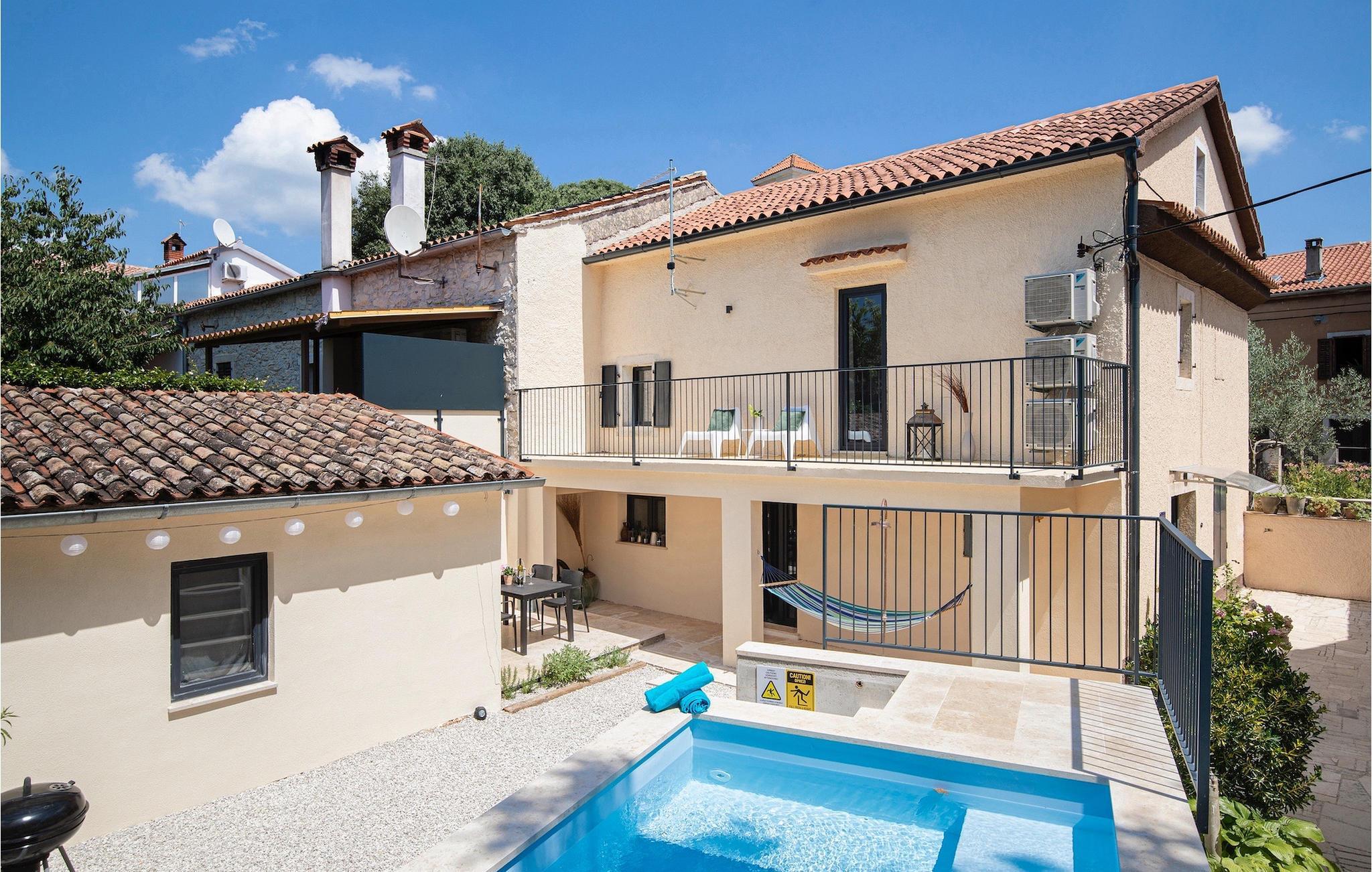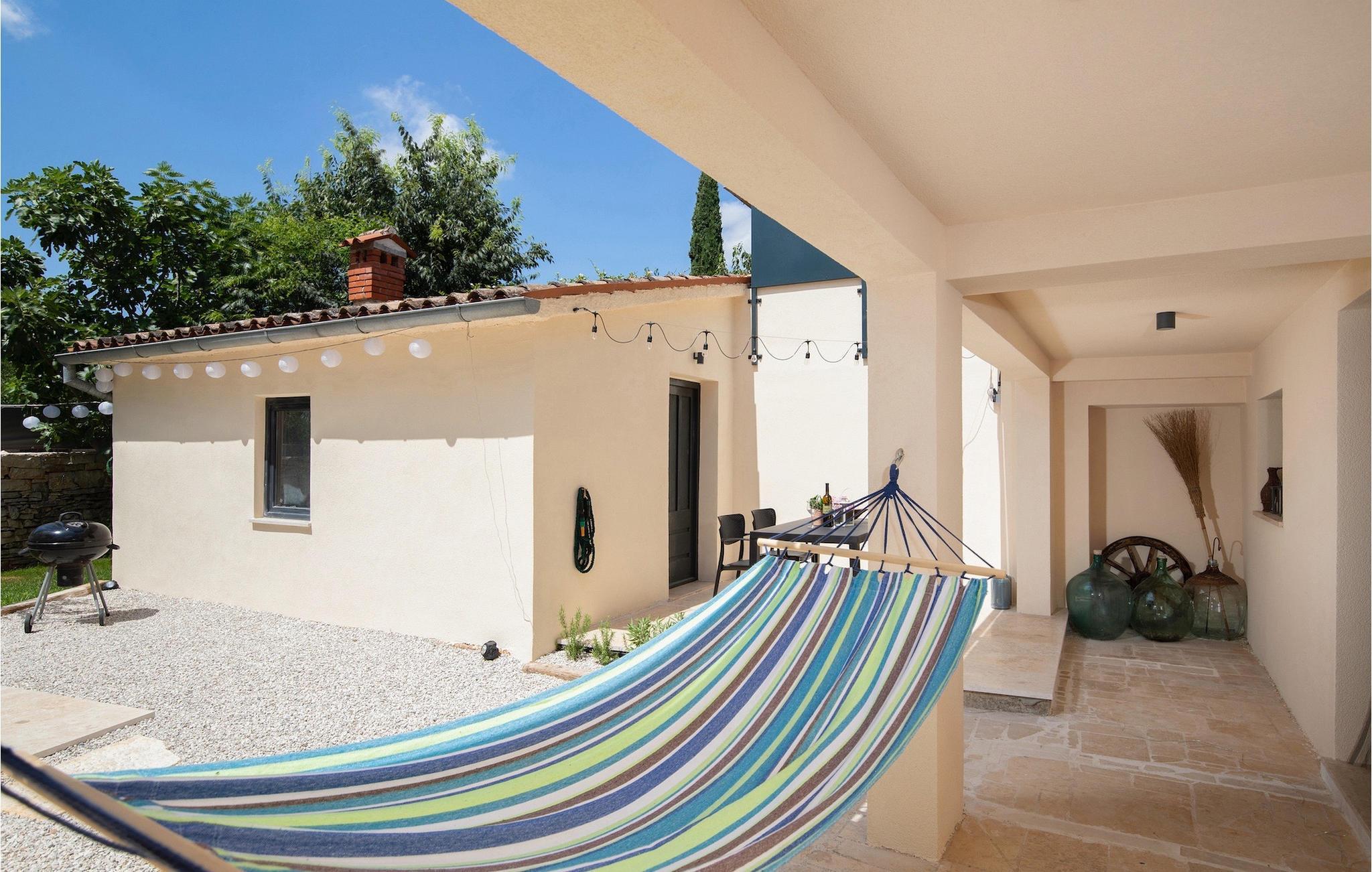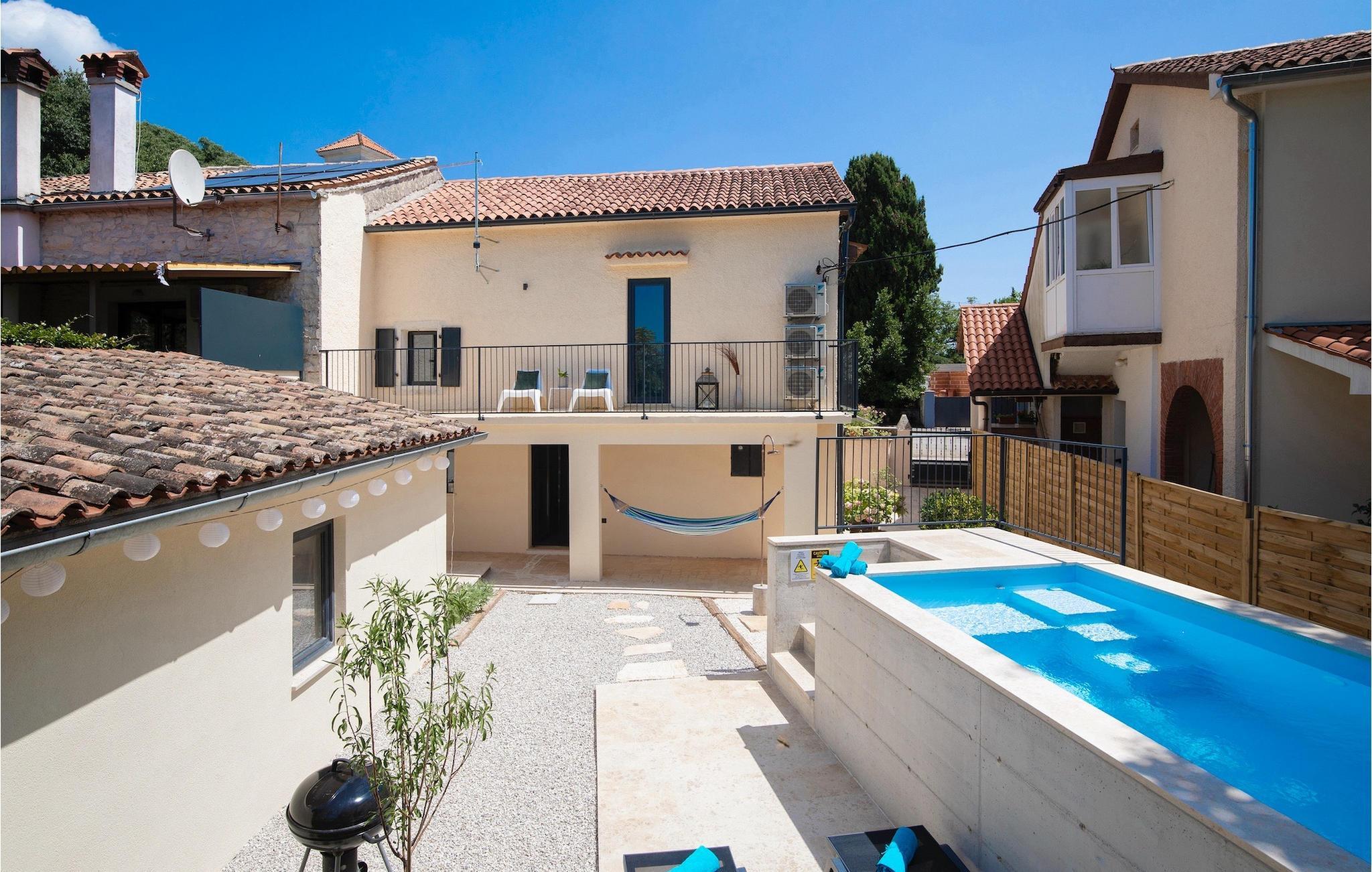 Villa Giorgio Jursici er en charmerende villa beliggende i det centrale Istrien. Trænger du til en ferie i et miljø af uberørt natur, så er Villa Giorgio Jursici noget for dig. Foran villaen er der en skøn 6 m2 pool. Køl af i poolen i sommervarmen eller slap af på liggestolene ved poolen og nyd den istriske sols stråler. Tag en lur i en hængekøje i det overdækkede område foran villaen. Tilbered traditionelle istriske retter på grillen til familie og venner. Tilbring uforglemmelige sammenkomster med tilberedte måltider ved bordet med 4 pladser foran villaen. I stueetagen af villaen er der et åbent rum med et veludstyret køkken og en spisestue med 6 sæder og det første badeværelse. På første sal er der et hyggeligt soveværelse med dobbeltseng og aircondition, der emmer af den istriske atmosfære. Udover soveværelset er der også en stue på denne etage, hvor du kan slappe af med en interessant film, og et badeværelse. Tilbring dine morgener på terrassen på første sal, mens du nyder en kop kaffe. Gå ikke glip af en afslappende ferie i Villa Giorgio Jursici og forkæl dig selv med charmen i den traditionelle istriske by Jursici. Villa Giorgio Juršici ligger i landsbyen Juršici i det centrale Istrien. I denne charmerende landsby vil du blive henrykt over den lokale befolkning og deres hjemmelavede produkter. Smag traditionel istrisk olivenolie og andre delikatesser. Tag et kig på kirken St. Frans af Assisi fra det 19. århundrede og besøg den traditionelle messe for det istriske æsel. Svetvincena vil fortrylle dig med renæssancepladsen "Placa" med Morosini-Grimani-slottet, symbolet på selve stedet. En vigtig del af Svetvincenas kulturarv er de bevarede rester af murfresker i kirken St. Vincent nær byens kirkegård og i kirken St. Catherine. Denne specielle by tiltrækker besøgende med interessante og varierede lokale begivenheder, hvoraf den mest fremtrædende er middelalderfestivalen, hvor du kan prøve dig i middelalderlege. Placeringen af villaen er et ideelt udgangspunkt for at udforske Istrien. Besøg de vigtigste turistcentre i Istrien: Rovinj, Porec, Labin, Pula. I Rovinj kan du se den barokke kirke St. Euphemia, mens du i Porec kan besøge den byzantinske Euphrasian Basilica, der er optaget på UNESCOs verdenskulturarvsliste. Gå ikke glip af at besøge den største istriske by Pula, hvor du kan se Pula Arena, Augustus-templet, Den Gyldne Port og mange andre kulturelle og historiske monumenter. Udforsk endelig Brijuni-øgruppen med den berømte Brijuni Nationalpark.