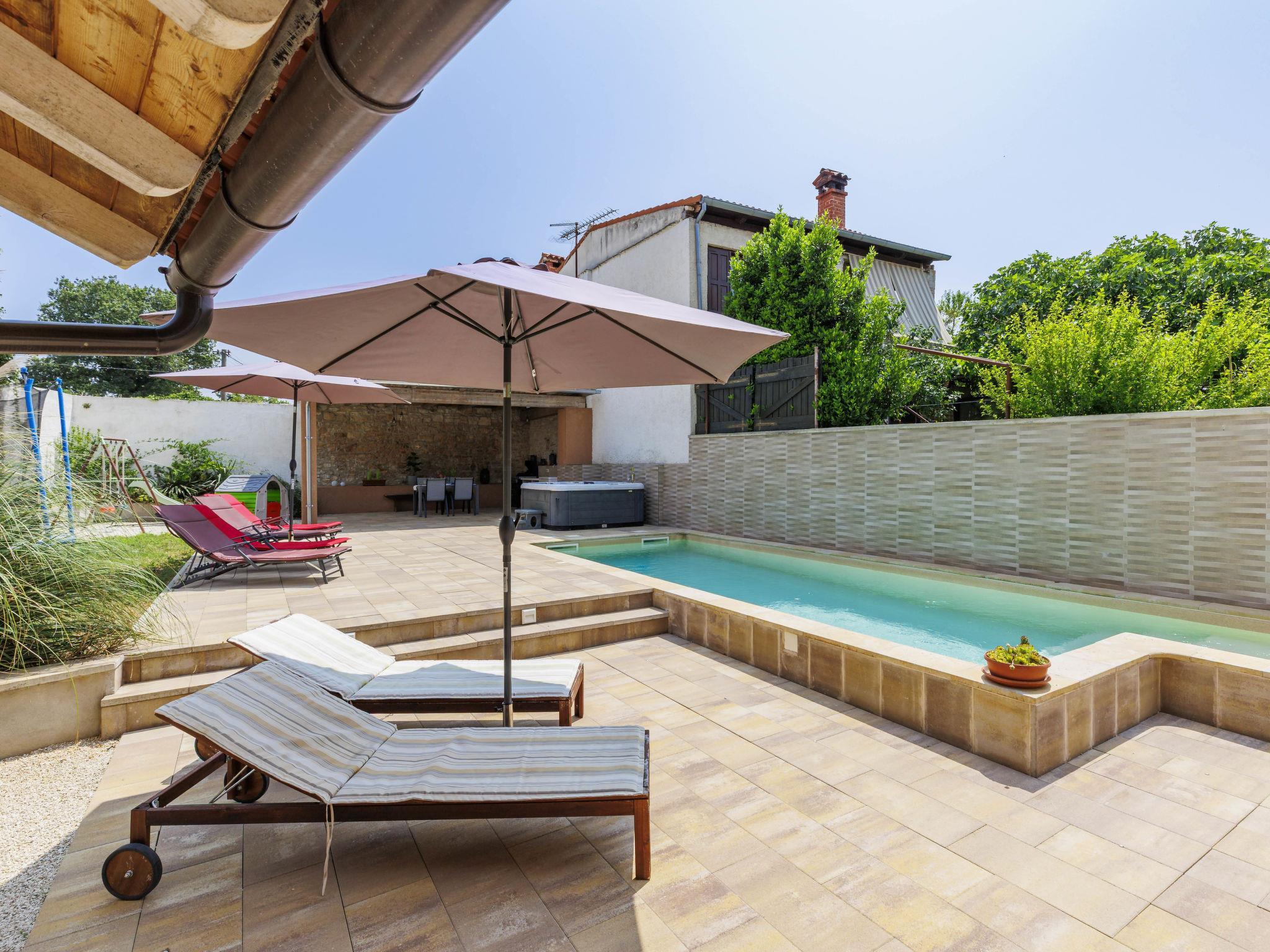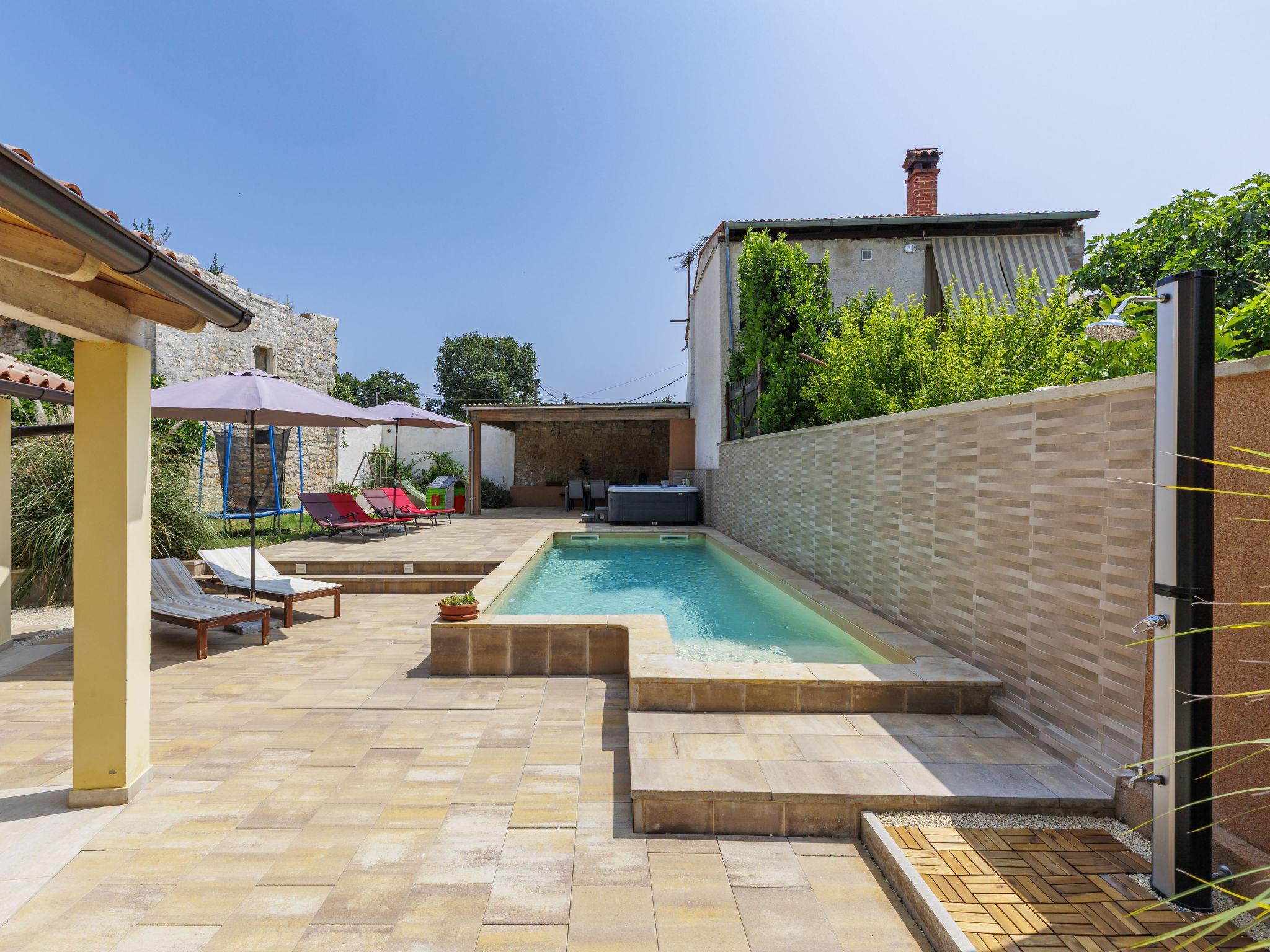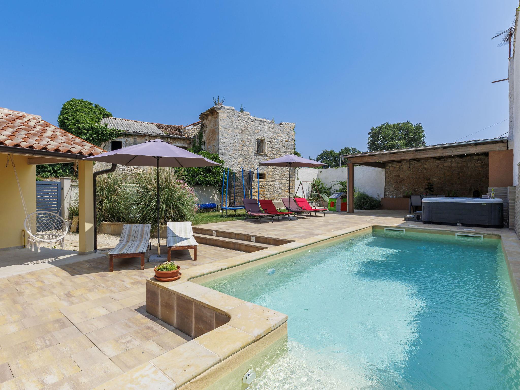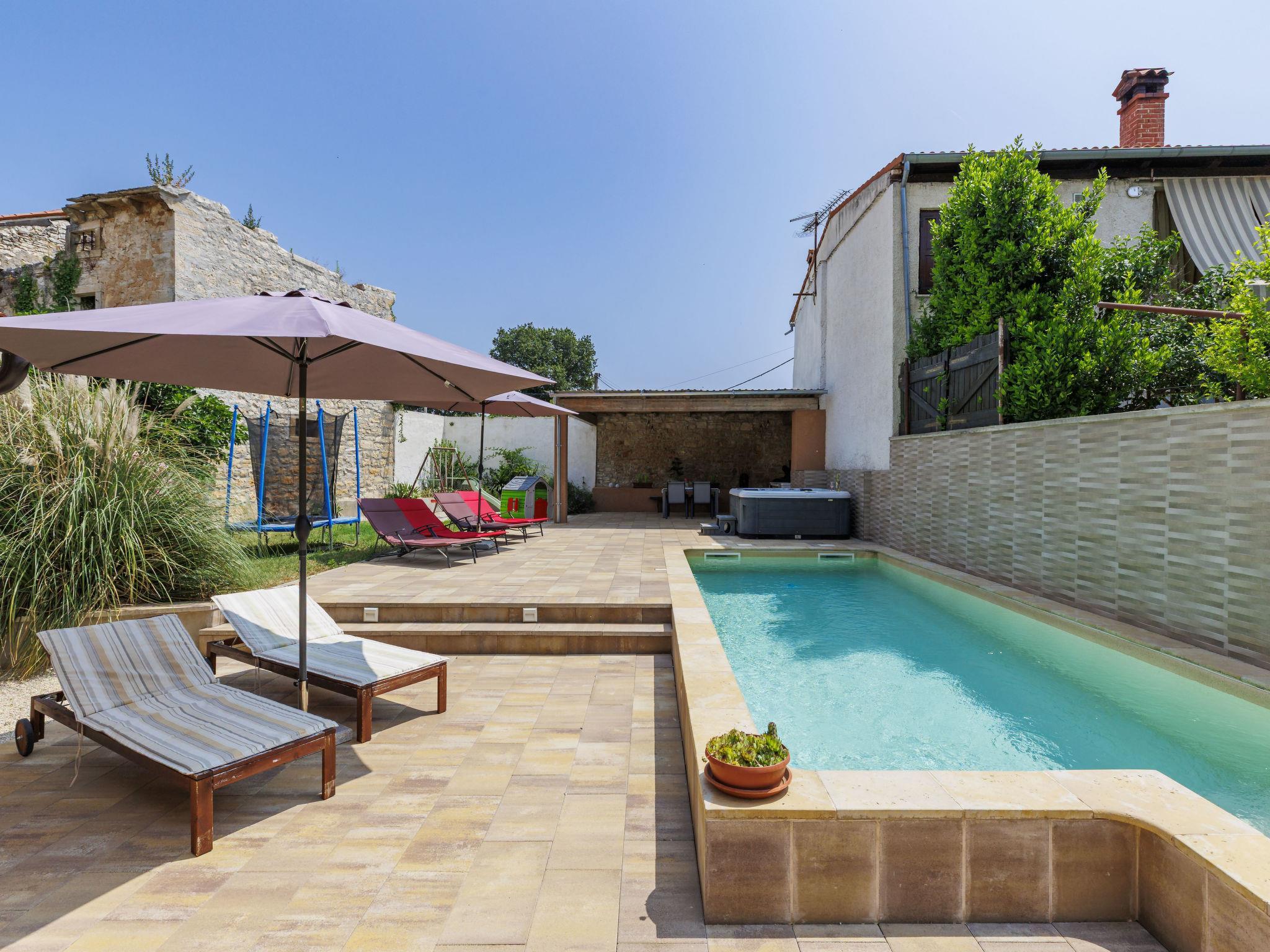 Škicini 9 km from Svetvincenat: Cosy single-family house "Bella", 2 storeys, renovated in 2020. In a sunny position, 10 km from the sea, 10 km from the beach. Private: property 500 m2 (fenced), swimming pool angular (7 x 4 m, depth 140 cm, seasonal availability: 15.Apr. - 01.Nov.) with internal staircase. Outdoor shower, hot tub, table tennis, terrace (25 m2), garden furniture, barbecue (swing). In the house: internet access, trampoline. Parking at the house on the premises. Shop 1 km, supermarket 6 km, restaurant 700 m, café 1 km, bus stop 1 km, pebble beach 10 km, rocky beach 10 km. Object suitable for 4 adults + 2 children. Please note: airfield close by 14 km from the property. Swimming pool heated (extra). It is necessary to announce 7 days in advance if the pool heating is required.