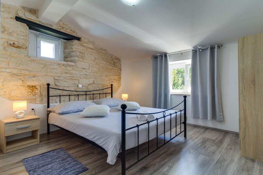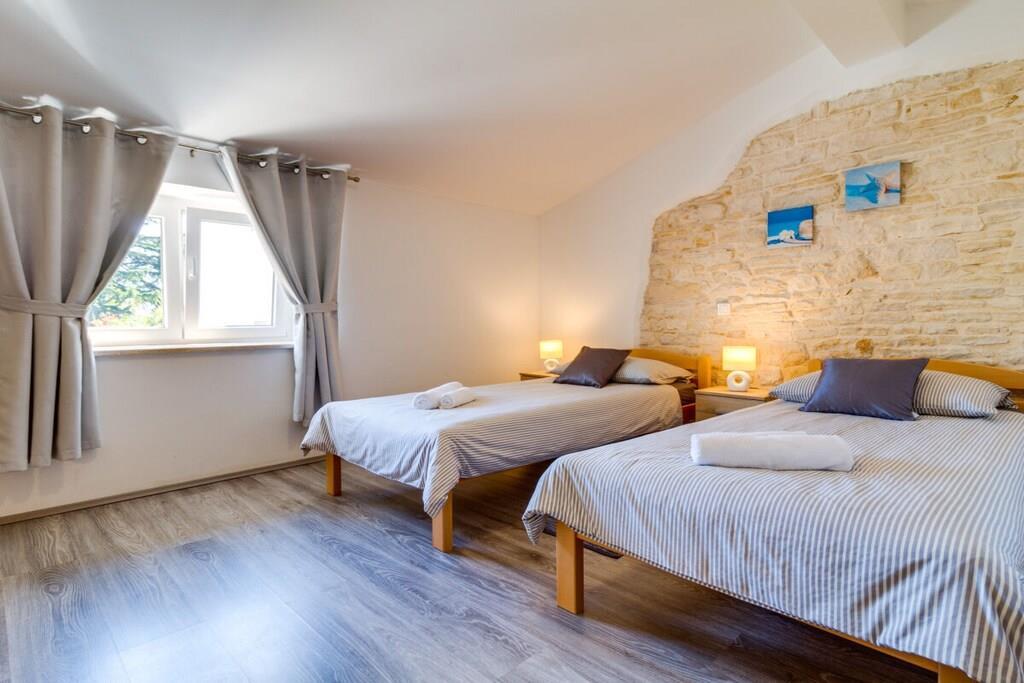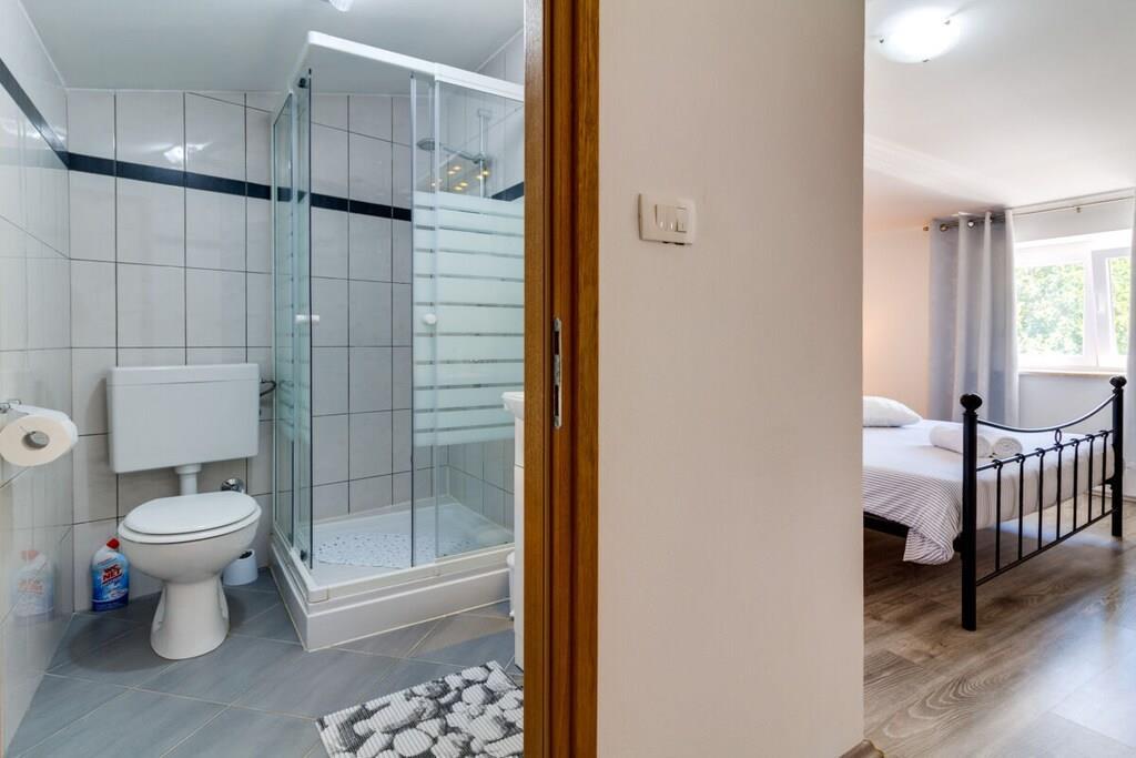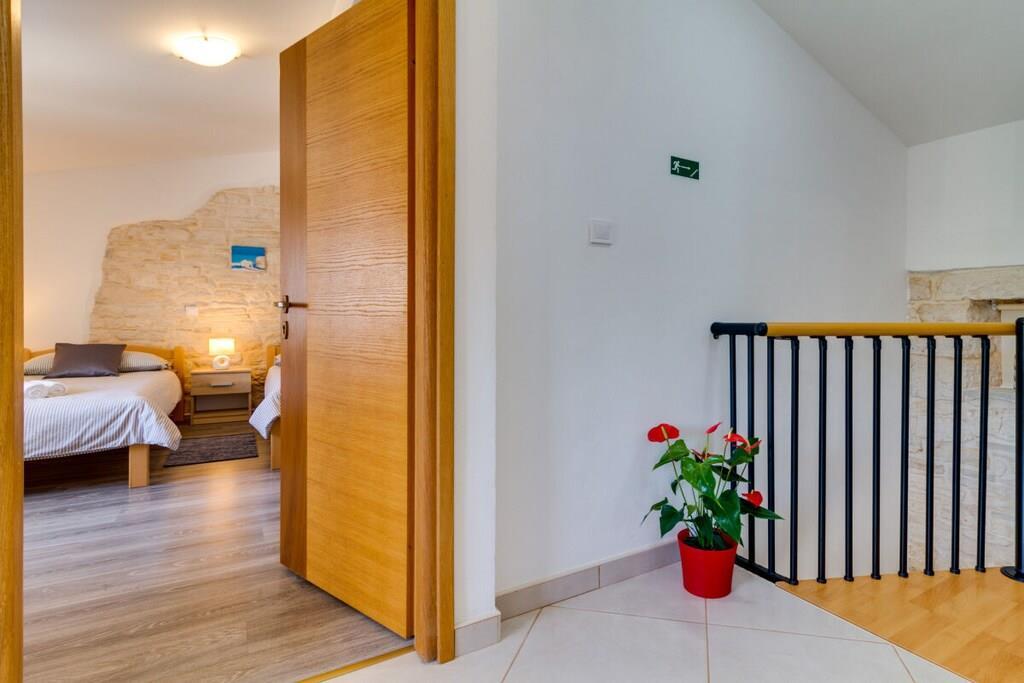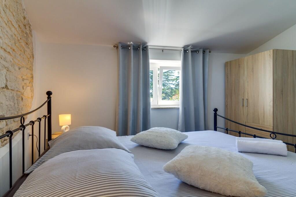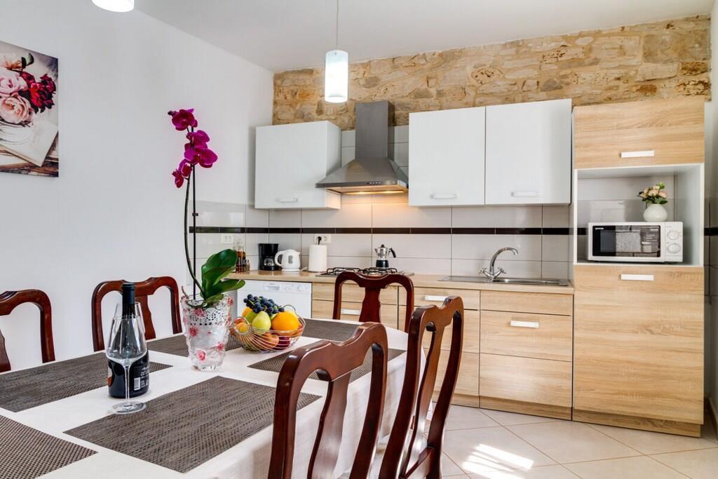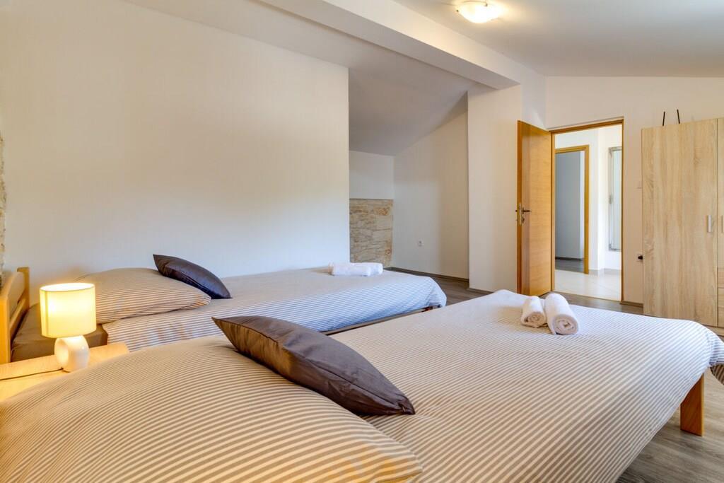 Das Haus mit einer Fläche von 110m² und mit 2 Etagen. Wenn Sie in das Haus eintreten, befindet sich auf der linken Seite ein Wohnzimmer mit einem Sofa, großem SAT-TV und Klimaanlage. Auf der rechten Seite ist eine schöne und komfortable Küche mit einem Tisch und Stühlen für Mahlzeiten. Die Küche ist komplett ausgestattet. Über eine runde Holztreppe gelangt man in den ersten Stock des Hauses, wo sich ein Schlafzimmer mit einem Doppelbett und einem Badezimmer mit Dusche und ein Schlafzimmer mit zwei Einzelbetten und einem Badezimmer mit Dusche befinden. Im Haus gibt es eine WiFi-Internetverbindung und vor dem Haus einen Parkplatz für ein Auto. Im Garten gibt es ein Volleyballnetz und einen Tisch mit Stühlen, um die Sommertage zu genießen. Das Schwimmbad hat eine Fläche von 26 m².