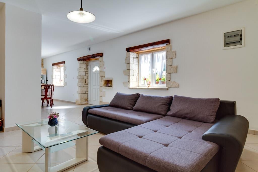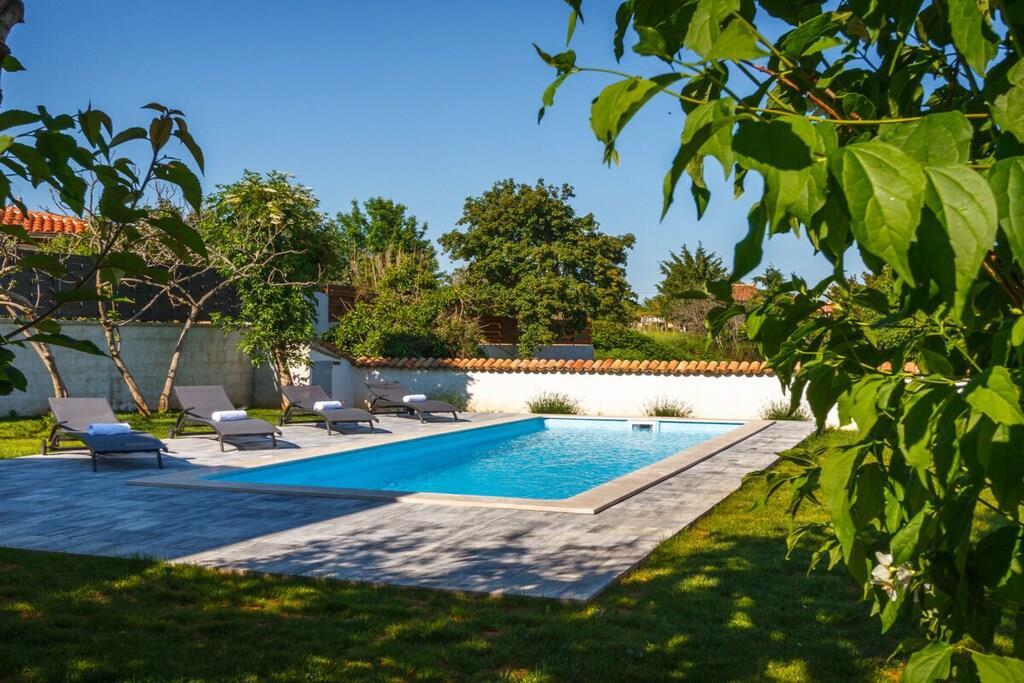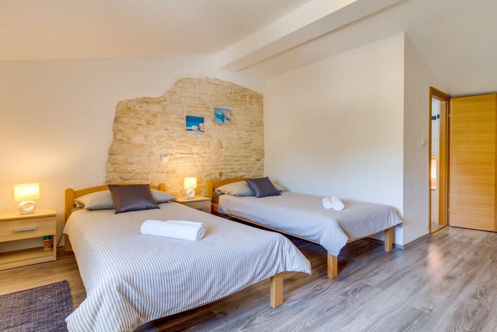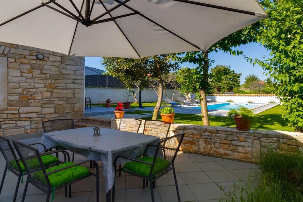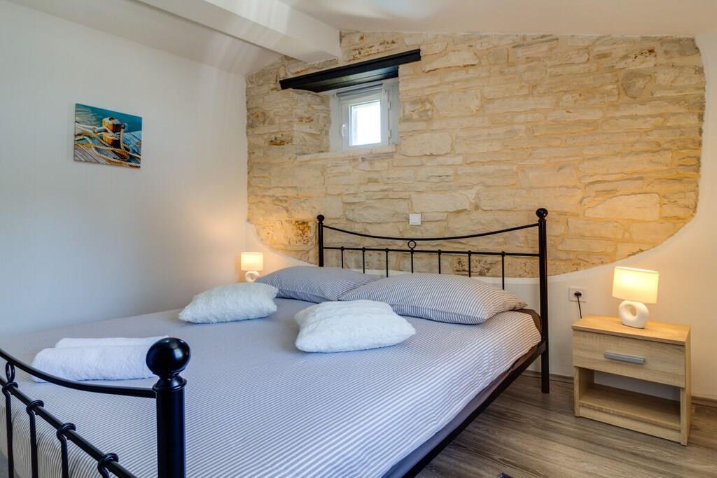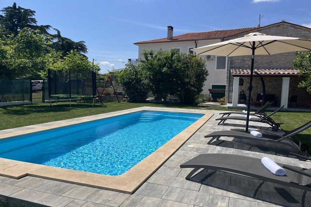 Das Haus mit einer Fläche von 110m² und mit 2 Etagen. Wenn Sie in das Haus eintreten, befindet sich auf der linken Seite ein Wohnzimmer mit einem Sofa, großem SAT-TV und Klimaanlage. Auf der rechten Seite ist eine schöne und komfortable Küche mit einem Tisch und Stühlen für Mahlzeiten. Die Küche ist komplett ausgestattet. Über eine runde Holztreppe gelangt man in den ersten Stock des Hauses, wo sich ein Schlafzimmer mit einem Doppelbett und einem Badezimmer mit Dusche und ein Schlafzimmer mit zwei Einzelbetten und einem Badezimmer mit Dusche befinden. Im Haus gibt es eine WiFi-Internetverbindung und vor dem Haus einen Parkplatz für ein Auto. Im Garten gibt es ein Volleyballnetz und einen Tisch mit Stühlen, um die Sommertage zu genießen. Das Schwimmbad hat eine Fläche von 26 m².