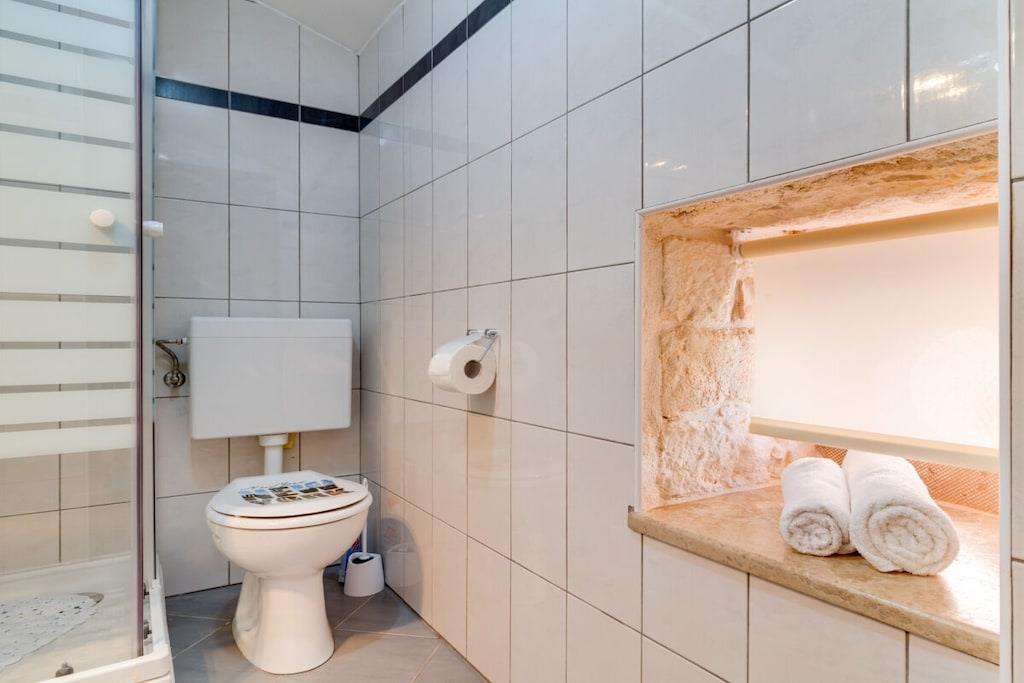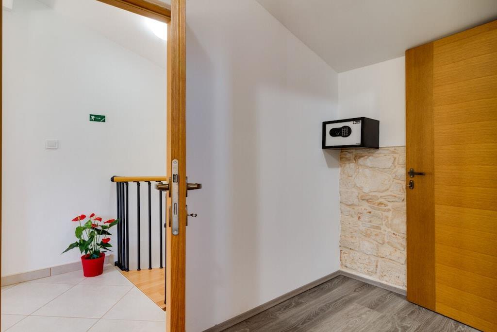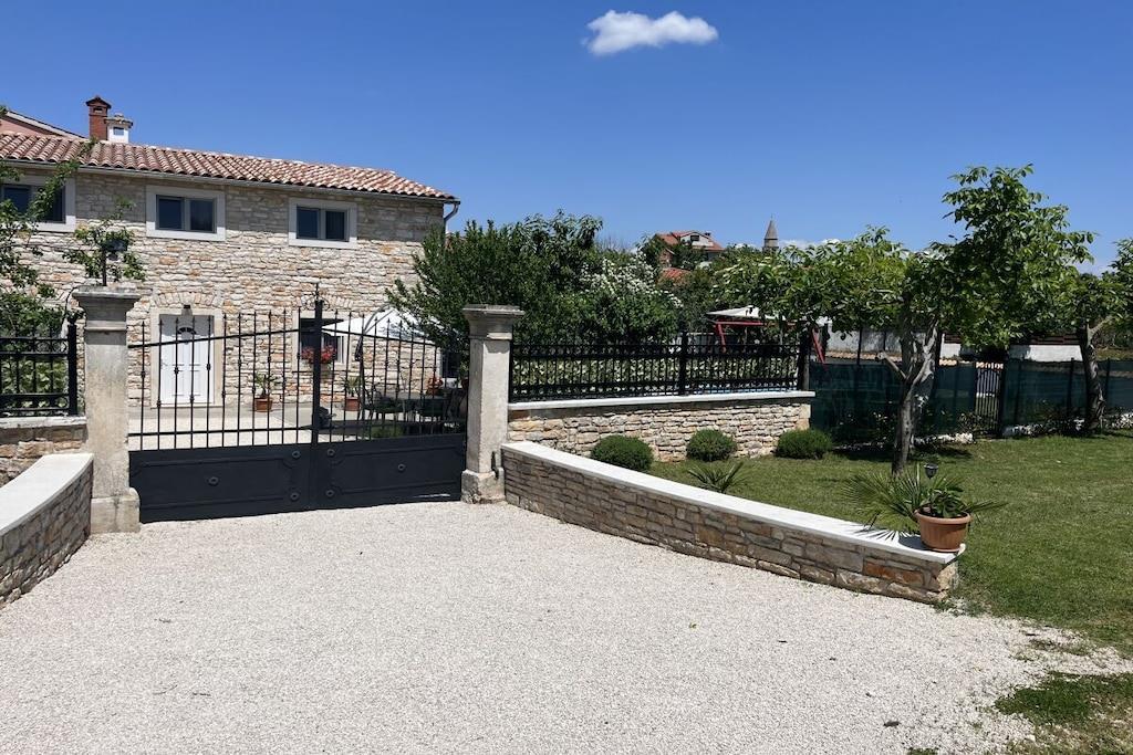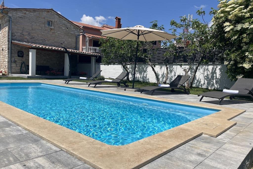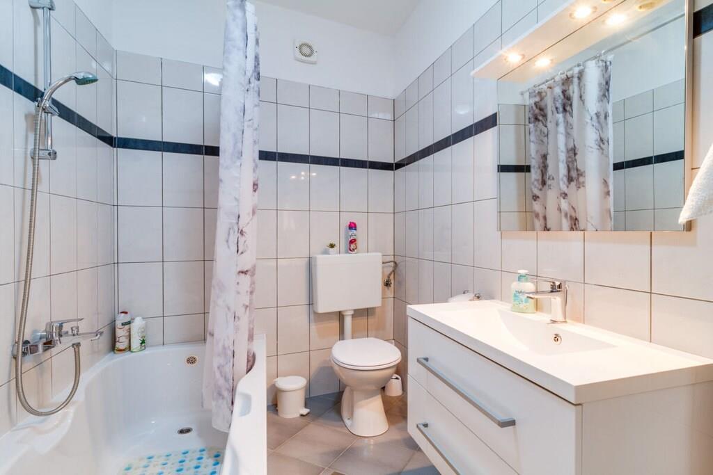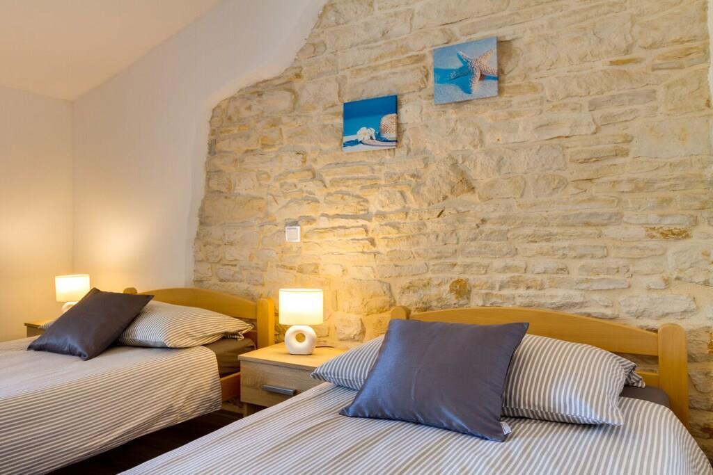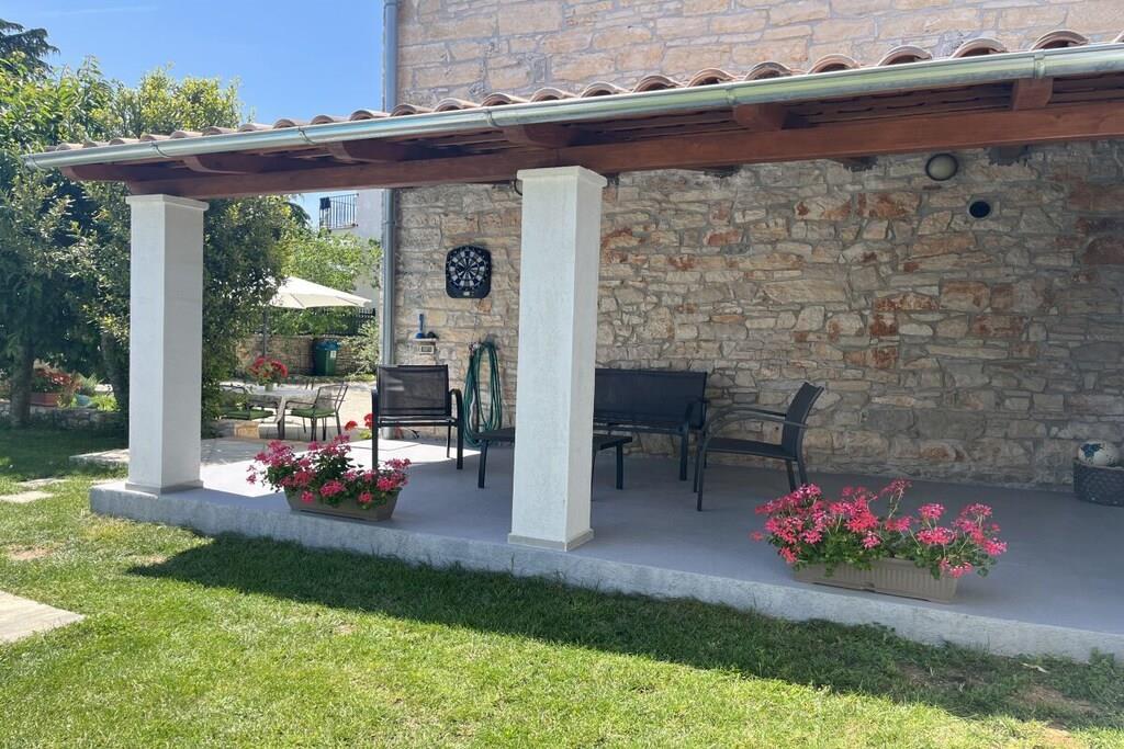 Das Haus mit einer Fläche von 110m² und mit 2 Etagen. Wenn Sie in das Haus eintreten, befindet sich auf der linken Seite ein Wohnzimmer mit einem Sofa, großem SAT-TV und Klimaanlage. Auf der rechten Seite ist eine schöne und komfortable Küche mit einem Tisch und Stühlen für Mahlzeiten. Die Küche ist komplett ausgestattet. Über eine runde Holztreppe gelangt man in den ersten Stock des Hauses, wo sich ein Schlafzimmer mit einem Doppelbett und einem Badezimmer mit Dusche und ein Schlafzimmer mit zwei Einzelbetten und einem Badezimmer mit Dusche befinden. Im Haus gibt es eine WiFi-Internetverbindung und vor dem Haus einen Parkplatz für ein Auto. Im Garten gibt es ein Volleyballnetz und einen Tisch mit Stühlen, um die Sommertage zu genießen. Das Schwimmbad hat eine Fläche von 26 m².