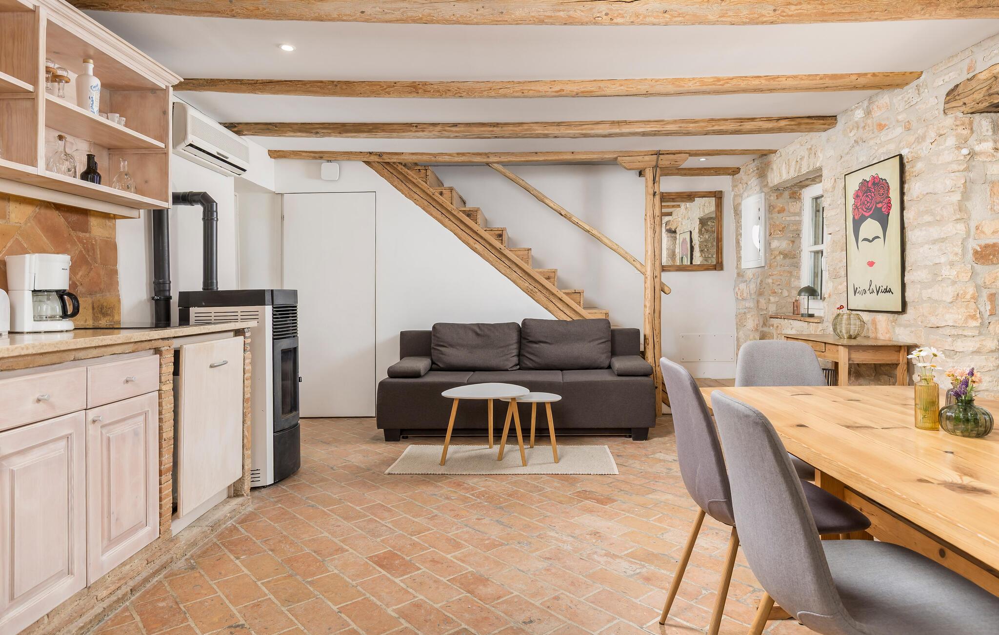 Dette smukt restaurerede traditionelle gamle stenhus, kombineret med moderne stilopgraderinger, ligger på en stor grund med enge og skove rundt omkring. Placeringen er absolut fredelig og afslappende, så du vil kun høre fugle synge. Det eneste, der bryder den afslappende grønne atmosfære, er den smukke og store blå swimmingpool, med sine 50m2. Solsenge og parasoller er der for din tid ude ved poolen, mens dine børn leger og har det sjovt. Det rummelige område omkring poolen giver dig mulighed for at føle dig godt tilpas og nyde udendørslivet. Den overdækkede terrasse har et spisebord, så I kan nyde lækre måltider udenfor. Den omhyggeligt restaurerede Villa Natura med sine stenvægge og trælofter har en masse karakter. I stueetagen vil villaen byde dig velkommen med en åben stue med køkken og spisebord til op til 6 gæster. Der er et hyggeligt lyst soveværelse i samme etage. Trætrapper fører til den øverste etage, som har yderligere 2 soveværelser med dobbeltsenge. Et af soveværelserne har eget badeværelse for din komfort. Der er yderligere et lækkert badeværelse med bruser på denne etage samt separat toilet. Den moderne overdækkede terrasse på første sal byder på en vidunderlig udsigt over marken og dens fantastiske oliventræer. Derudover har værelset i stueetagen og det øverste værelse med terrasse meget store glasvægge, som tilfører naturligt lys og følelsen af at bringe det ydre ind. Om aftenen er det rart at nyde de smukke oplyste omgivelser under det magiske stjernehimmel. Med Villa Natura er du midt i naturen, men ikke for langt væk fra den næste større by - den nærmeste kystby er Porec - kun 20 minutters kørsel. BEMÆRK: Nye billeder kommer til foråret :) Istrien er virkelig en fryd for øjet. Dens vandløb strømmer til havet gennem dybe dale og kløfter, som leder tankerne hen på de gamle lokale myter om kæmper. Bølgende bakker har udsigt over markerne og dalene med små byer oppe på toppene, der minder om nogle gamle malerier. Dette stenhus ligger uden for en lille landsby i Istrien, det er helt stille og afslappende, men alligevel er det travle turistcenter i Porec og strandene kun en kort køretur væk. I Pula og Trieste finder du internationale lufthavne (Ryanair, FlyGlobespan, Thomson, Norwegian Air Shuttle, Tuifly, German Wings, Sterling, Wizzair og mange russiske charterflyvninger). Turistbyen Porec ligger 15 minutter væk, og Rovinj og Pula og andre højdepunkter er kun en kort køretur væk. Kun 15 minutter væk fra ejendommen kan du finde de nærmeste strande med en masse rolige steder at slappe af.