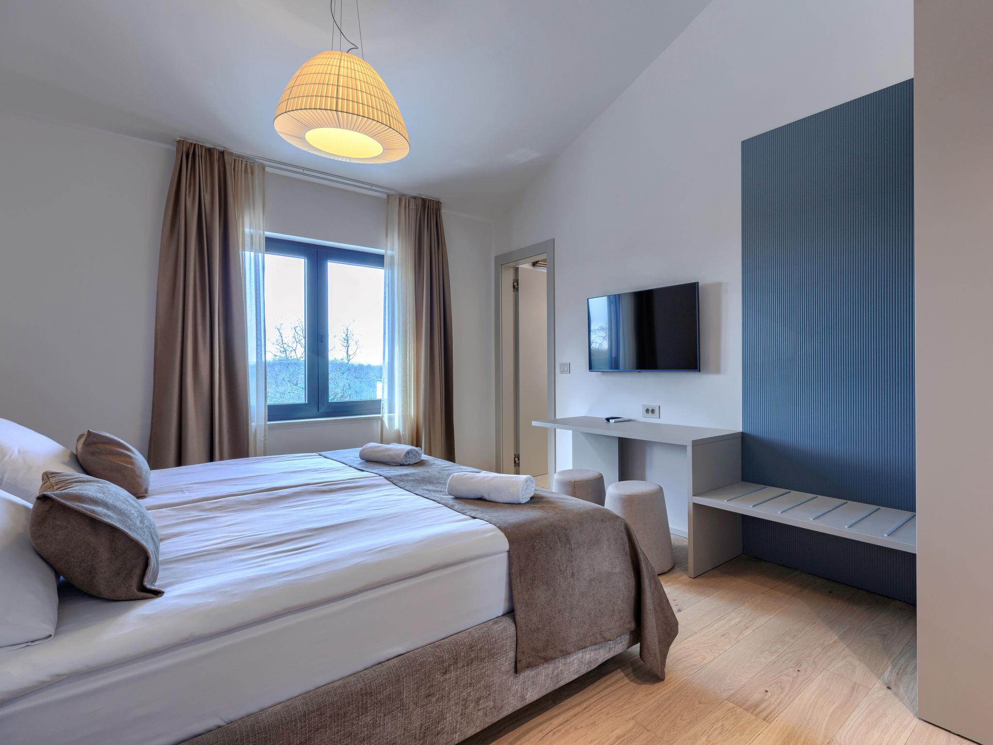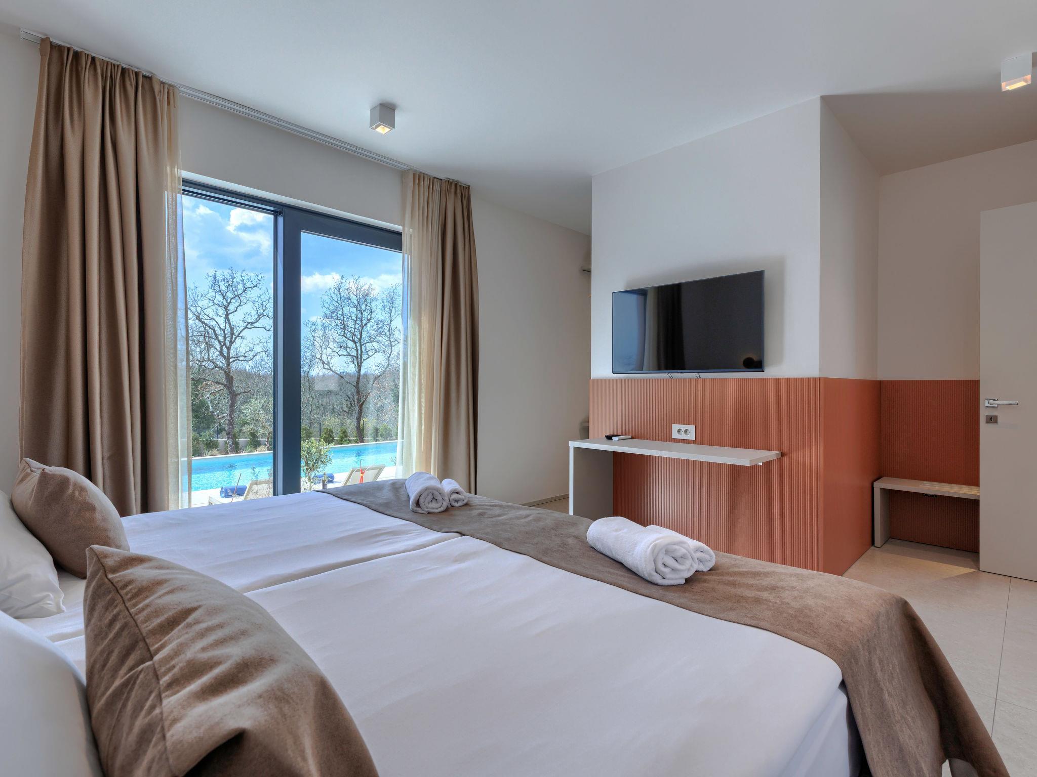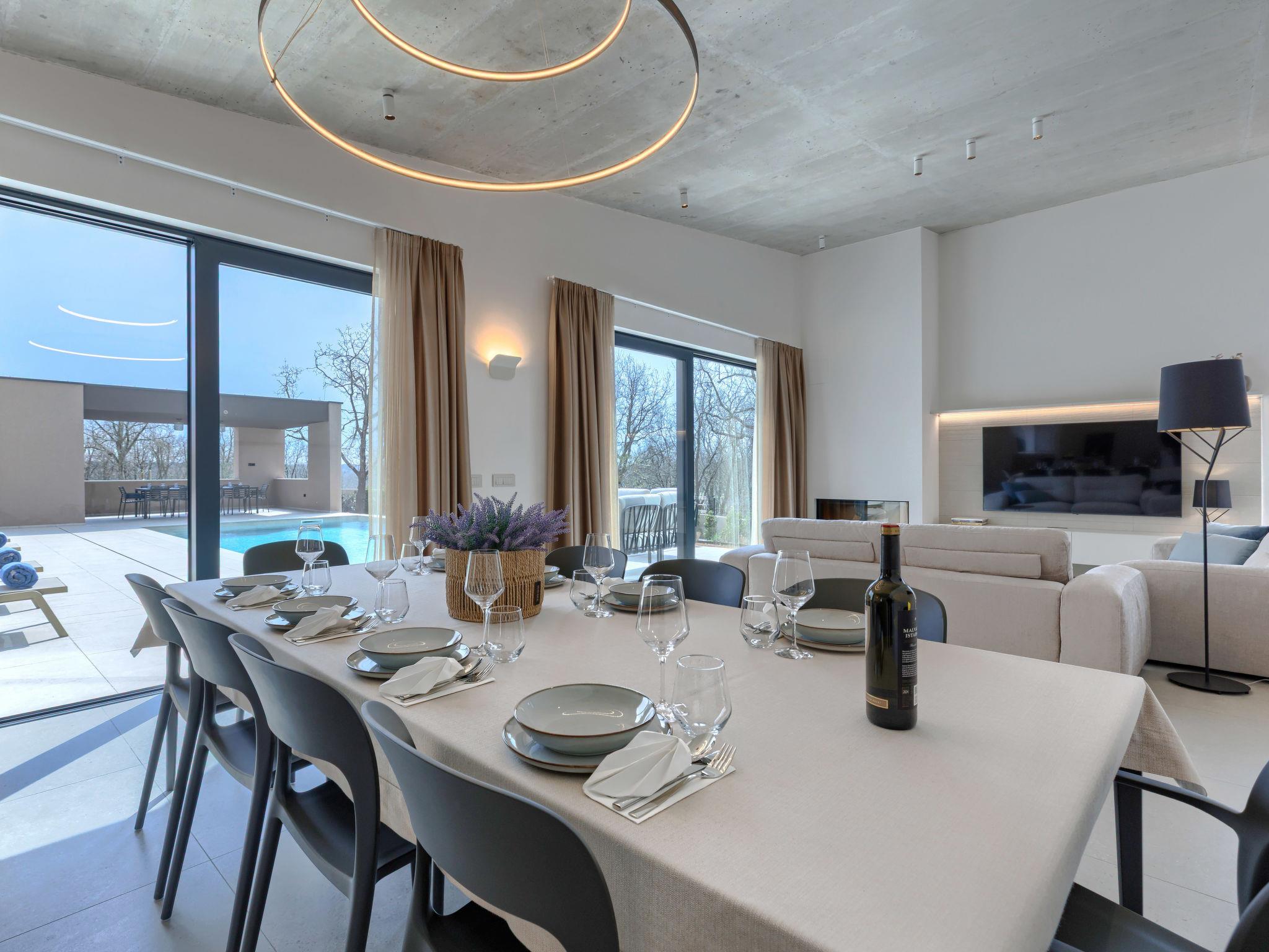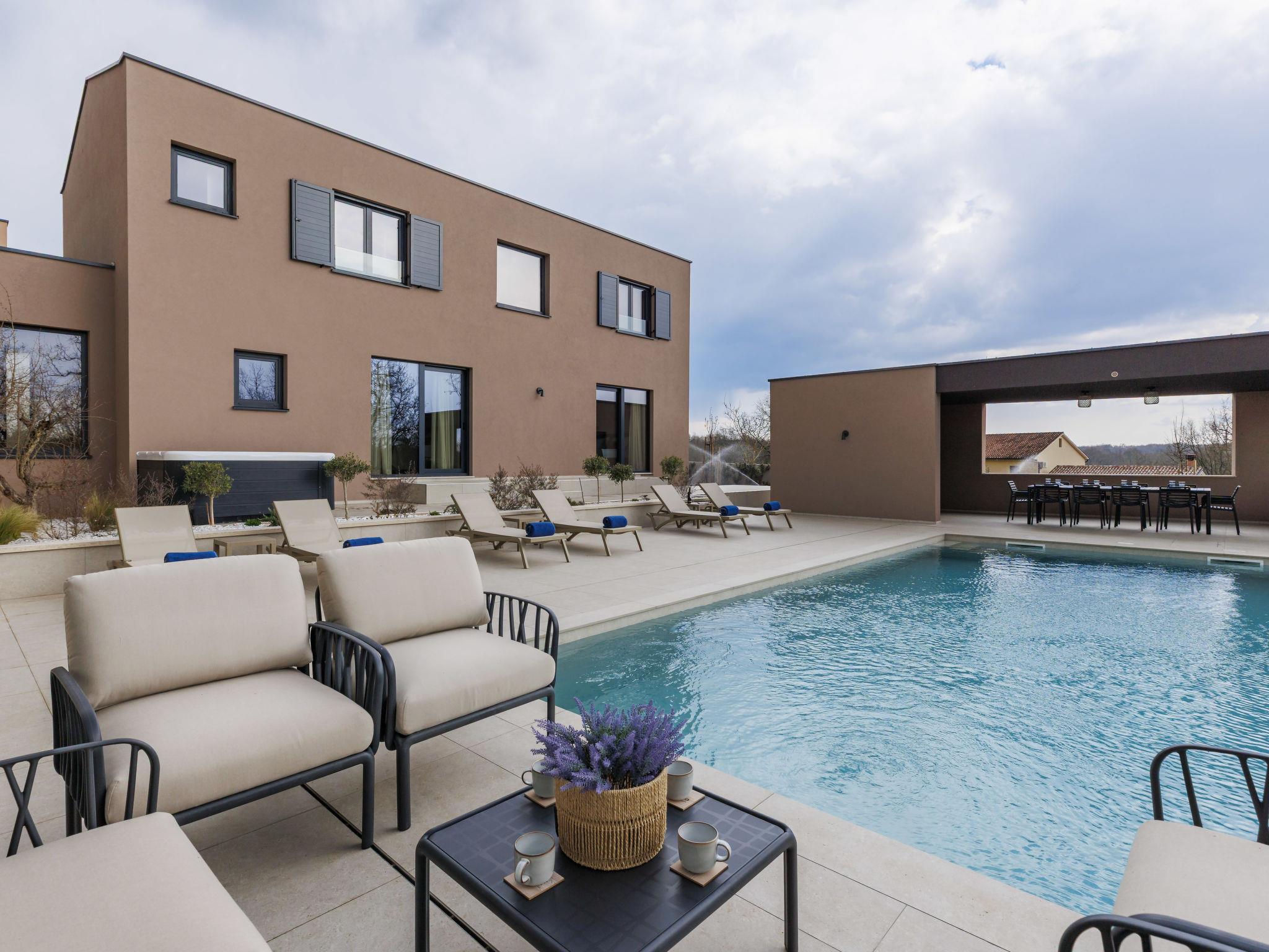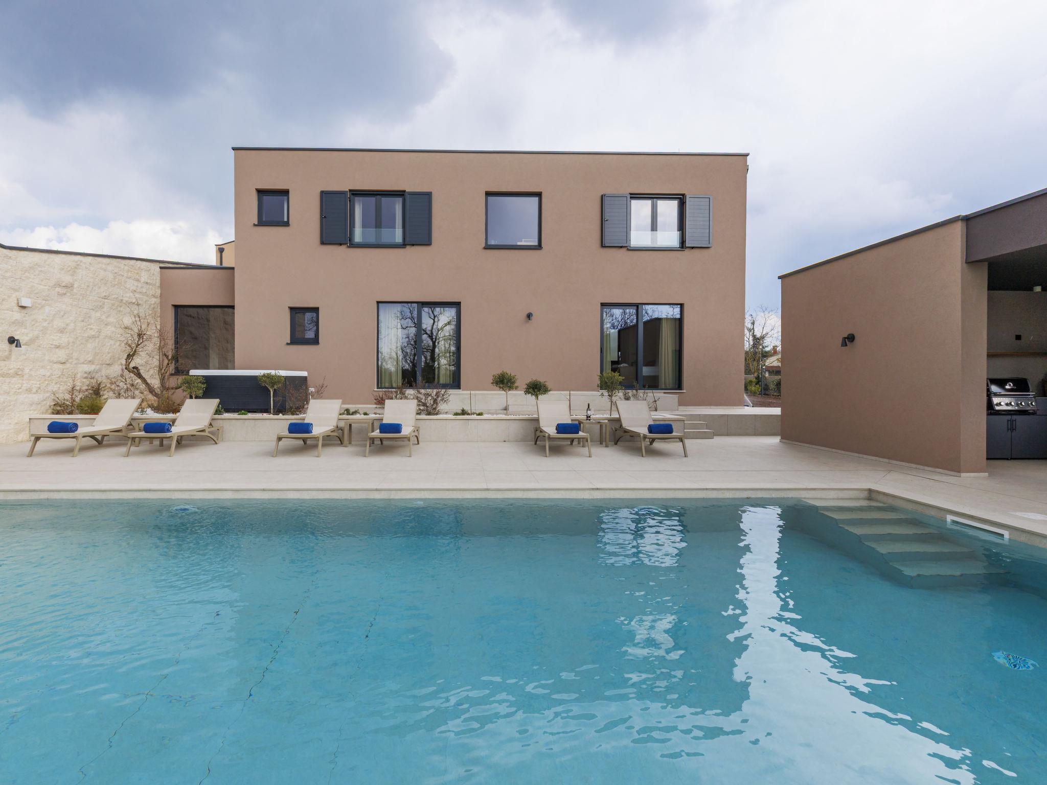 Beautiful, luxurious single-family house "La Mari", 2 storeys, built in 2026. In the hamlet Banki 4 km from the centre of Tinjan, 12 km from the centre of Porec, in a sunny position, 12 km from the sea. Private: property 1'399 m2 with lawn and wildlife garden, swimming pool angular (10 x 5 m, depth 145 cm, seasonal availability: 01.Apr. - 30.Sep.) with internal staircase. Outdoor shower, hot tub, terrace (20 m2), garden furniture, barbecue, children's playground (slide, swing), pool maintenance by the owner/gardener. In the house: internet access, sauna, washing machine. Parking (for 4 cars) at the house on the premises. E-charging station. Shop 4 km, supermarket 11 km, restaurant 4 km, bus stop 4 km, pebble beach 12 km, rocky beach 12 km. Nearby attractions: Aquapark 18 km, Adrenalin park Kringa 7 km. The owner does not accept any youth groups.