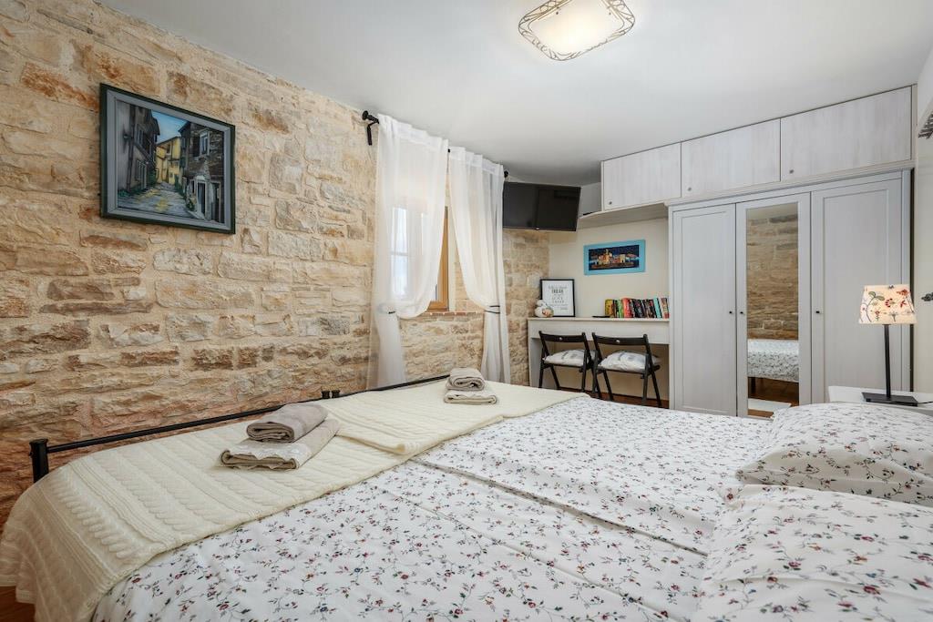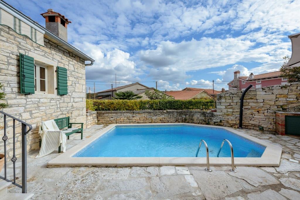 Casa Antignana er et traditionelt istrisk stenhus beliggende i centrum af Tinjan, Istrien, Kroatien. Det er et perfekt sted, hvis du ønsker at bo som en lokal. Feriehuset blev genopbygget i 2012 i den oprindelige stil og med traditionelle materialer. Lokalt fundne sten blev genbrugt, gamle trapper er nu omdannet til pejserammer, og den gamle træport foran er stadig på plads. Tykke vægge holder det relativt køligt om sommeren. Der er dog aircondition i hvert soveværelse og en opholdsstue. Stuen har udsigt over haven og poolen. Huset består af et åbent køkken, en stue og et badeværelse med bruser på første sal. I stueetagen er der to soveværelser og et lille badeværelse med bruser. I haven er der en pool med hydromassageområde, en grill, et bord, stole, liggestole og en parasol. Høje stenmure omgiver ejendommen. Ejendommen er kæledyrsvenlig. En lille offentlig parkeringsplads ligger ved siden af ejendommen.