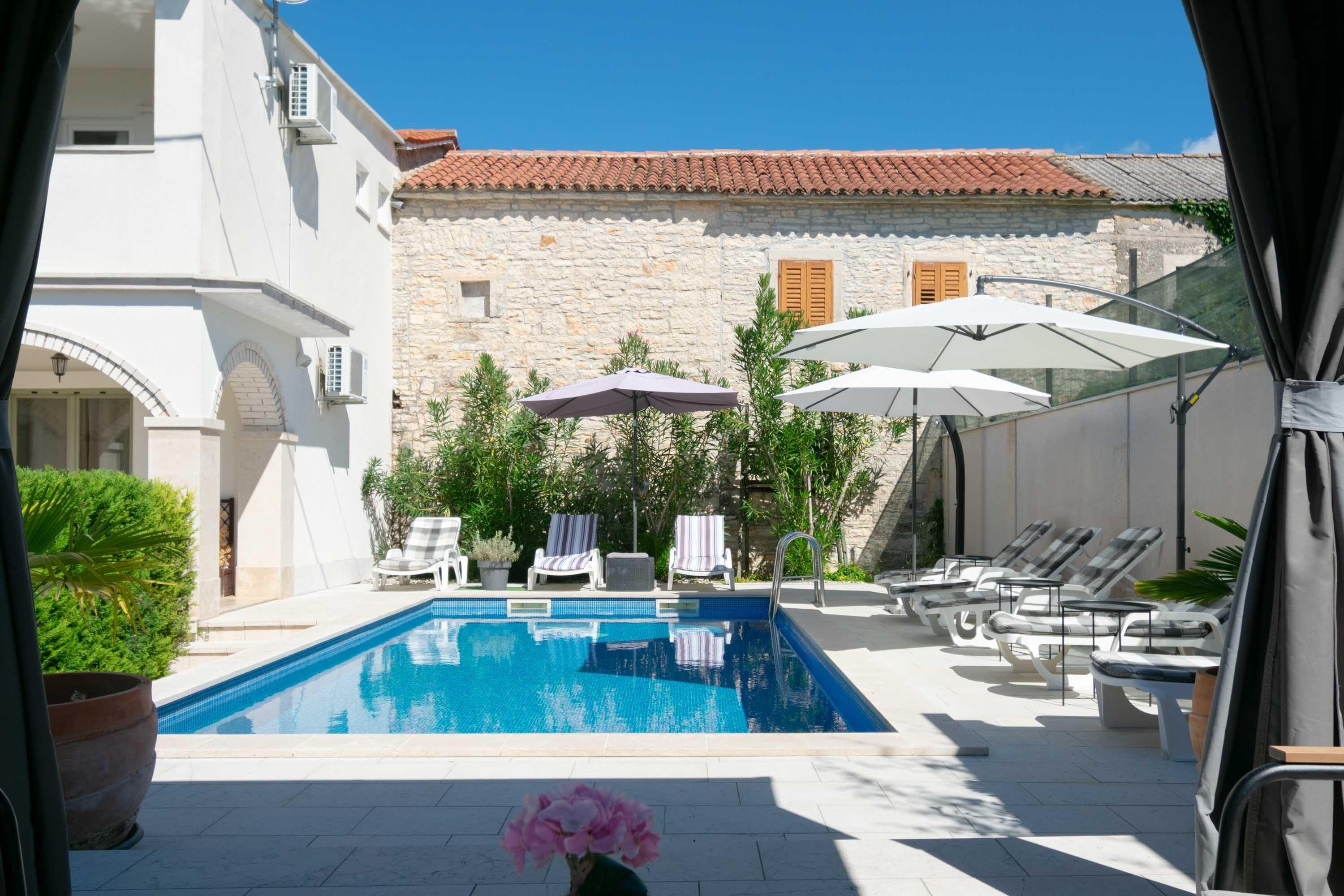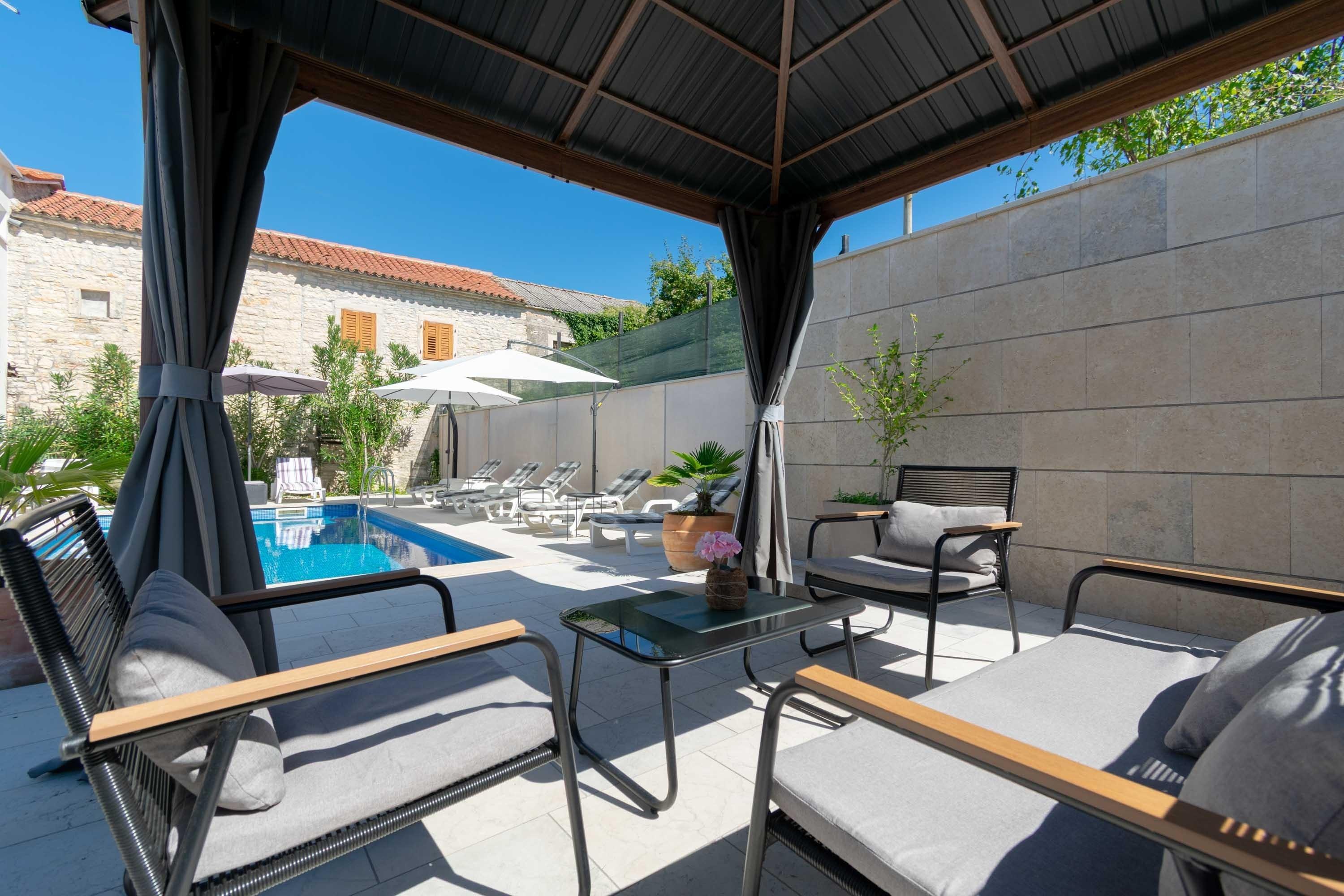 Mit privatem Swimmingpool, Sonnenliegen und Sonnenschirmen ist der Außenbereich ideal zum Entspannen und Genießen an der frischen Luft. Ein Grill und eine Terrasse laden zu langen Mahlzeiten im Freien ein, während ein separater überdachter Lounge-Bereich perfekt für abendliche Drinks ist.