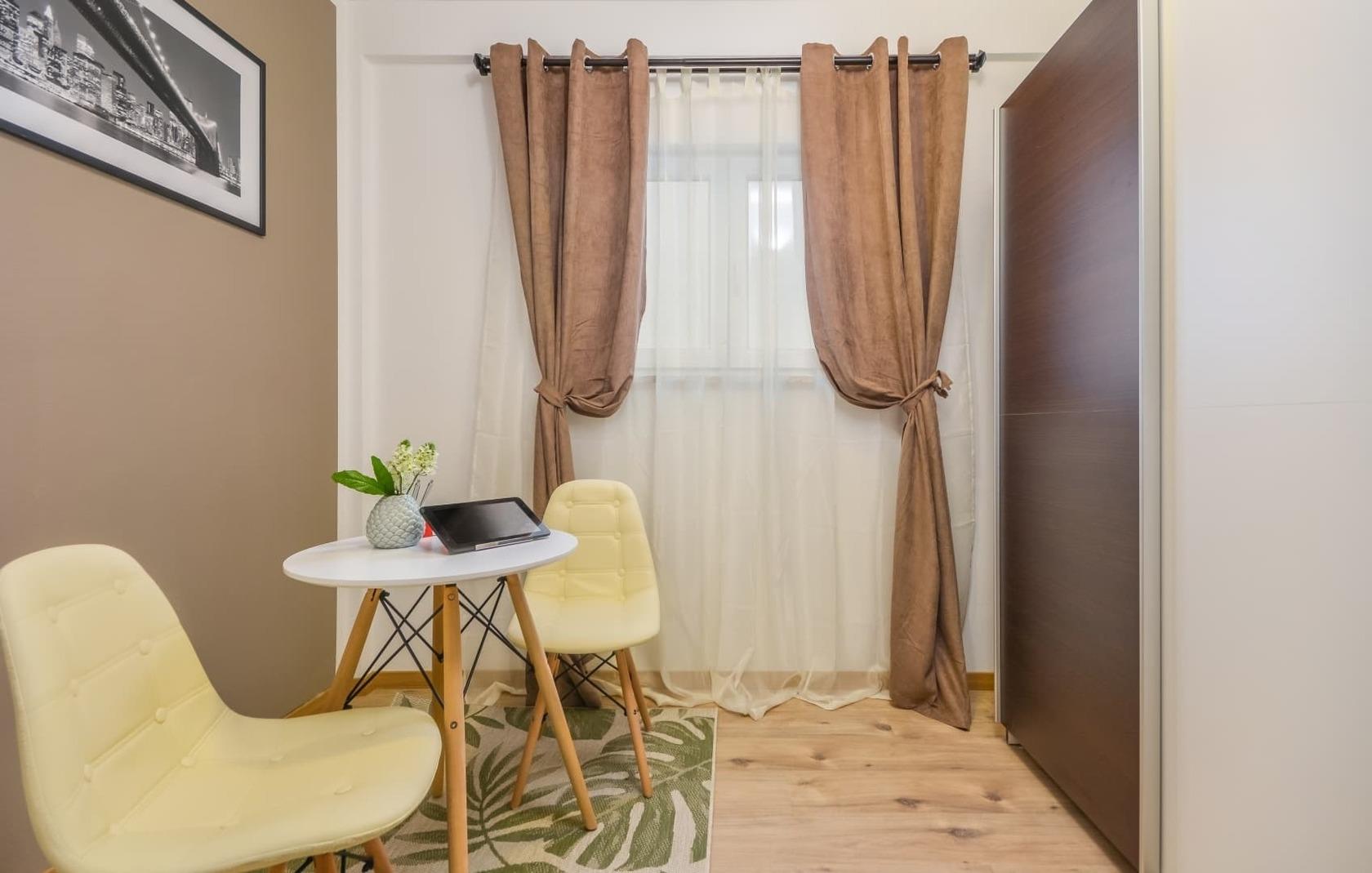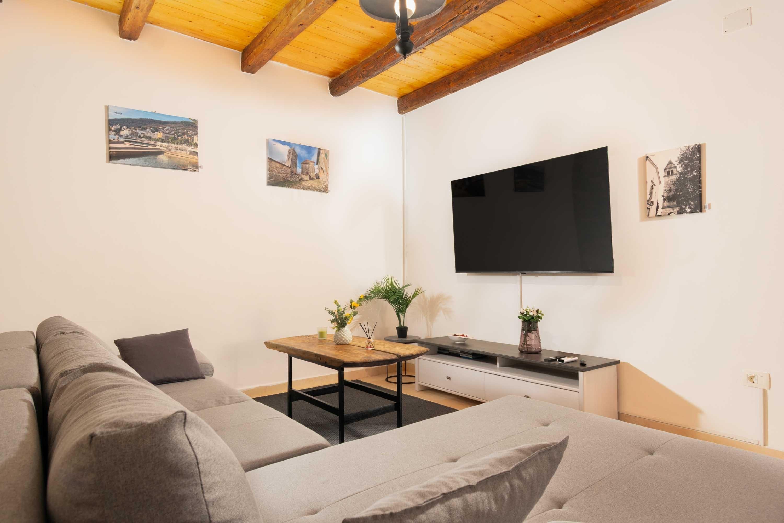 Der Essbereich bietet große Fenster mit Blick auf den Pool, während das gemütliche Wohnzimmer mit freiliegenden Steinwänden, einem bequemen Sofa und einem 65" SMART-TV mit kostenlosem Netflix und Prime Video überzeugt.