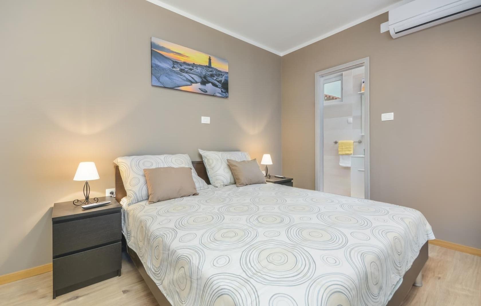 Schlafzimmer 3 – Doppelbett, Klimaanlage und Balkon mit Blick auf Dorf und Garten