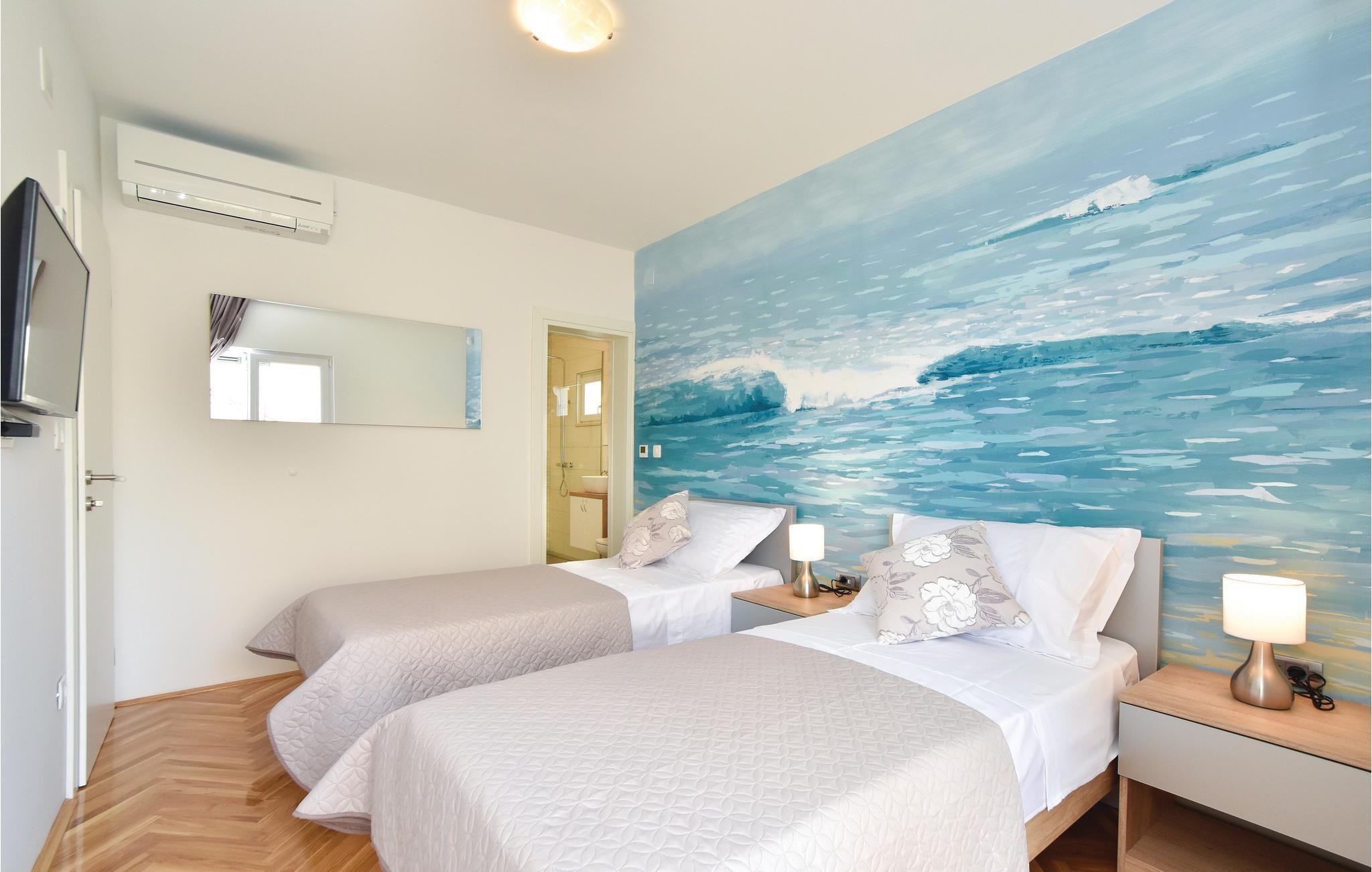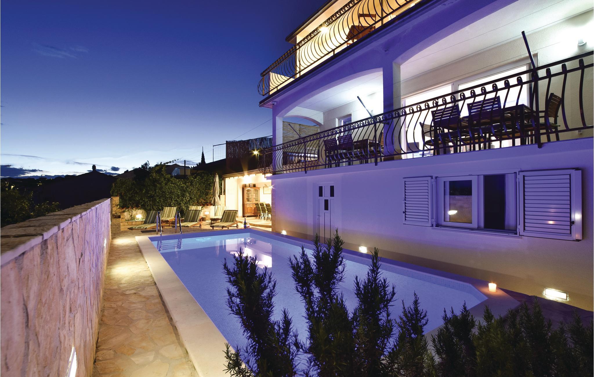 Dette feriedomicil med privat pool (opvarmet) er fordelt på et hovedhus og et lille anneks. I hovedhuset er der seks soveværelser, seks badeværelser og et stort kombineret opholdsrum med køkken og spisestue, det hele er fordelt på stue og første sal. Der er klimaanlæg i hele huset. Den skønne pool kan benyttes døgnet rundt og der kan tages solbad i de bekvemme solstole og slappes af på terrassen, hvorfra der er en fantastisk udsigt over både havet og de mange små øer. Få meter fra hovedhuset ligger annekset der rummer et soveværelse og et badeværelse, samt fitnessrum. Ved swimmingpoolen er et udendørs brusebad, borde og stole og en whirlpool til fem personer. Husets grund er helt indhegnet og poolen er beskyttet med en port. . Huset ligger i den sydlige del af øen Ciovo - kun 5 km fra museeumsbyen Trogir. Det findes også mange underholdningstilbud til de unge mennekser i byen Trogir. Såfremt man ankommer med egen båd, står der en bådplads til rådighed. Husejeren fortæller gerne, hvor der ellers findes dejlige steder i området.