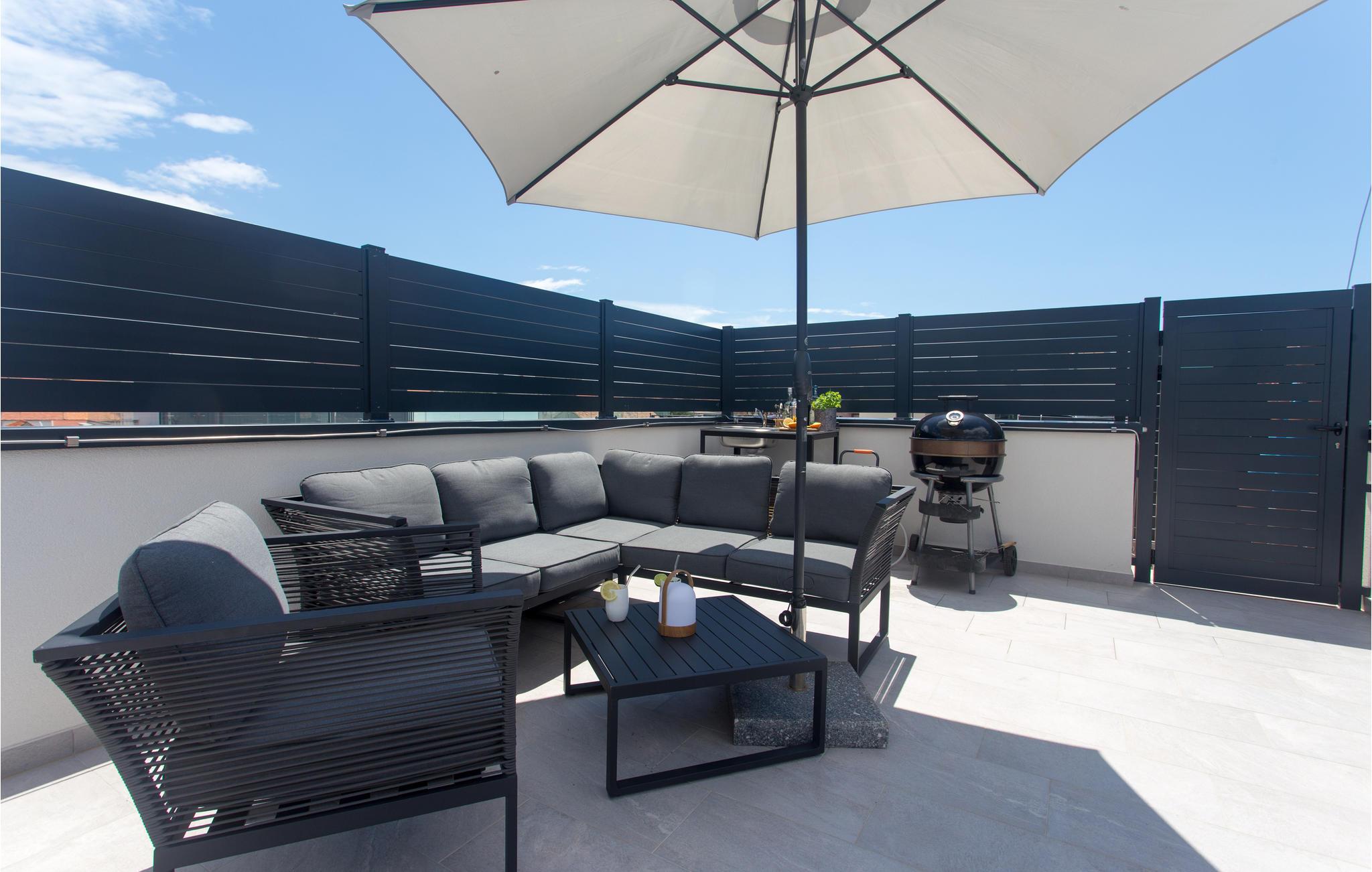 I har en overdækket altan med vidunderlig panoramaudsigt over havet til jeres rådighed. Den fælles pool byder på en vidunderlig forfriskning på varme dage, og tagterrassen lover en særlig tid. Her finder I spabad, liggestole og et område til at grille og slappe af på havemøblerne, som kun er til privat brug.