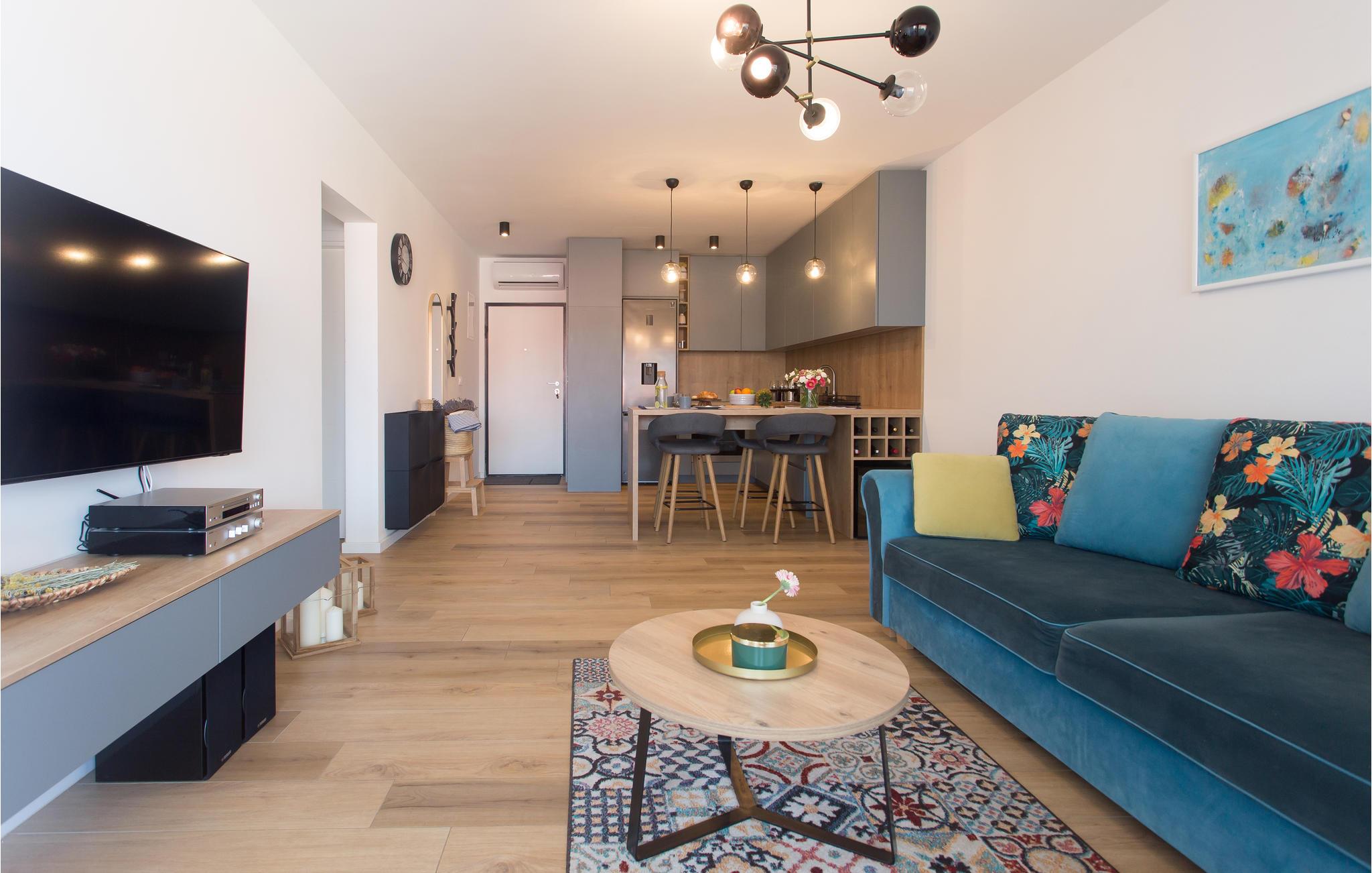 Denne moderne lejlighed byder velkommen på 3. sal i det smukke hus. Lejligheden er moderne og stilfuldt indrettet og veludstyret, ideel til jeres afslappende ferie med familien. Føl jer godt tilpas i den smagfulde sofa eller lav mad i det moderne og fuldt udstyrede køkken.