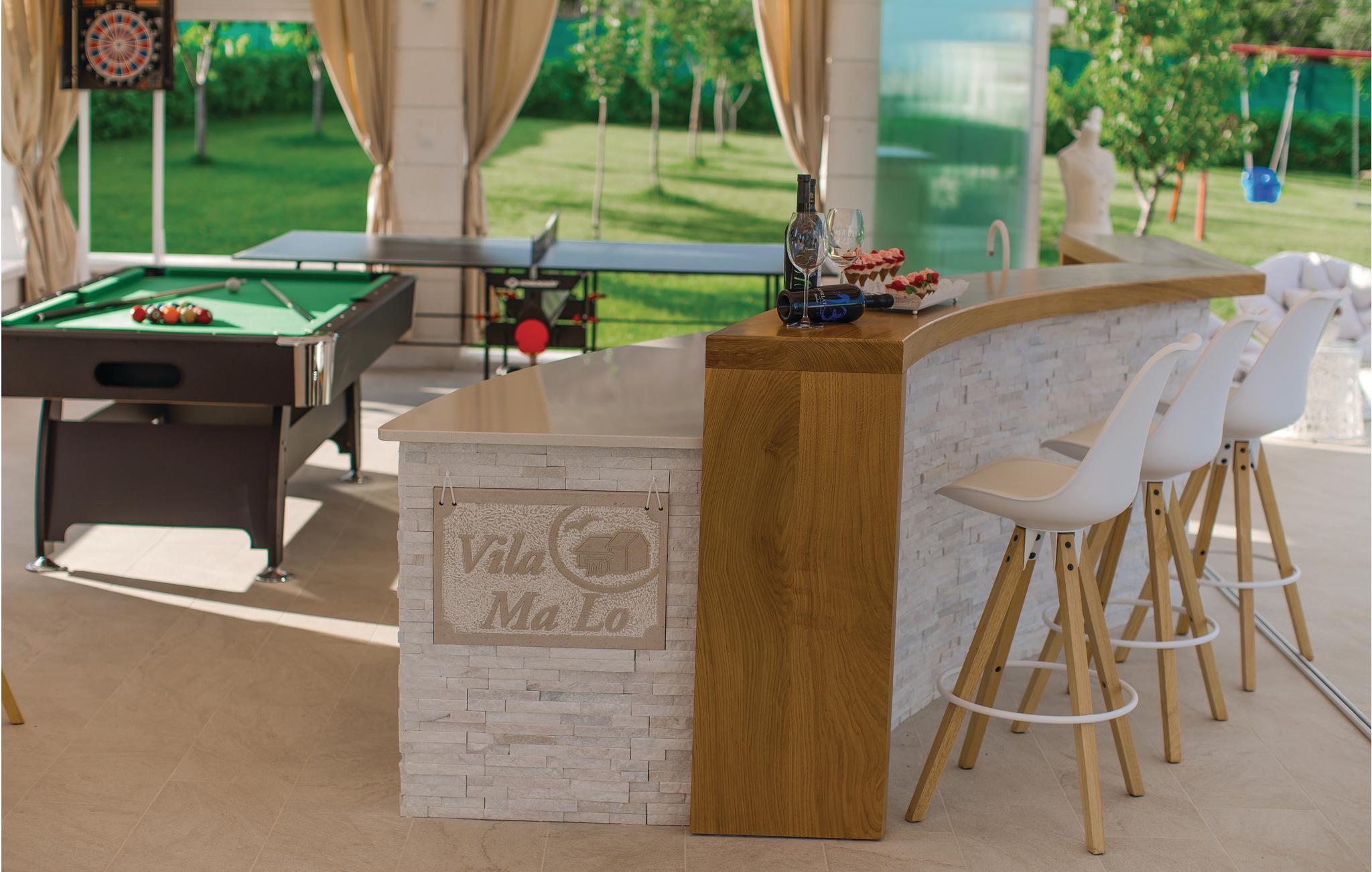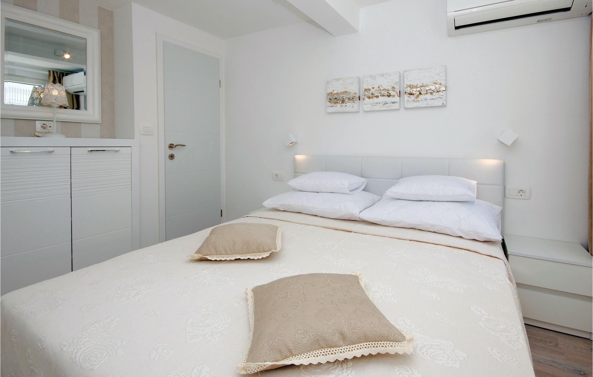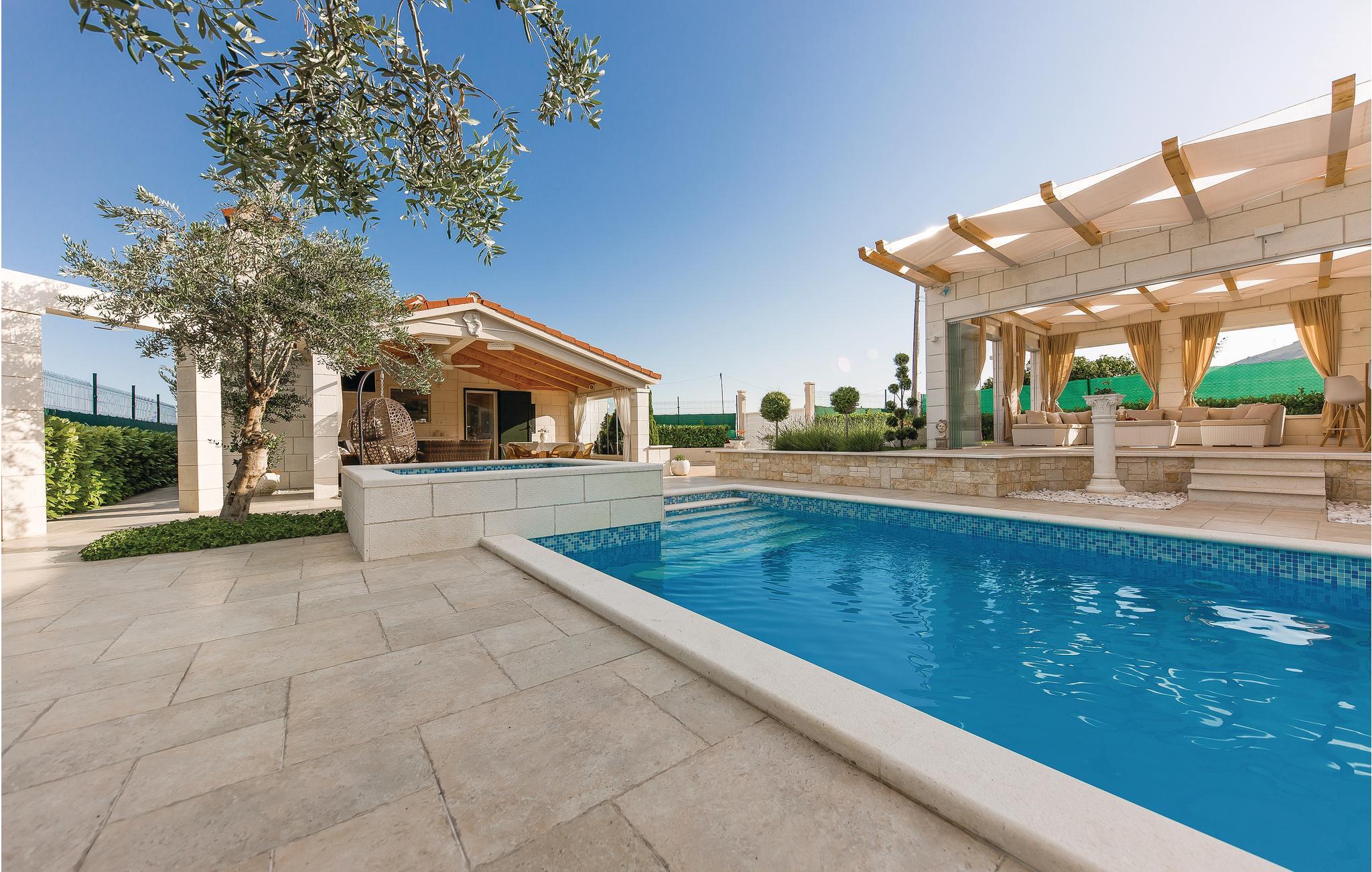 Dette vidunderlige feriehus i herligt grønne omgivelser er afskærmet fra nysgerrige blikke, omgivet af en komplet indhegnet grund. Boligen rummer tre soveværelser med egne klimaanlæg. I stueetagen er der et komfortabelt boligområde med køkken og udgang til den overdækkede terrasse tæt på poolen. På den overdækkede terrasse er der også et udendørs køkken med grillplads. Selvfølgeligt er der også en legeplads og frugttræer samt grønsager i den flot anlagte have. Nyd den skønne udsigt til bugten af Trogir samt det omgivende landskab. Opdag det spændende natteliv i den indre by af Trogir og besøg de talrige seværdigheder. Skrå vægge med laveste loftshøjde på 135 cm.